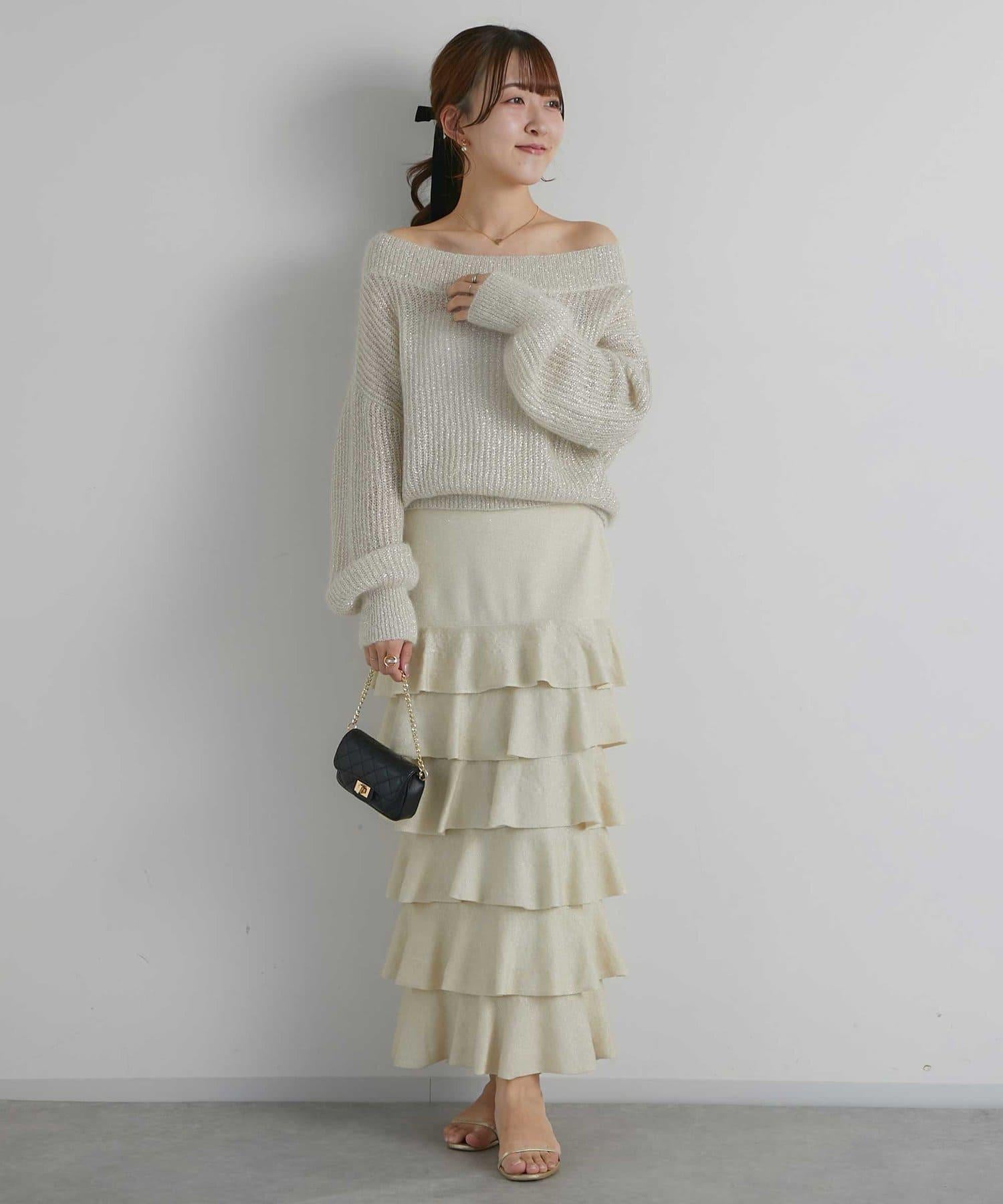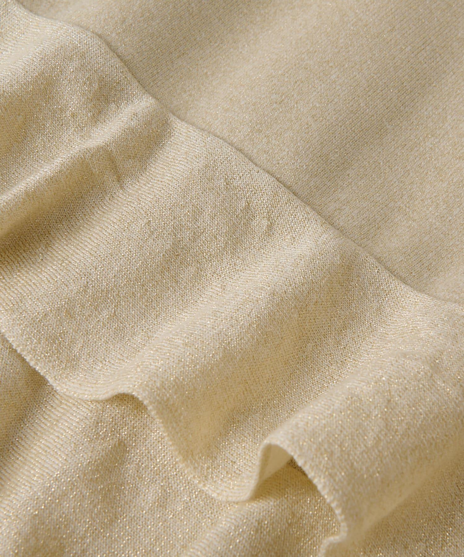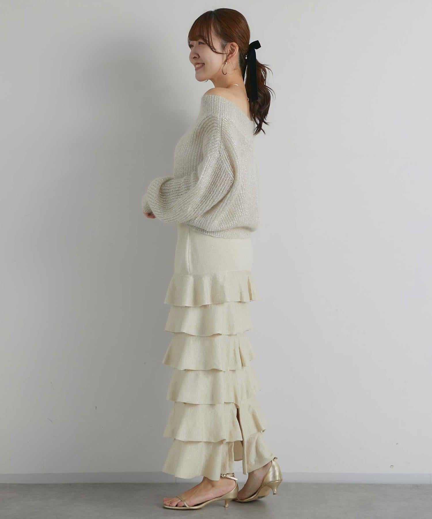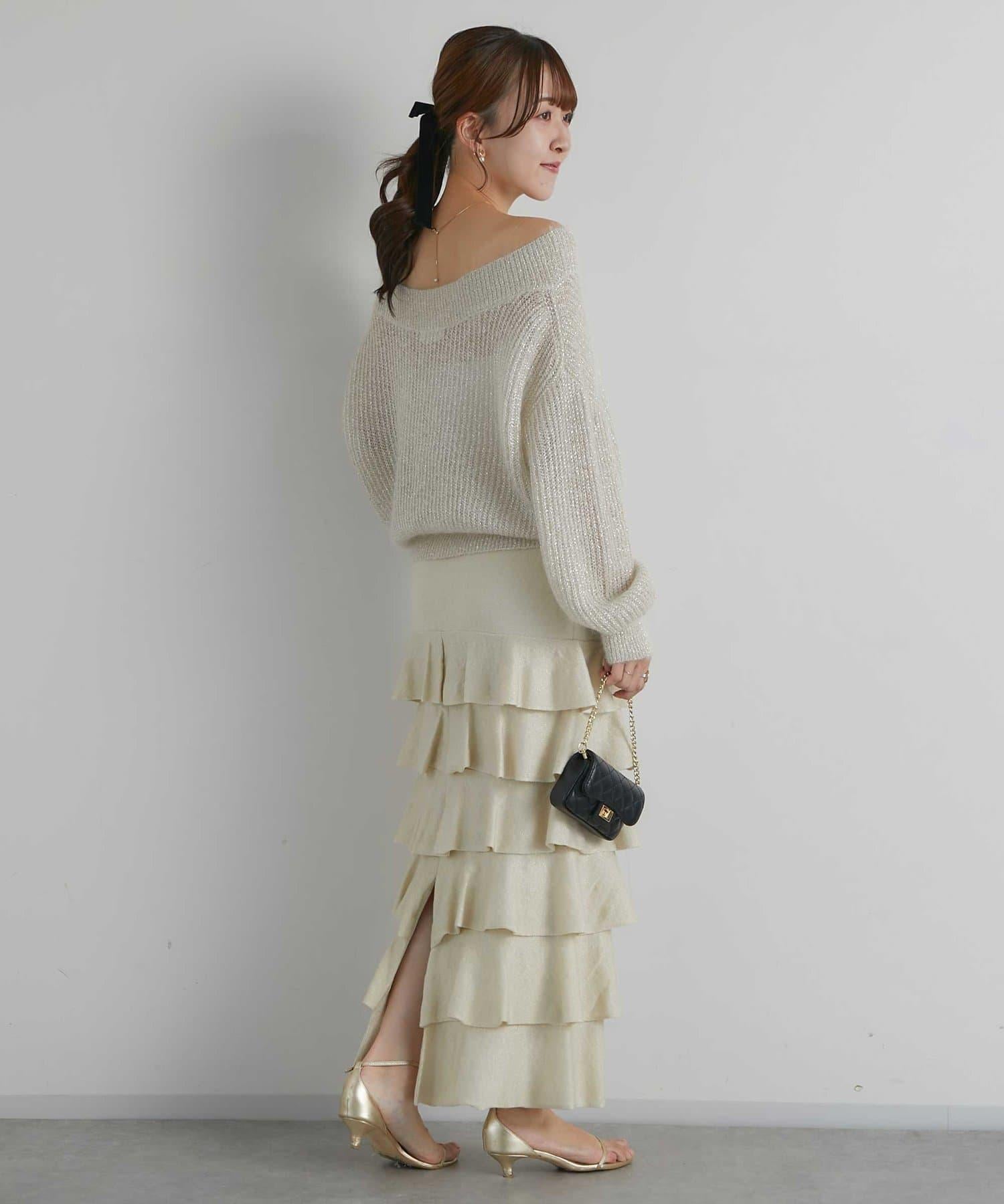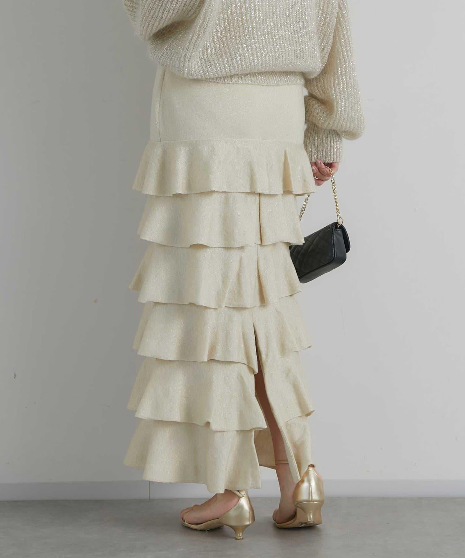 這是一款具有強烈視覺衝擊力的裙子,採用帶有流蘇層疊圖案的薄片針織面料。