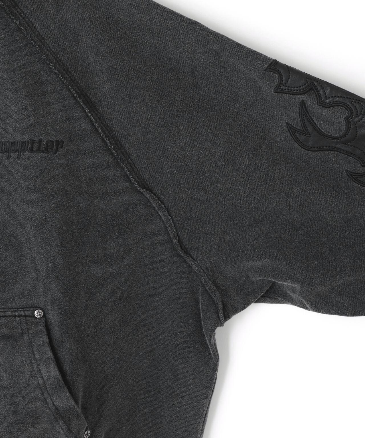 拉鍊連帽衫,採用 SUPPLIER 425GSM 面料。整件布料經過水洗,兜帽、口袋開口和肋部輕微受損,增添了復古氣息。衣袖和後背繡有打孔合成革十字圖案。品牌徽標繡於左胸。袖子採用剪裁,設計為短款和適度偏大的廓形。SUPPLIER ... 作為全球街頭文化的中心,該品牌在亞洲、歐洲、南非和美國銷售 50 多個品牌,被譽為無國界品牌。SUPPLIER 是一個來自日本的街頭文化平臺,作為全球街頭文化的中心,代理了來自亞洲、歐洲、南非和美國的 50 多個品牌,並將無國界的此時此地持續發生的文化供應到您的家門口。