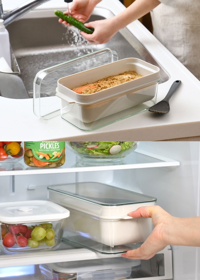 一個用於醃製蔬菜的容器,有一個排水縫隙孔,可以適度地自然排出蔬菜中的水分。 時尚、簡單、緊湊的設計,大小剛好可以容納1公斤的發酵包穀,可以輕鬆地放在冰箱裡。它有一個類似玻璃的透明外容器,因此你可以立即檢查麩皮的狀態和釋放的水分。蔬菜中多餘的水通過內部容器的縫隙孔自然排出外部容器。
