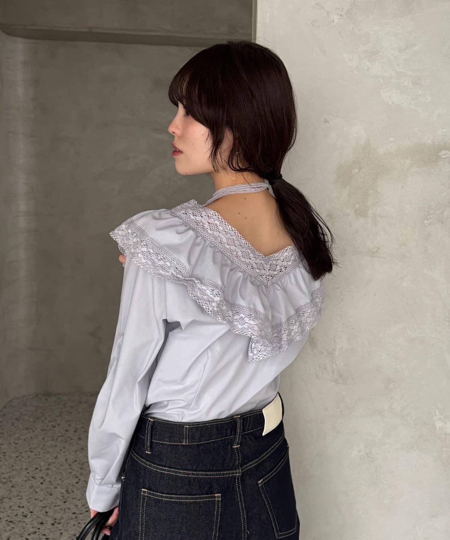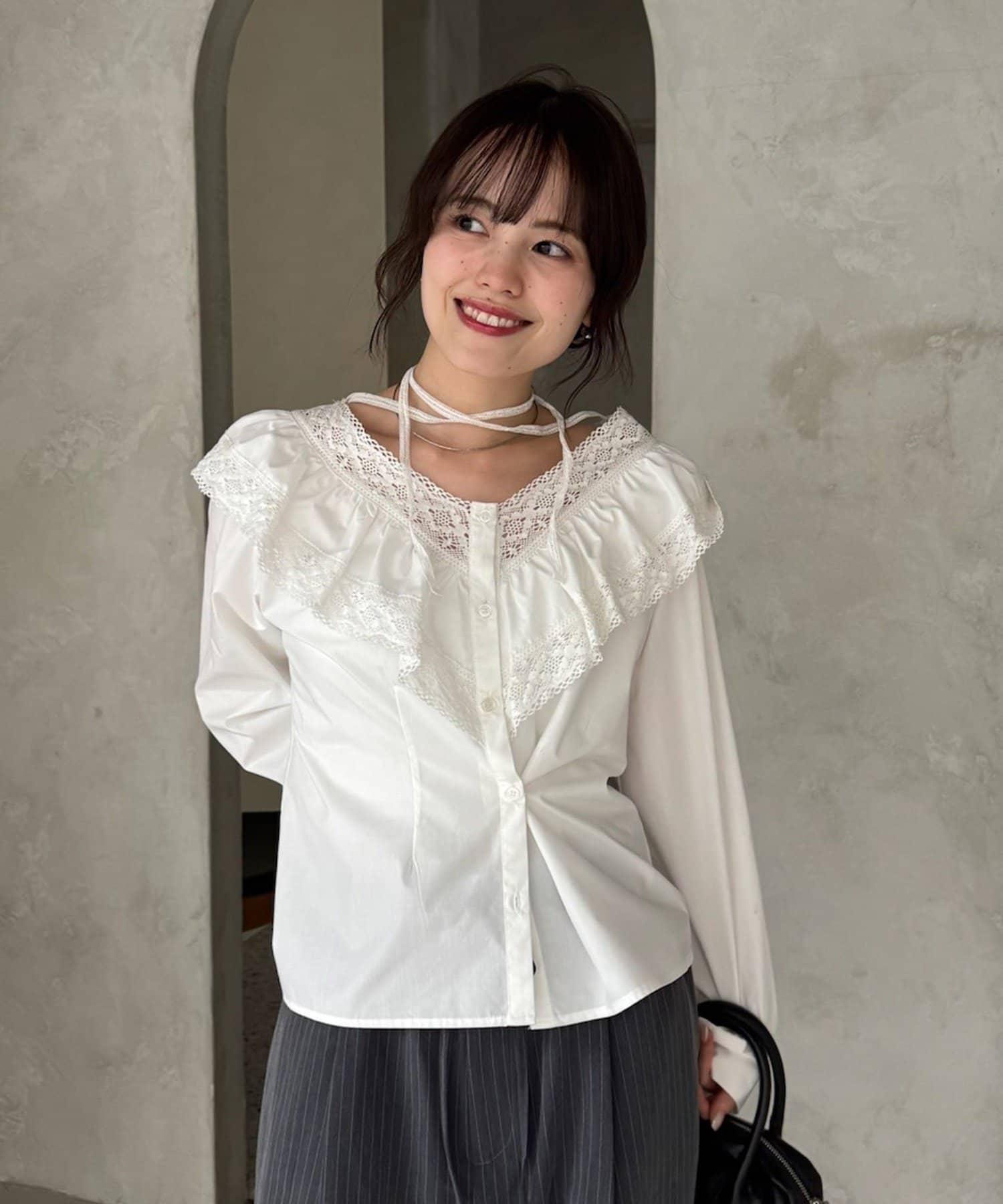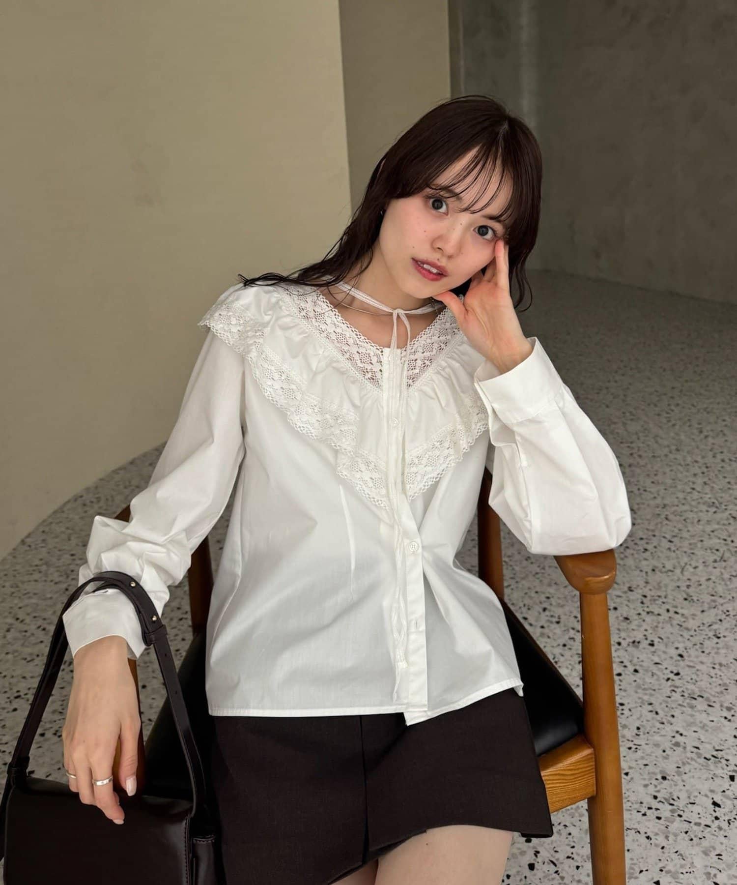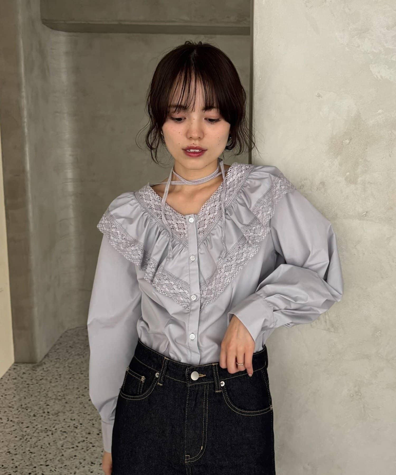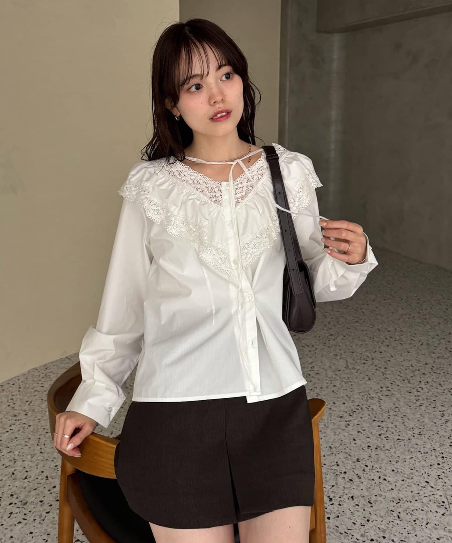 V 領的設計使領口線條更加簡潔,蕾絲面料使其具有適度的開放感和柔和的氛圍。