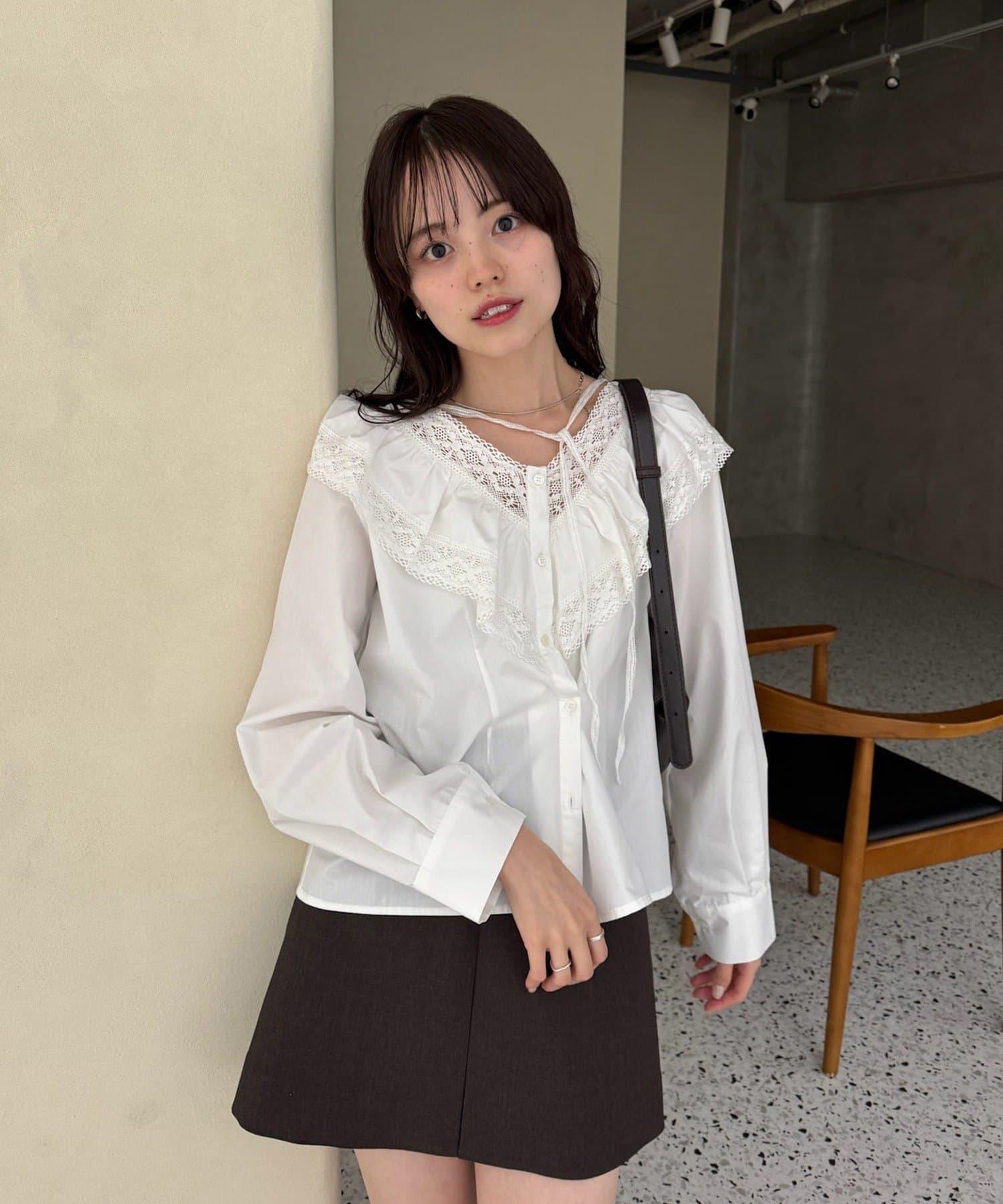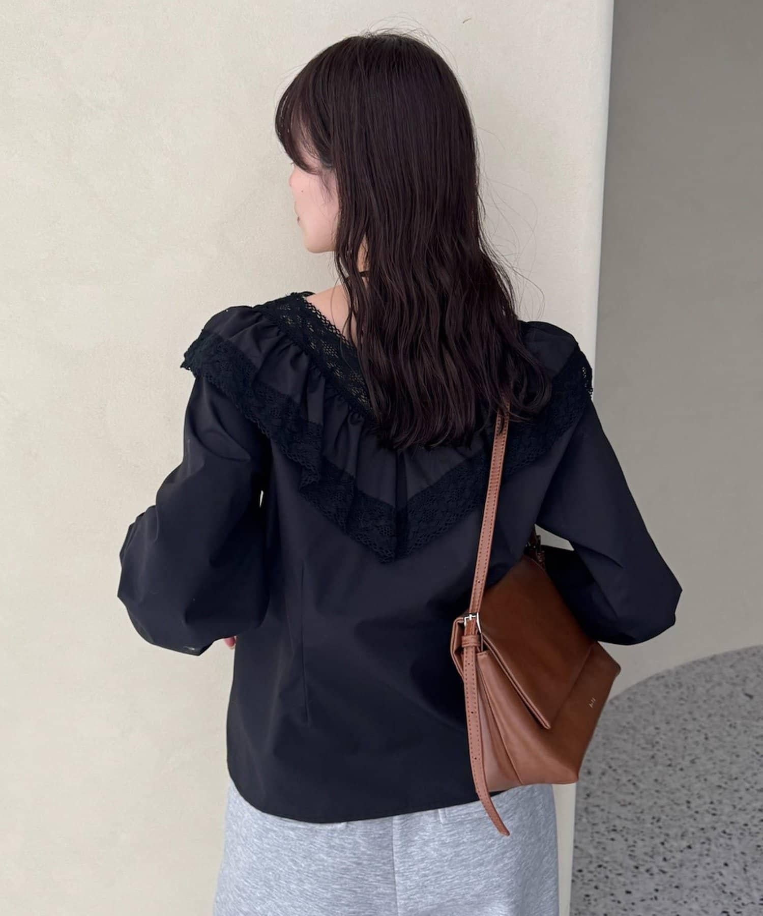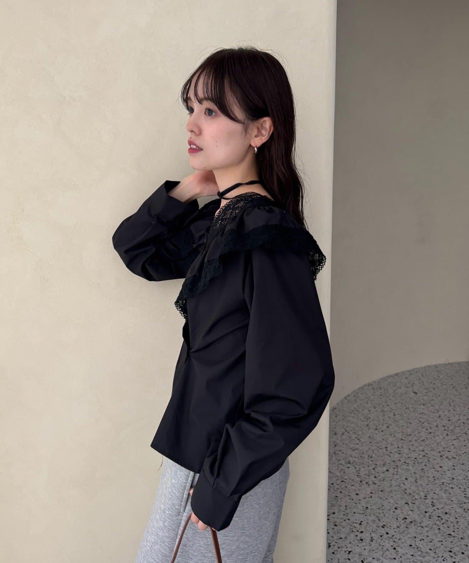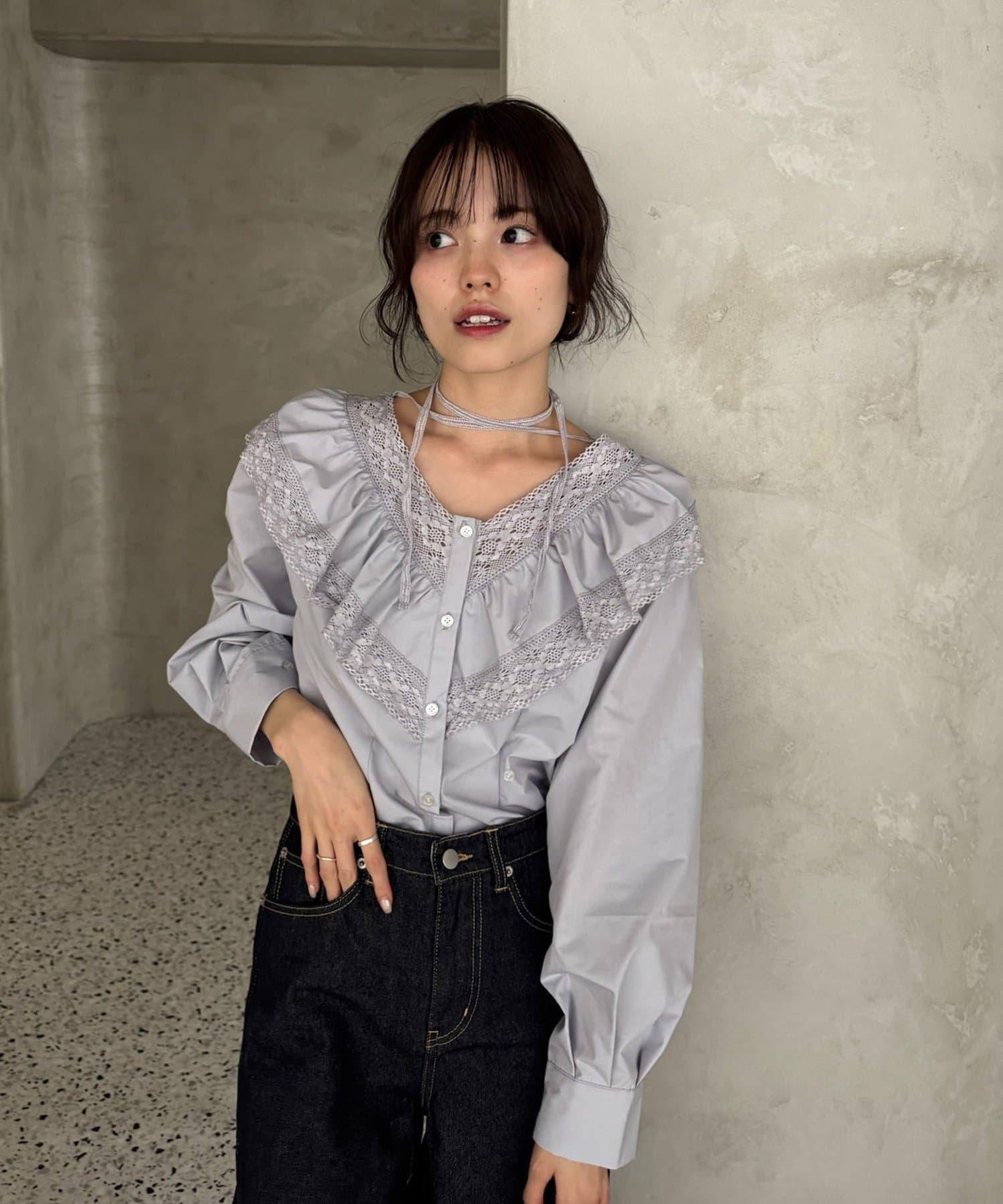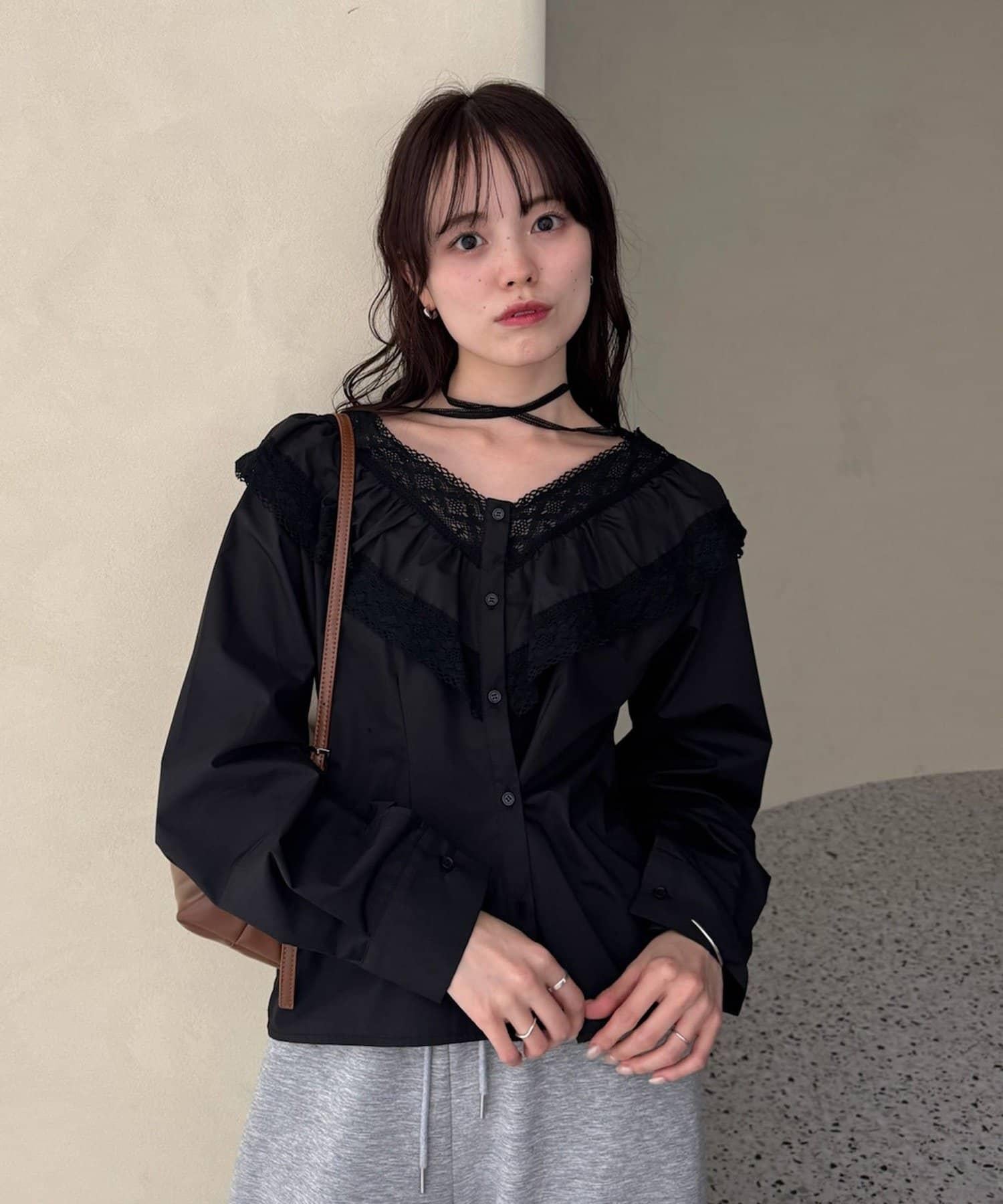 V 領的設計使領口線條更加簡潔,蕾絲面料使其具有適度的開放感和柔和的氛圍。