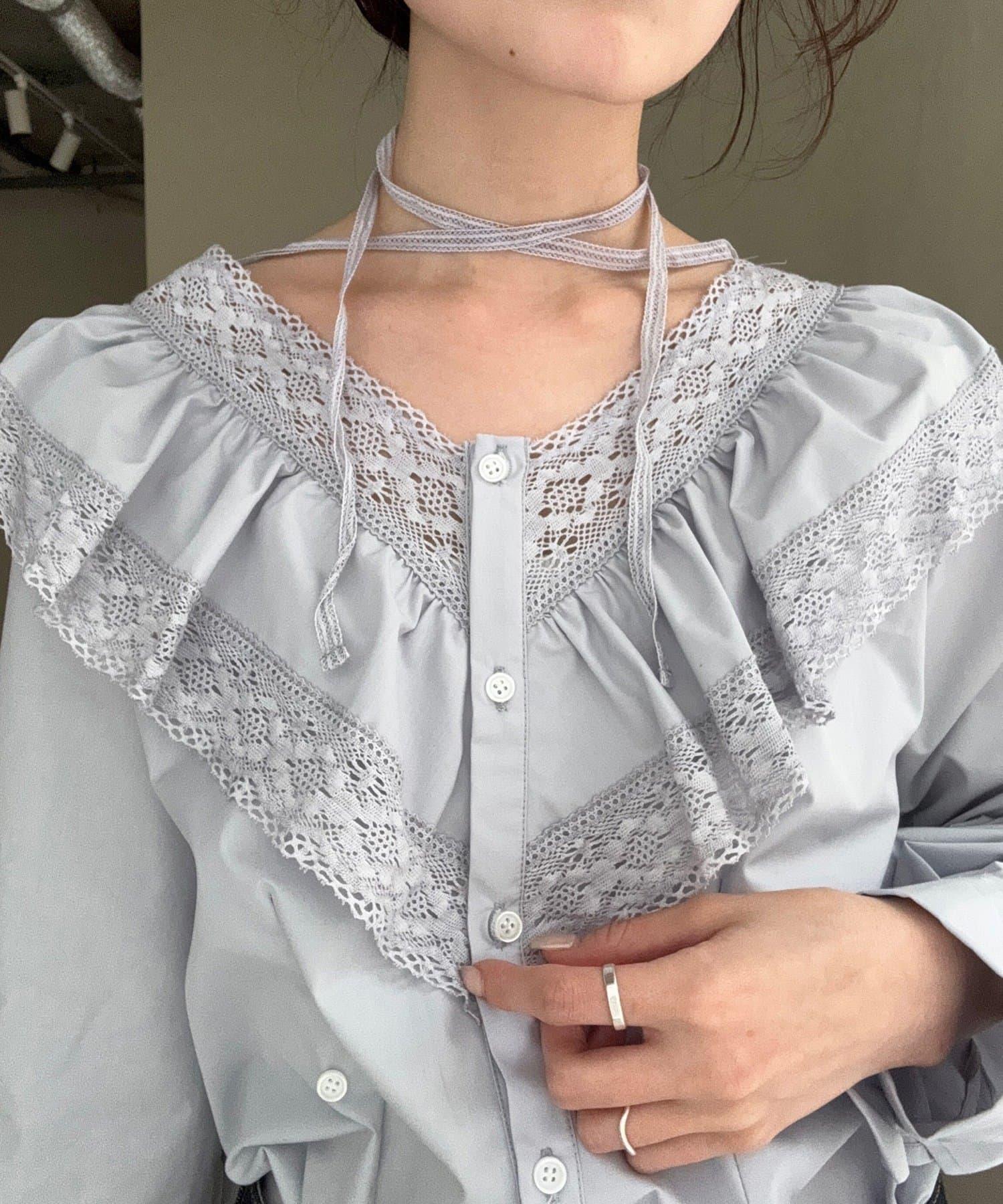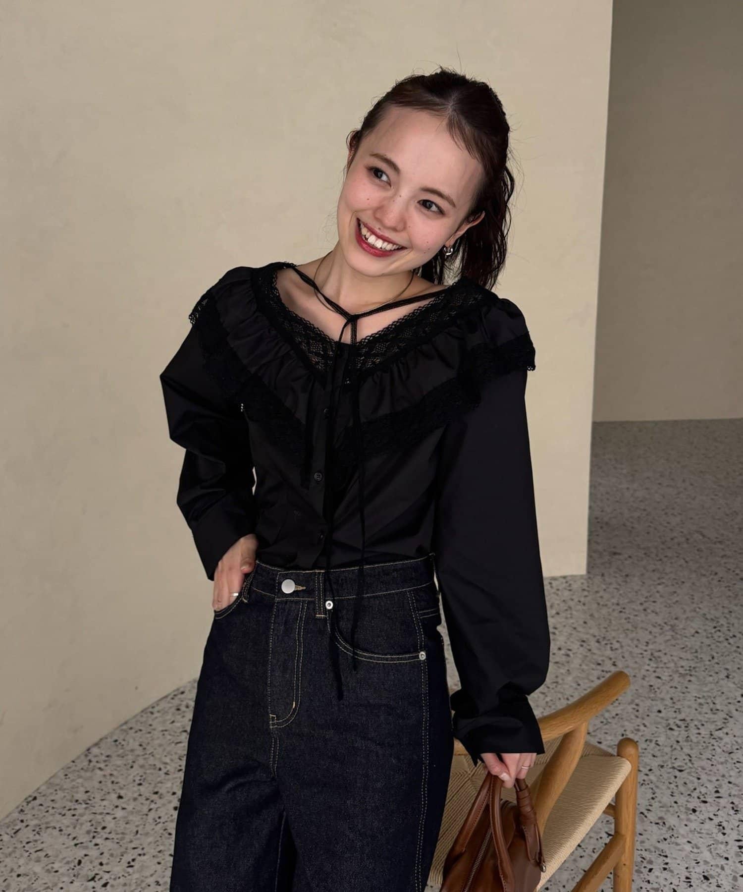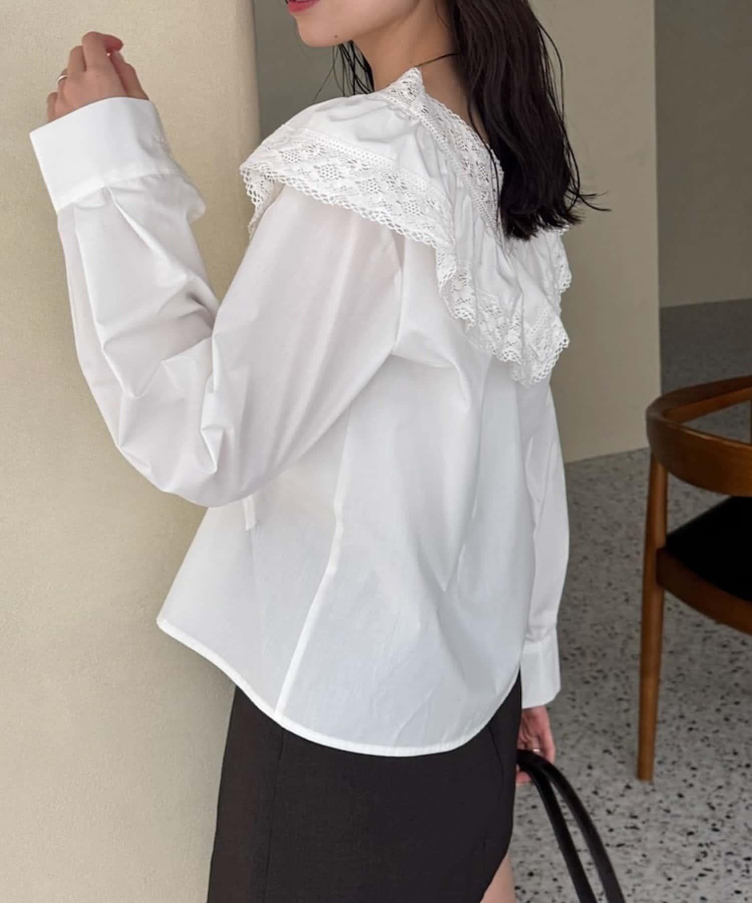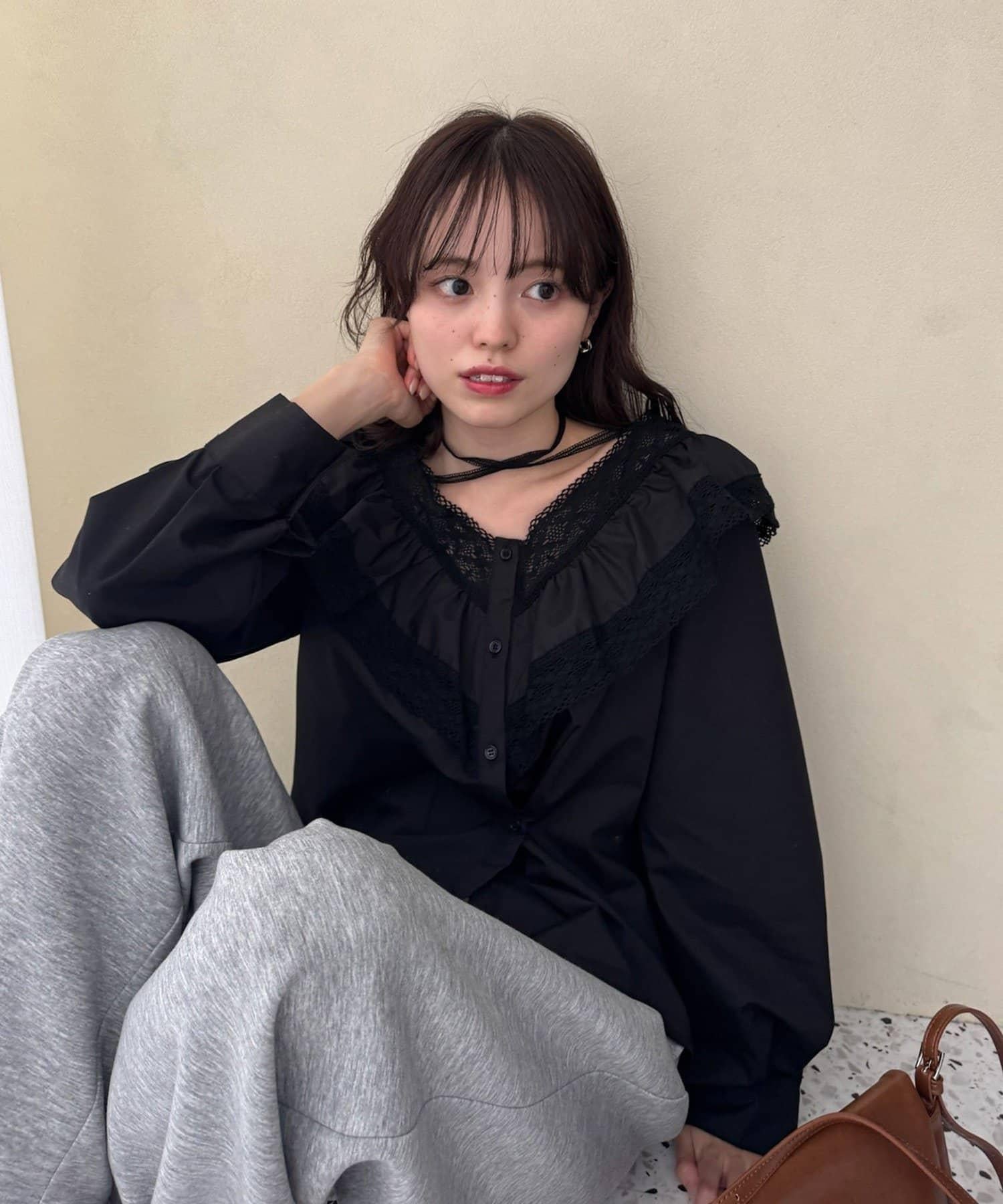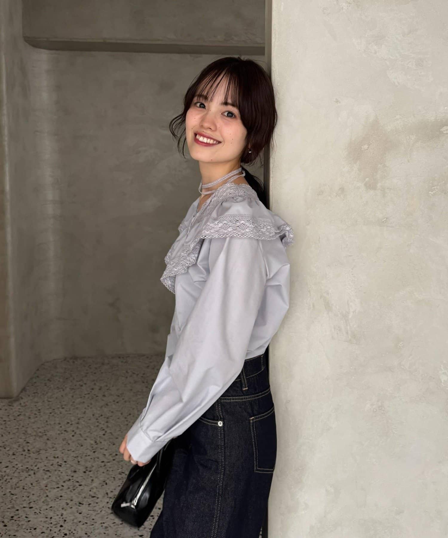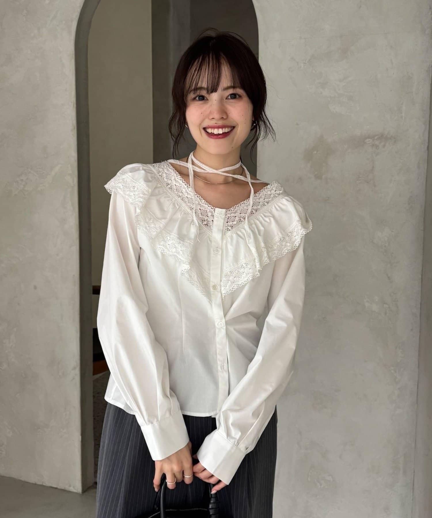 V 領的設計使領口線條更加簡潔,蕾絲面料使其具有適度的開放感和柔和的氛圍。