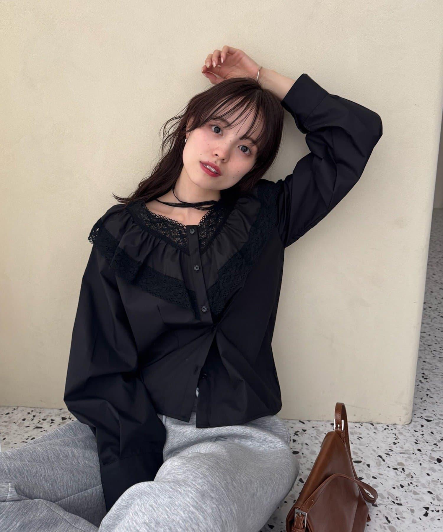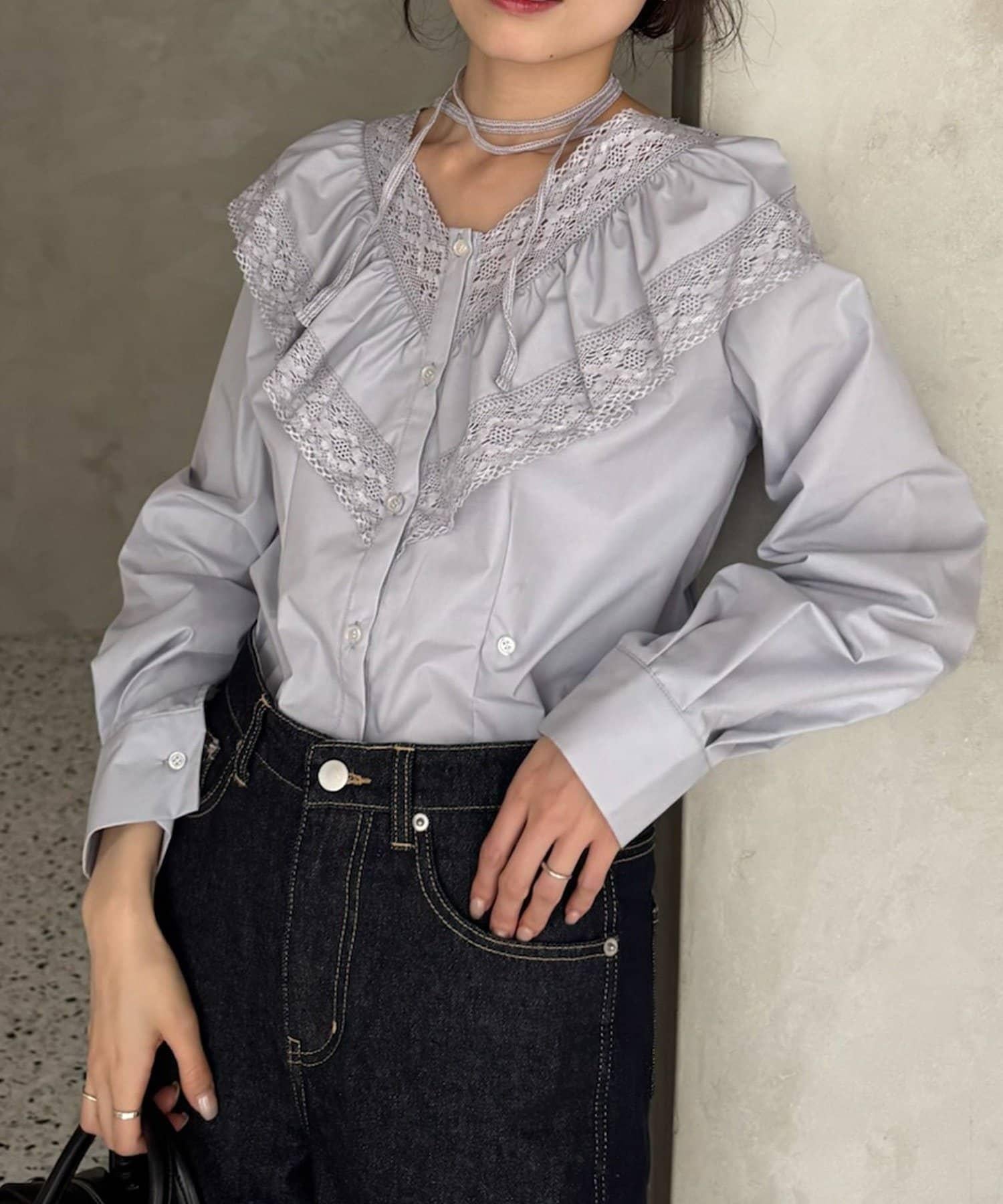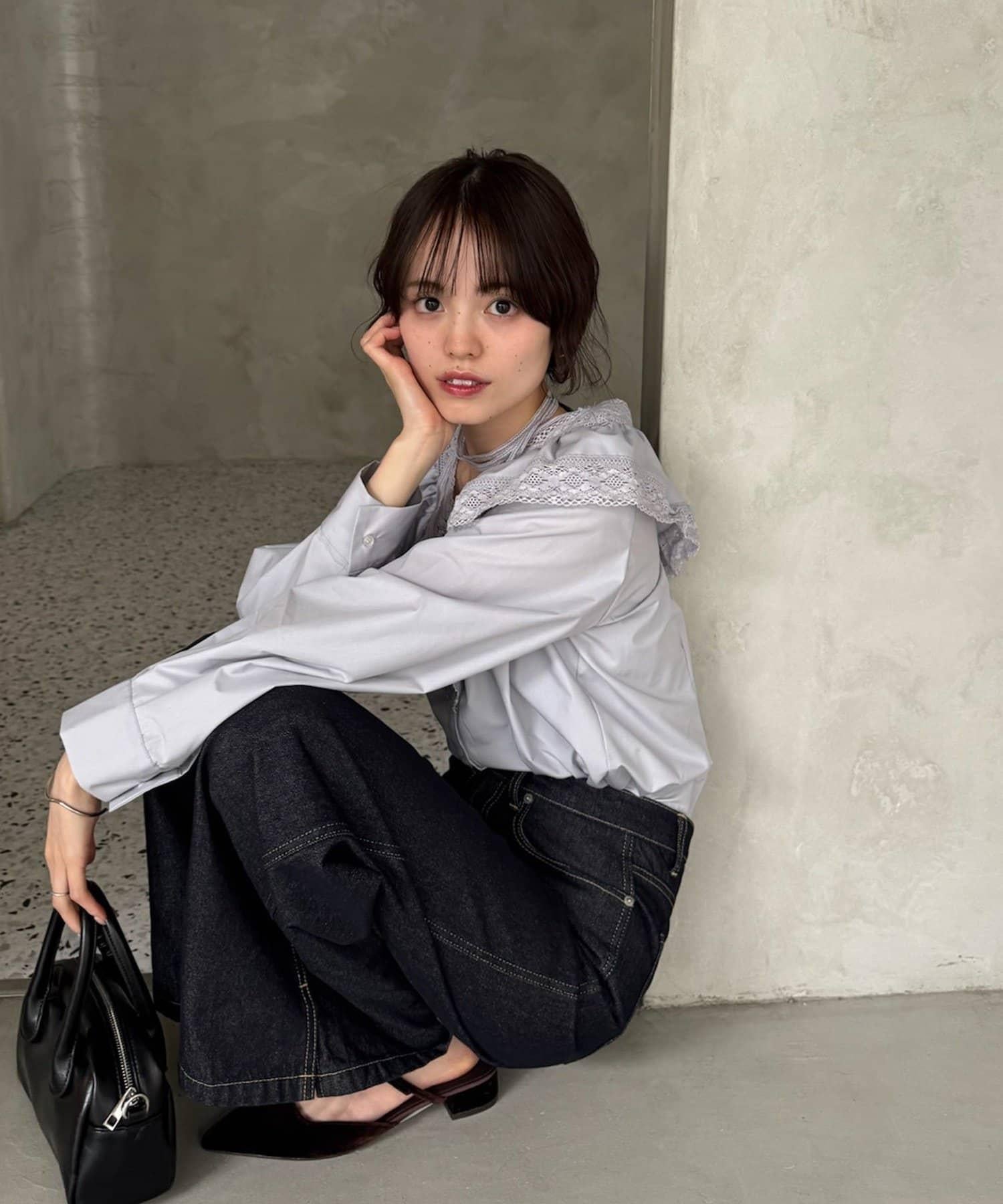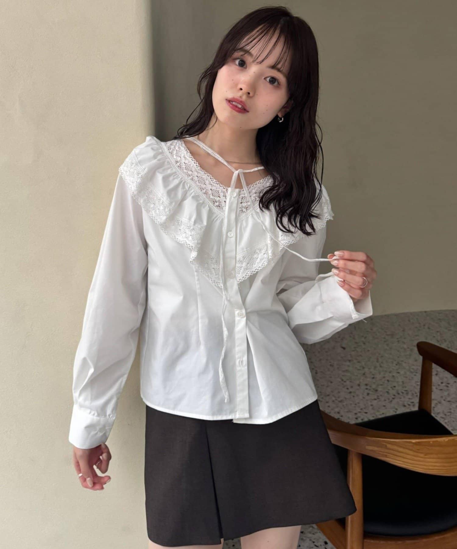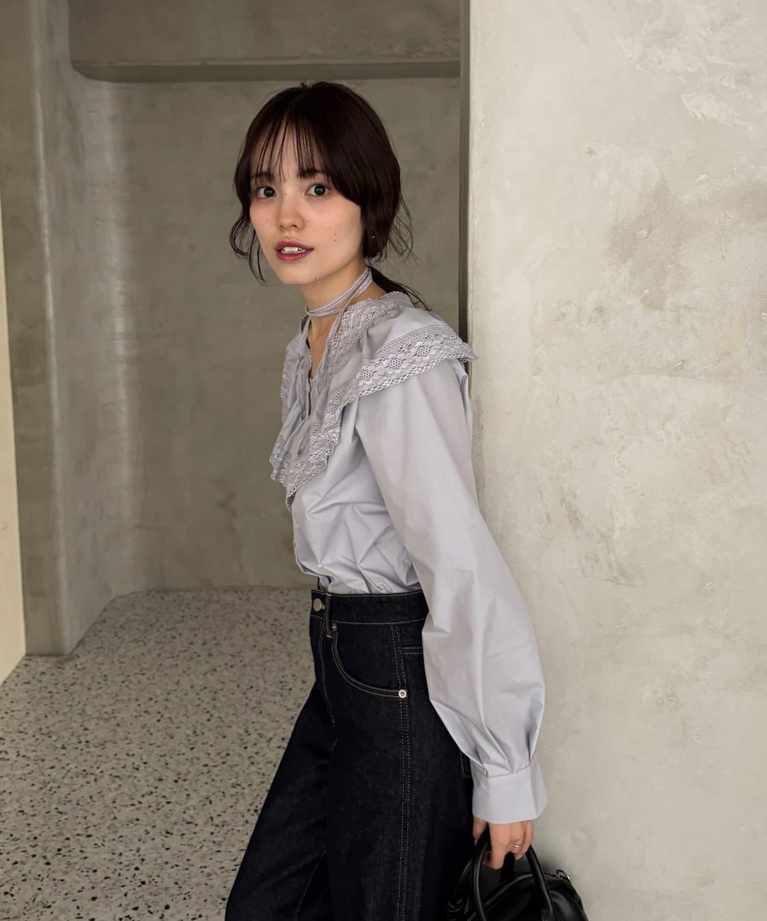 V 領的設計使領口線條更加簡潔,蕾絲面料使其具有適度的開放感和柔和的氛圍。