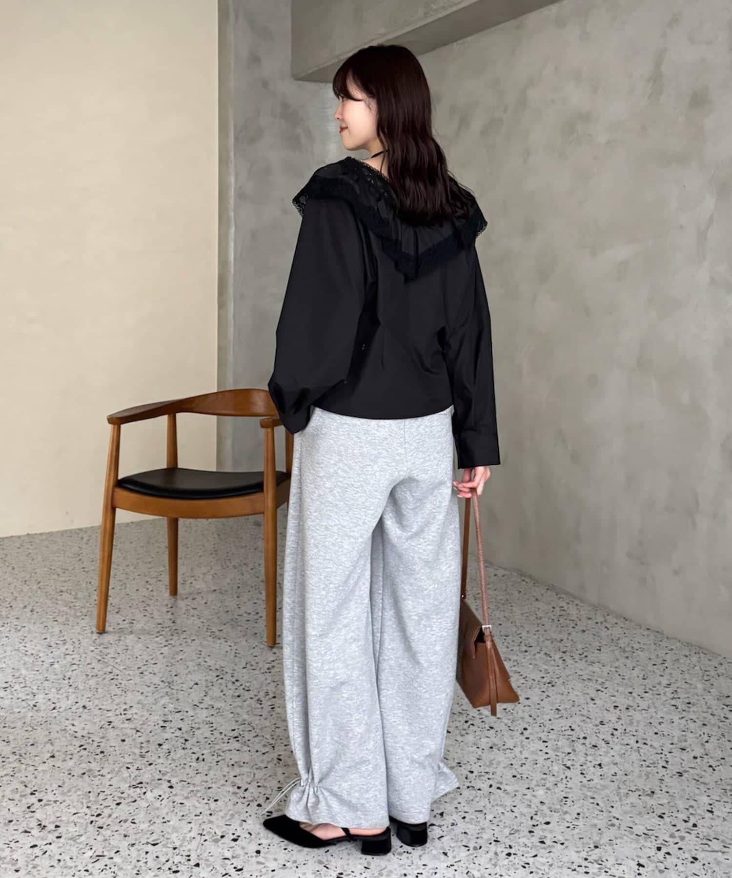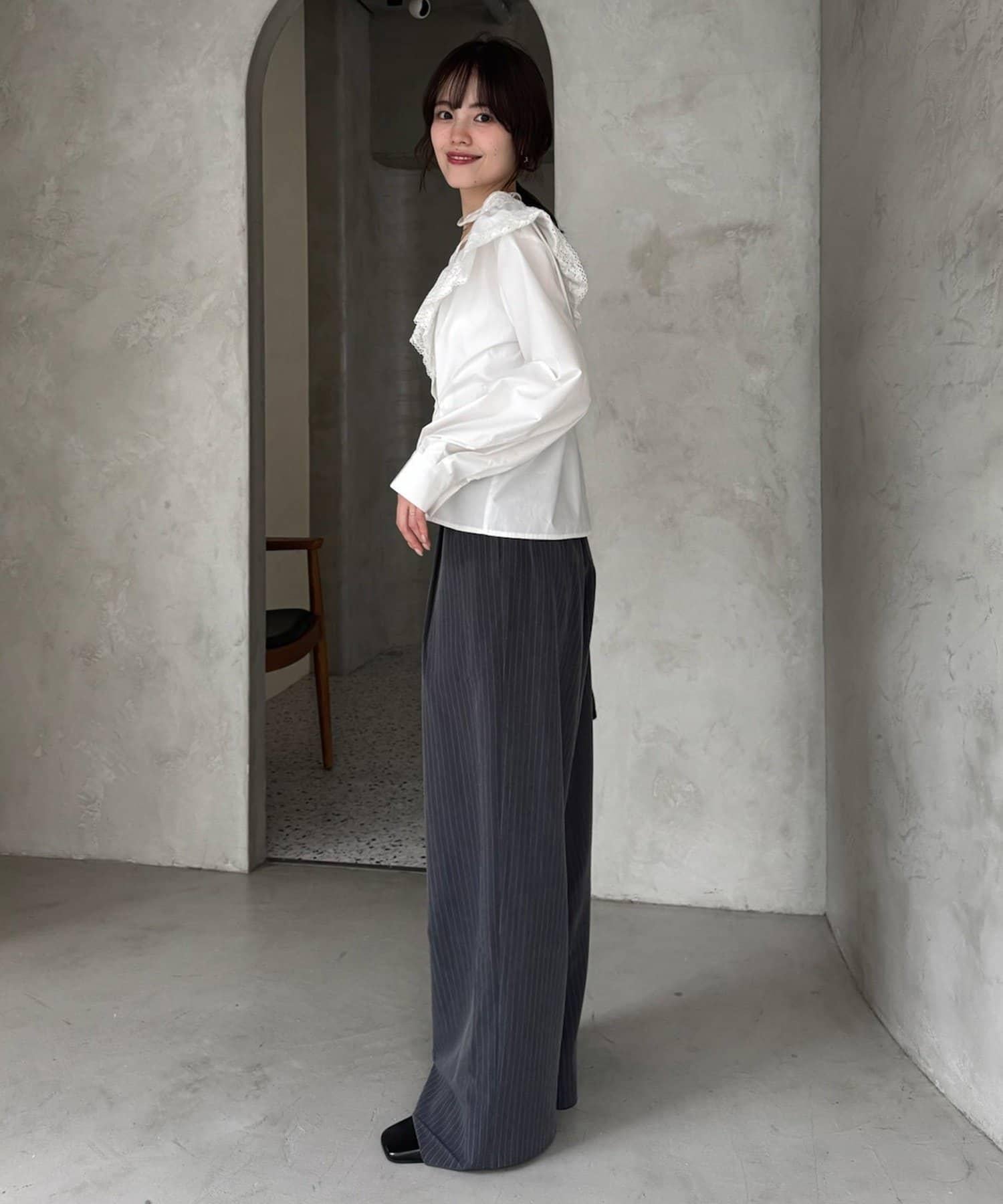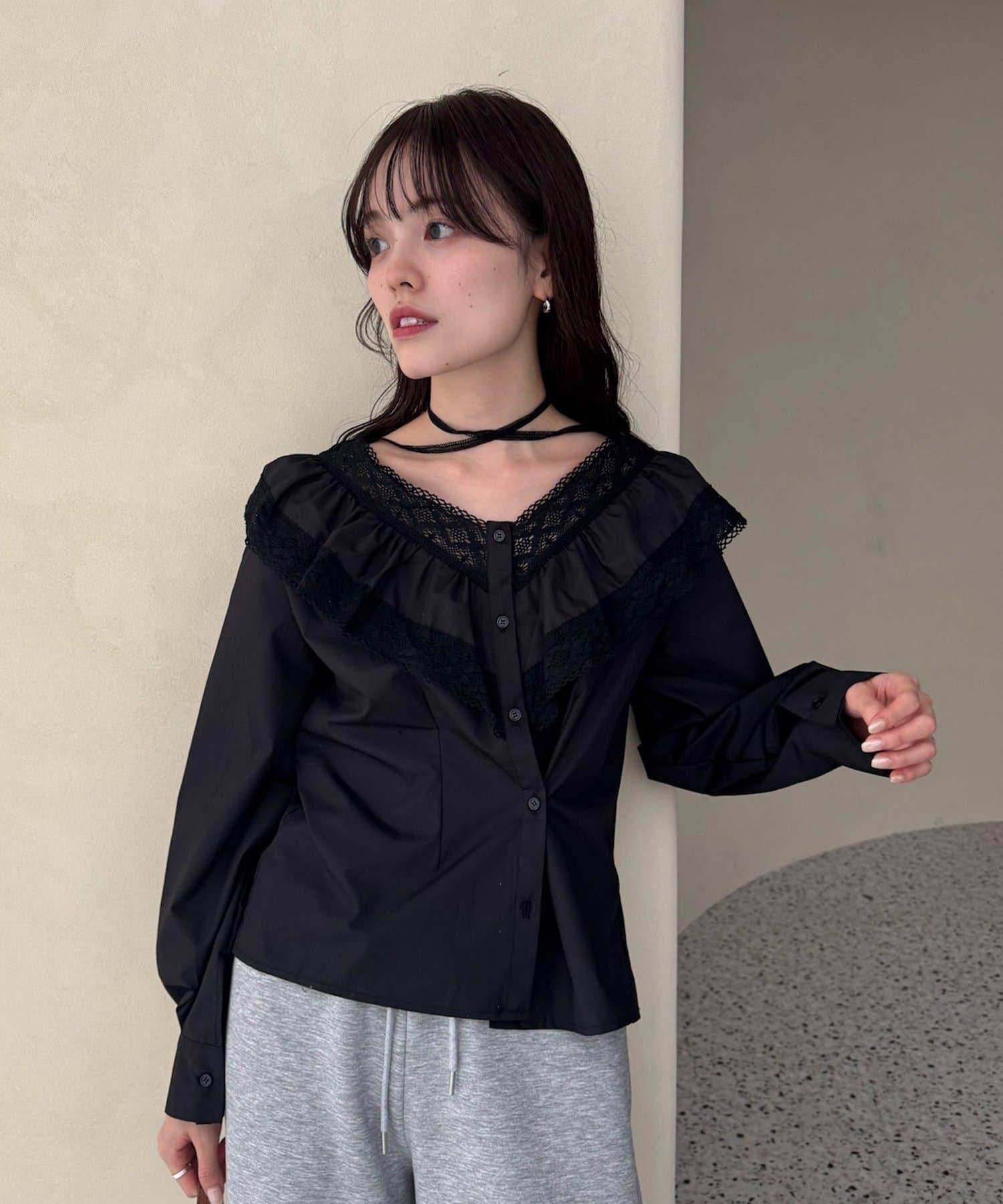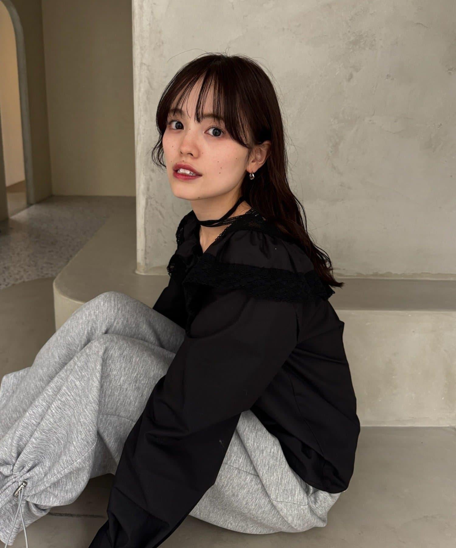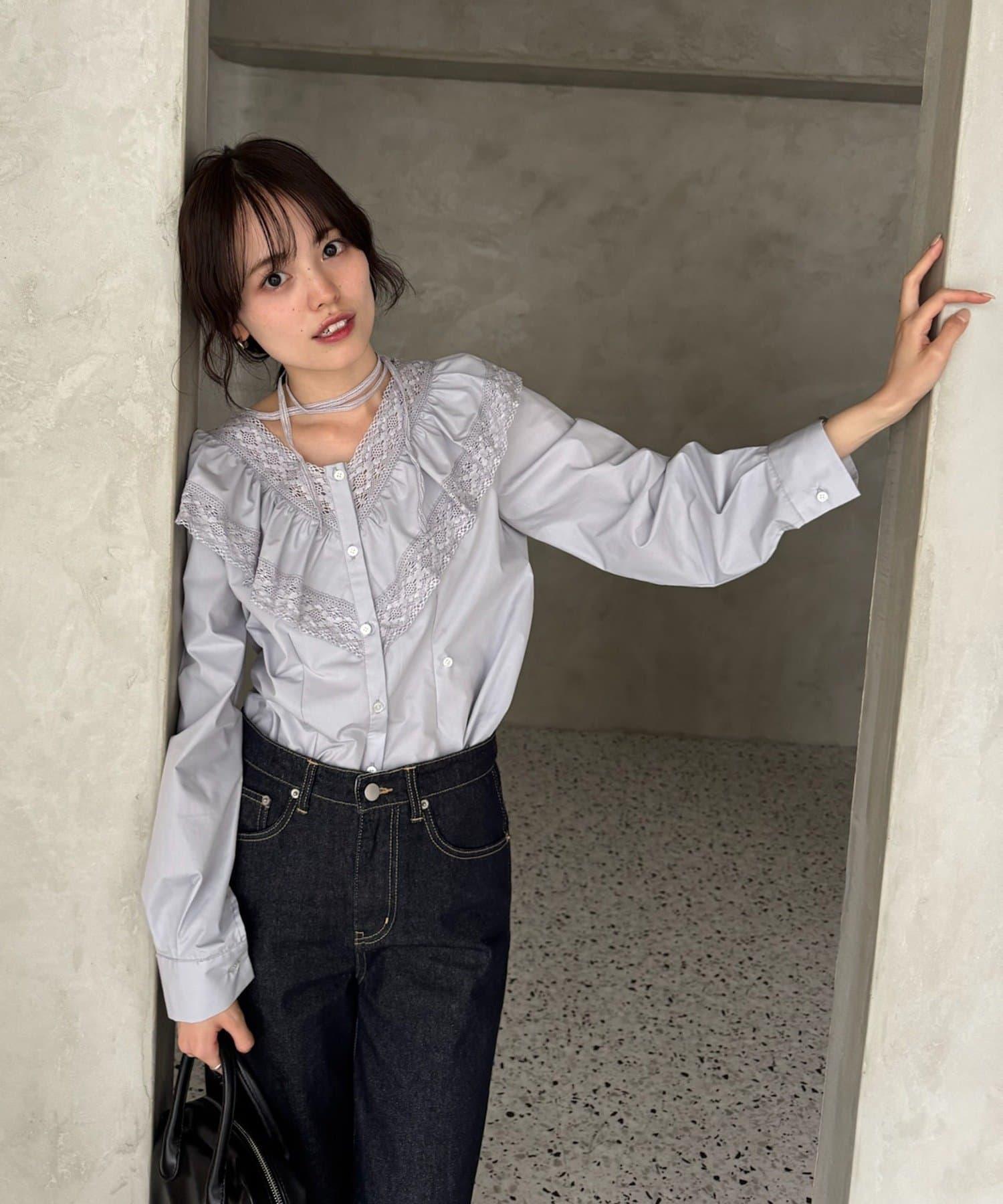 V 領的設計使領口線條更加簡潔,蕾絲面料使其具有適度的開放感和柔和的氛圍。