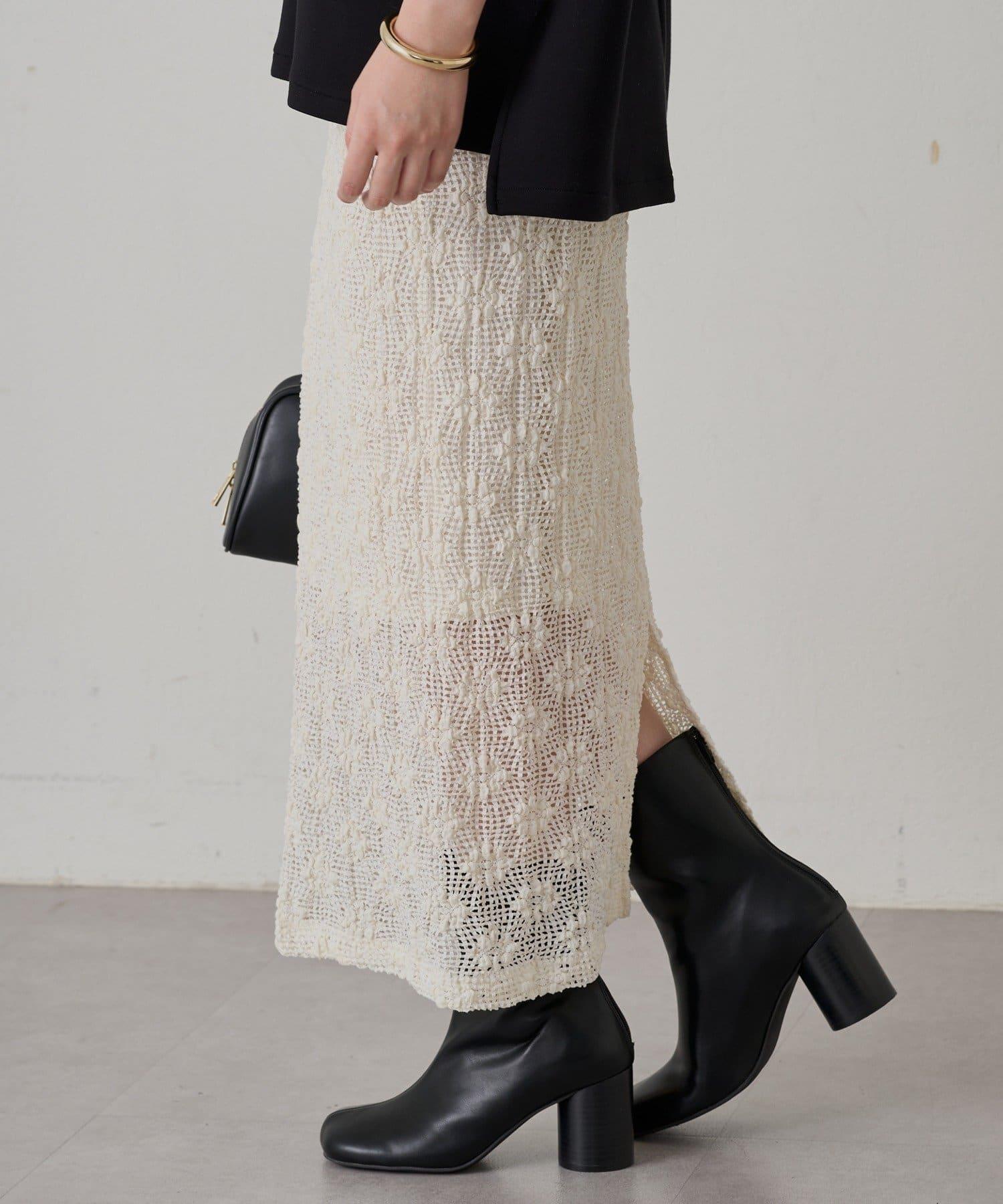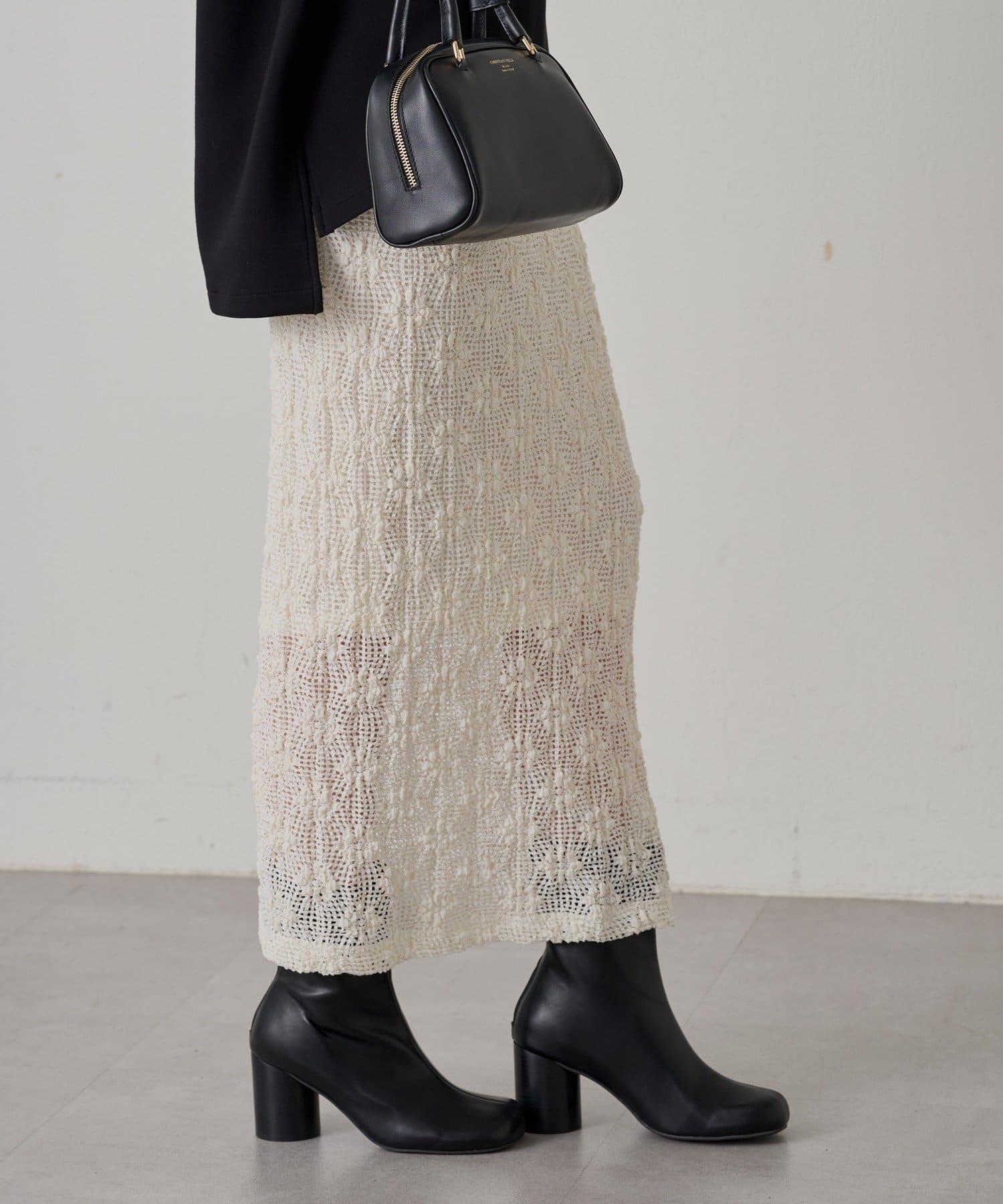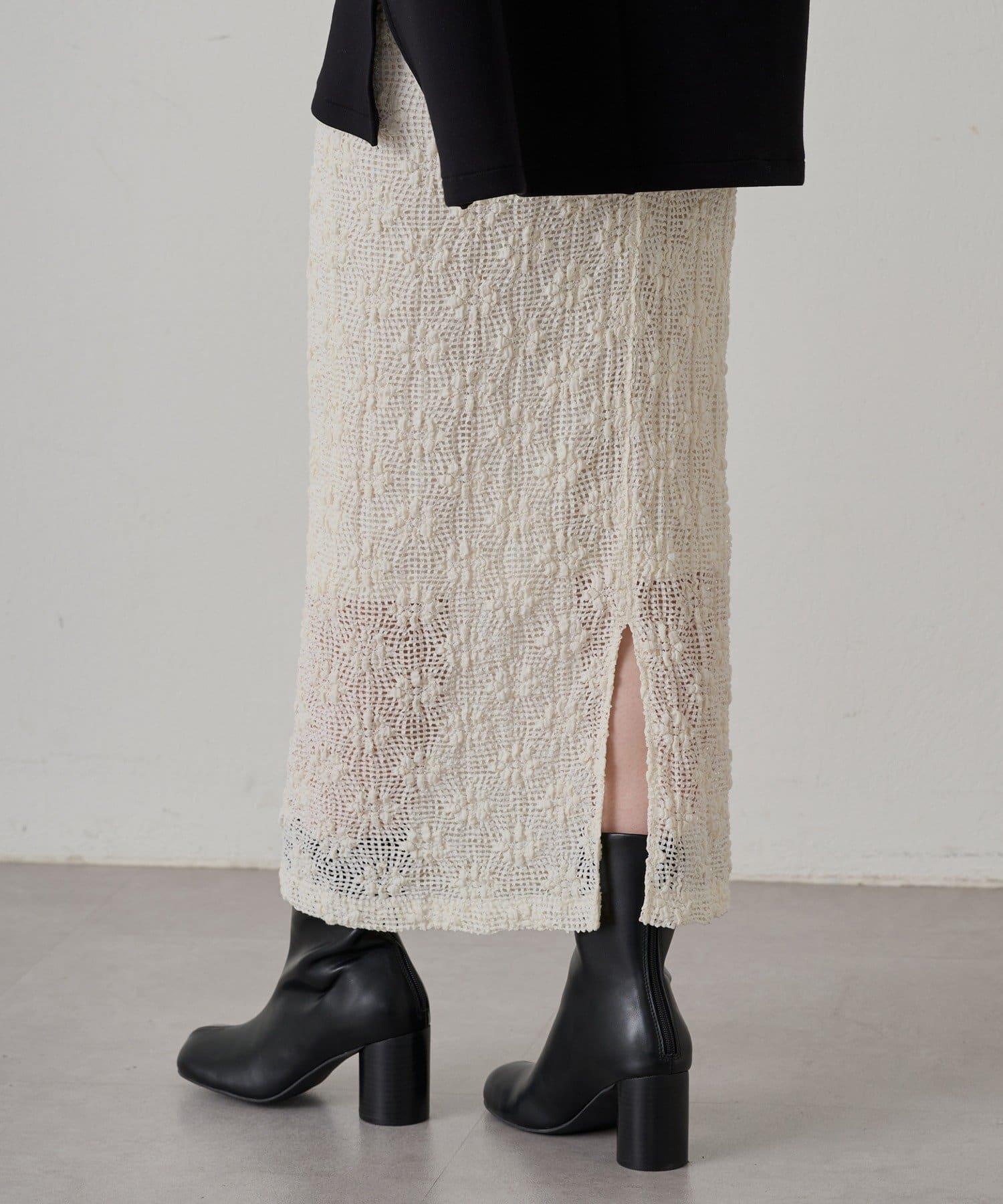 透明 I 字形輪廓的蕾絲半身裙。 鏤空針織面料使這款半身裙涼爽宜人,非常適合春夏季節穿著。超長的長度給人一種輕鬆的感覺。腰部鬆緊設計確保穿著舒適。