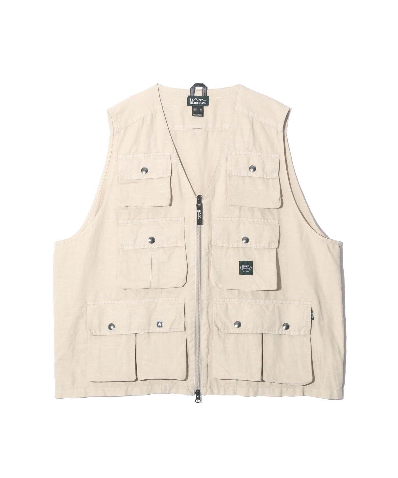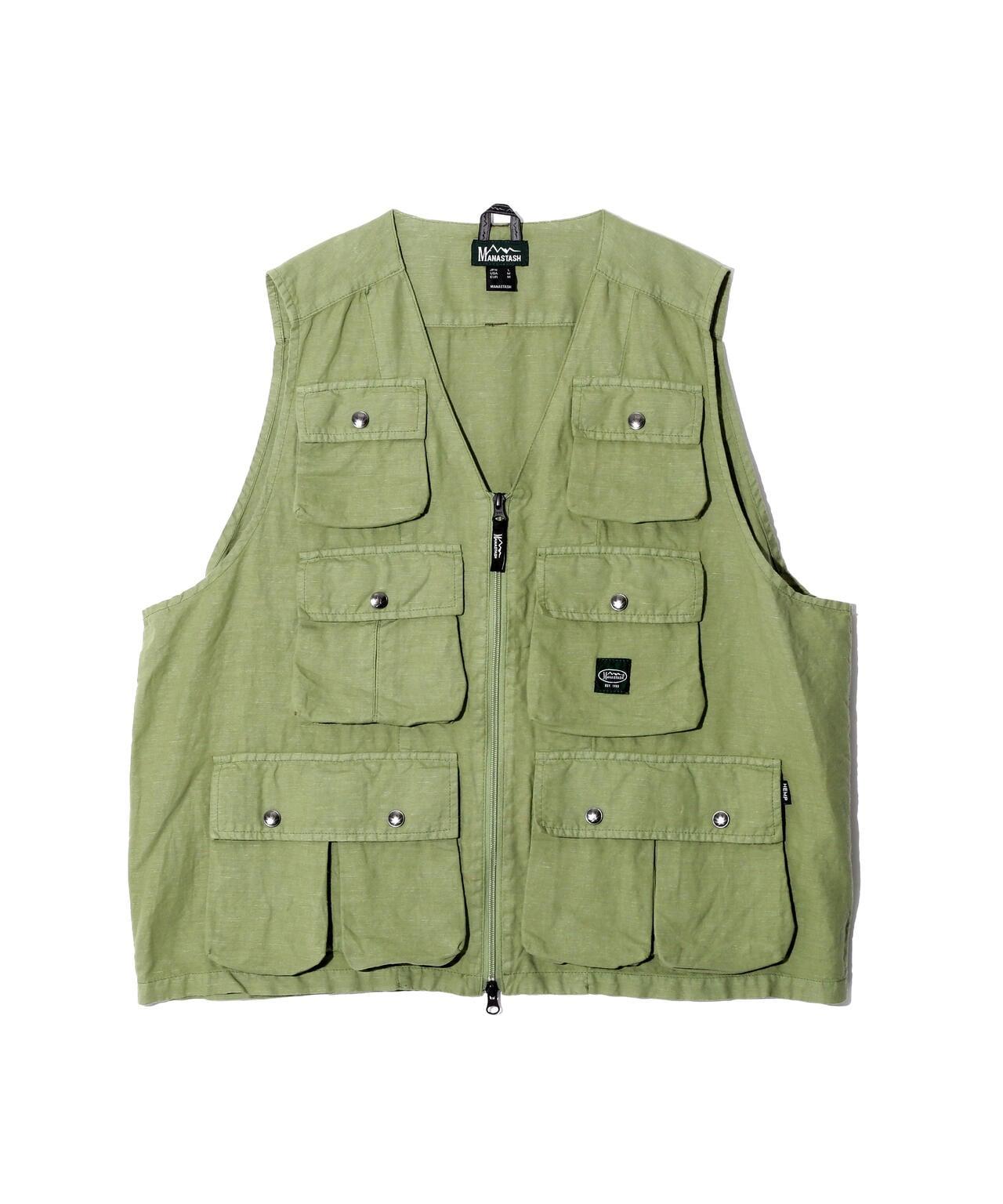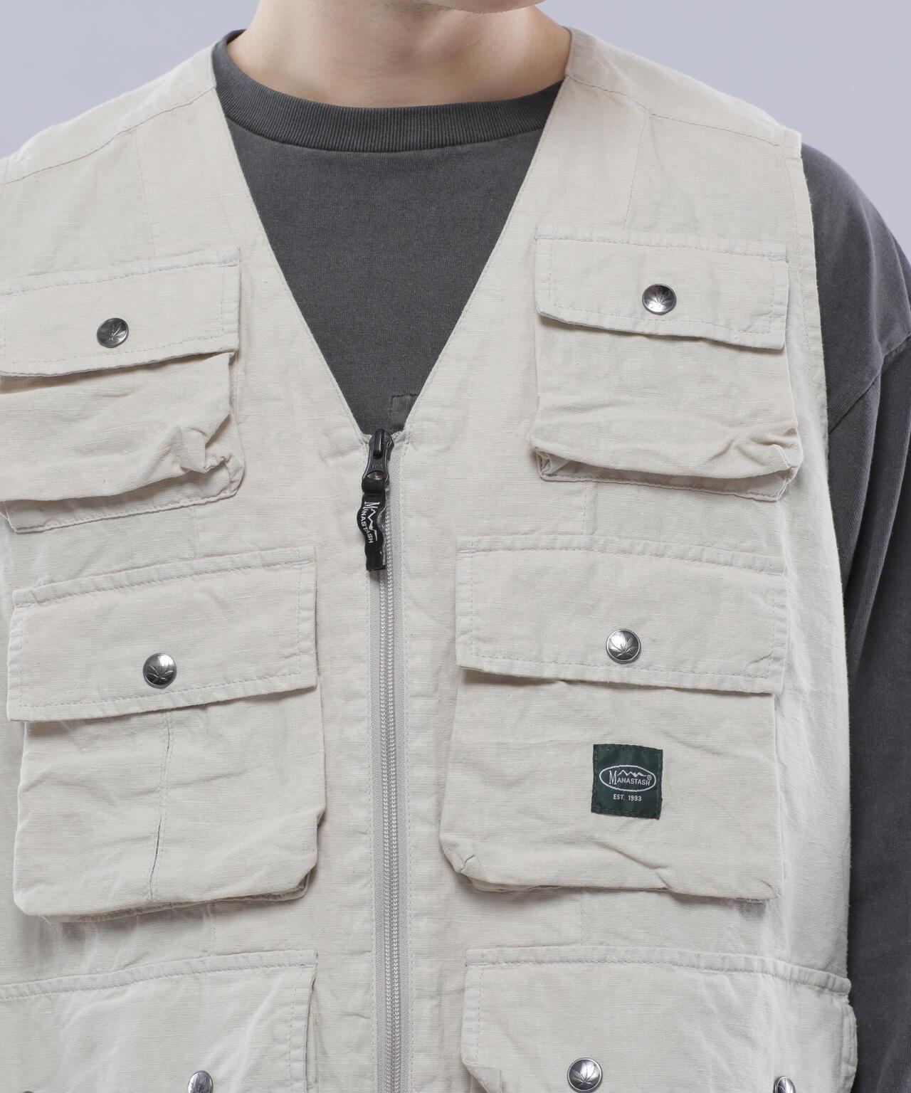 MANASTASH / MANASTASH / HEMP POP VEST / HEMP POP VEST 材質55% HEMP/ 45% COTTON府綢材質特點 - 與標準的 CHILLIWACK 系列材質 <Hemp Twill> 相比,這款馬甲採用了更薄的麻混紡材質。該產品以釣魚背心的細節為基礎,容量很大,共有九個口袋,八個在前面,一個大口袋在後面,這是它👍的特點。印有麻質印記的原版按扣是那些即使在夏天也不想揹包的人的堅強盟友,同時也為造型增添了一道亮麗的風景線。