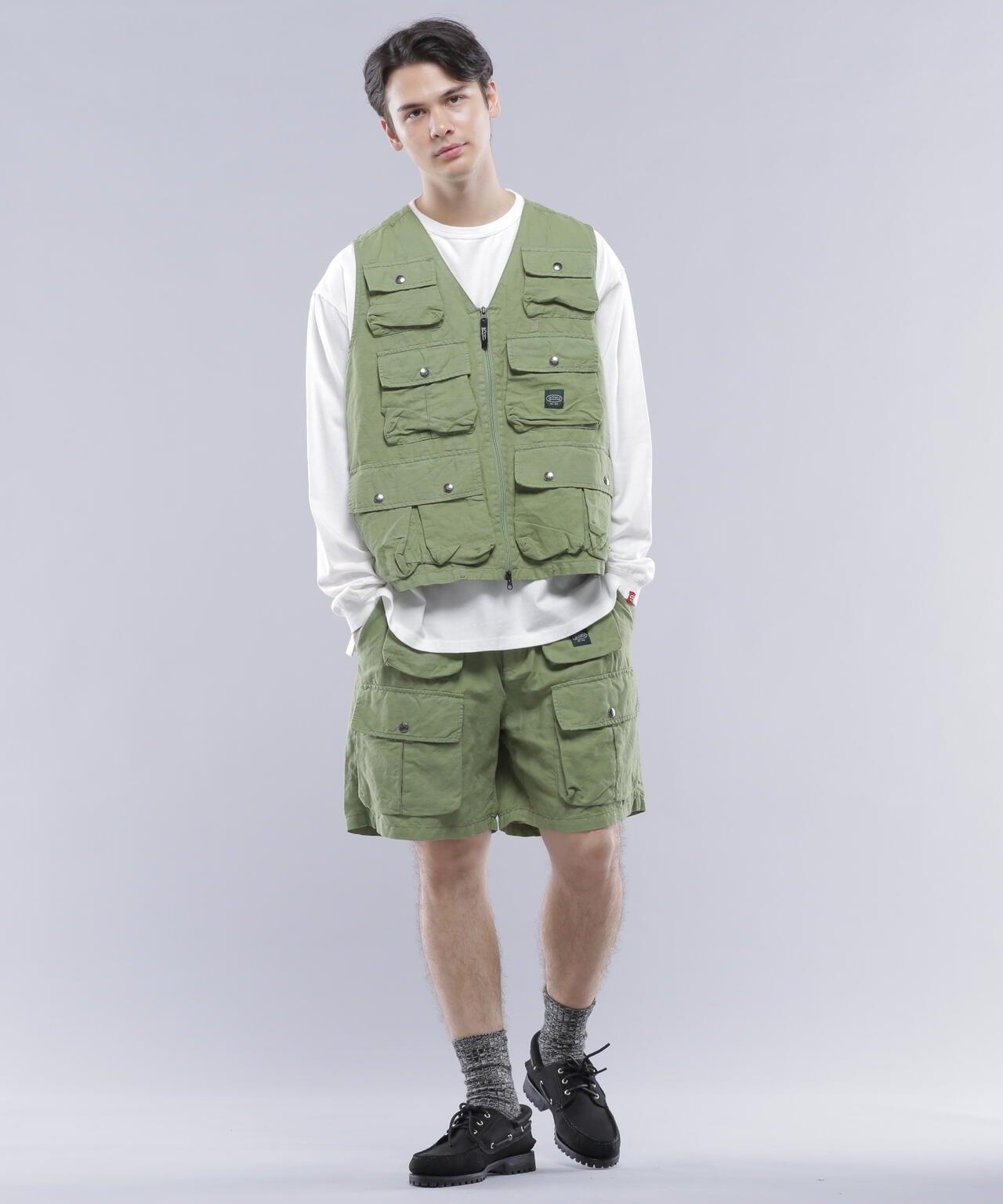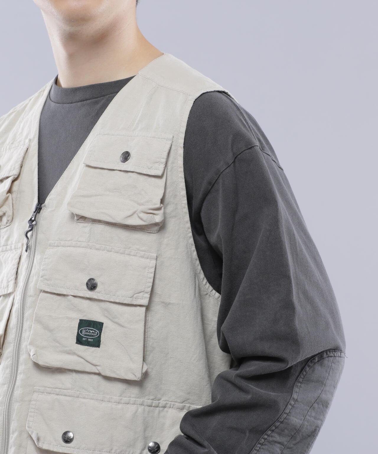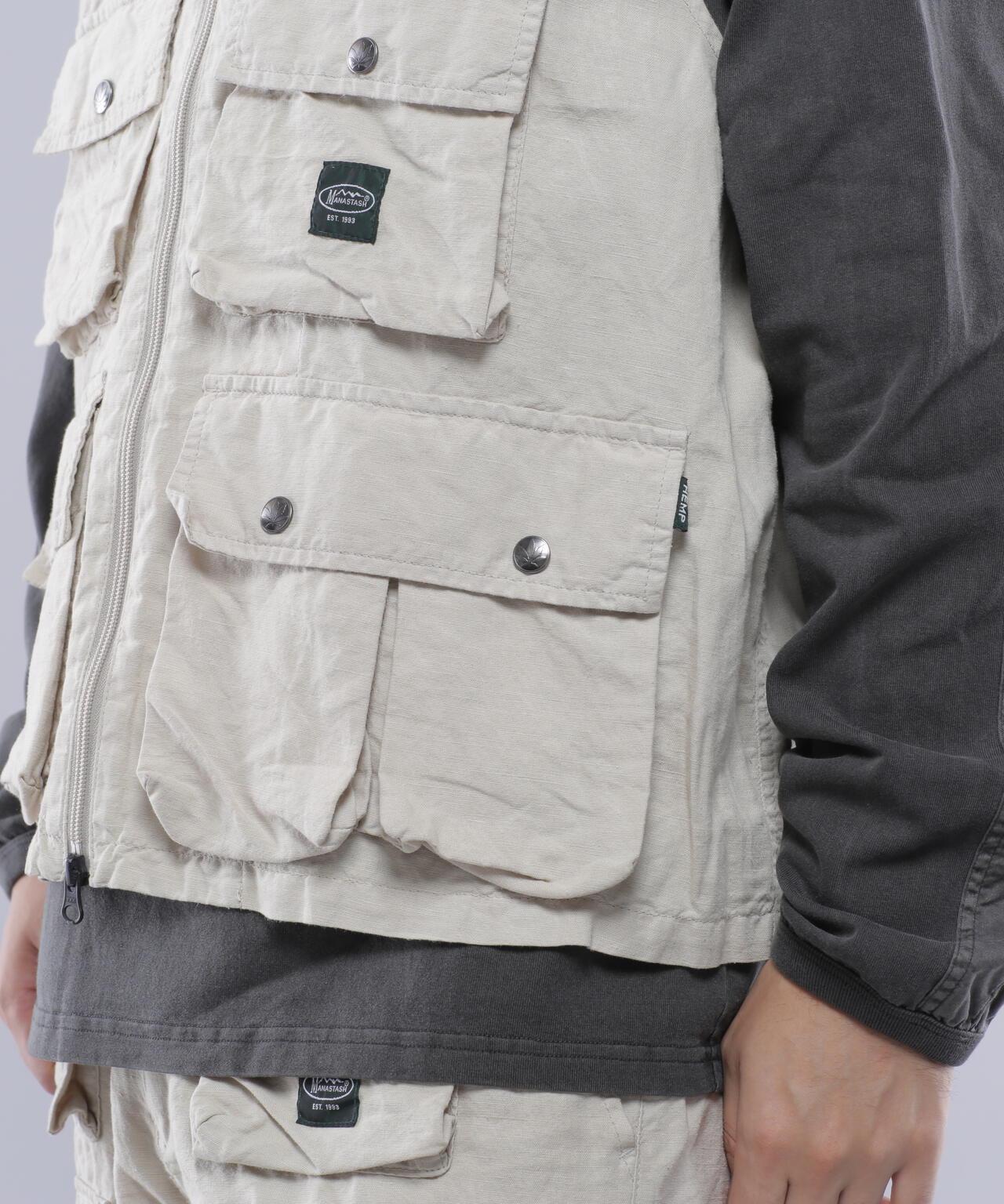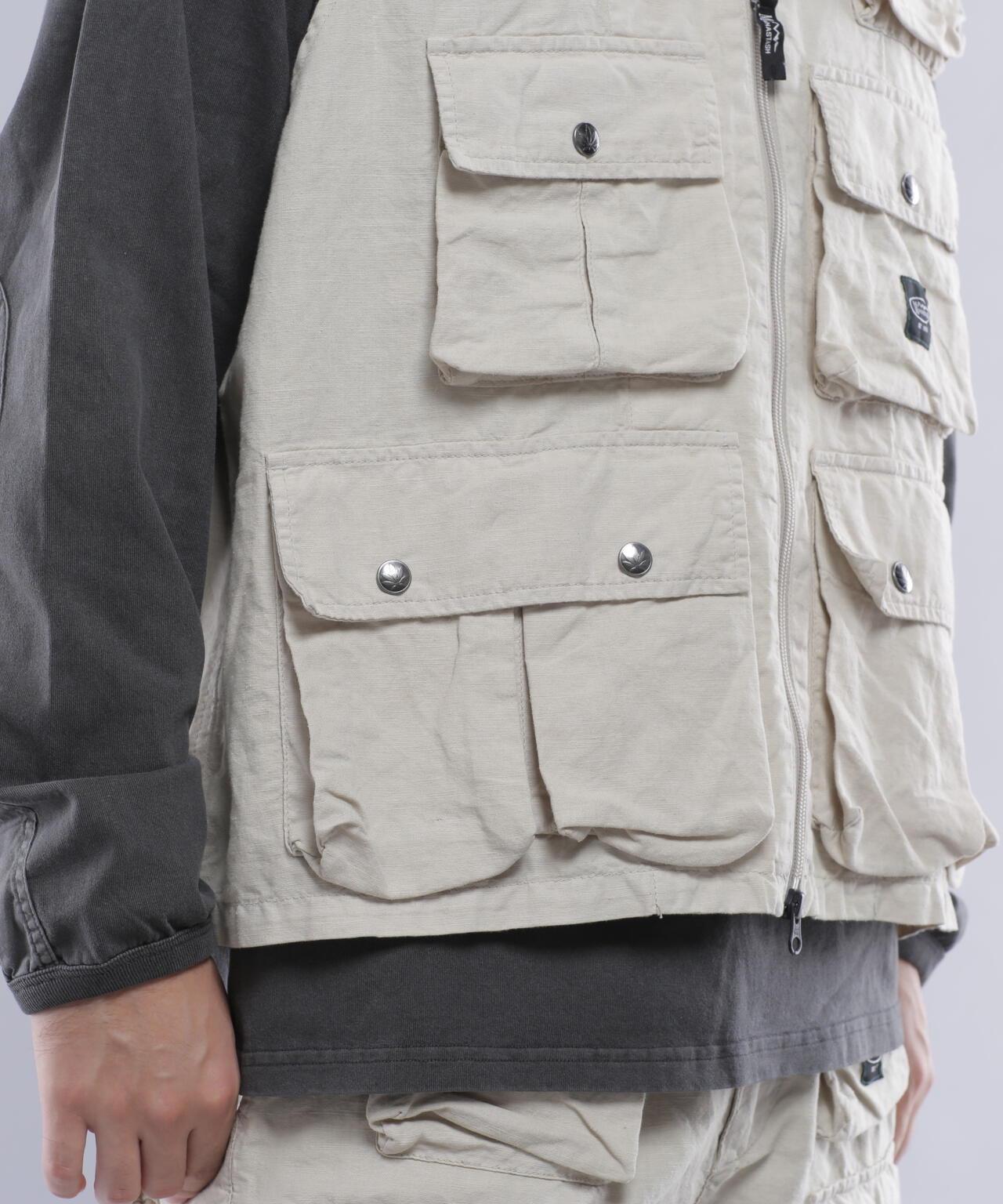 MANASTASH / MANASTASH / HEMP POP VEST / HEMP POP VEST 材質55% HEMP/ 45% COTTON府綢材質特點 - 與標準的 CHILLIWACK 系列材質 <Hemp Twill> 相比,這款馬甲採用了更薄的麻混紡材質。該產品以釣魚背心的細節為基礎,容量很大,共有九個口袋,八個在前面,一個大口袋在後面,這是它👍的特點。印有麻質印記的原版按扣是那些即使在夏天也不想揹包的人的堅強盟友,同時也為造型增添了一道亮麗的風景線。