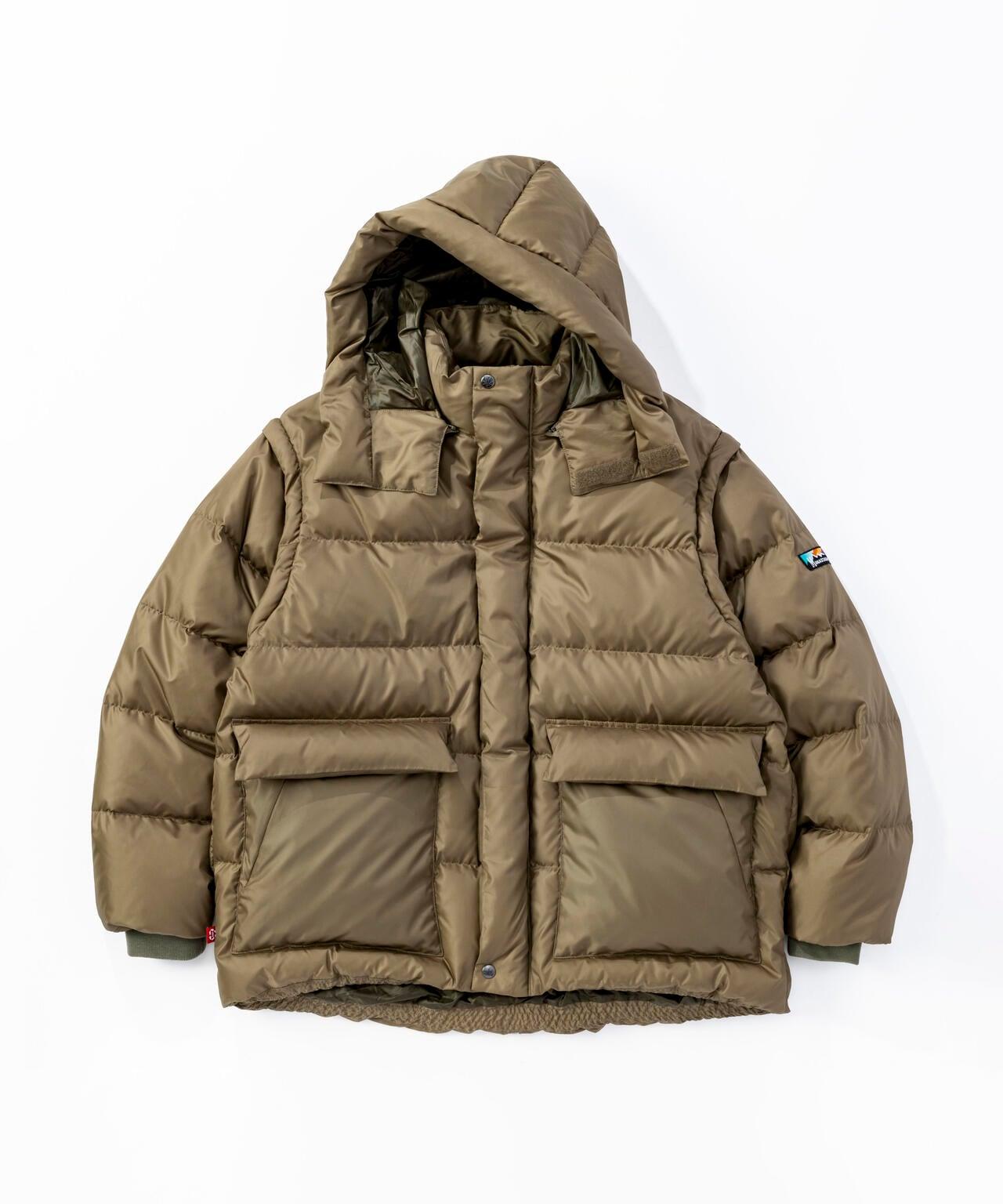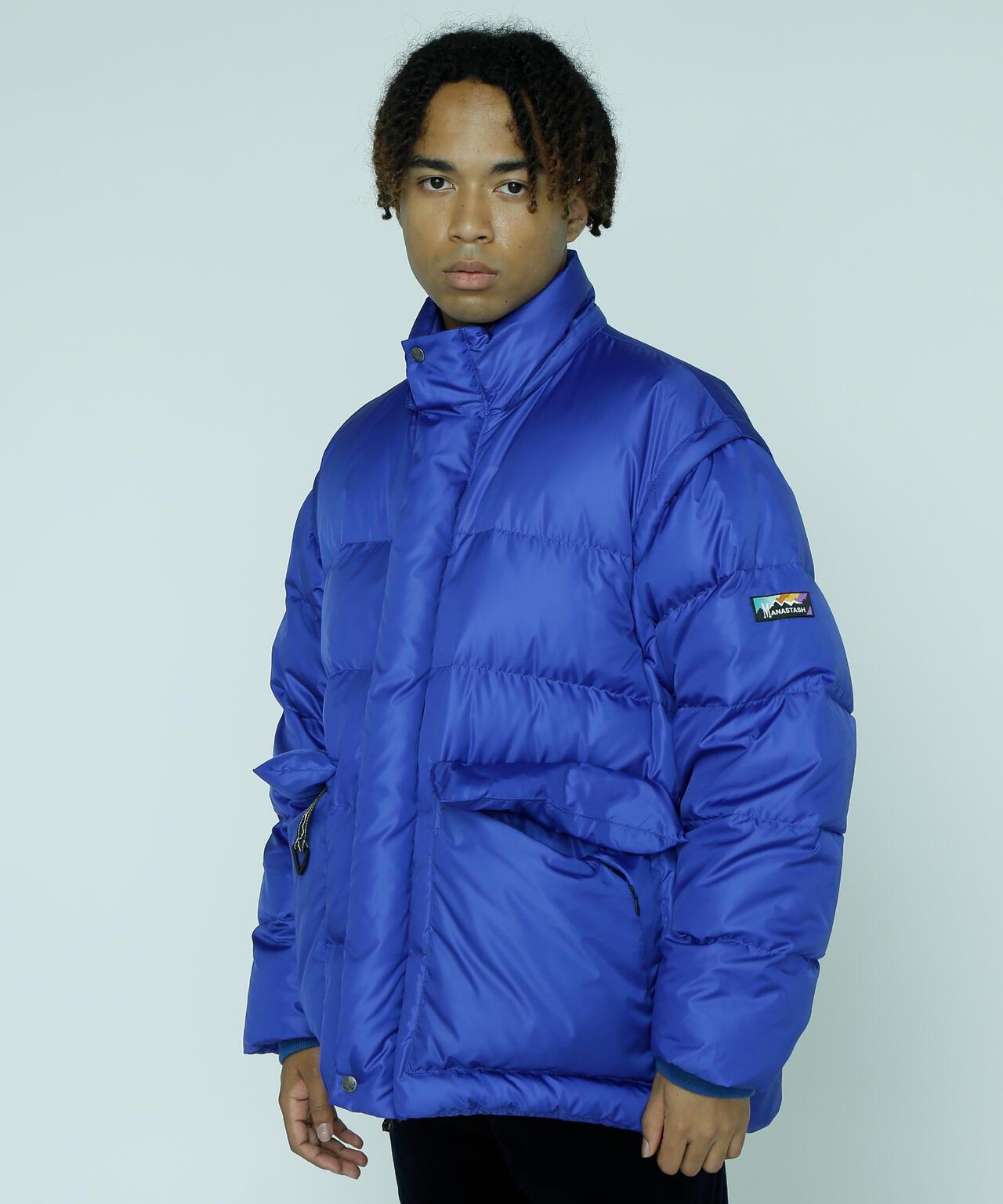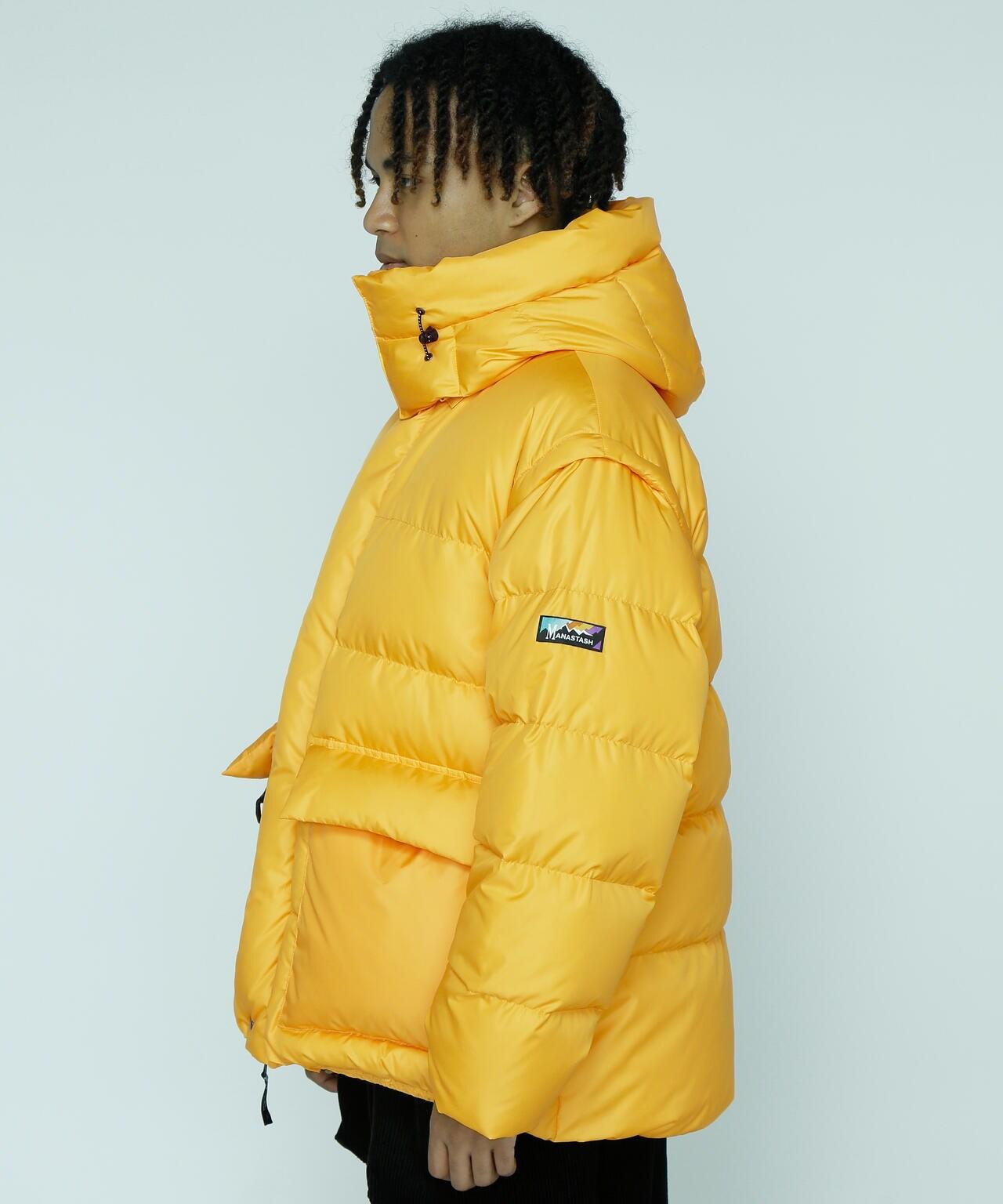 MANASTASH / MANASTASH / 4WAY DOWN JACKET / 4WAY DOWN JACKET 材質 - 外層面料採用回收滌綸材料。填充物為回收羽絨。內襯由尼龍製成。外層和內襯均由柔軟材料製成,使這款羽絨服不僅環保,而且穿著舒適。特點 - 連帽和袖子可拆卸,因此可以有四種不同的穿法。兜帽採用立體制作,可在前部用尼龍搭扣固定。兜帽採用立體設計,前部可以用尼龍搭扣固定,還可以用抽繩進一步收緊,非常保暖。口袋上有一個可以從上方放入的翻蓋口袋,還有一個帶對角拉鍊的暖手口袋,因此它在防寒和儲物能力方面都有很好的表現。右側口袋有鑰匙扣。