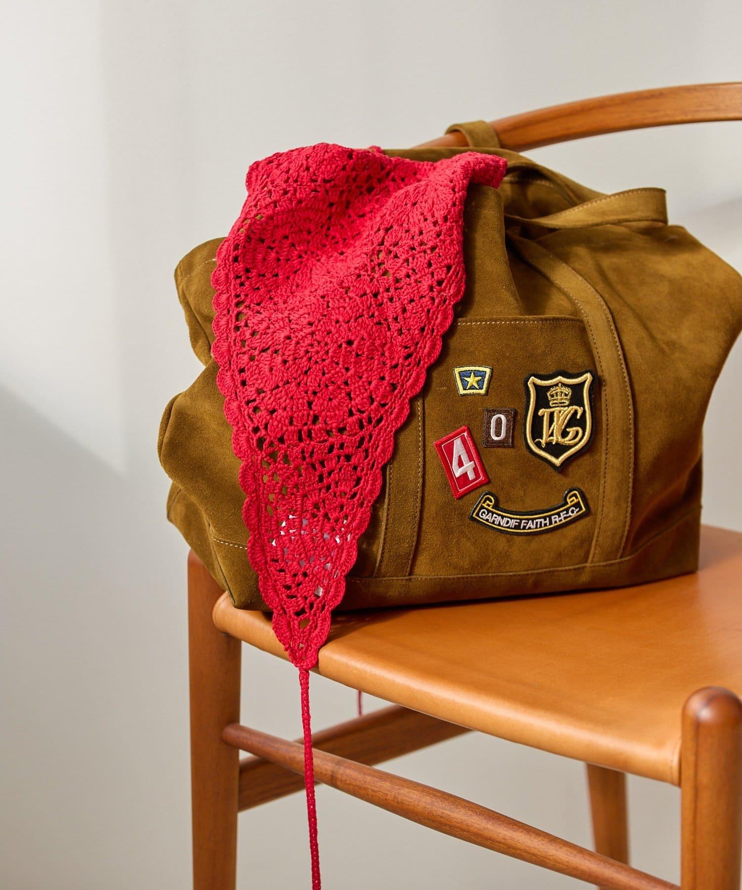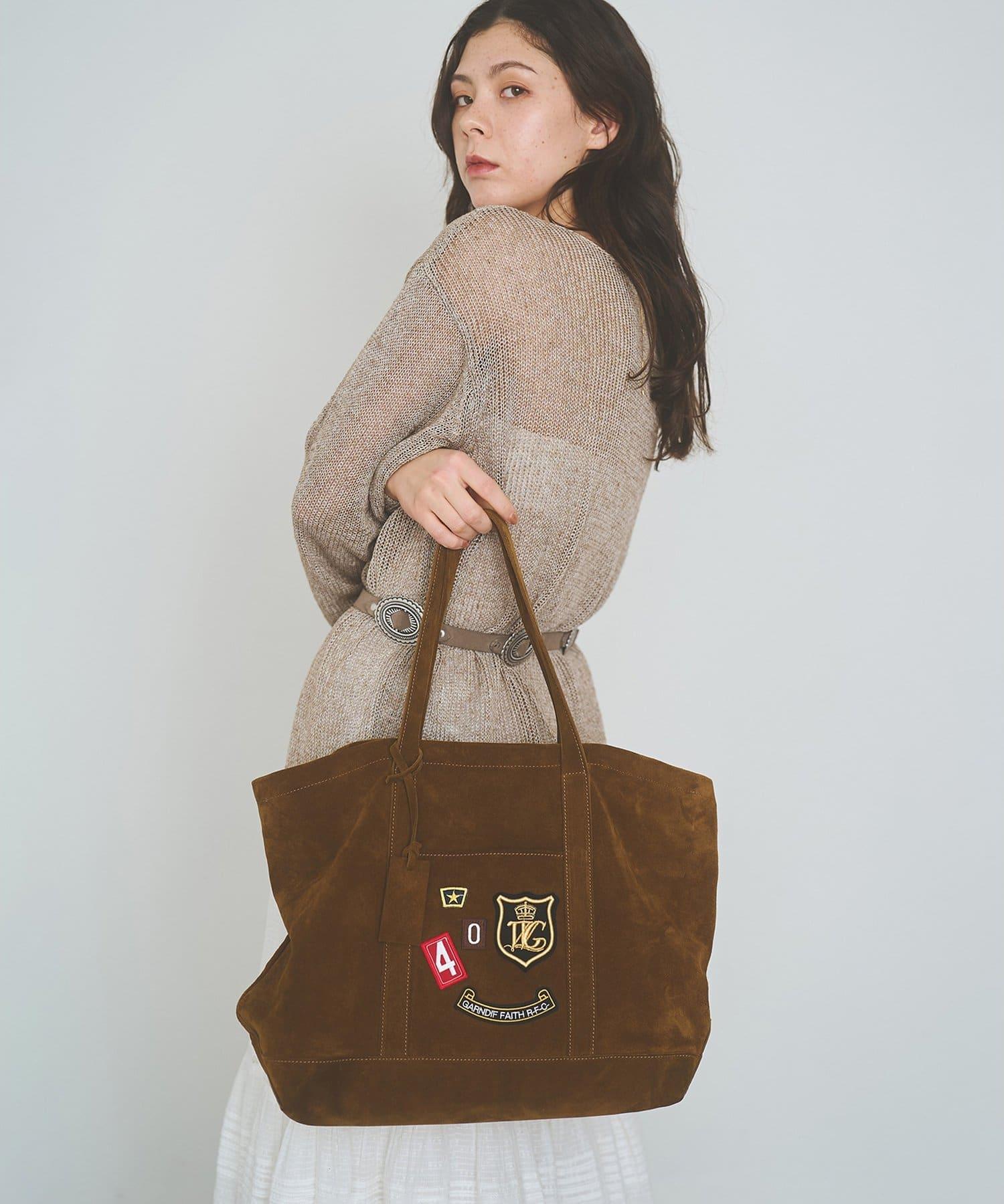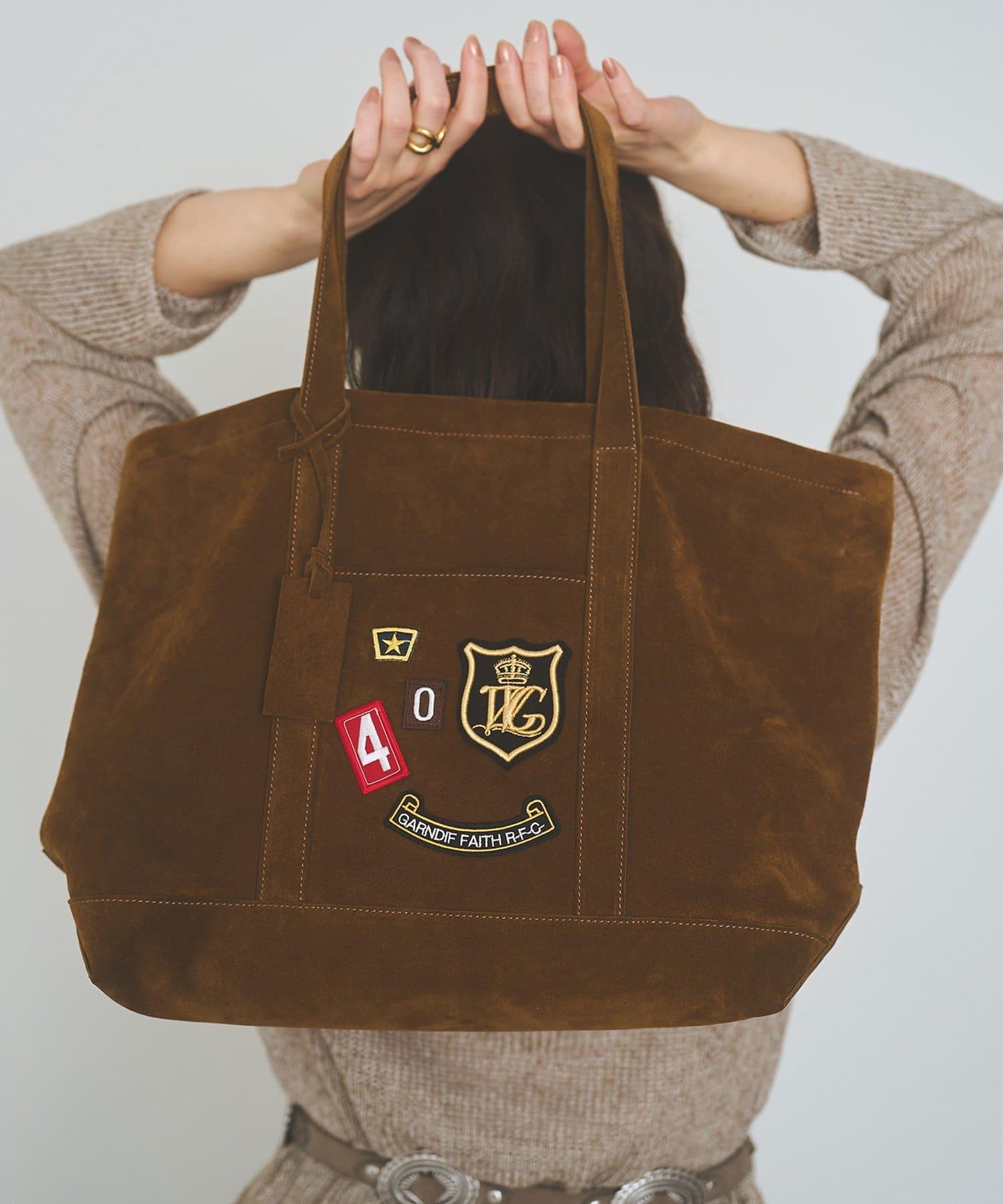 麂皮手提包上繡有徽章,俏皮可愛。