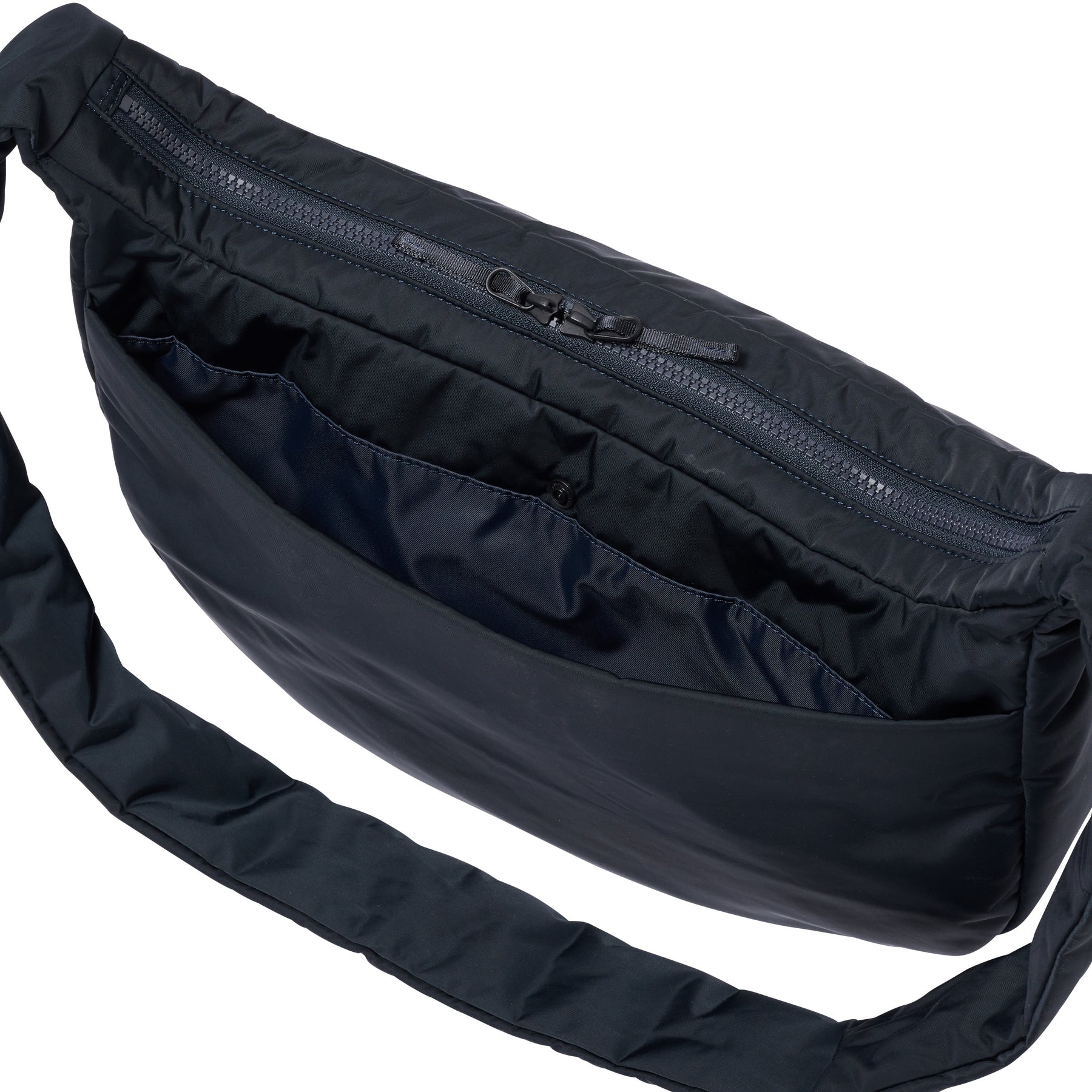 這款單肩包採用柔和的弧形輪廓,包身與肩帶一體化設計。包身形狀與身體舒適貼合,肩帶可通過繫帶調節長度,從肩背到斜挎均可。這款包的尺寸比單肩包略大,可用於從日常使用到旅行的各種場合。
