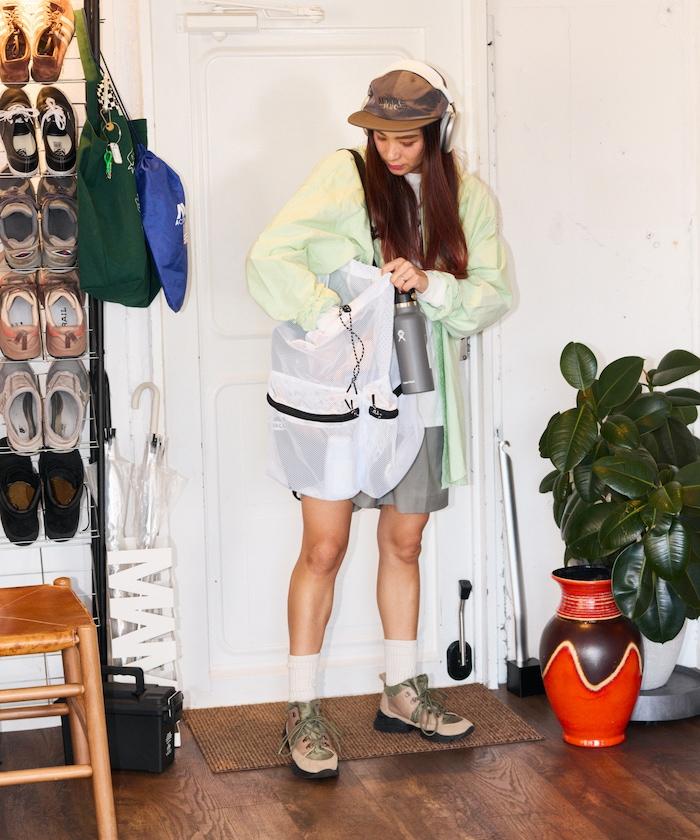 採用 FREAK'S STORE 特殊設計的網眼揹包,在戶外場景中非常顯眼。