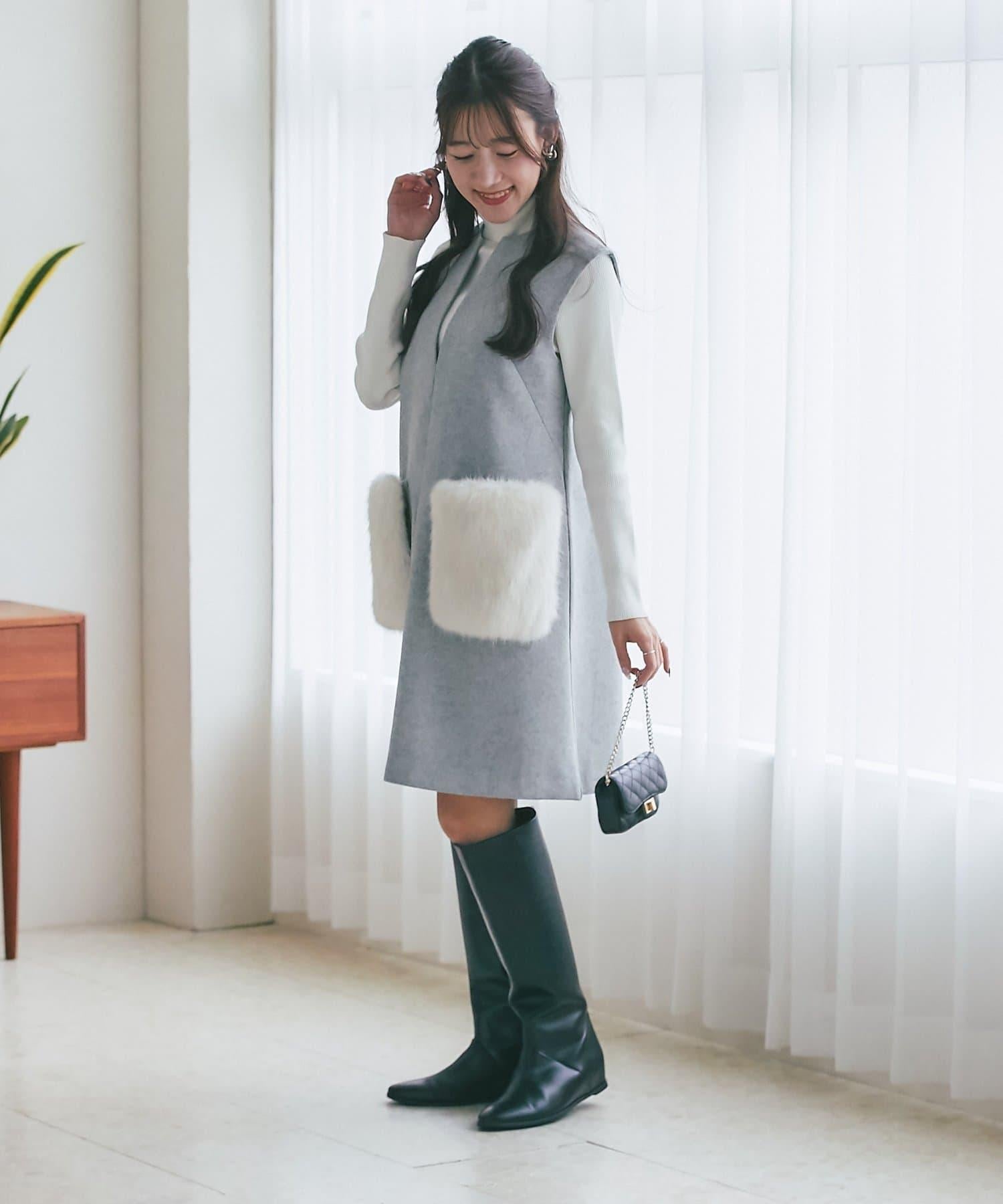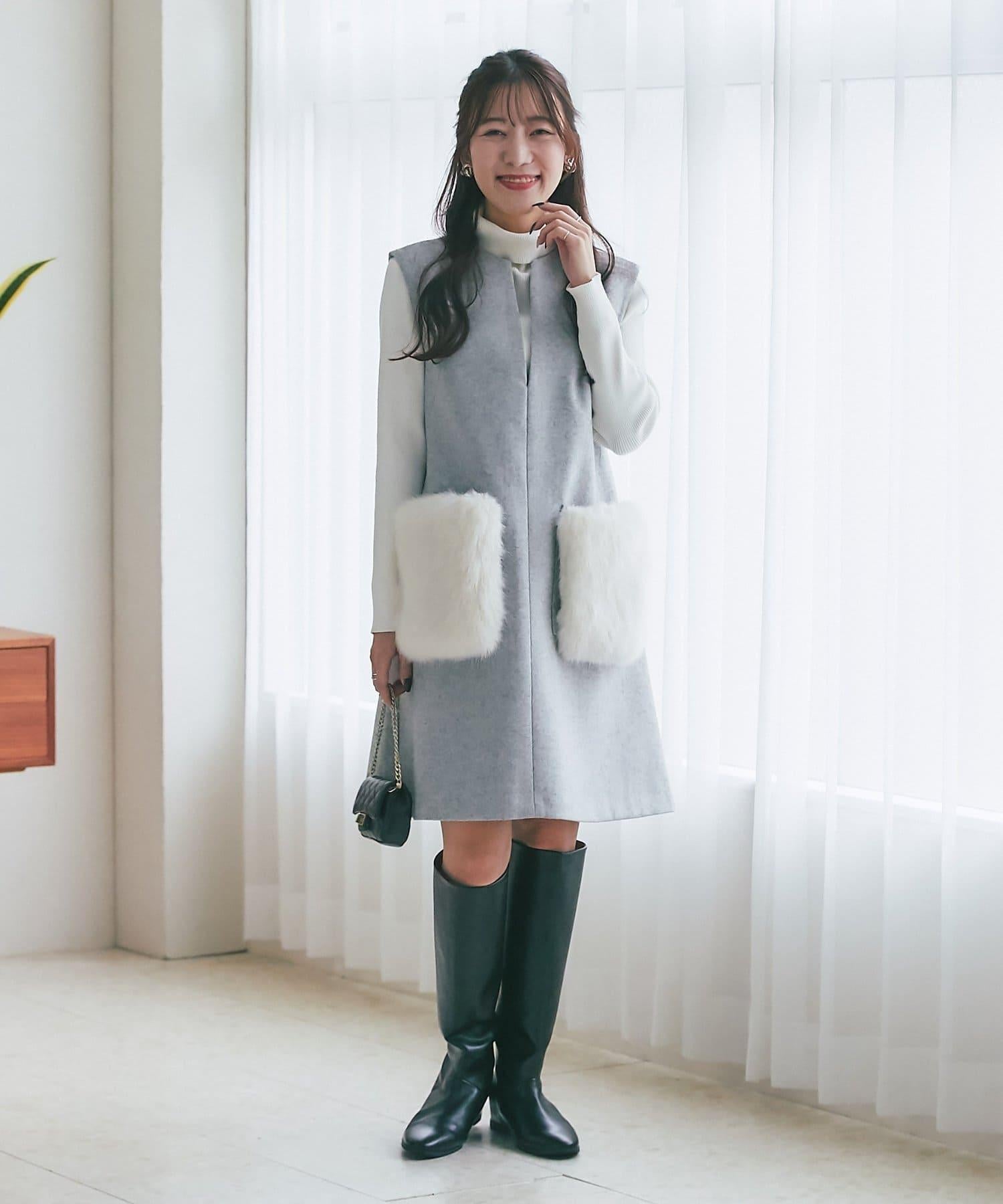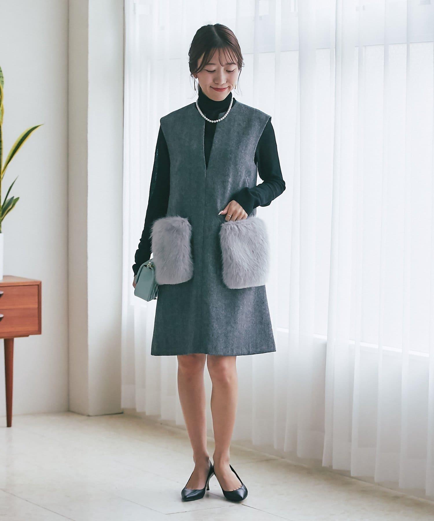 備受喜愛的冬季牛仔連衣裙,配有華麗的人造皮草口袋。