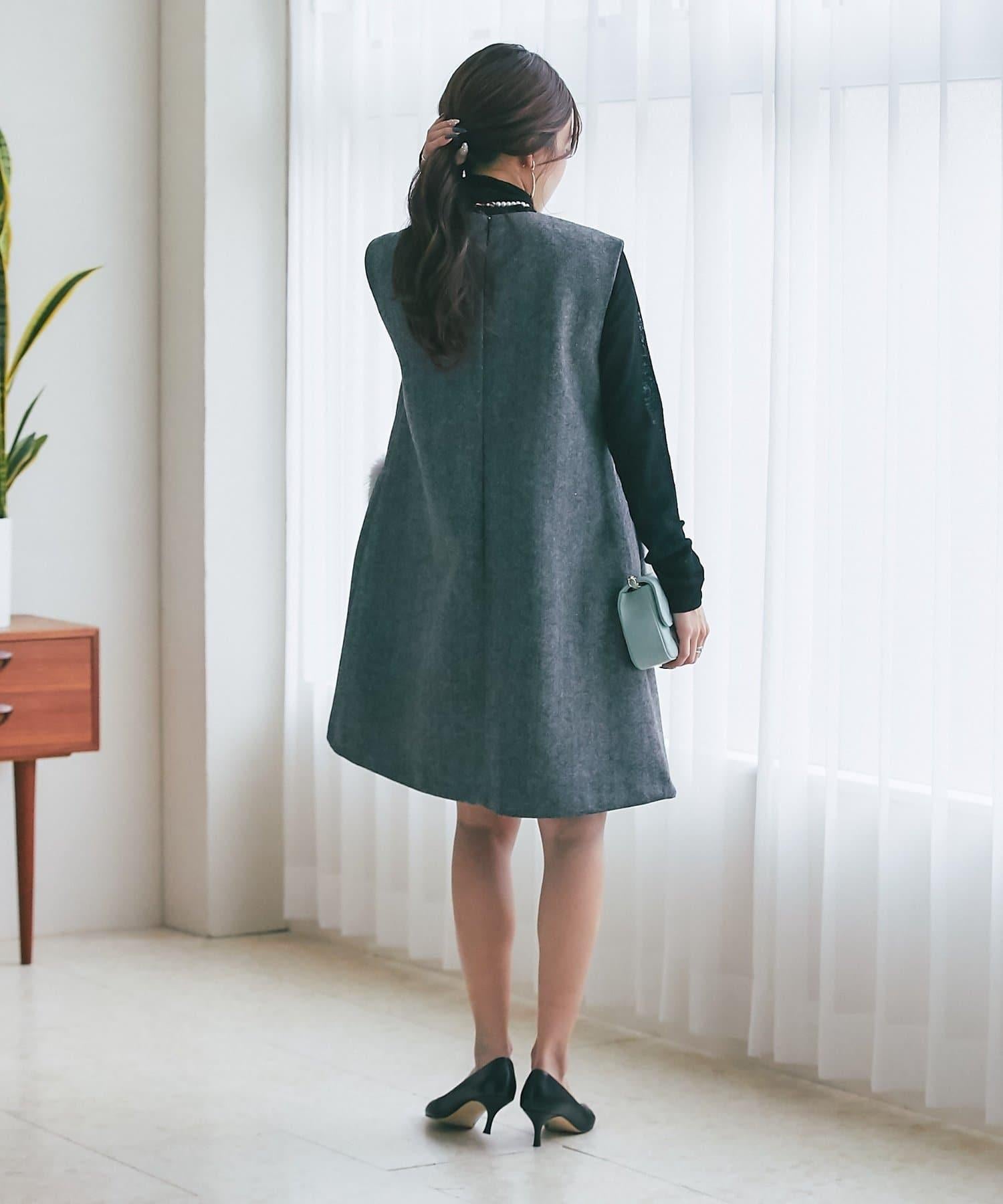 長毛皮口袋是這款牛仔連衣裙的設計亮點。