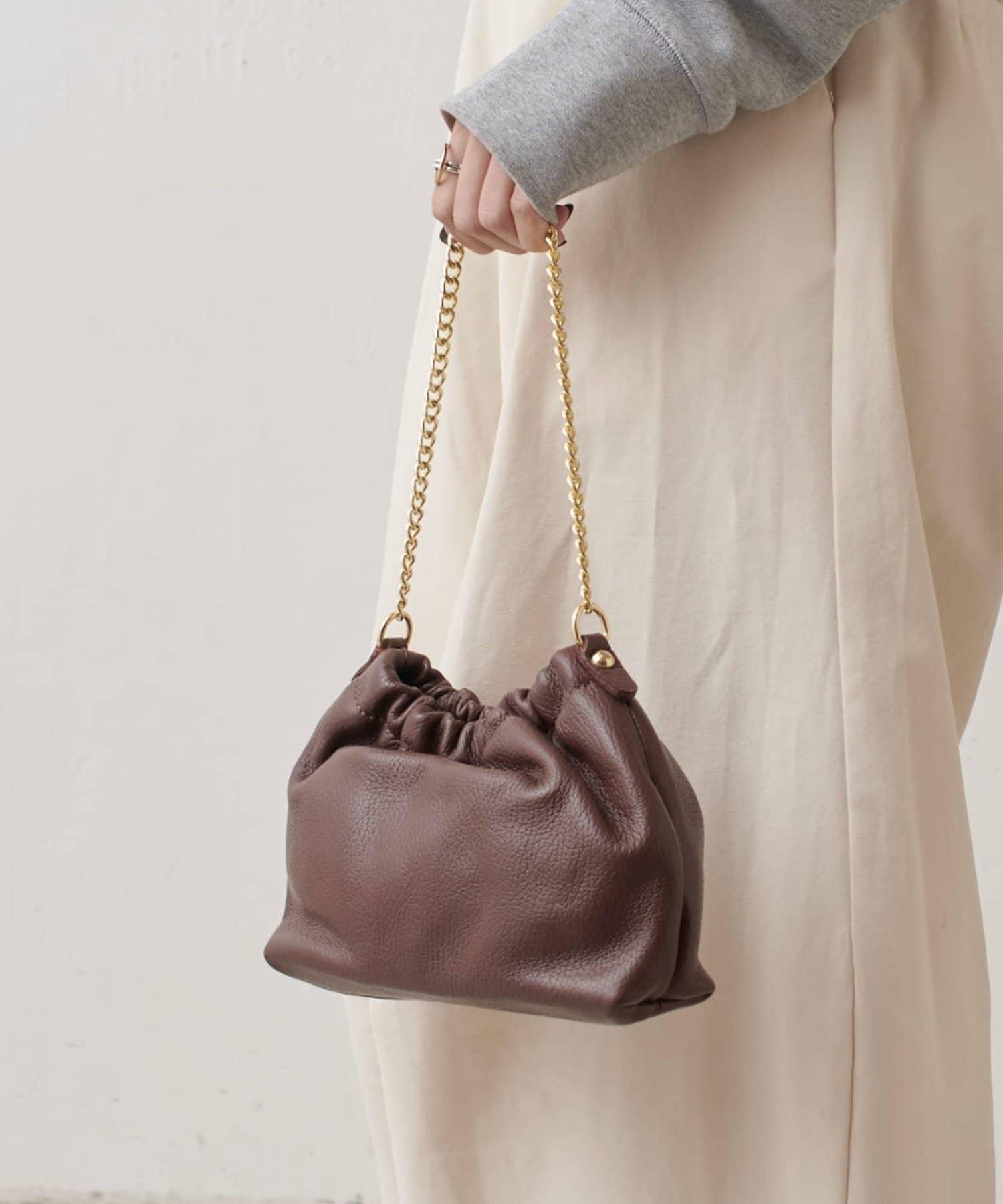 這款皮質手袋採用可愛的圓形輪廓設計,帶有類似抽繩的褶皺。