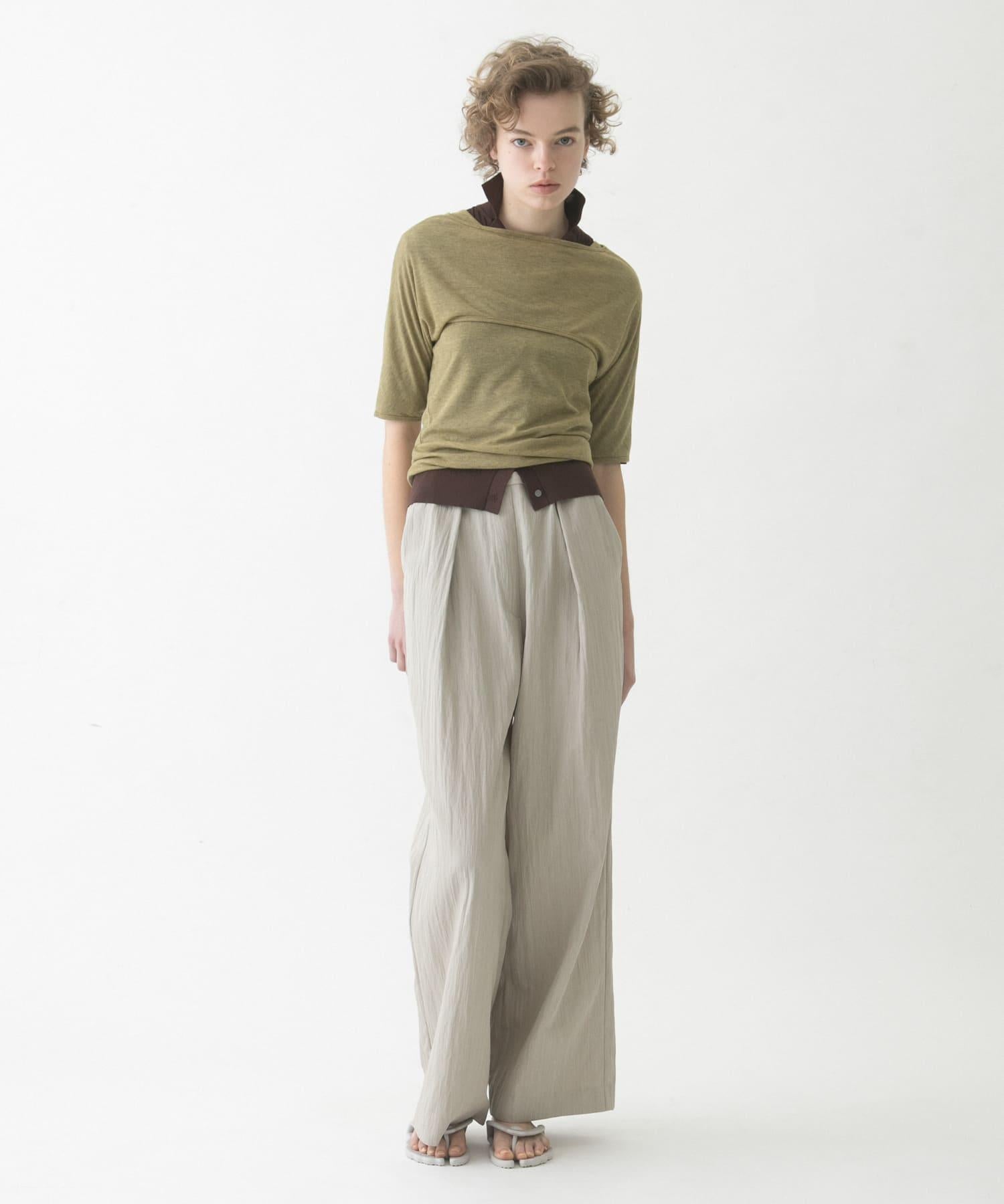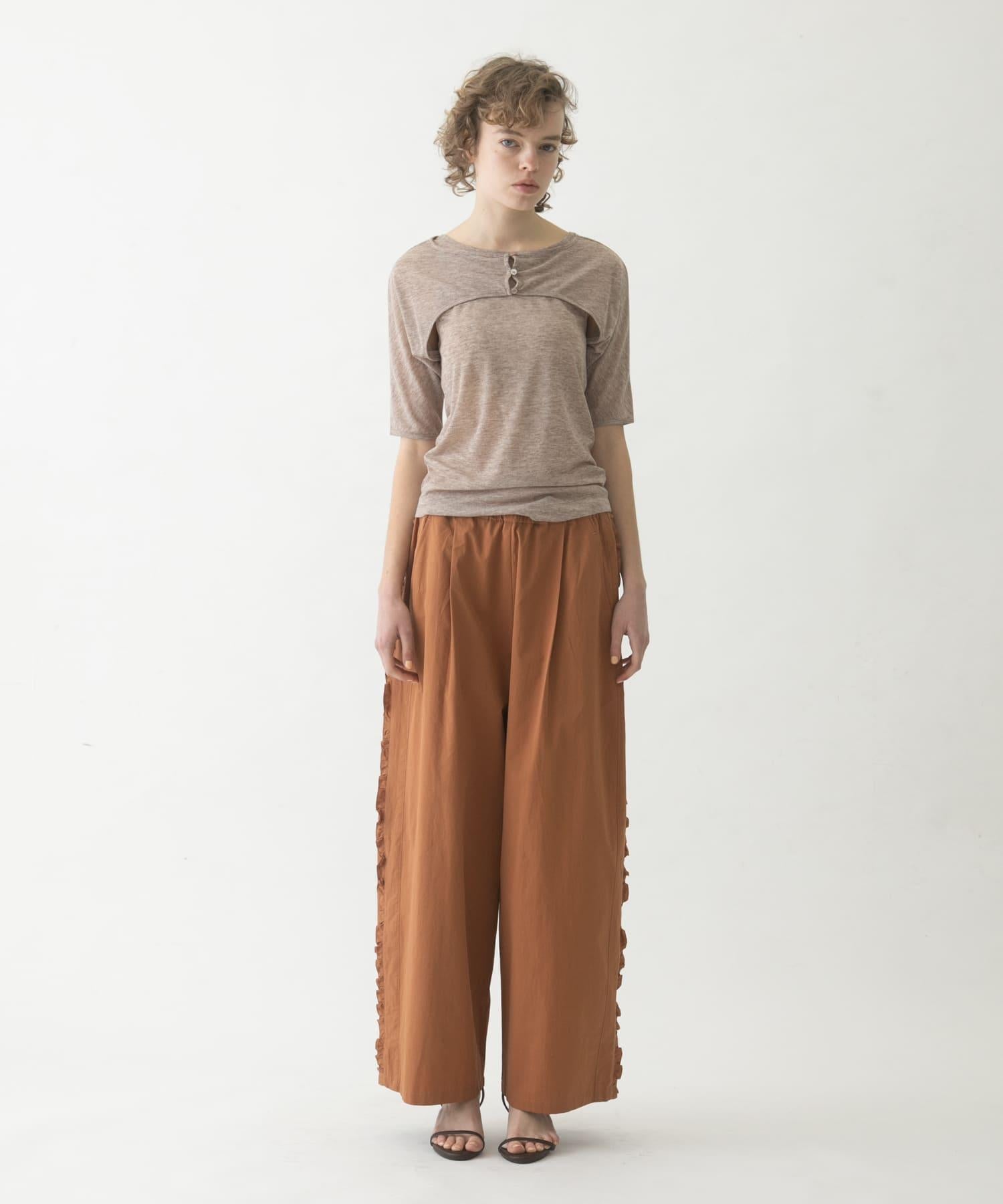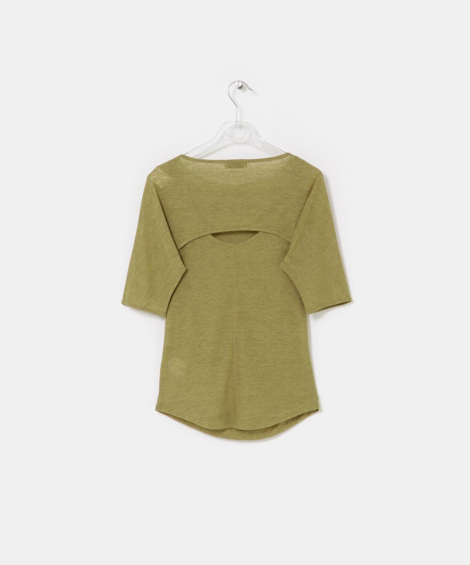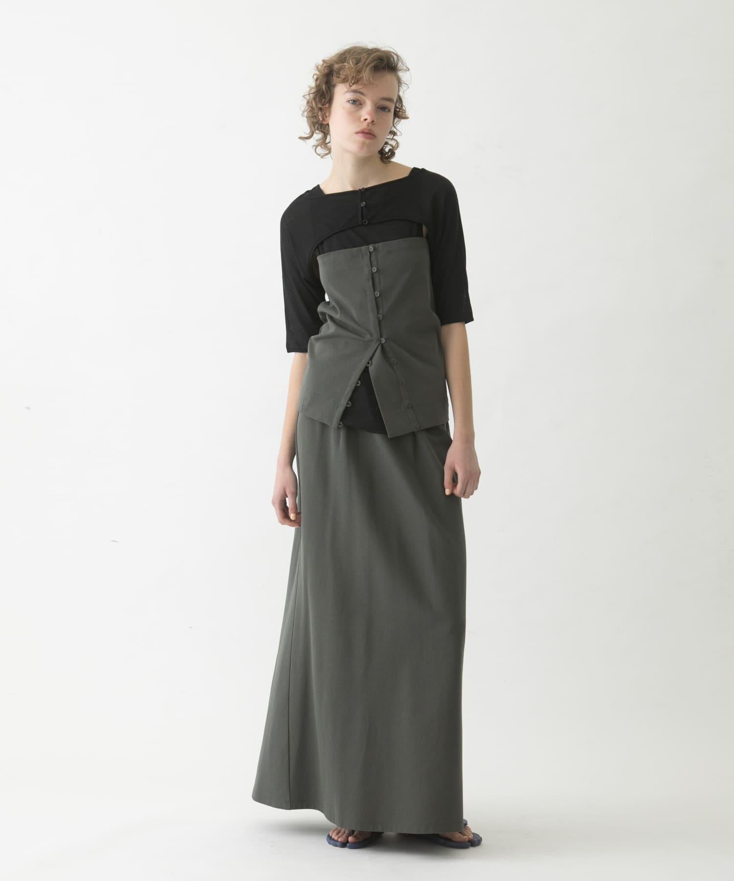 一套背心和一件半袖開衫。層疊時產生的拱形過渡設計,創造出一種讓內層透出的新款式。面料是一種輕薄透明的透視面料,皮膚感覺輕盈,即使在多汗的季節也能保持涼爽。它的彈性恰到好處,穿著舒適,動靜皆宜。防皺和易打理也是日常使用的一大優點。由於是可正反穿的雙向規格,我們還建議您反穿時將紐扣系在背後,享受揹帶褲的風格。