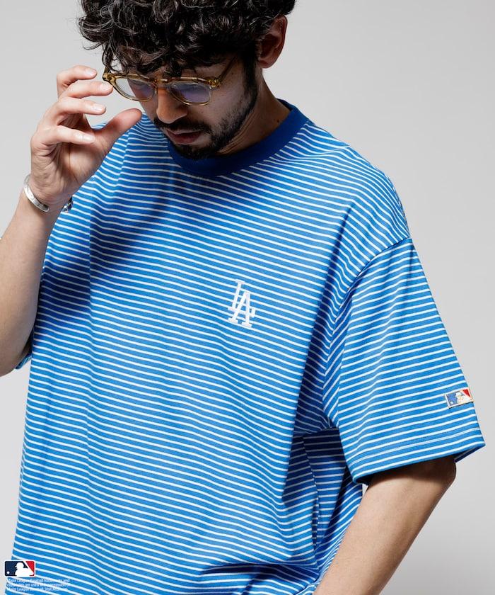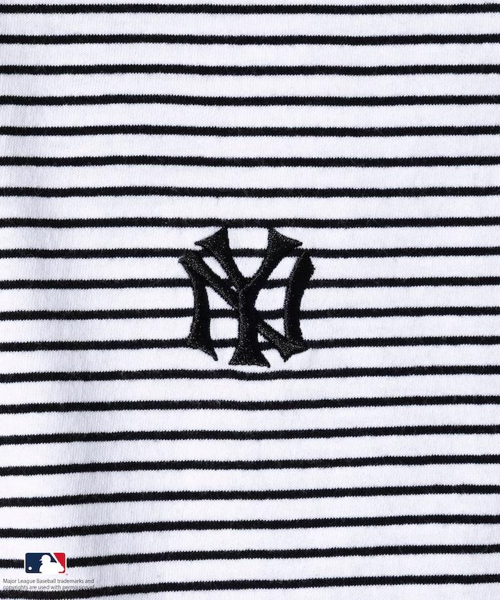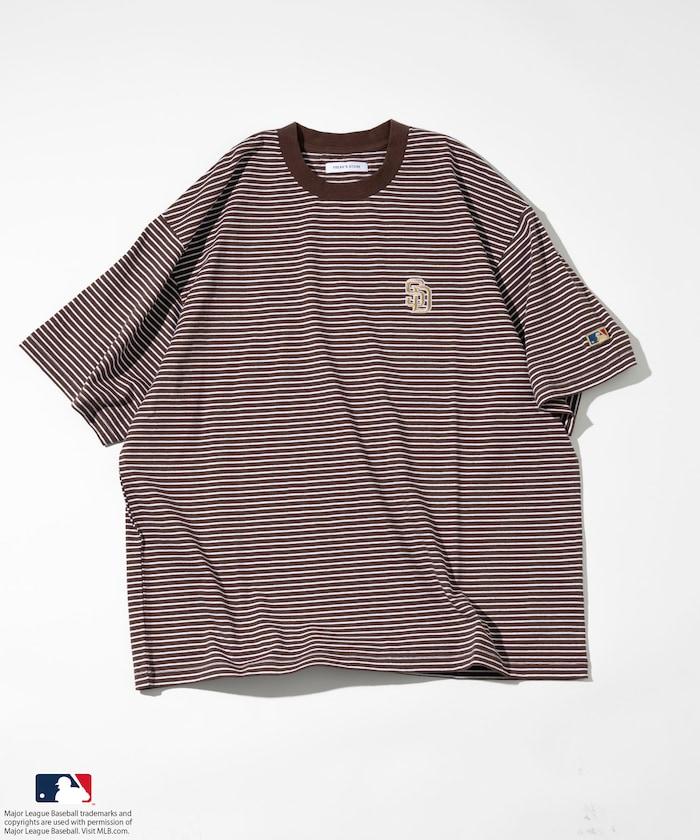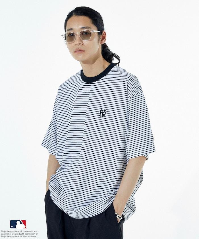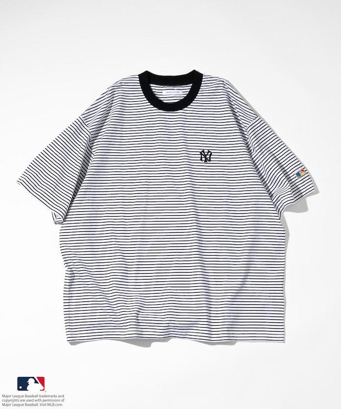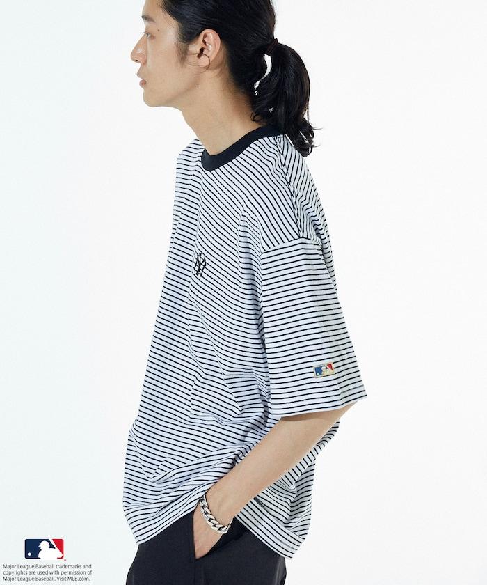 細條紋 T 恤,左胸繡有 MLB 徽標。