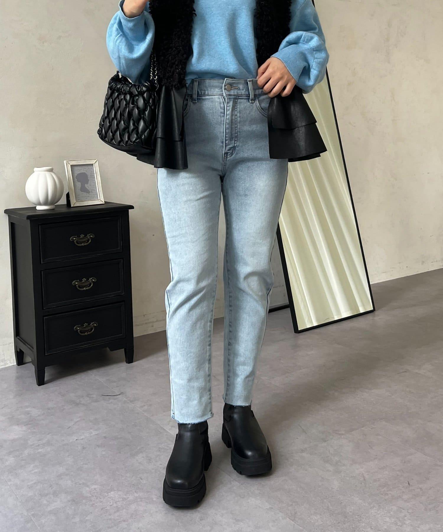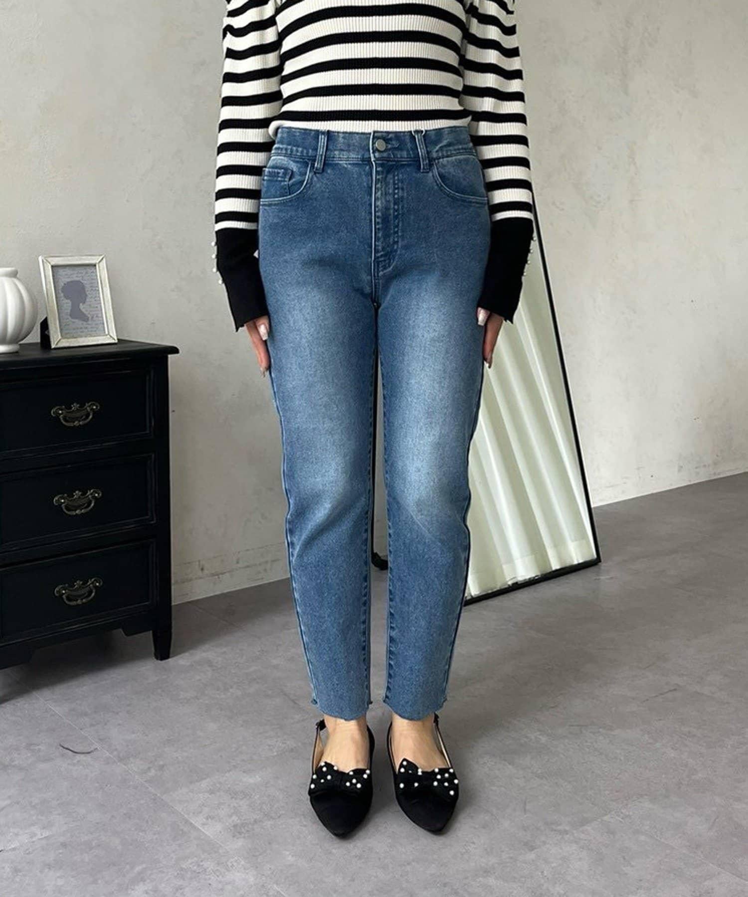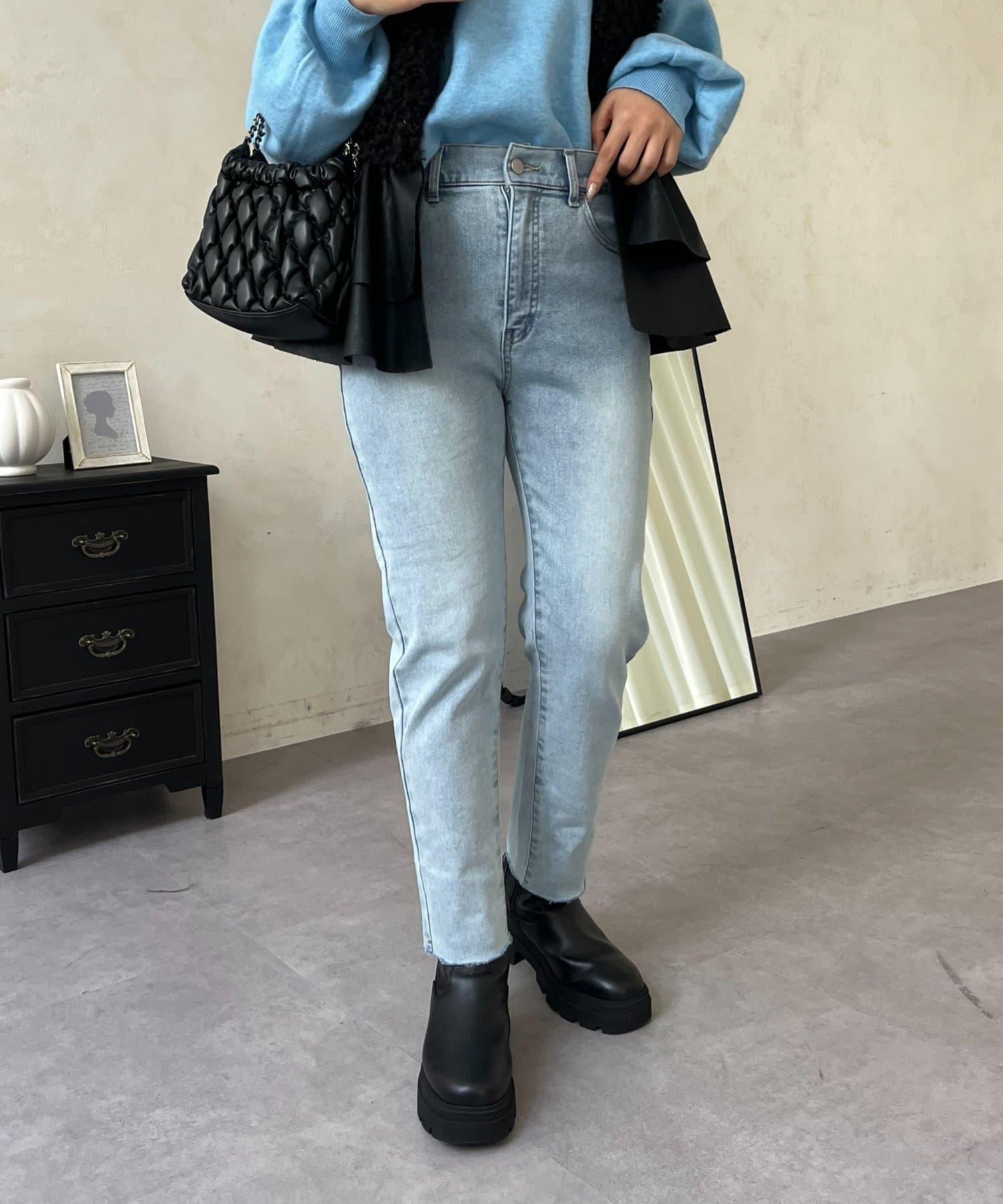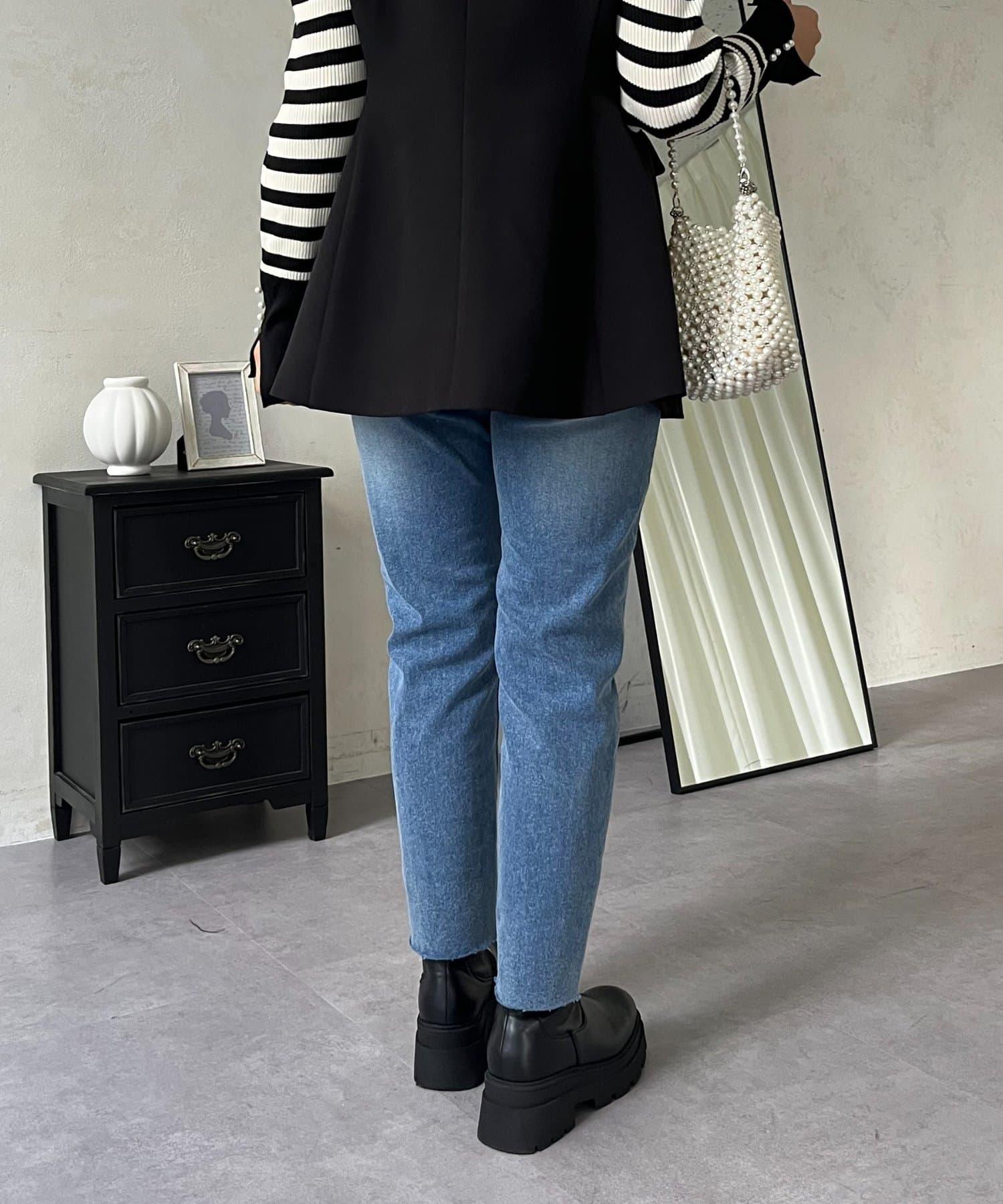 【MOMO】內層微絨彈力錐形牛仔褲