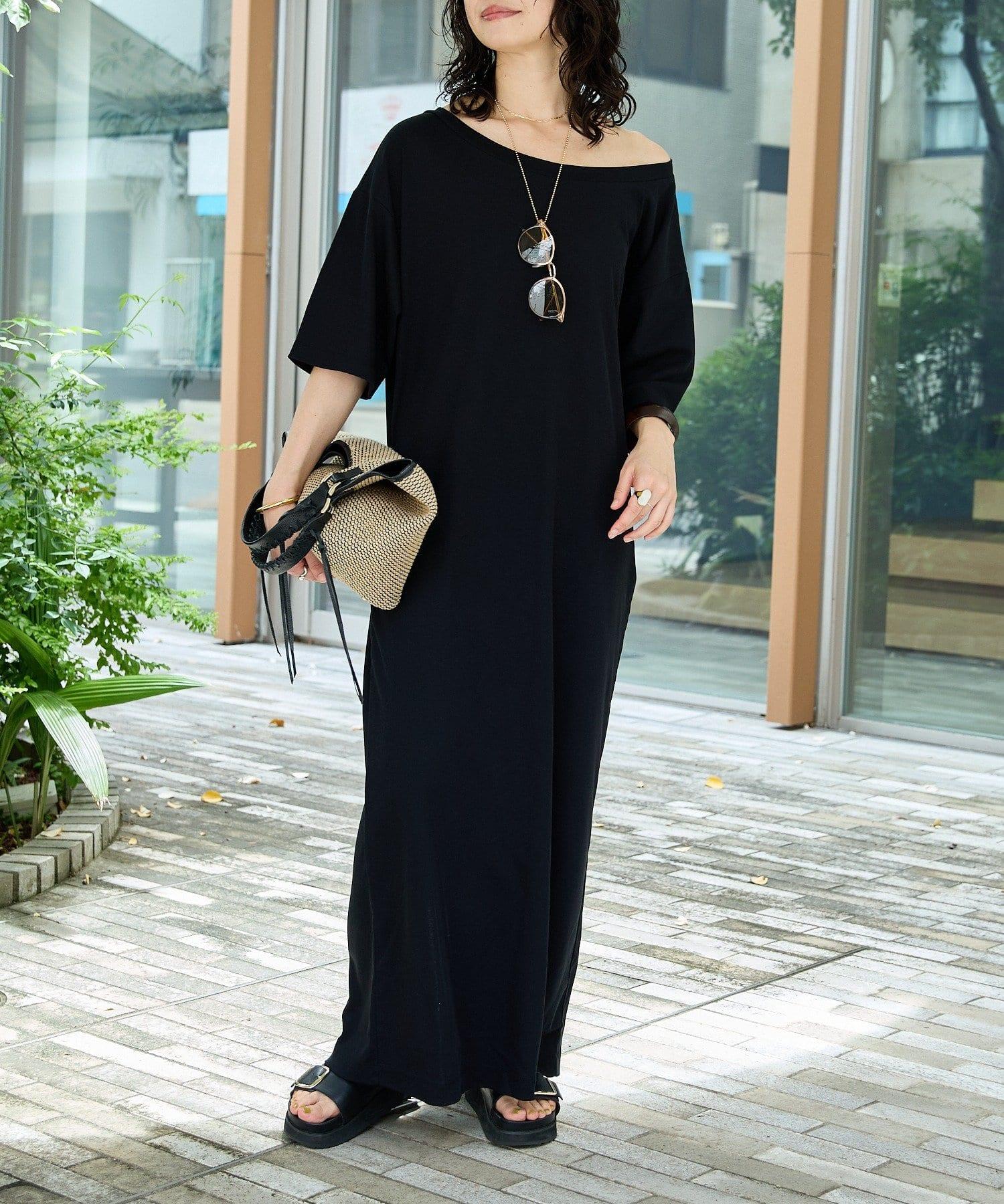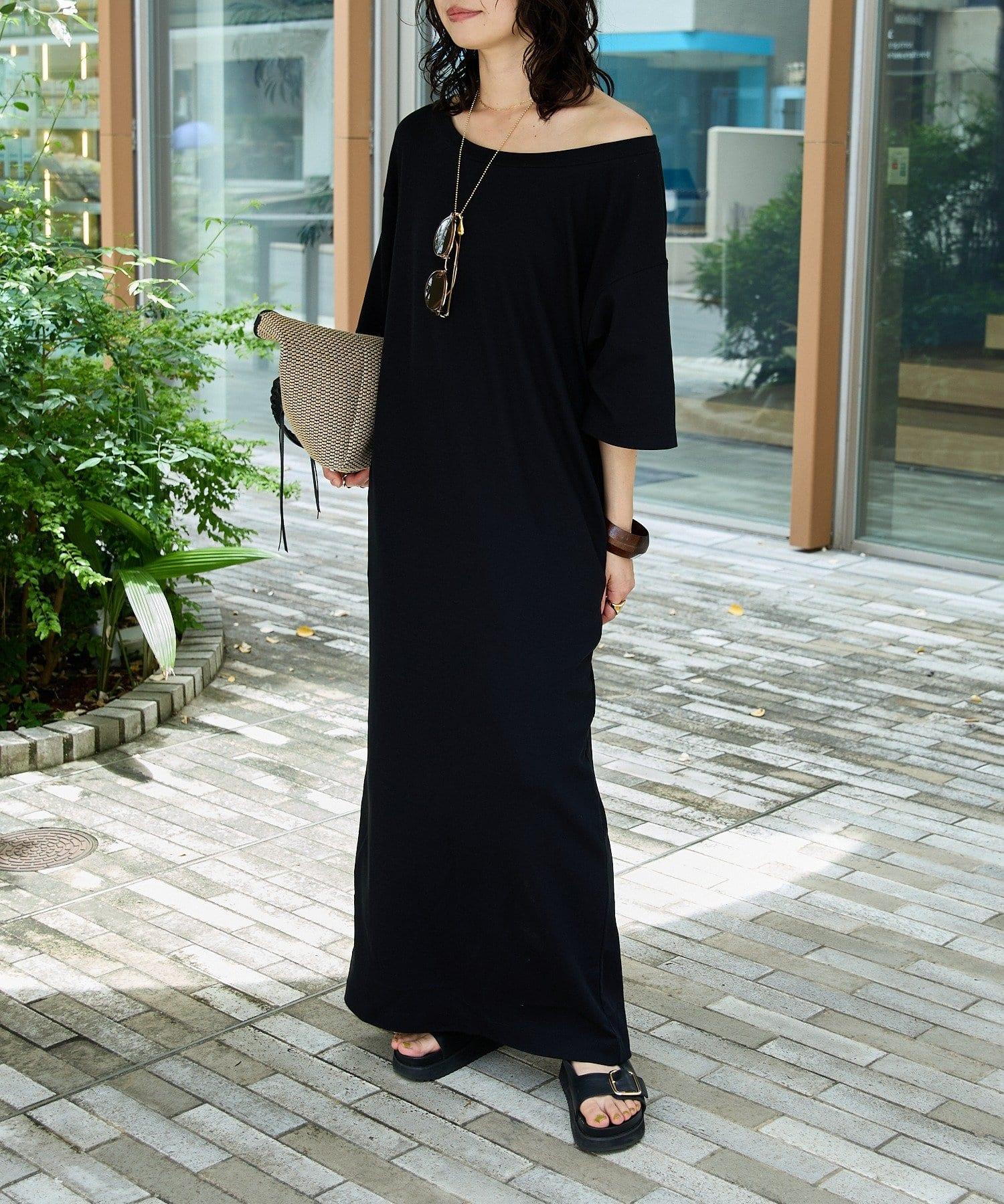 寬鬆的 Maxi 連衣裙,領口開闊。