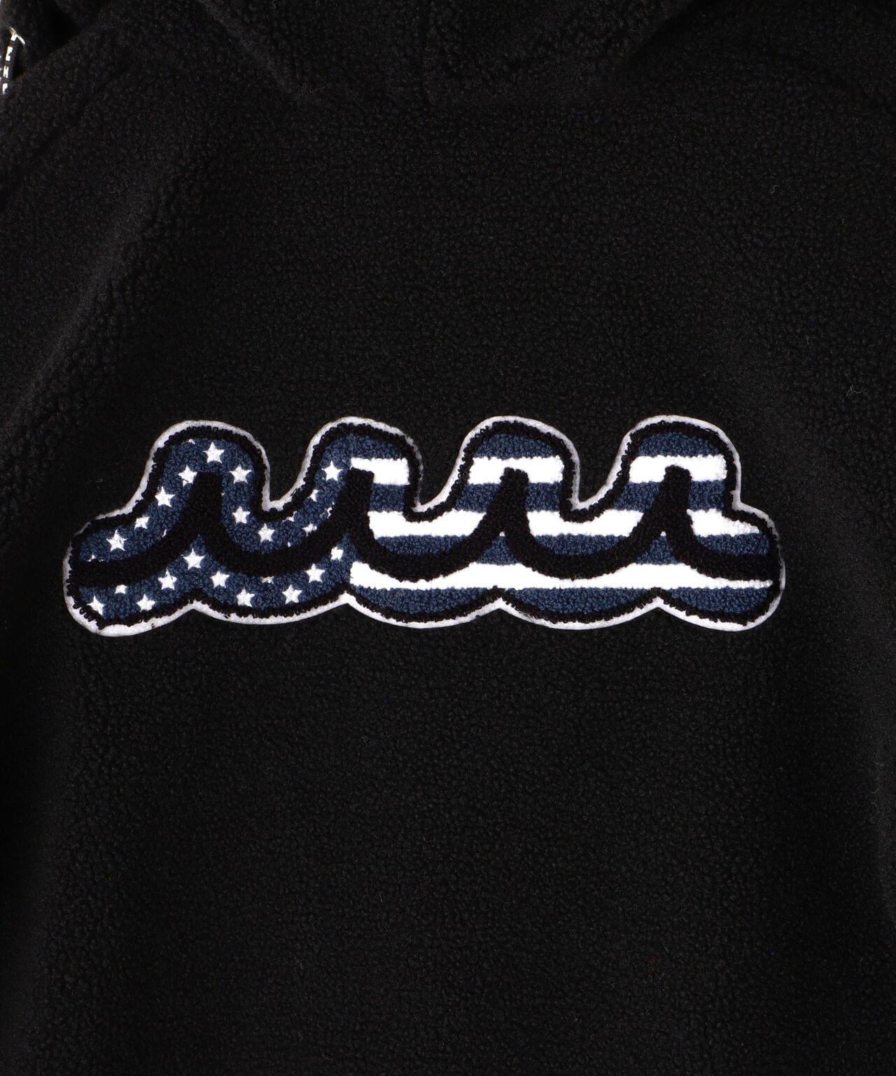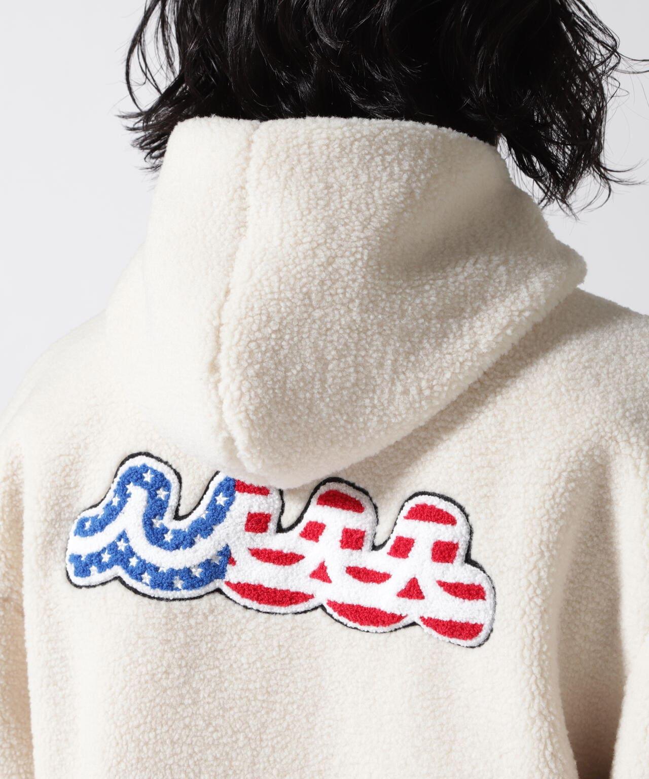 ROYAL FLASH 特別訂製產品可翻轉長圍巾罩衫,採用寬鬆剪裁。下襬附有抽繩,因此也可作為氣球廓形穿著。正反面均採用同色處理,設計成熟、簡潔、易穿。滌綸面的左胸有 3D 繡制的品牌徽標,左袖有兩條橡膠印花線條。蟒蛇絨面的蟒蛇絨手感柔軟,左胸前有心形刺繡,右袖口有一個心形硅膠貼片,上面有星條旗圖案,背面有一個帶有星條旗圖案的瑪塔波形薩瓜阿貼片。風帽上有帶有 muta 徽標的紡錘形繩索。