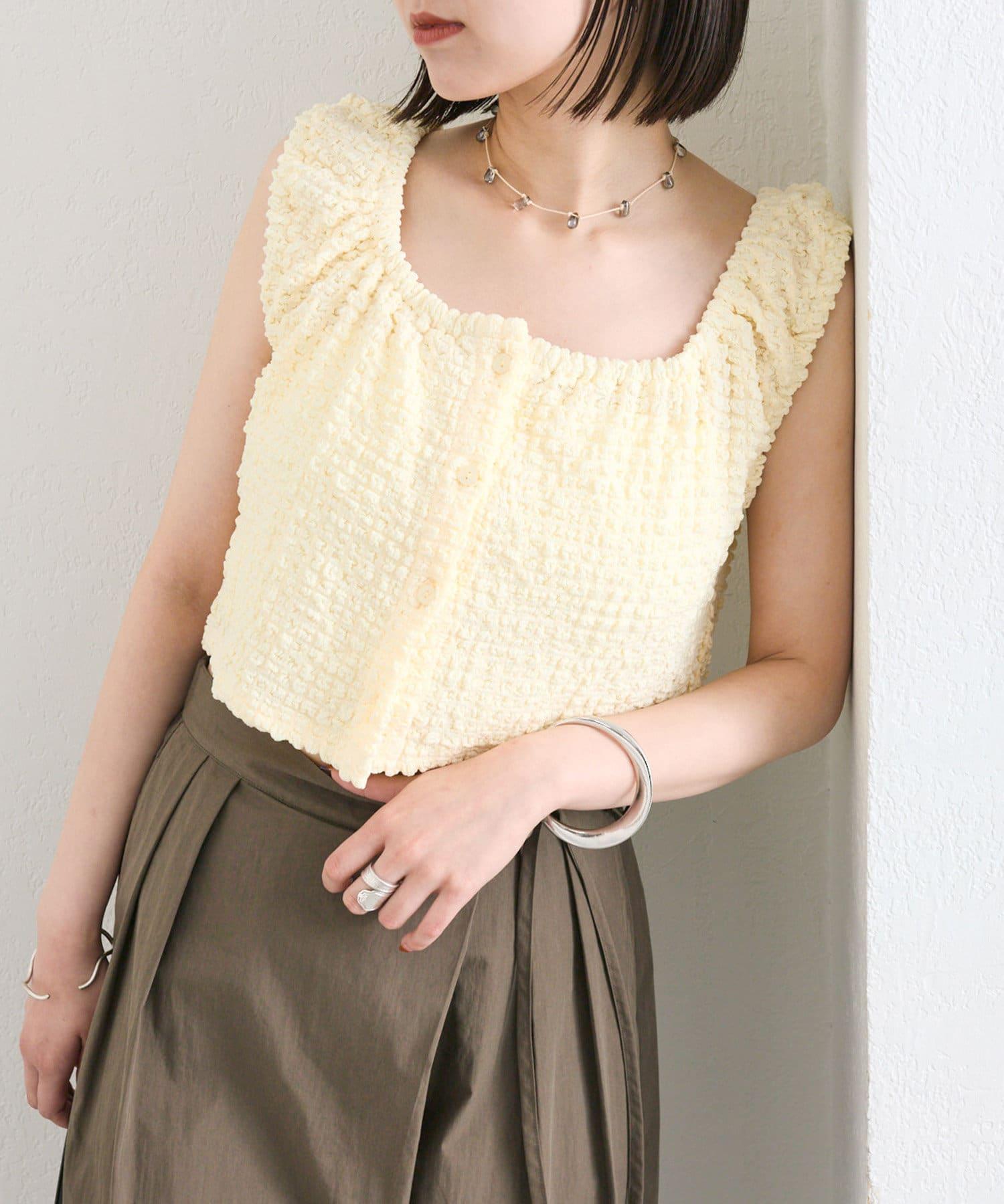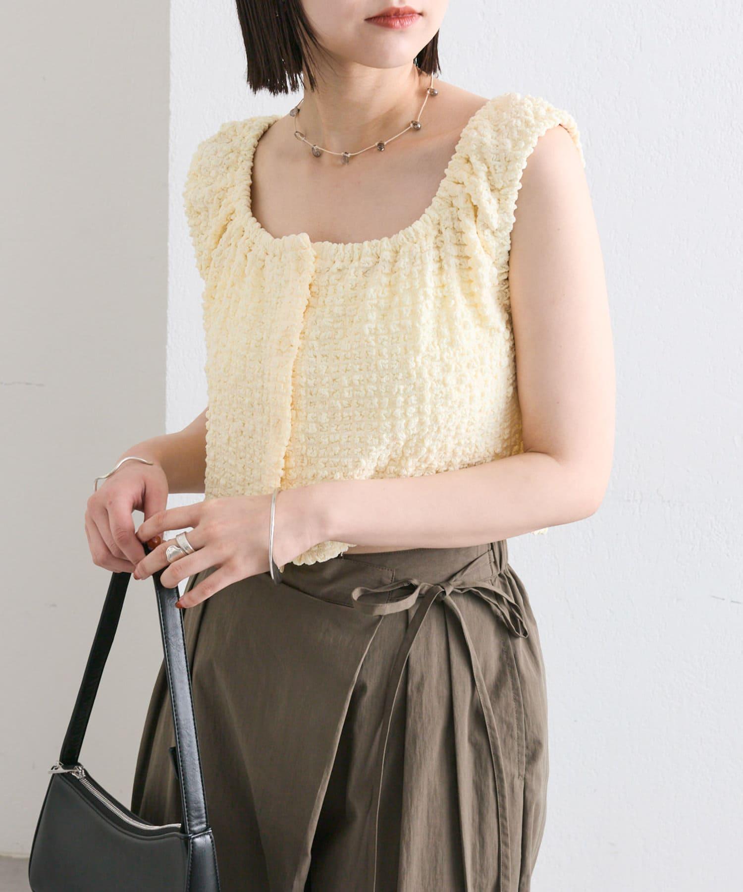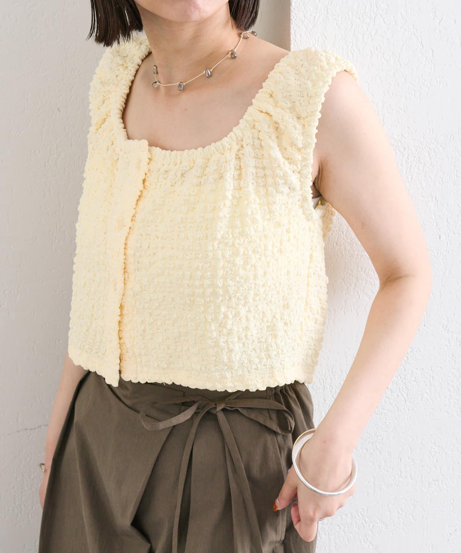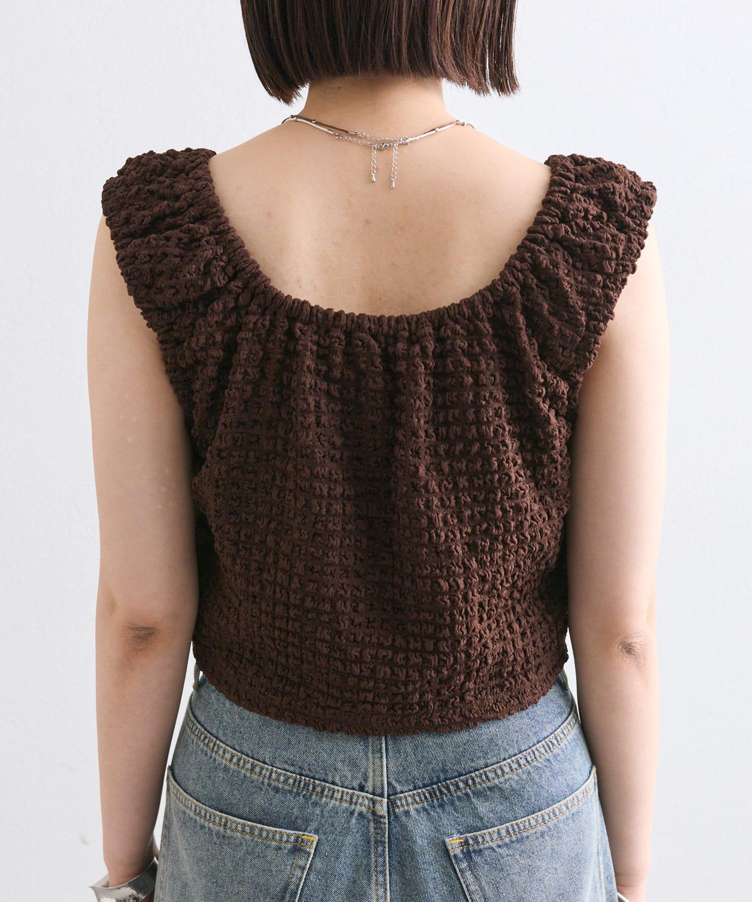 背心式上衣由帶有表面紋理的褶皺面料製成。