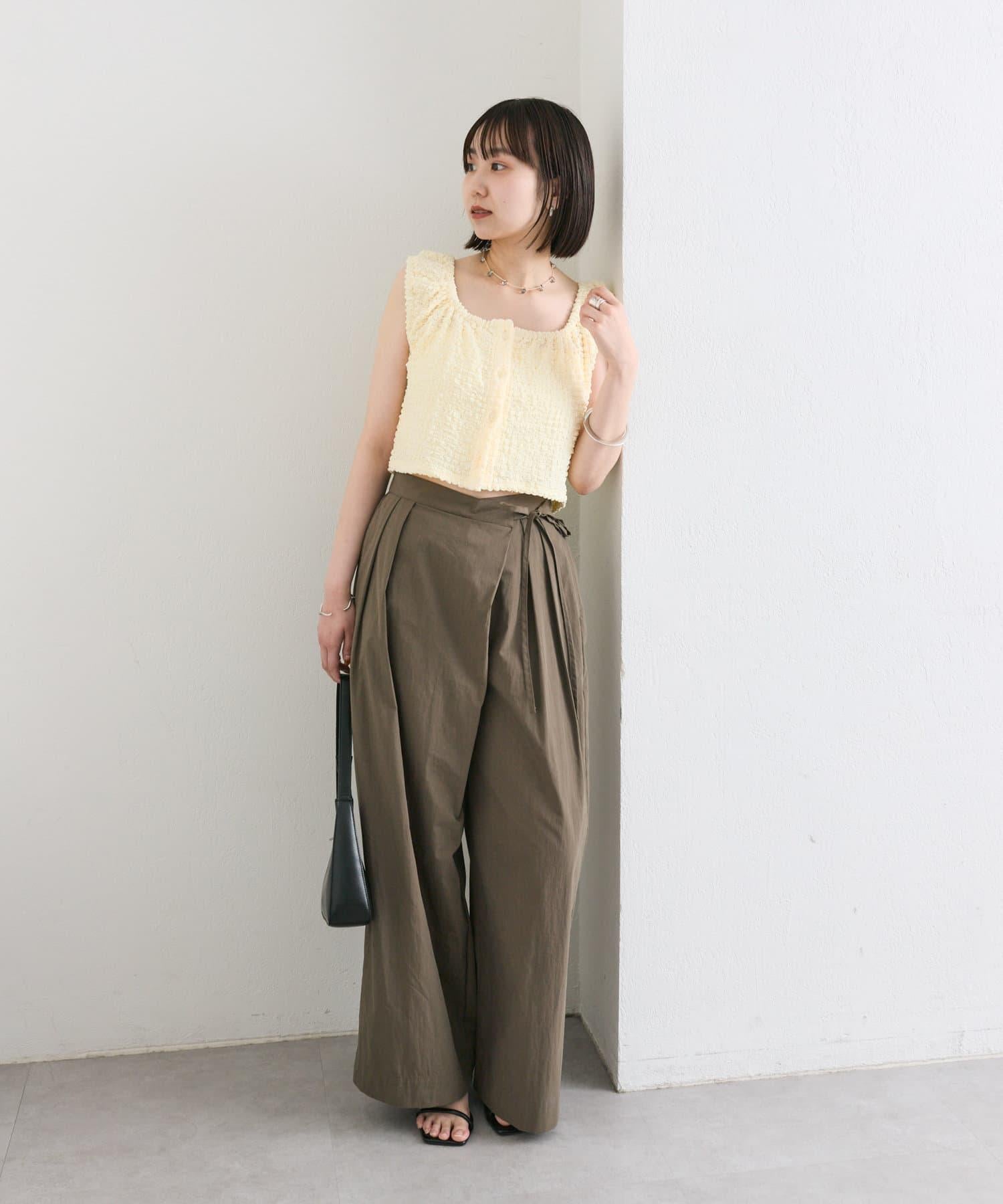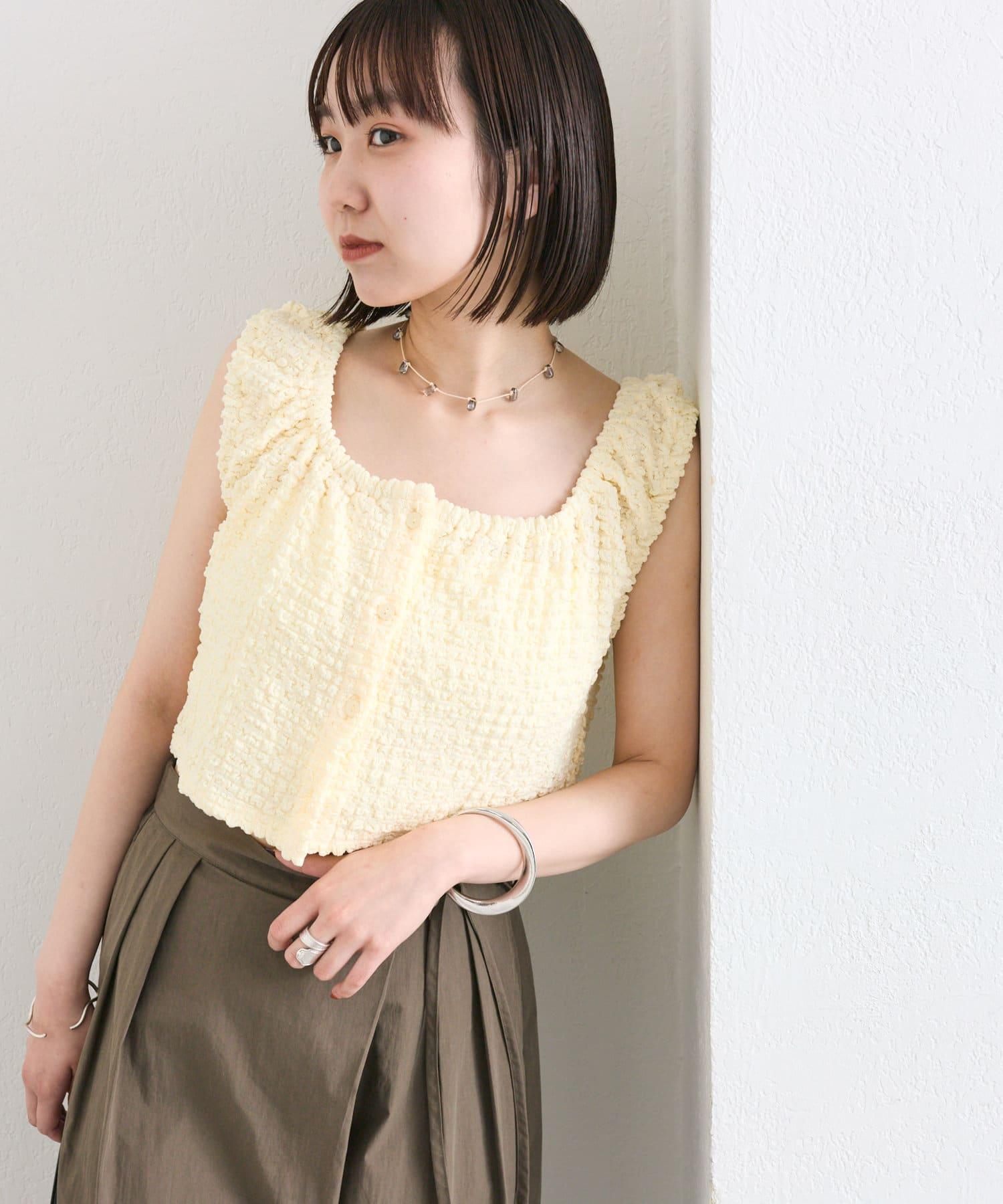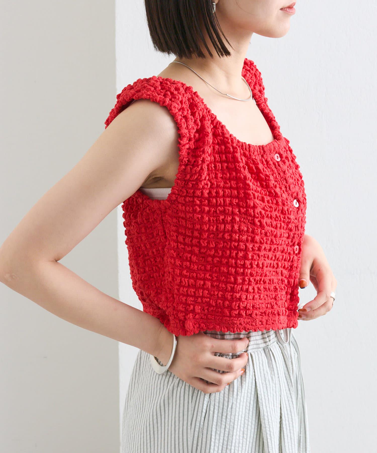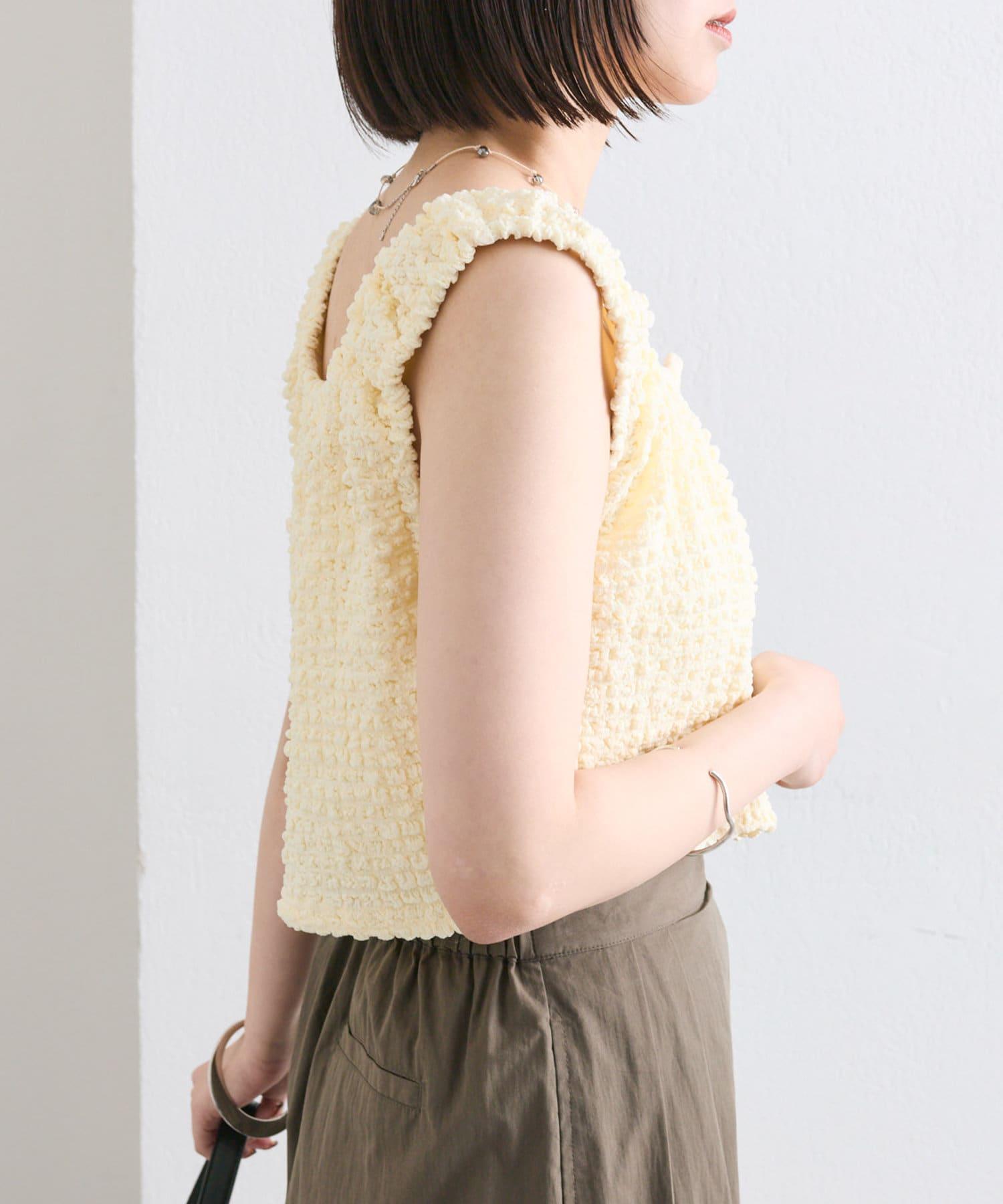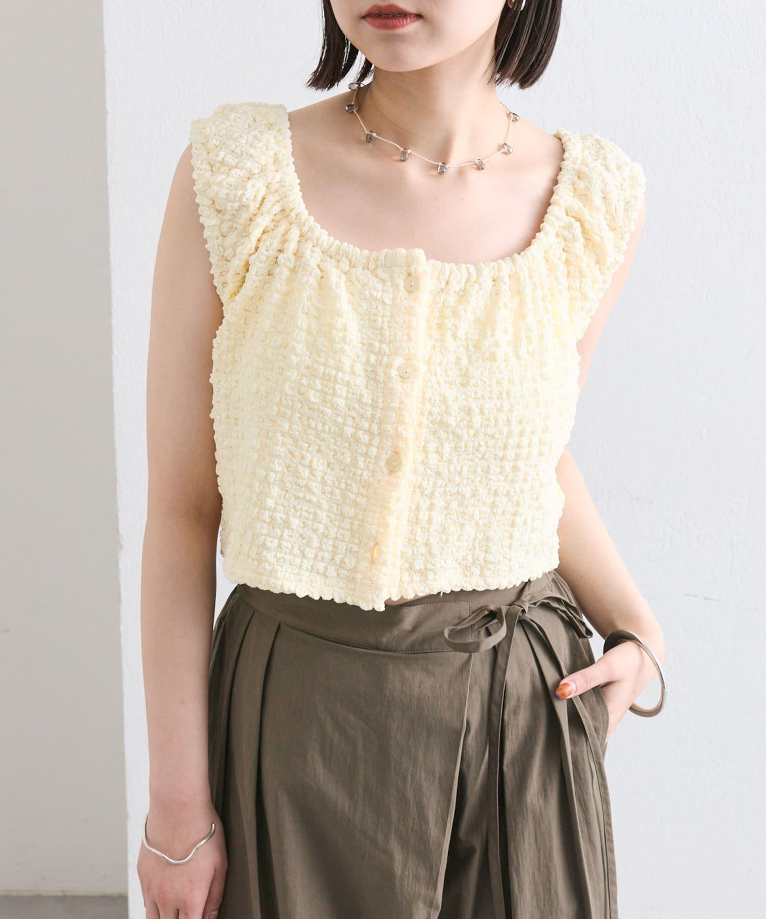 背心式上衣由帶有表面紋理的褶皺面料製成。