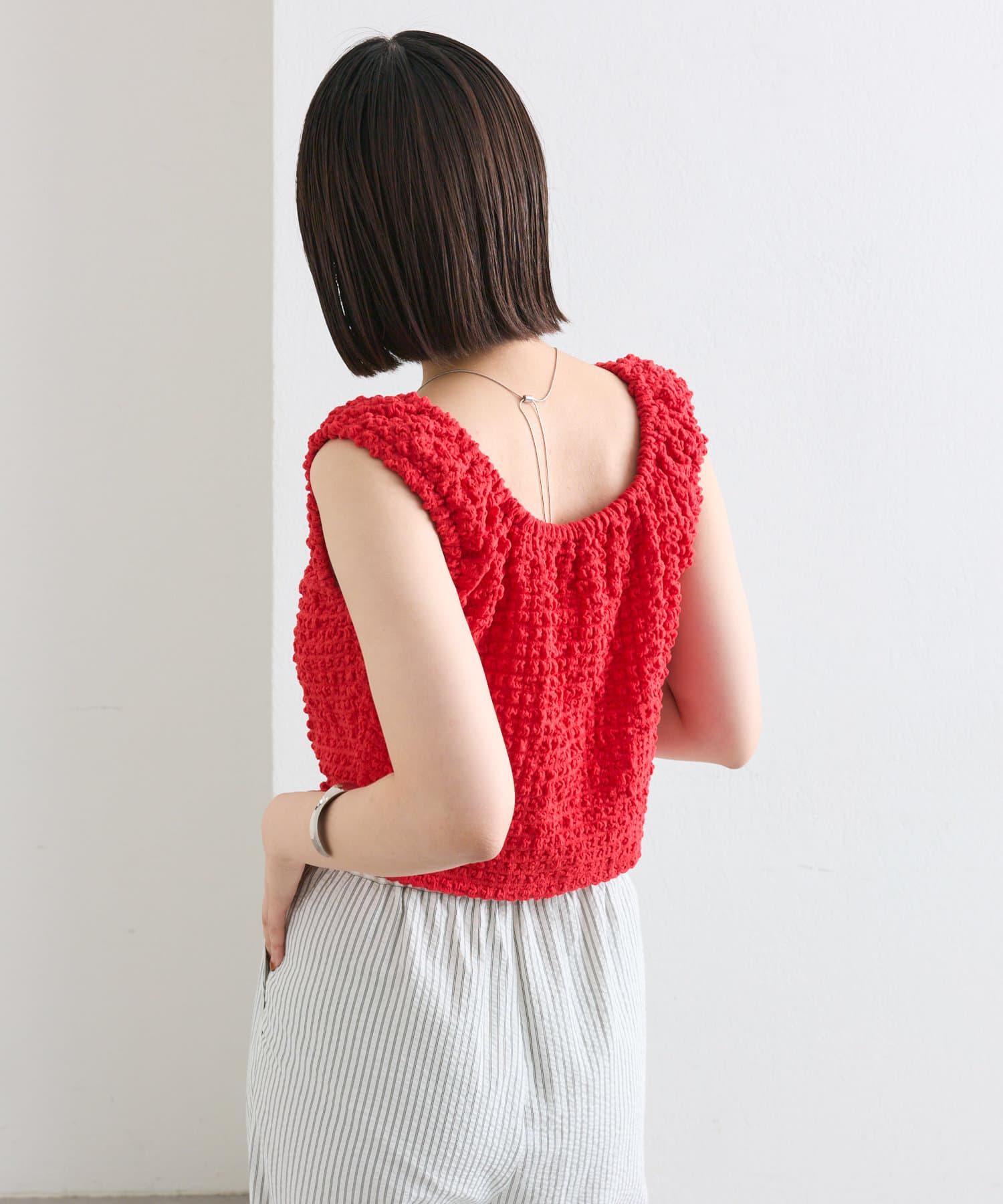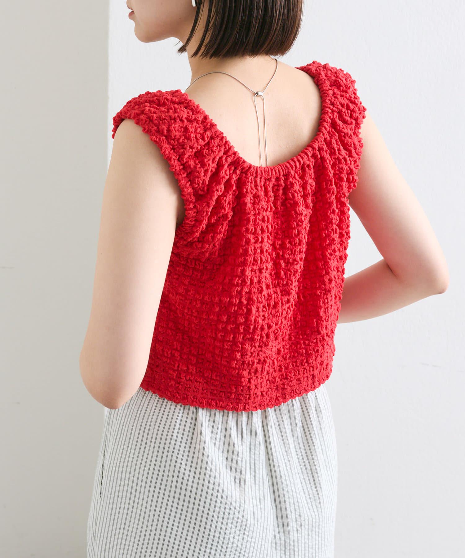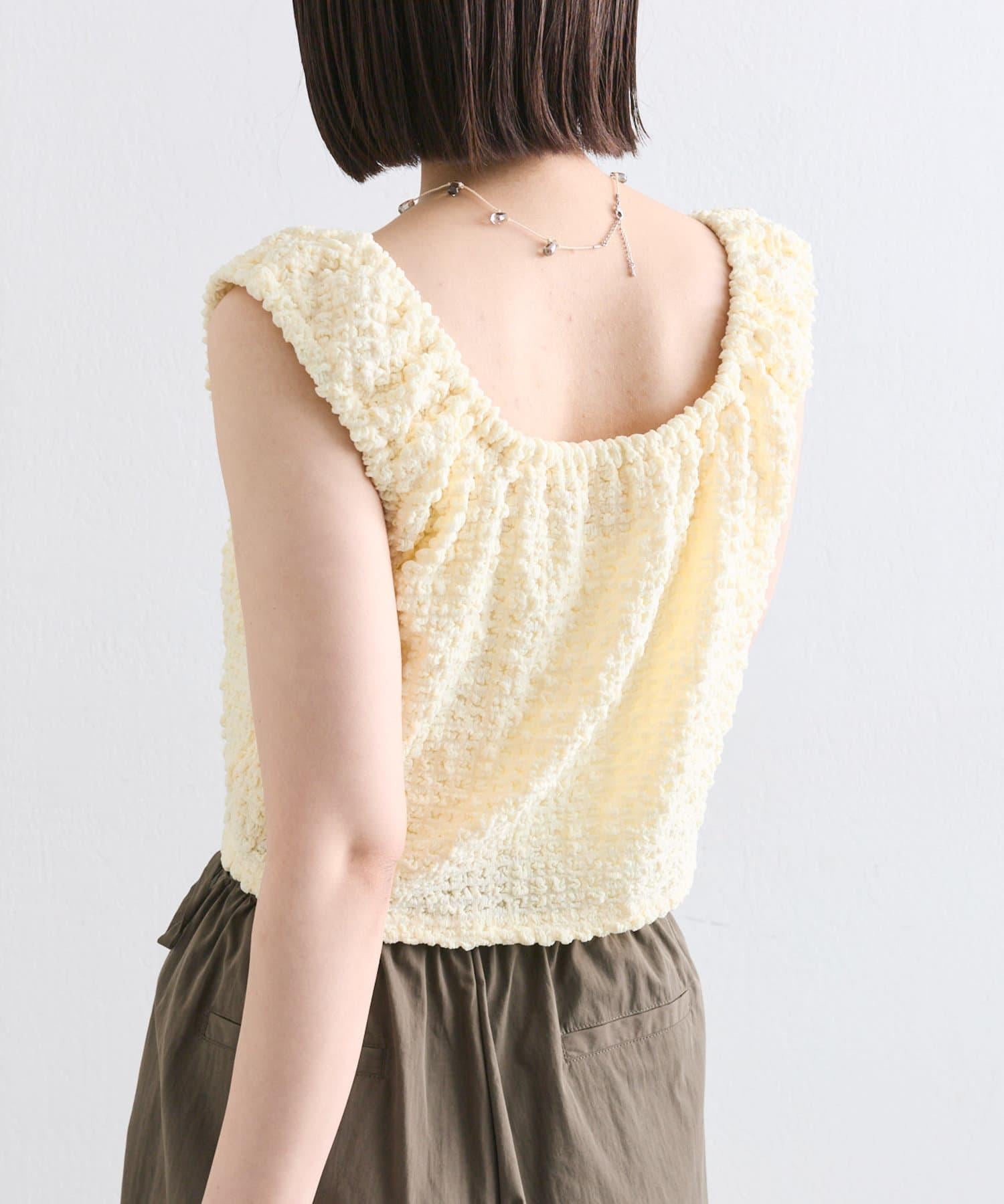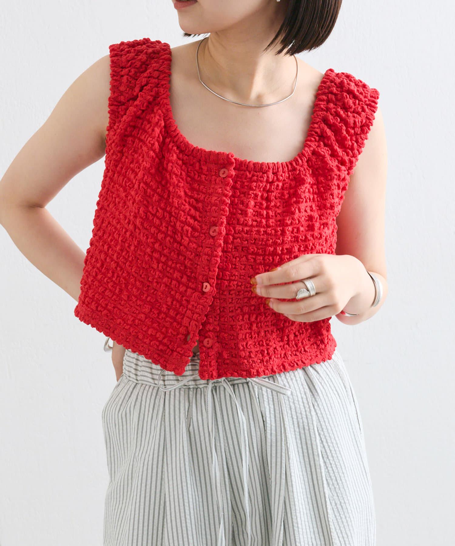 背心式上衣由帶有表面紋理的褶皺面料製成。