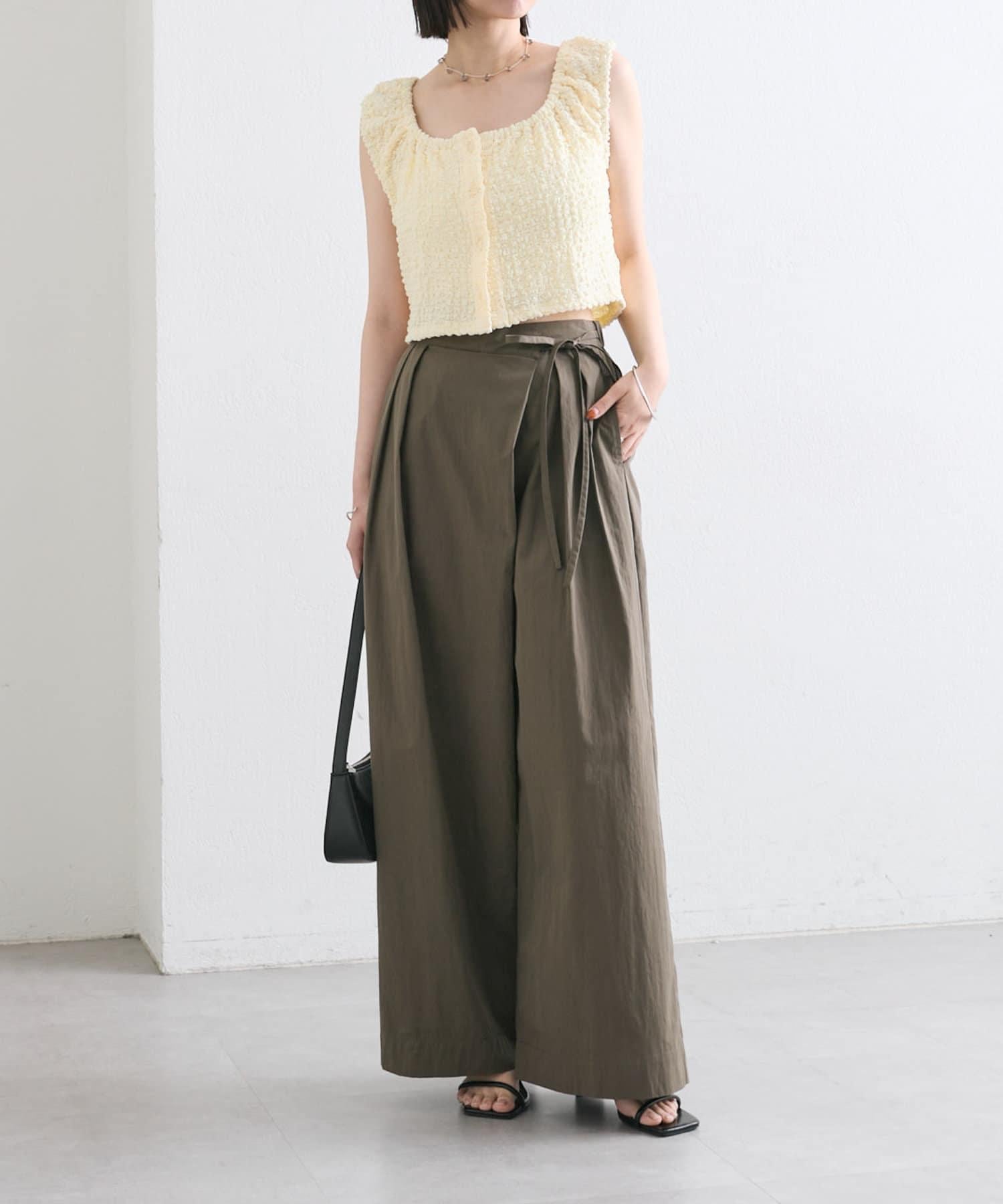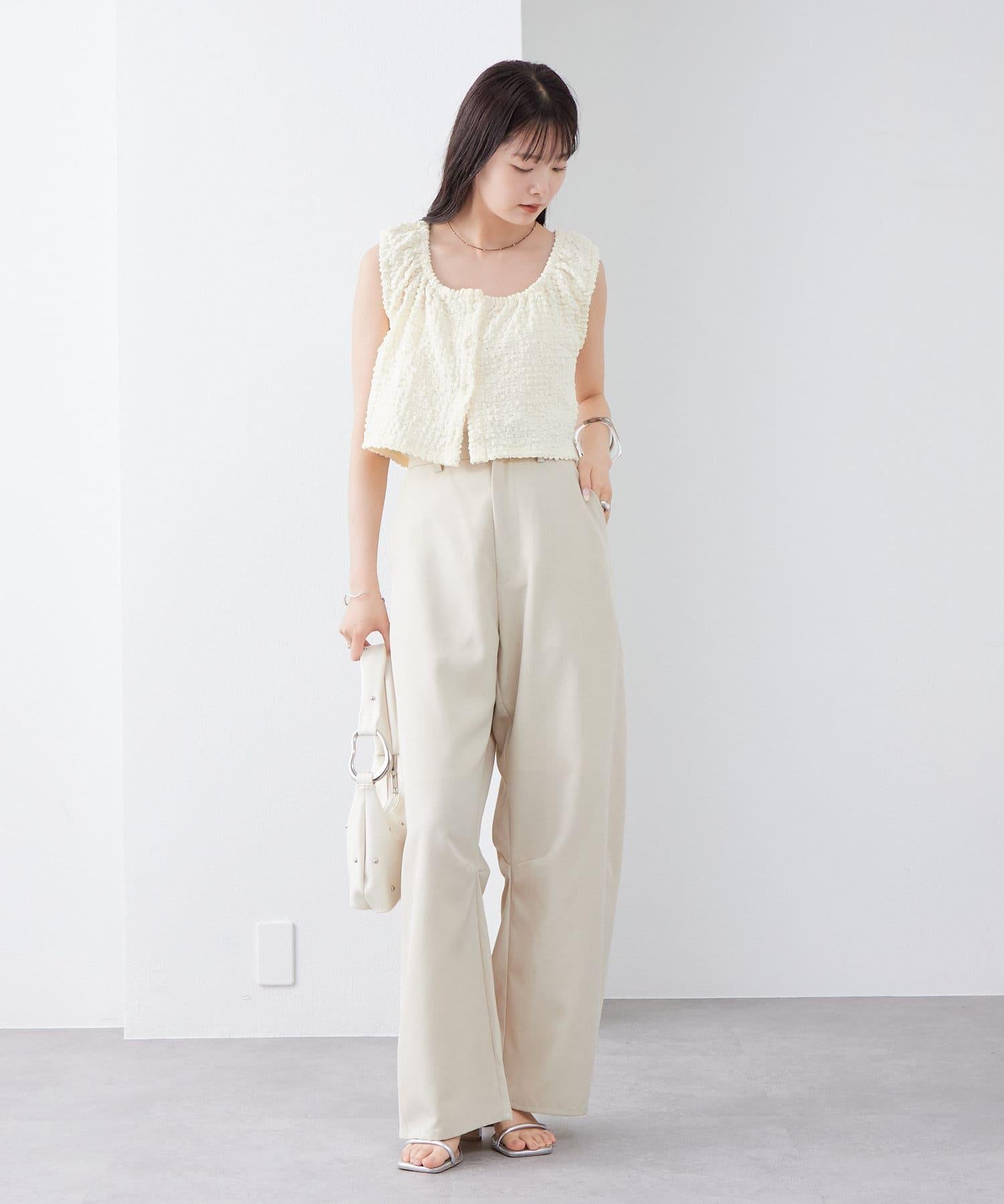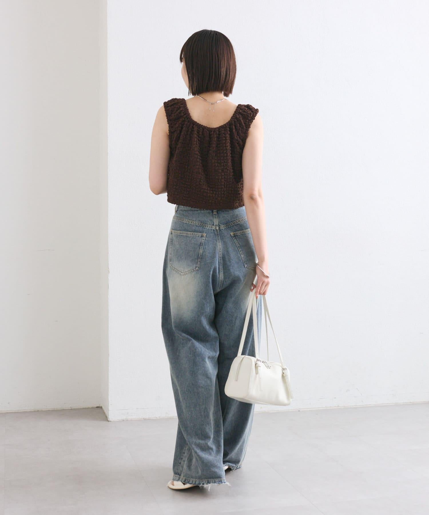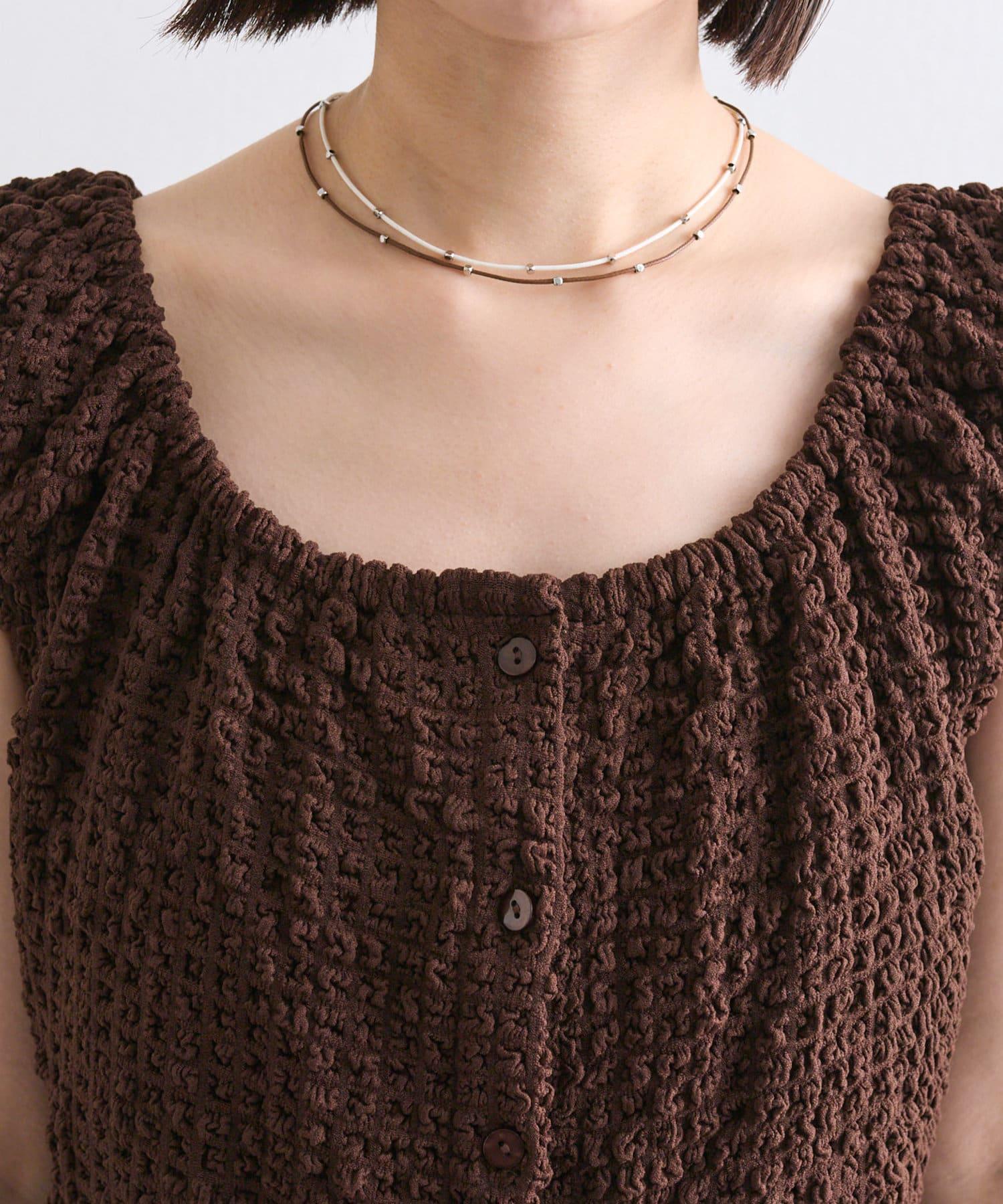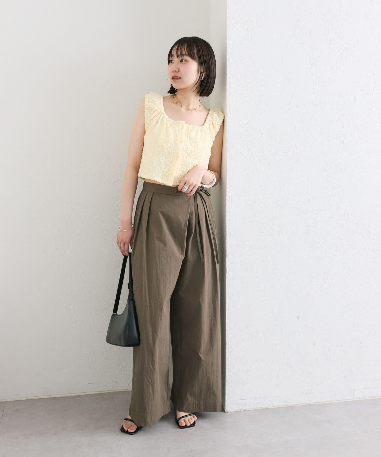 背心式上衣由帶有表面紋理的褶皺面料製成。