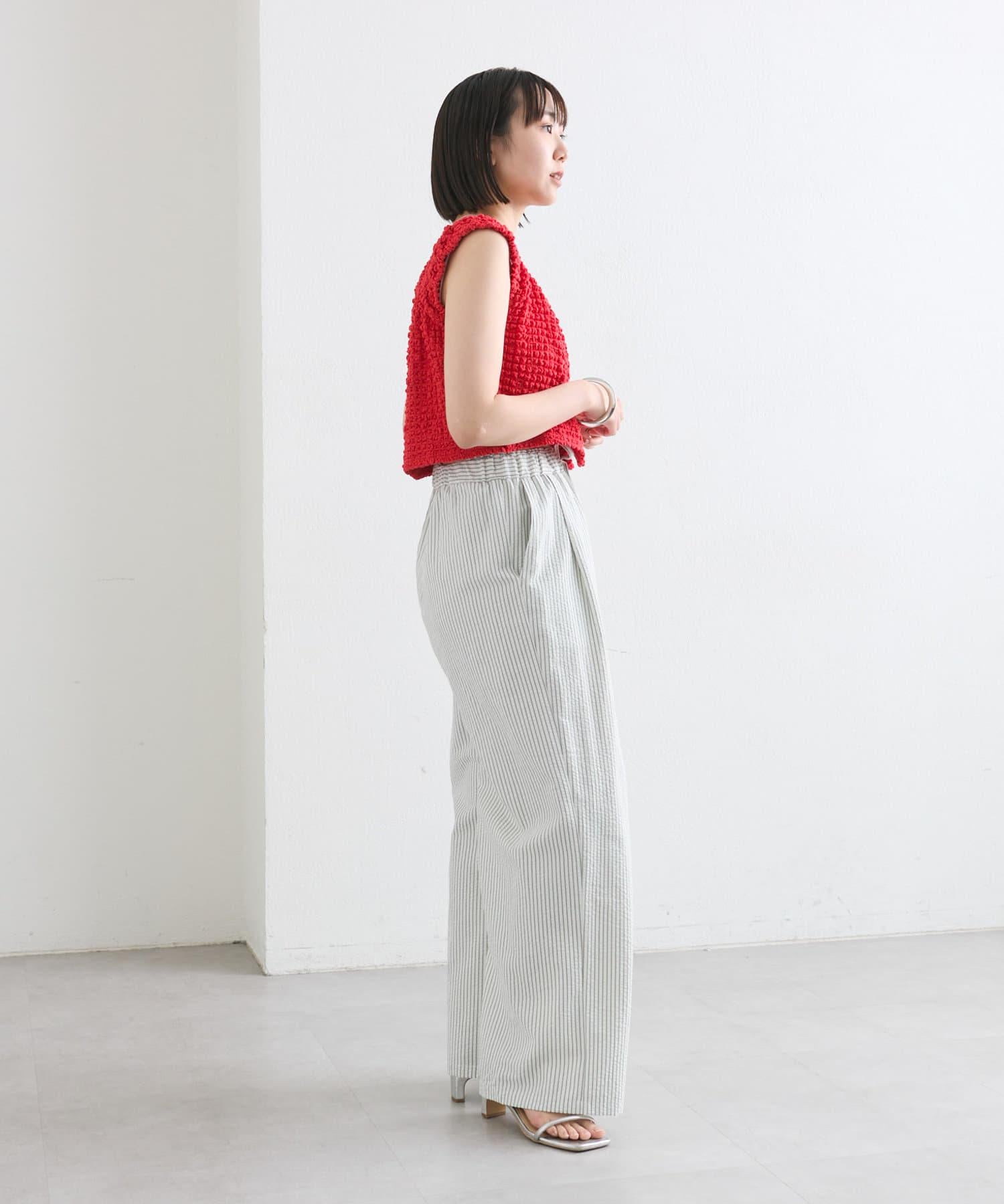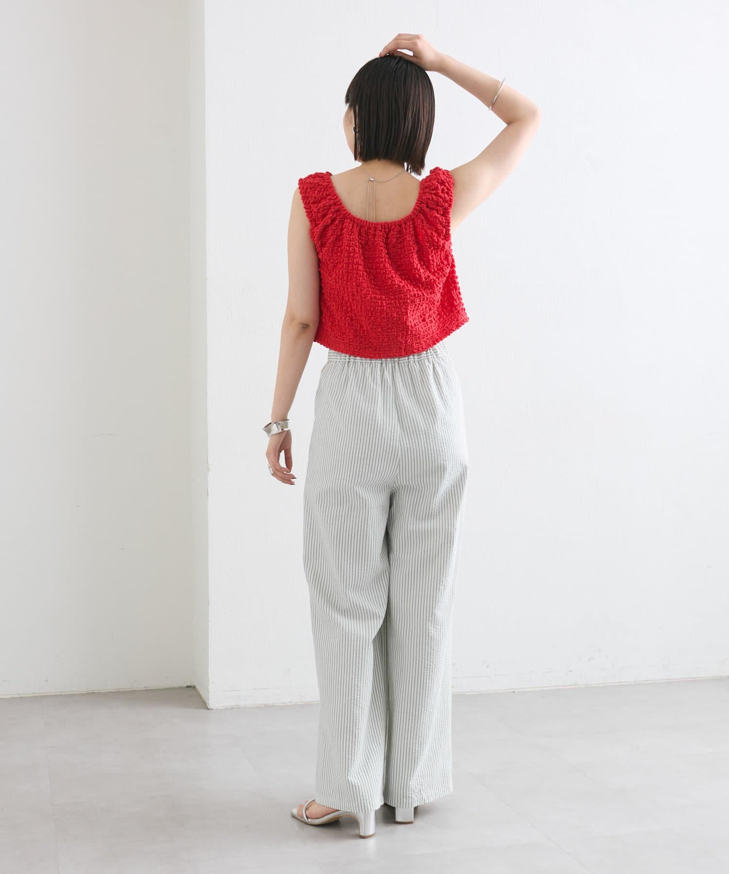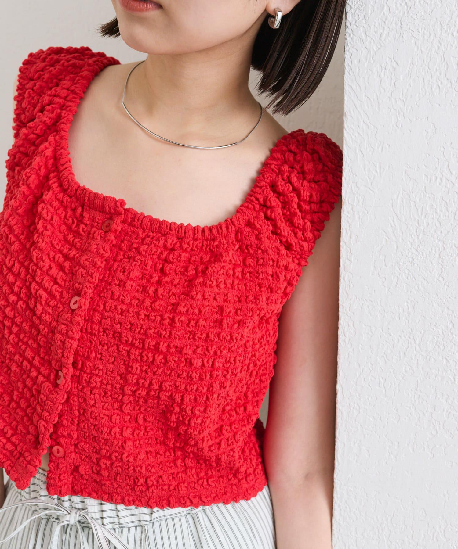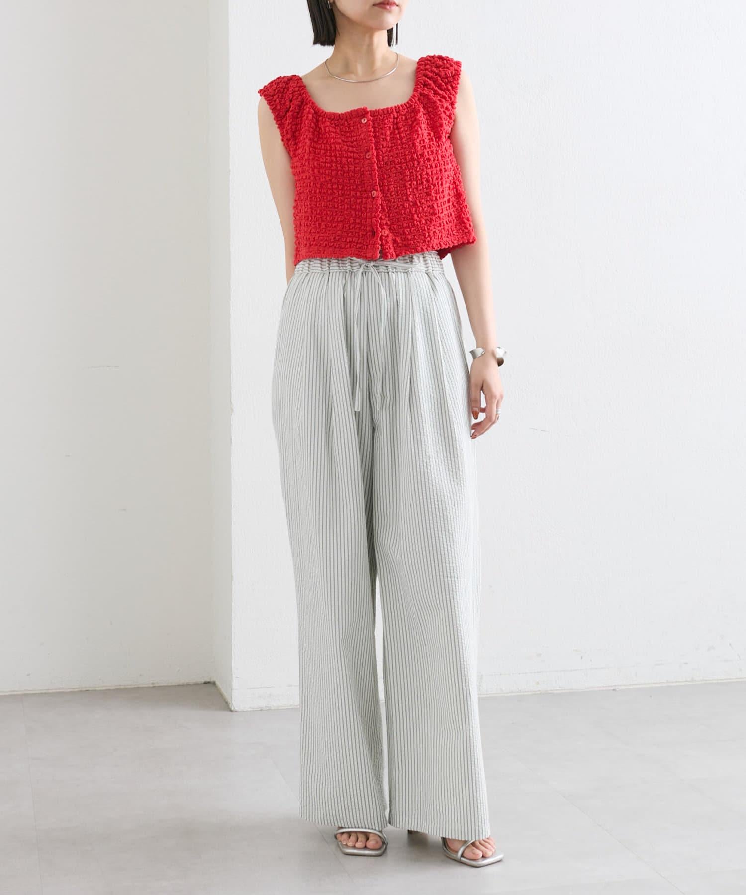 背心式上衣由帶有表面紋理的褶皺面料製成。