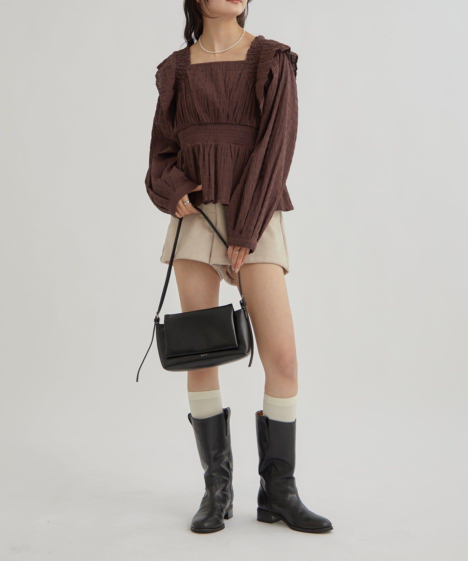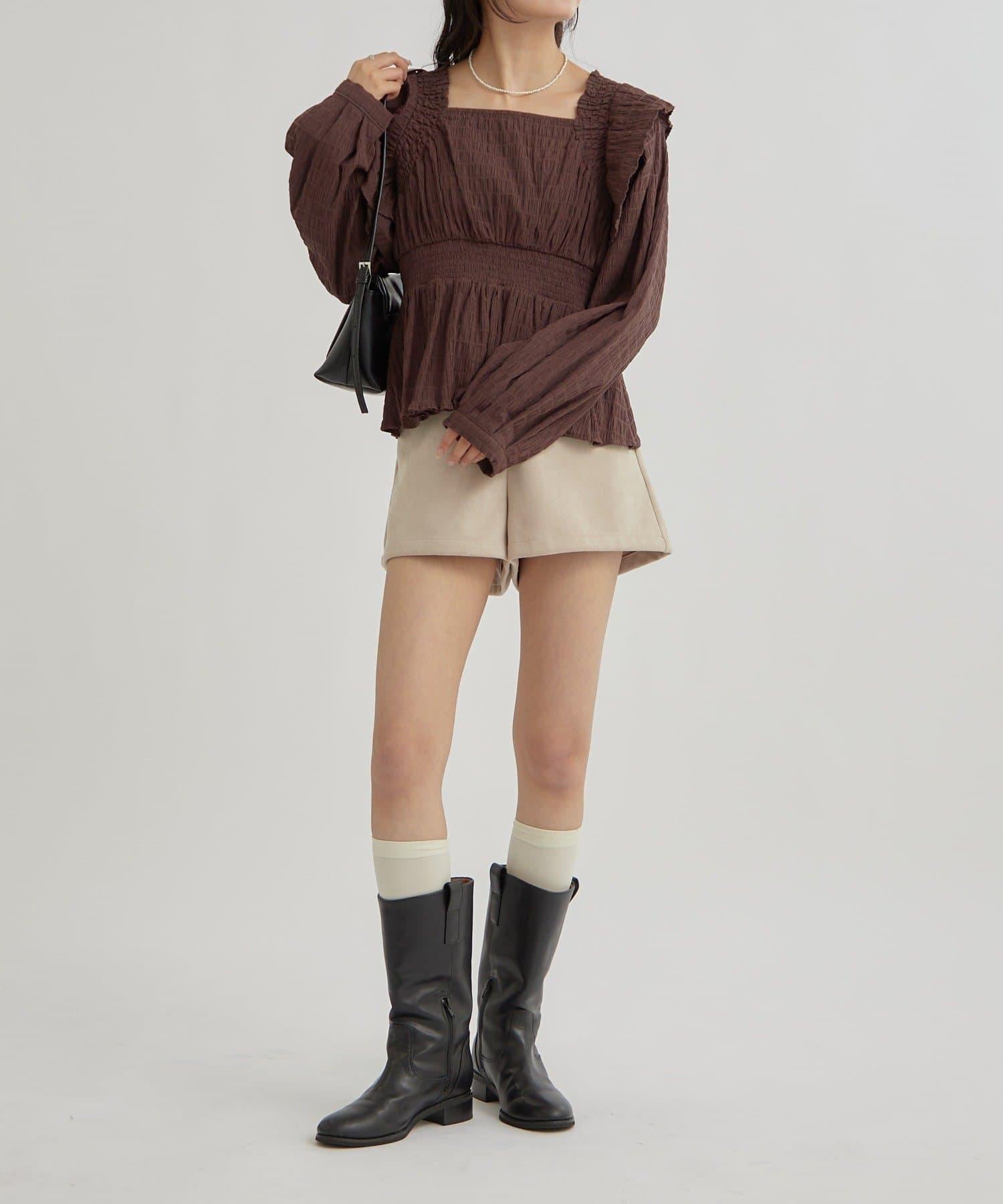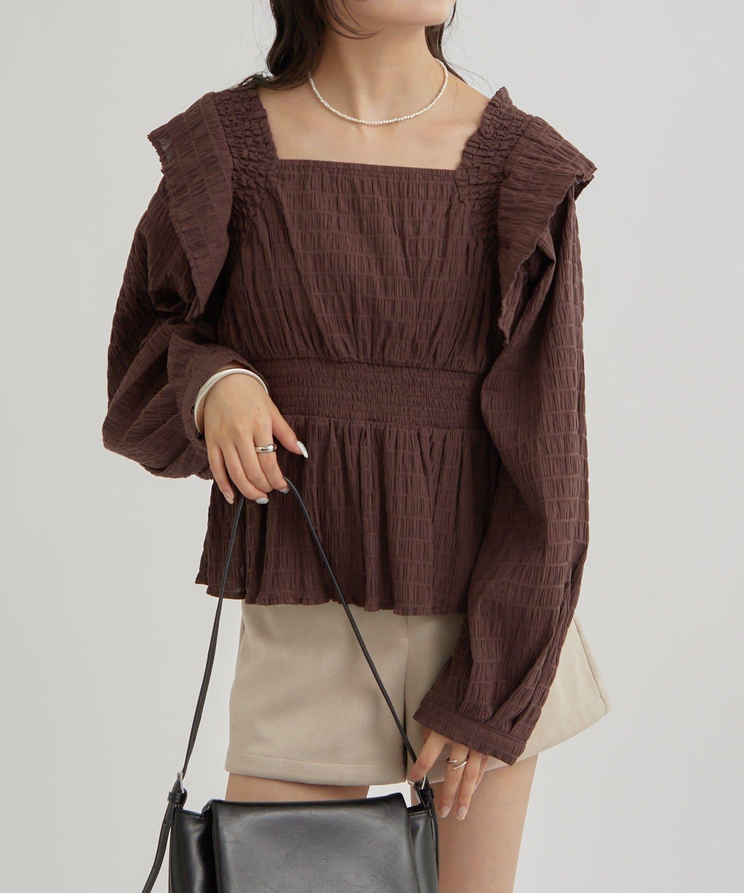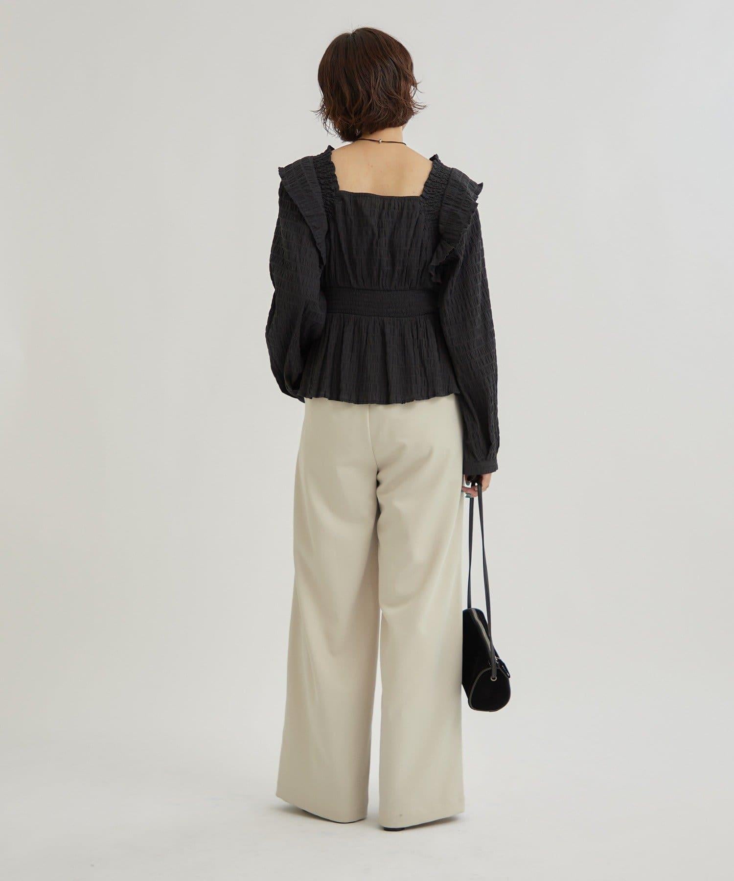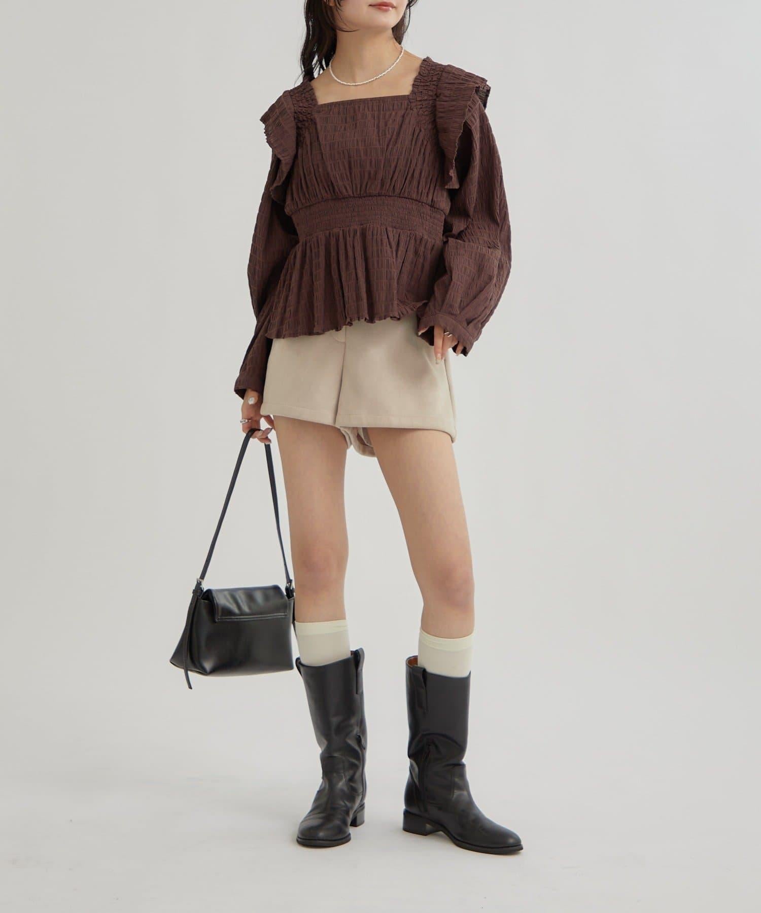 上衣採用方領設計,使頸部看起來乾淨利落,給人以纖細的印象。