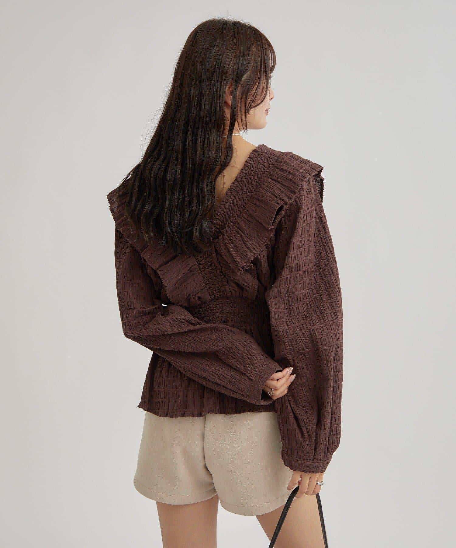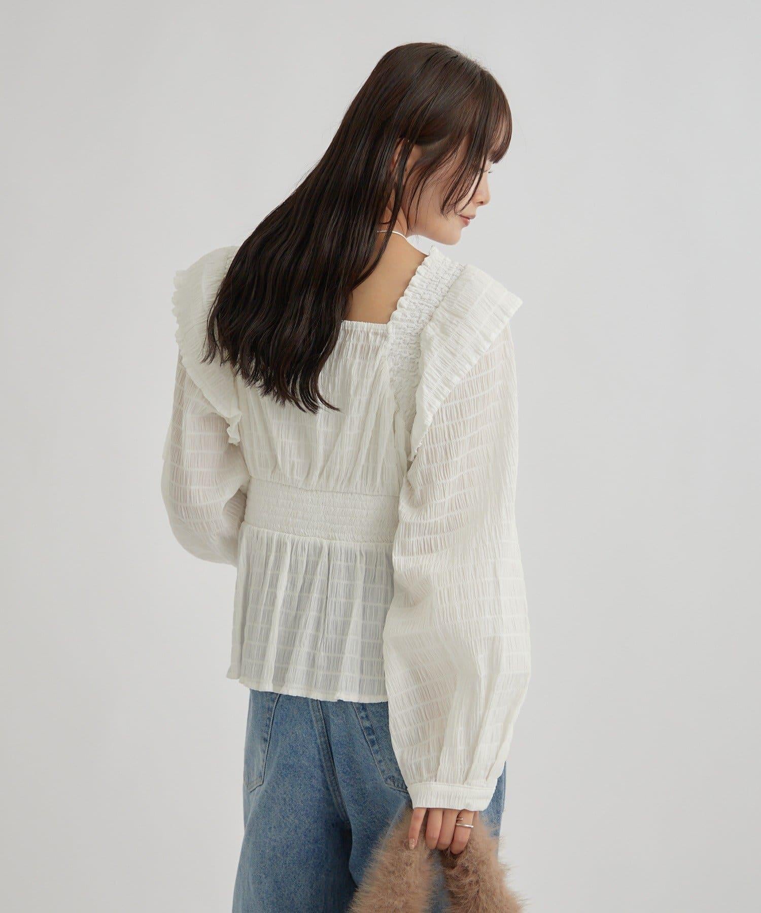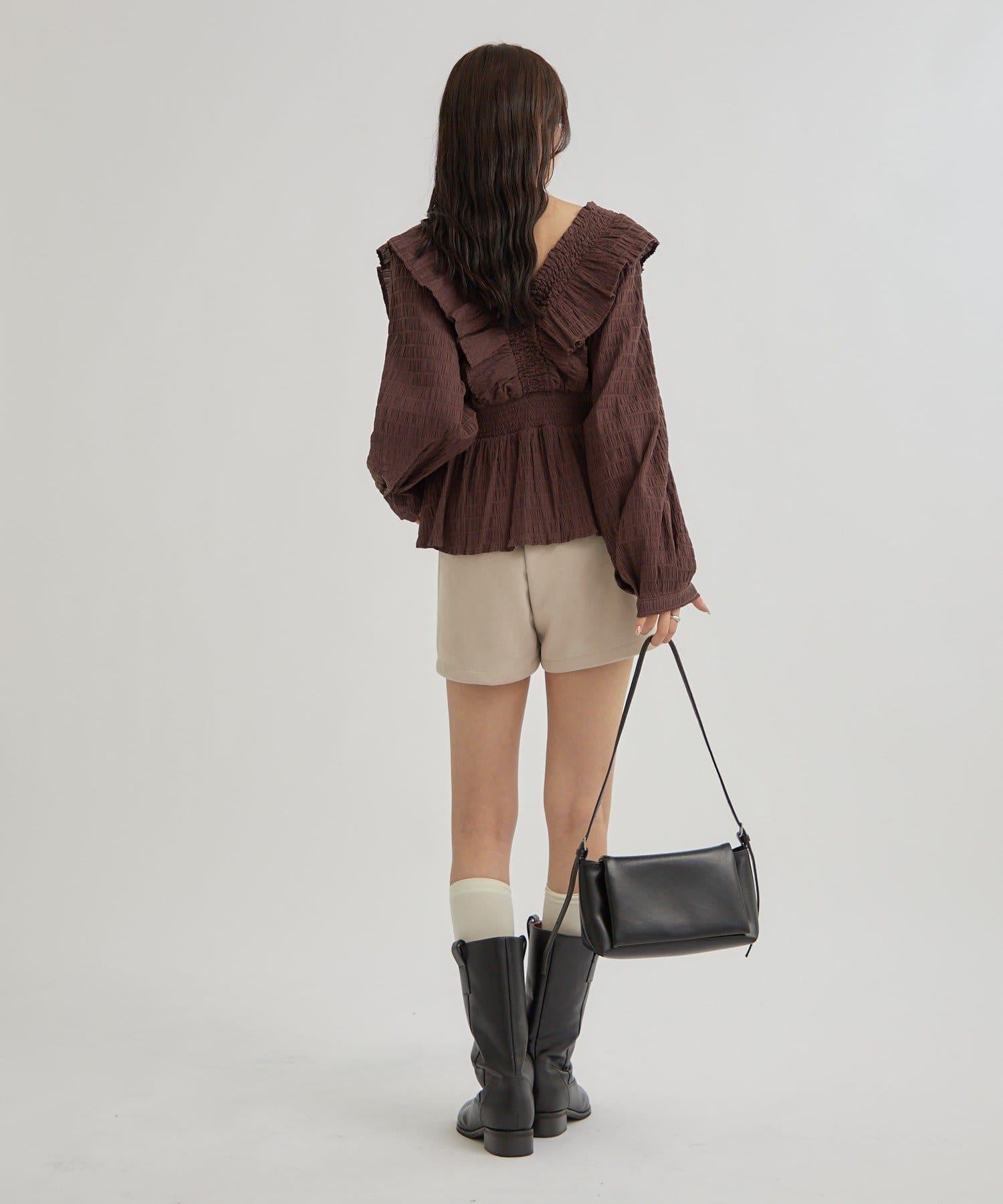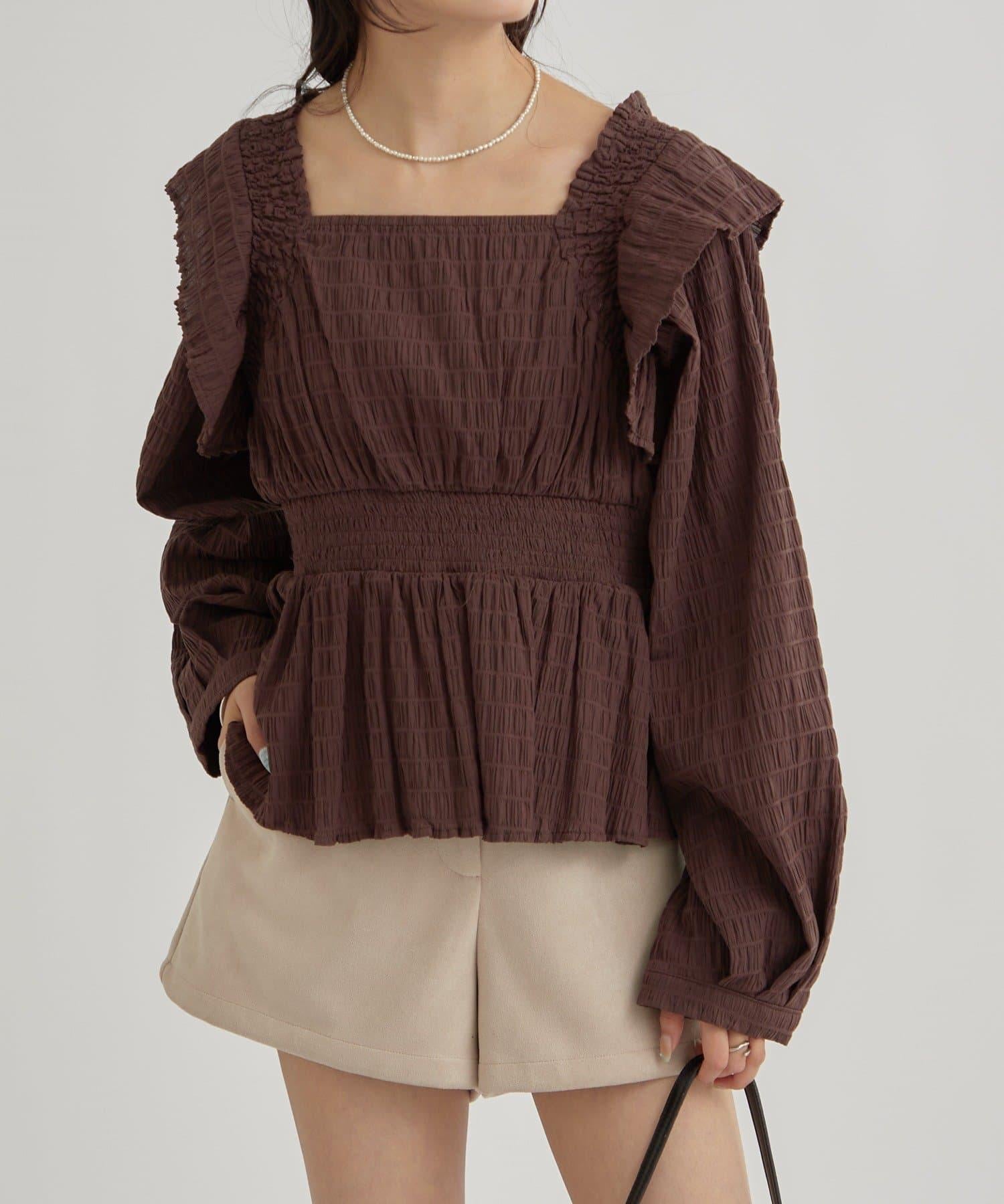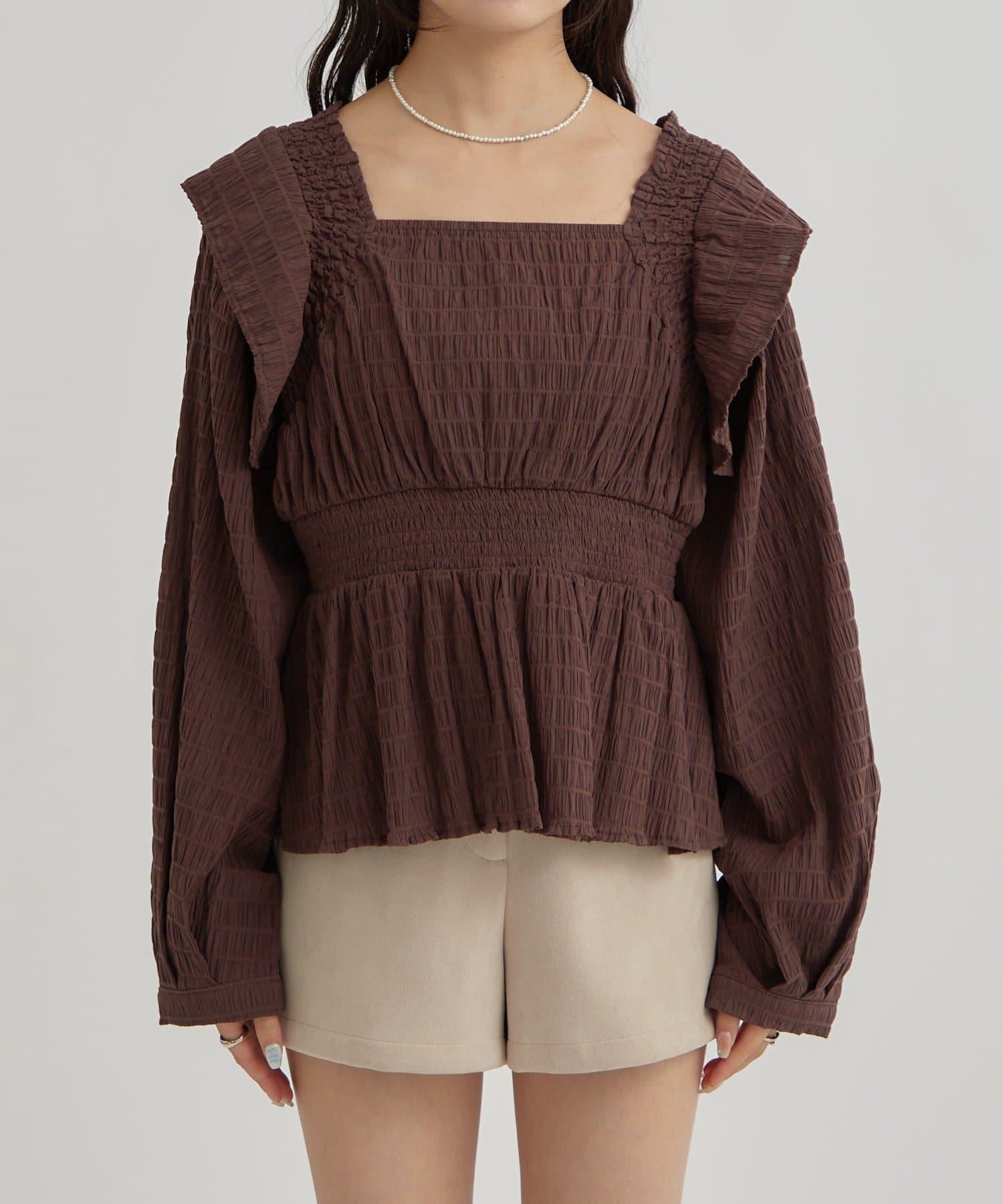 上衣採用方領設計,使頸部看起來乾淨利落,給人以纖細的印象。