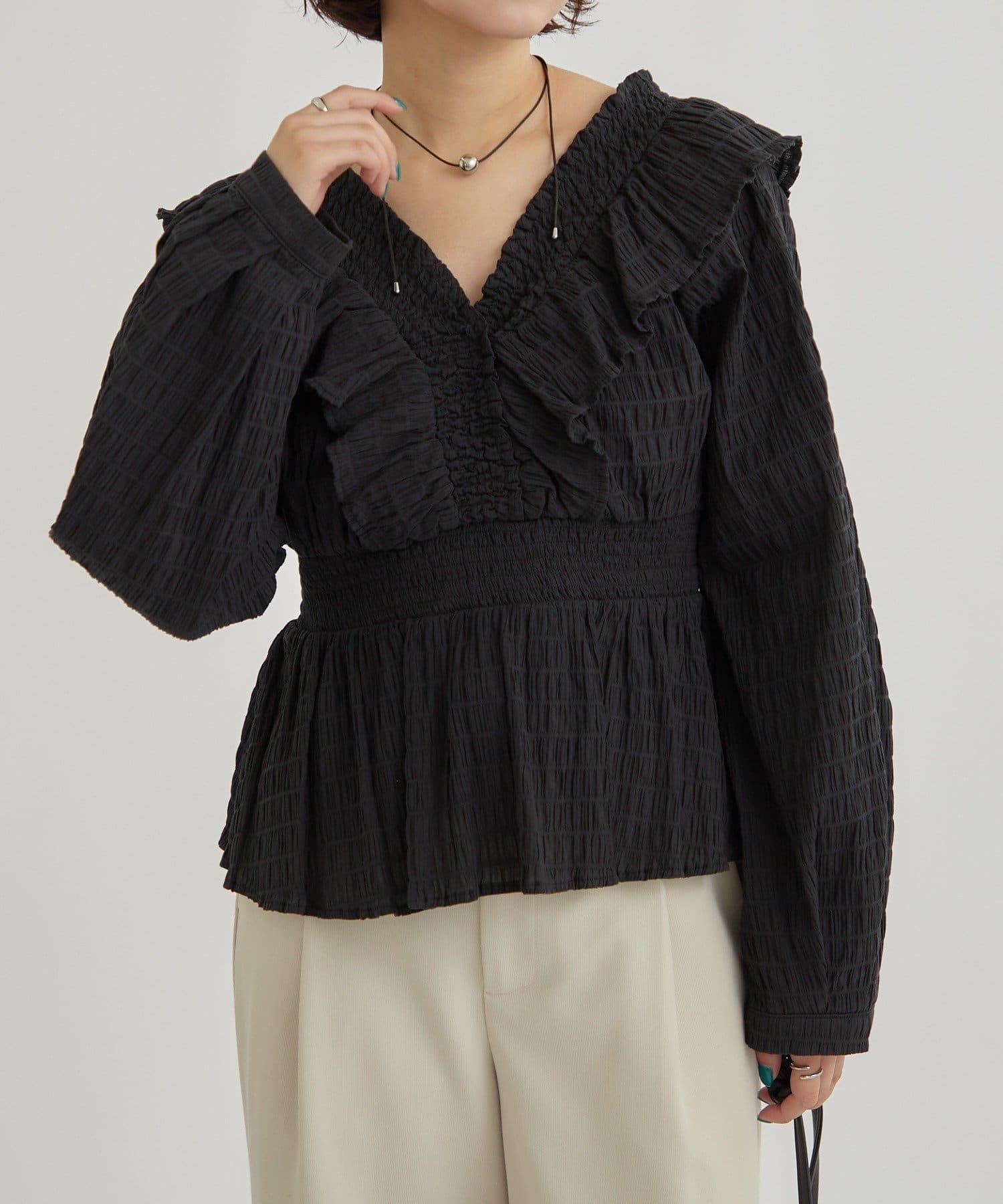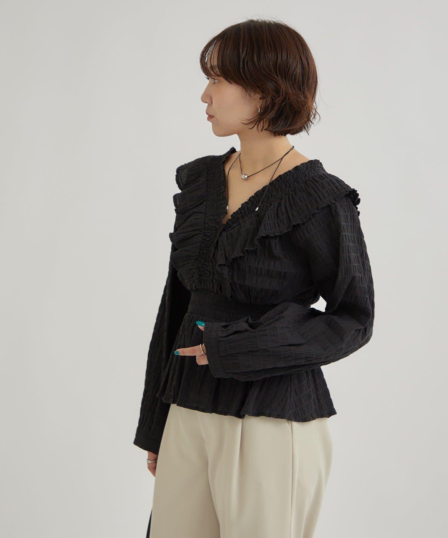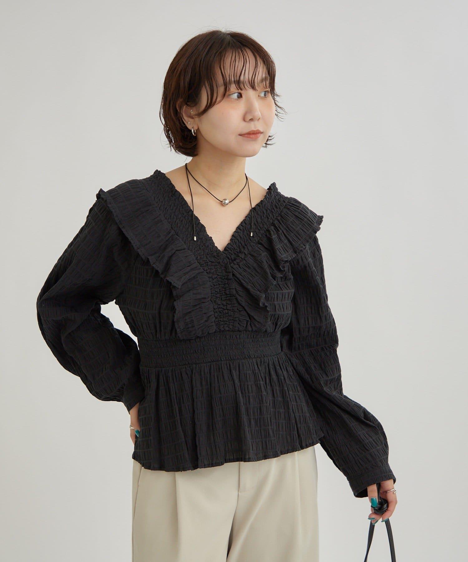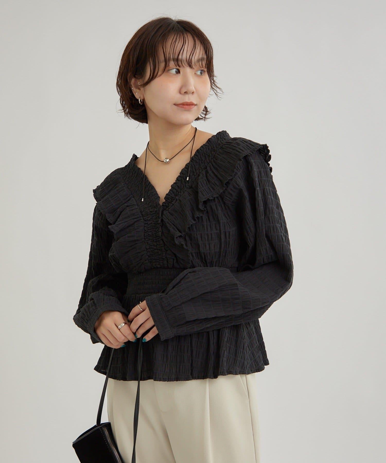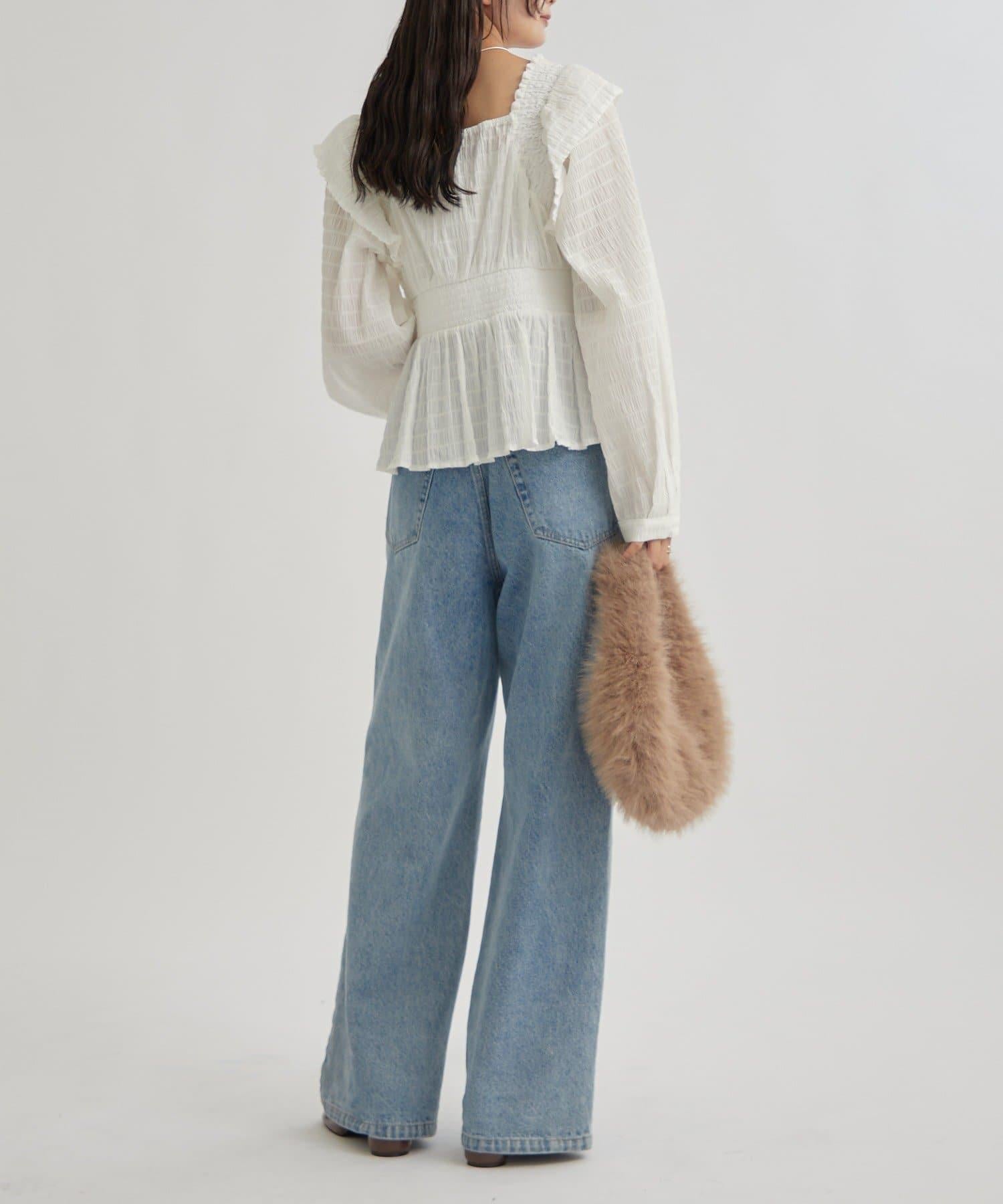 上衣採用方領設計,使頸部看起來乾淨利落,給人以纖細的印象。