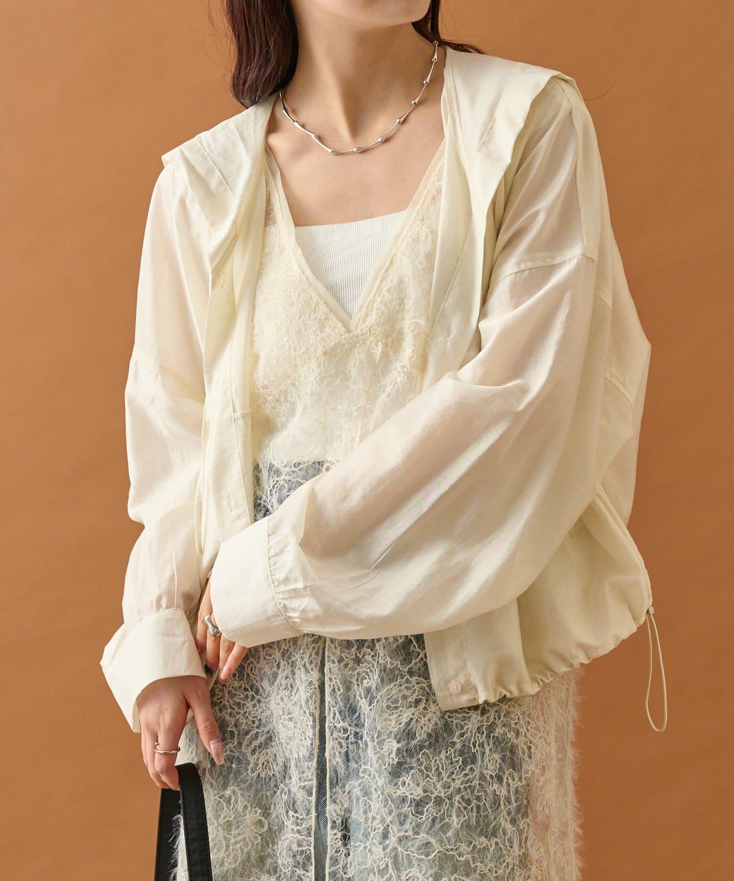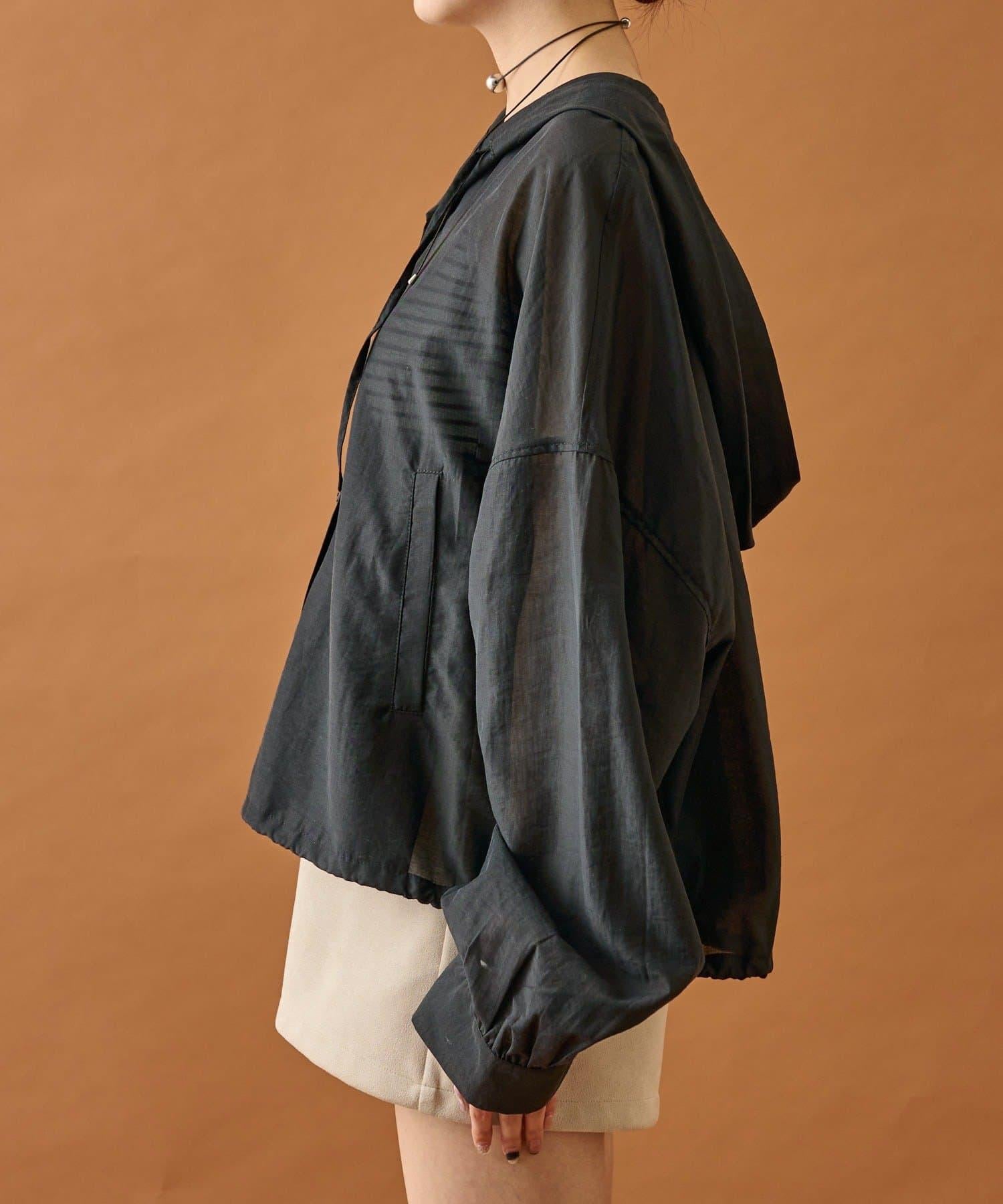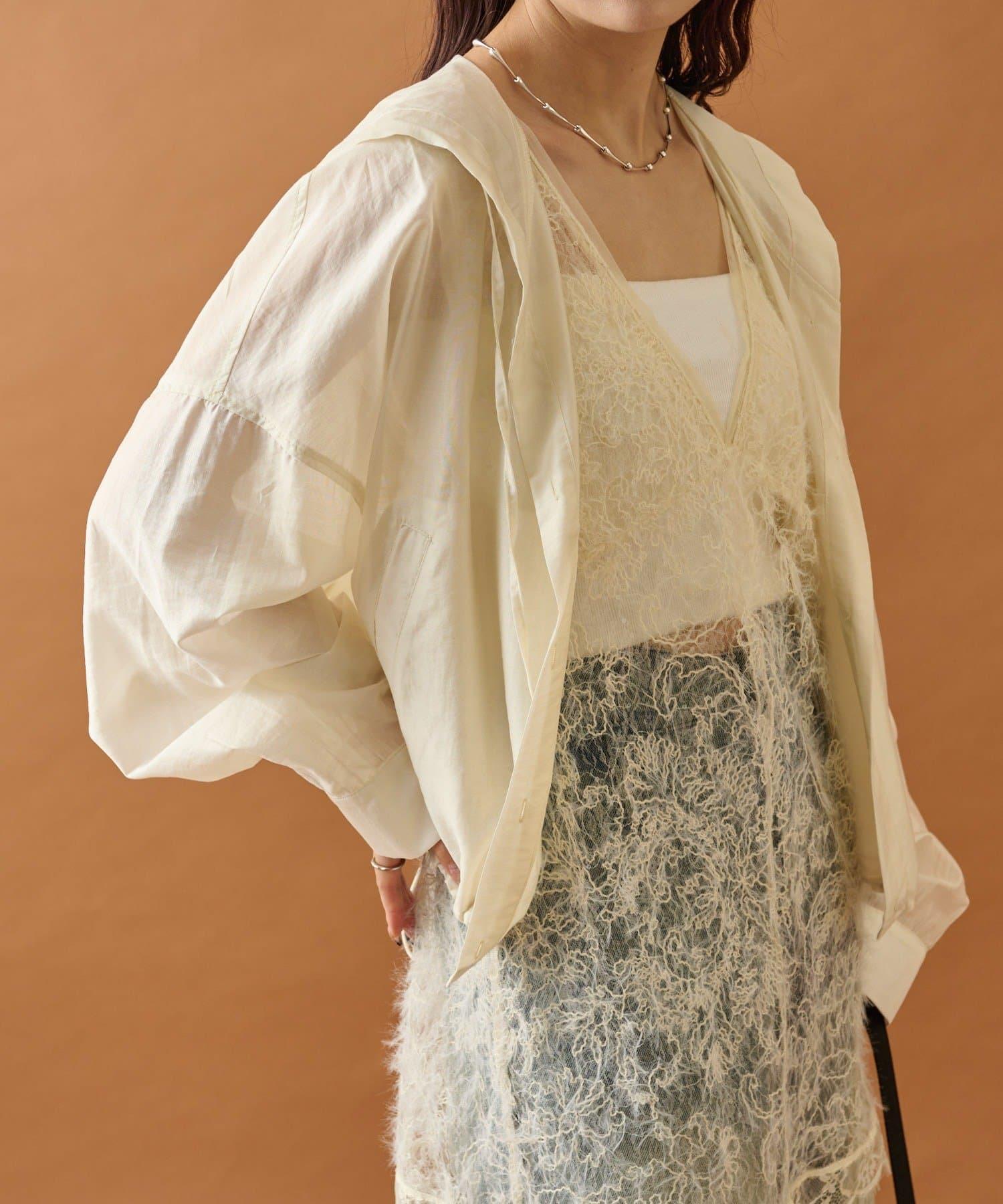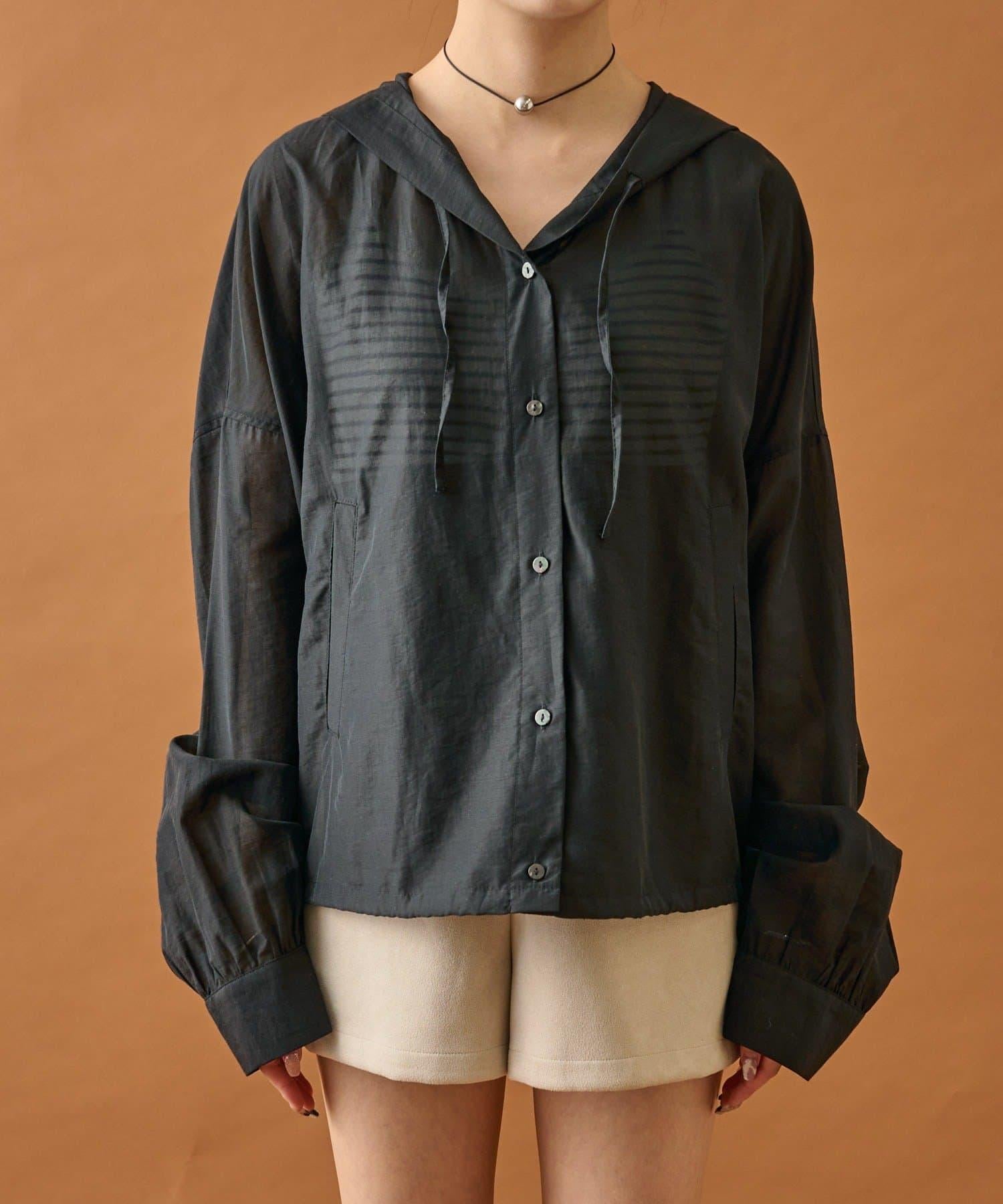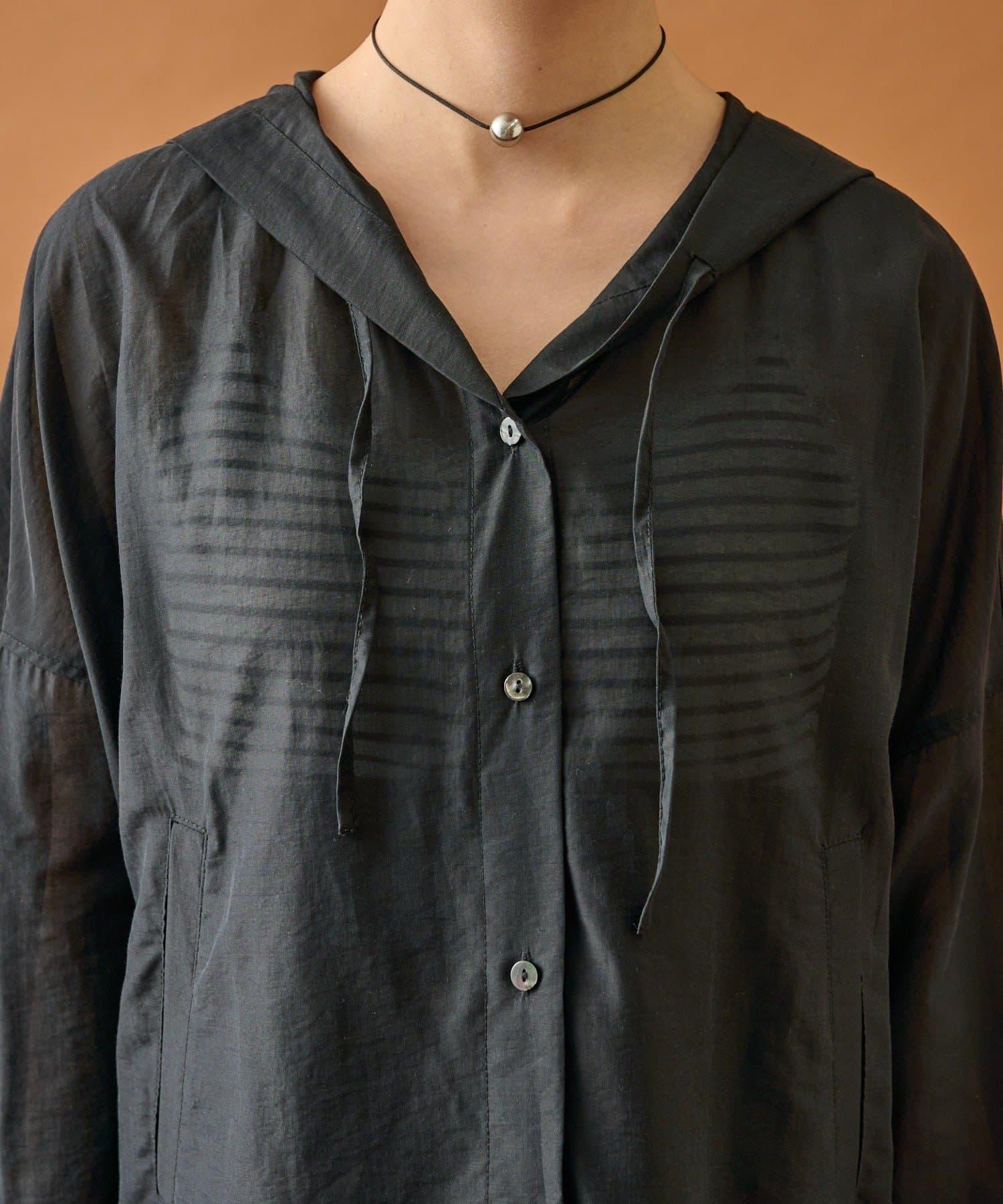 由輕微透明的薄紗面料製成的連帽型襯衫。透視面料微微透明,使襯衫看起來略帶透明感。