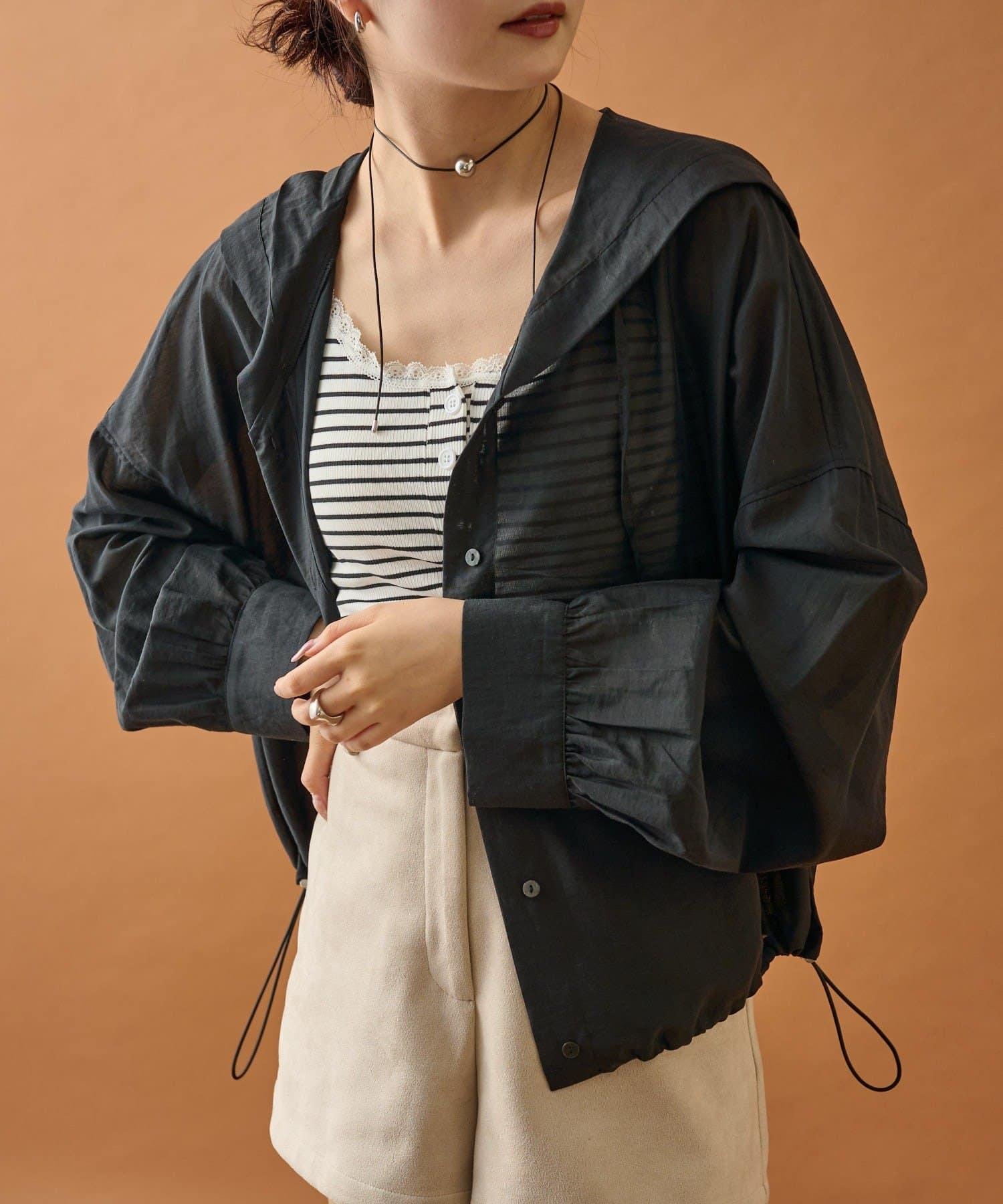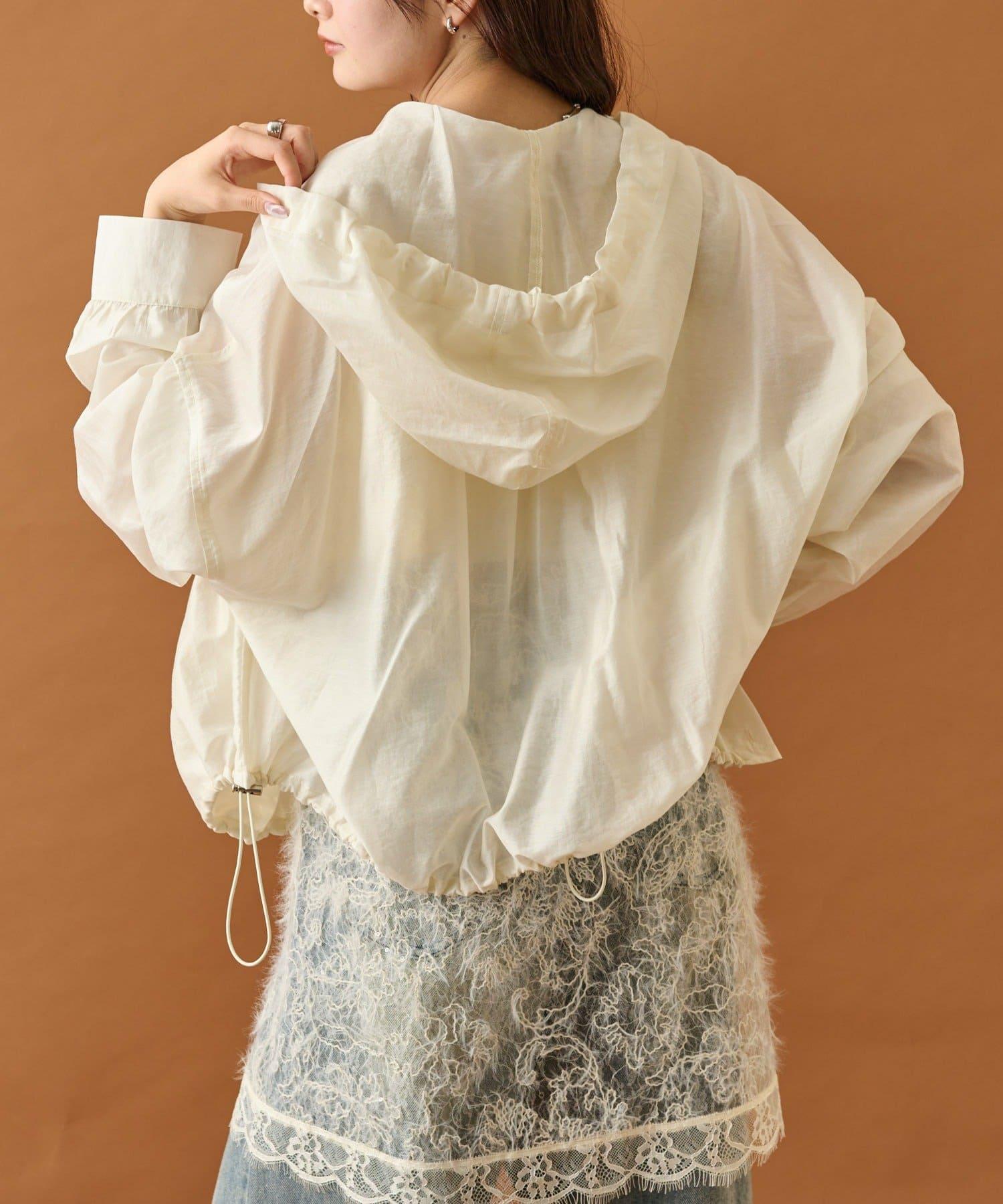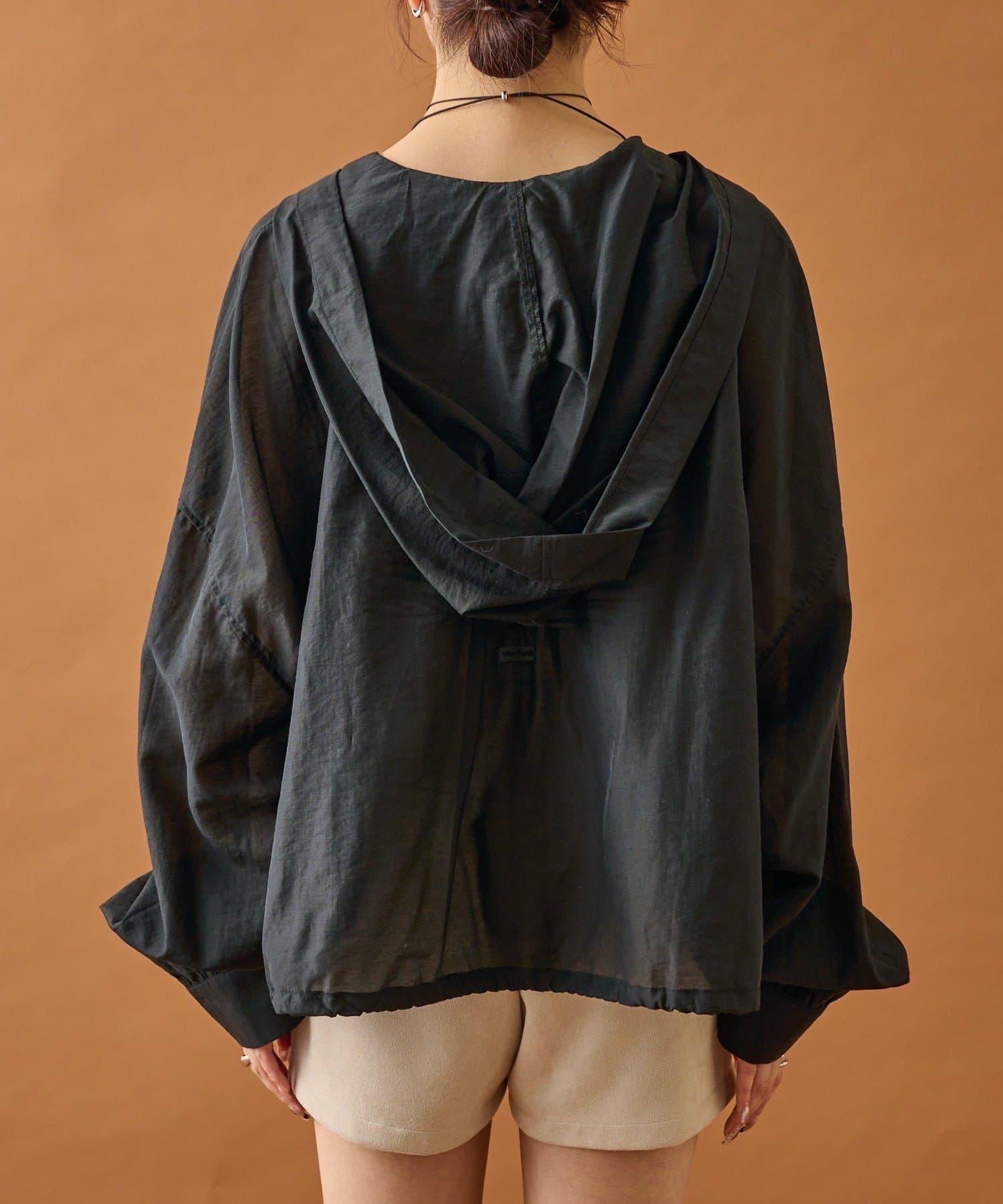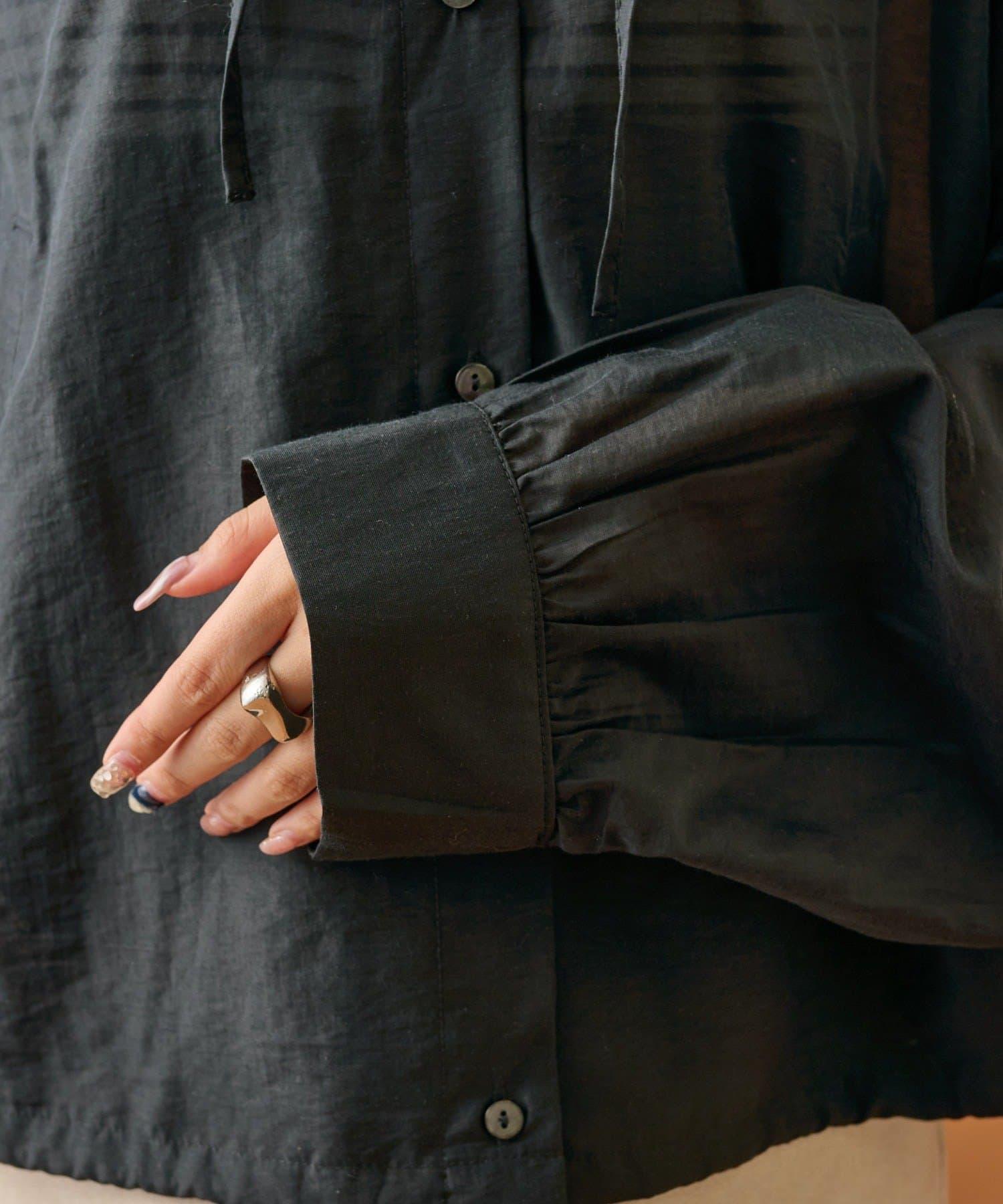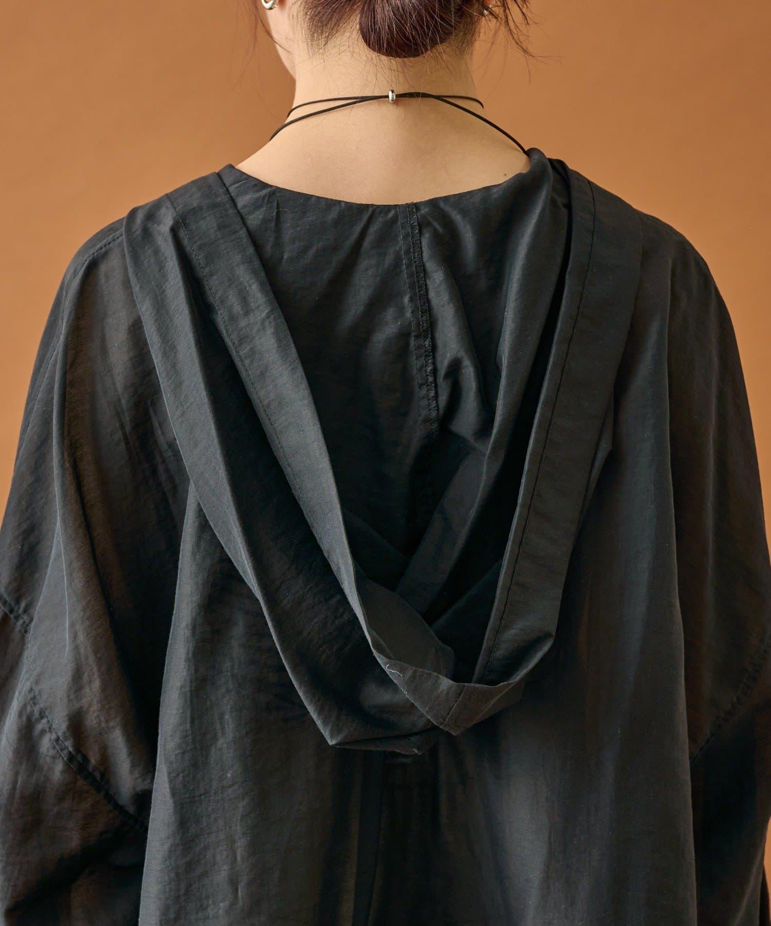 由輕微透明的薄紗面料製成的連帽型襯衫。透視面料微微透明,使襯衫看起來略帶透明感。