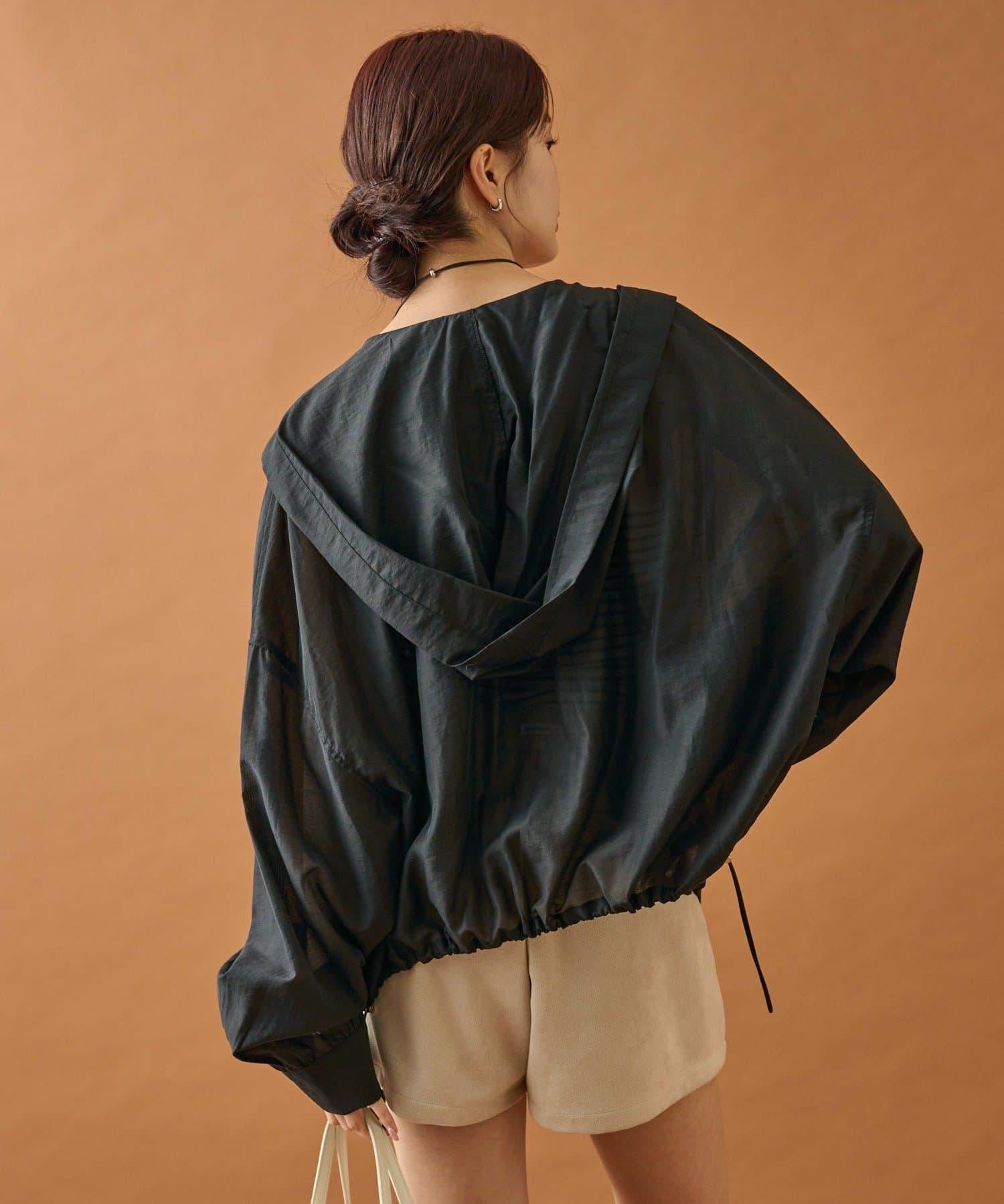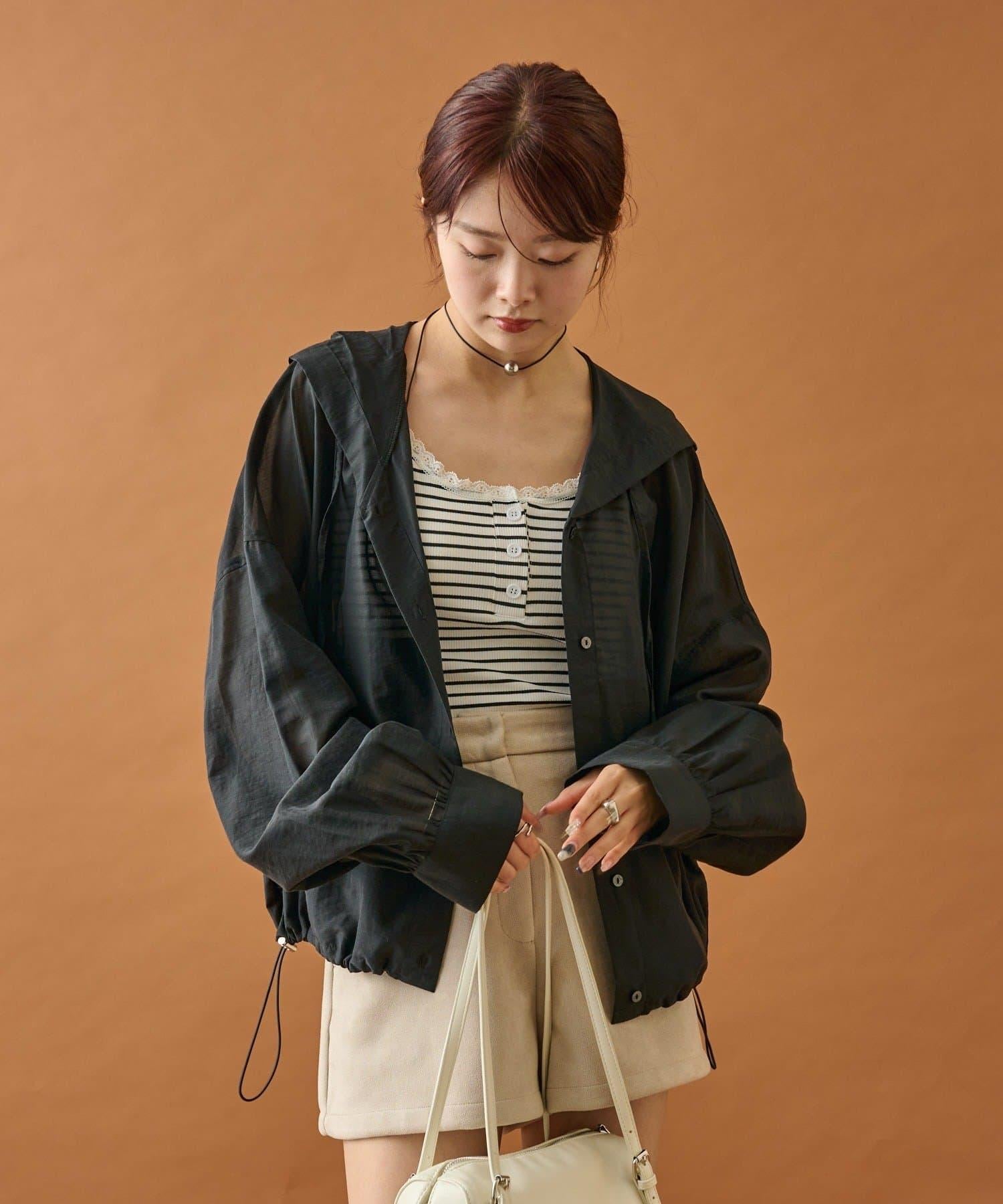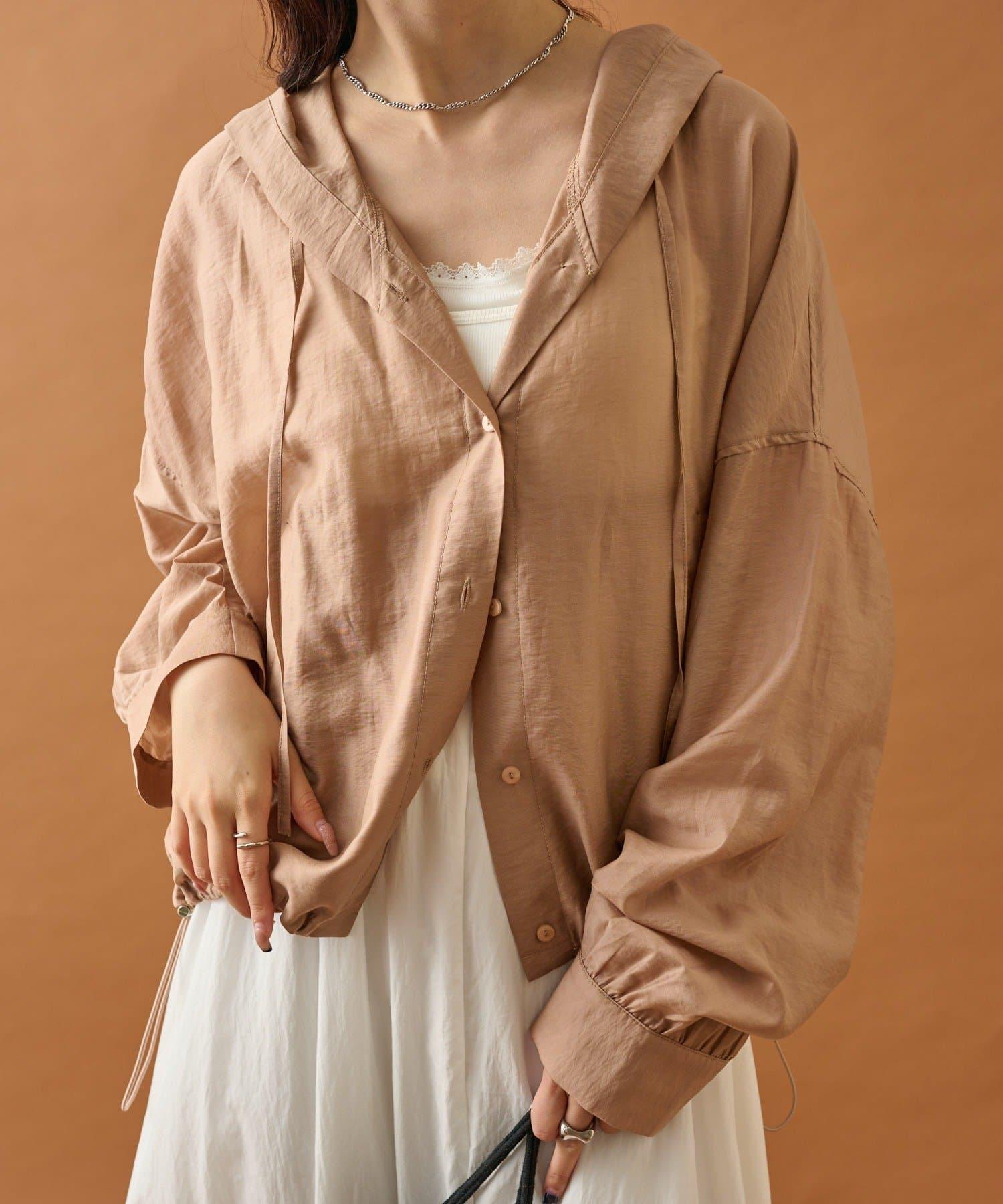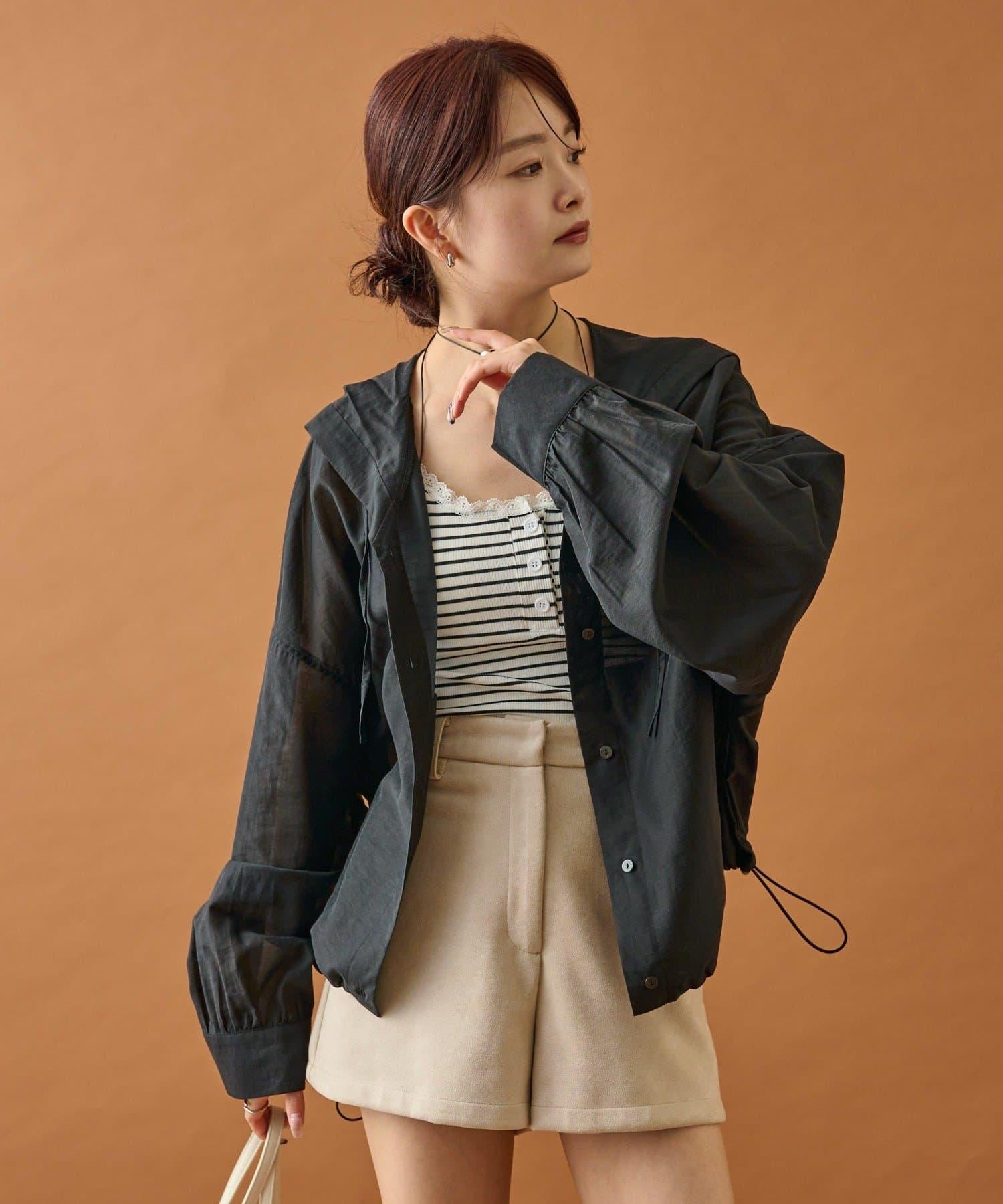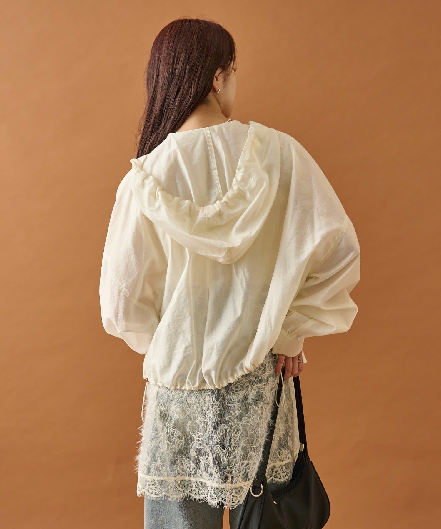由輕微透明的薄紗面料製成的連帽型襯衫。透視面料微微透明,使襯衫看起來略帶透明感。