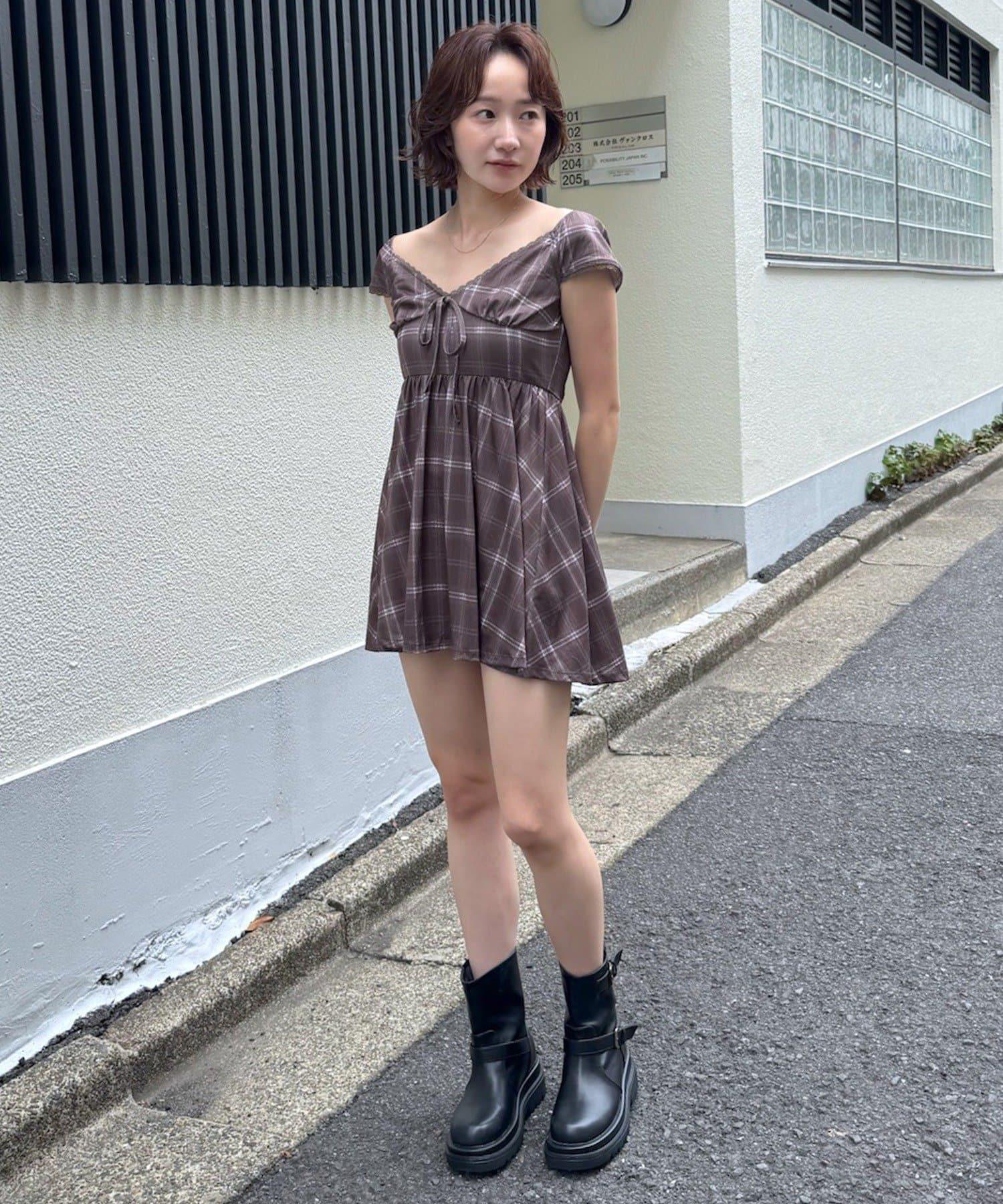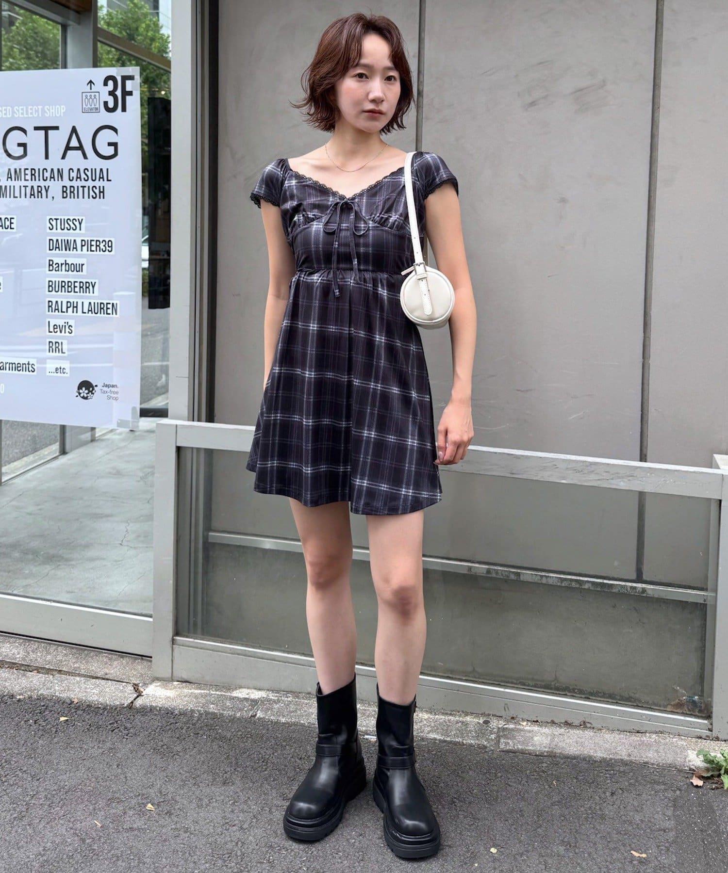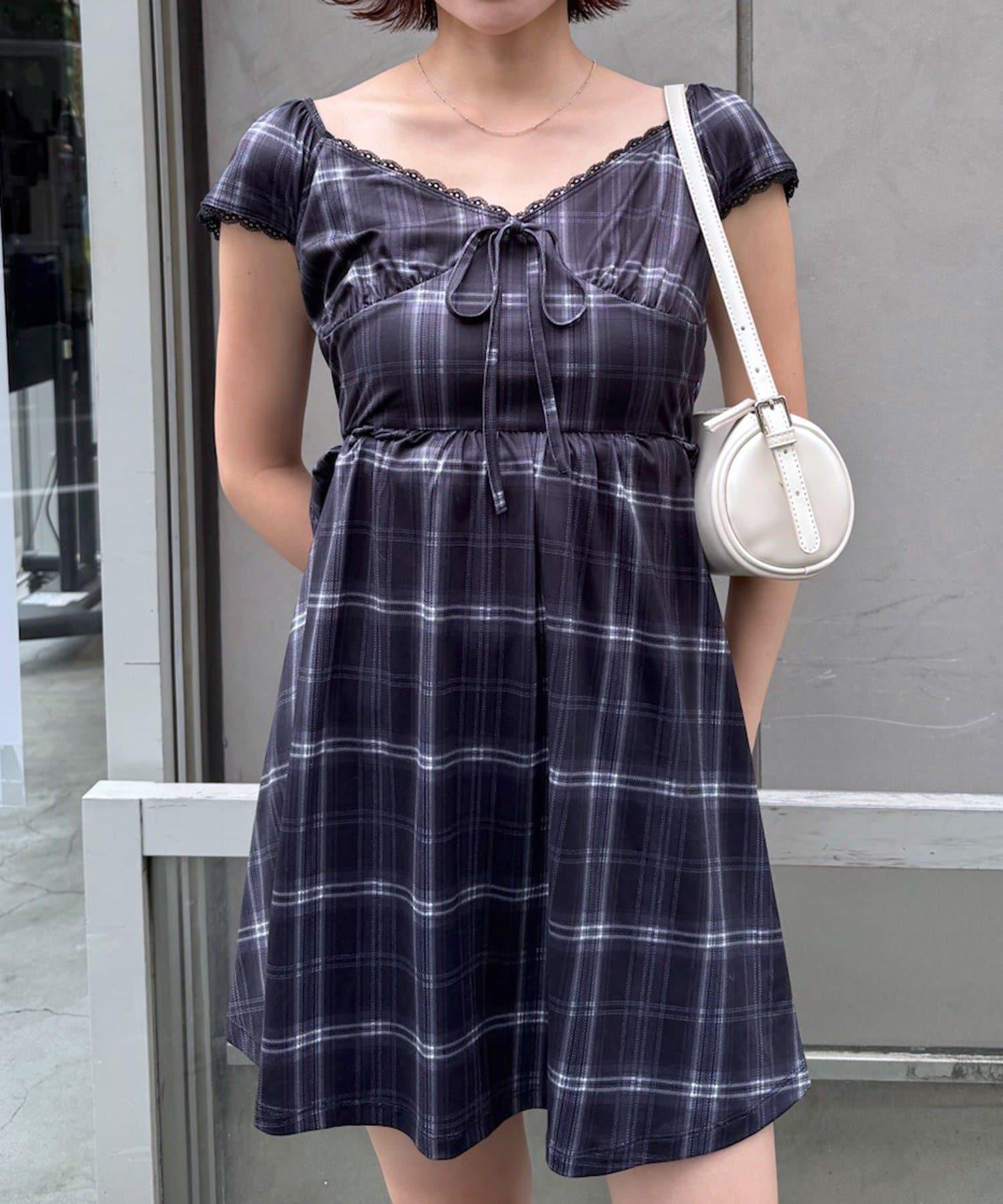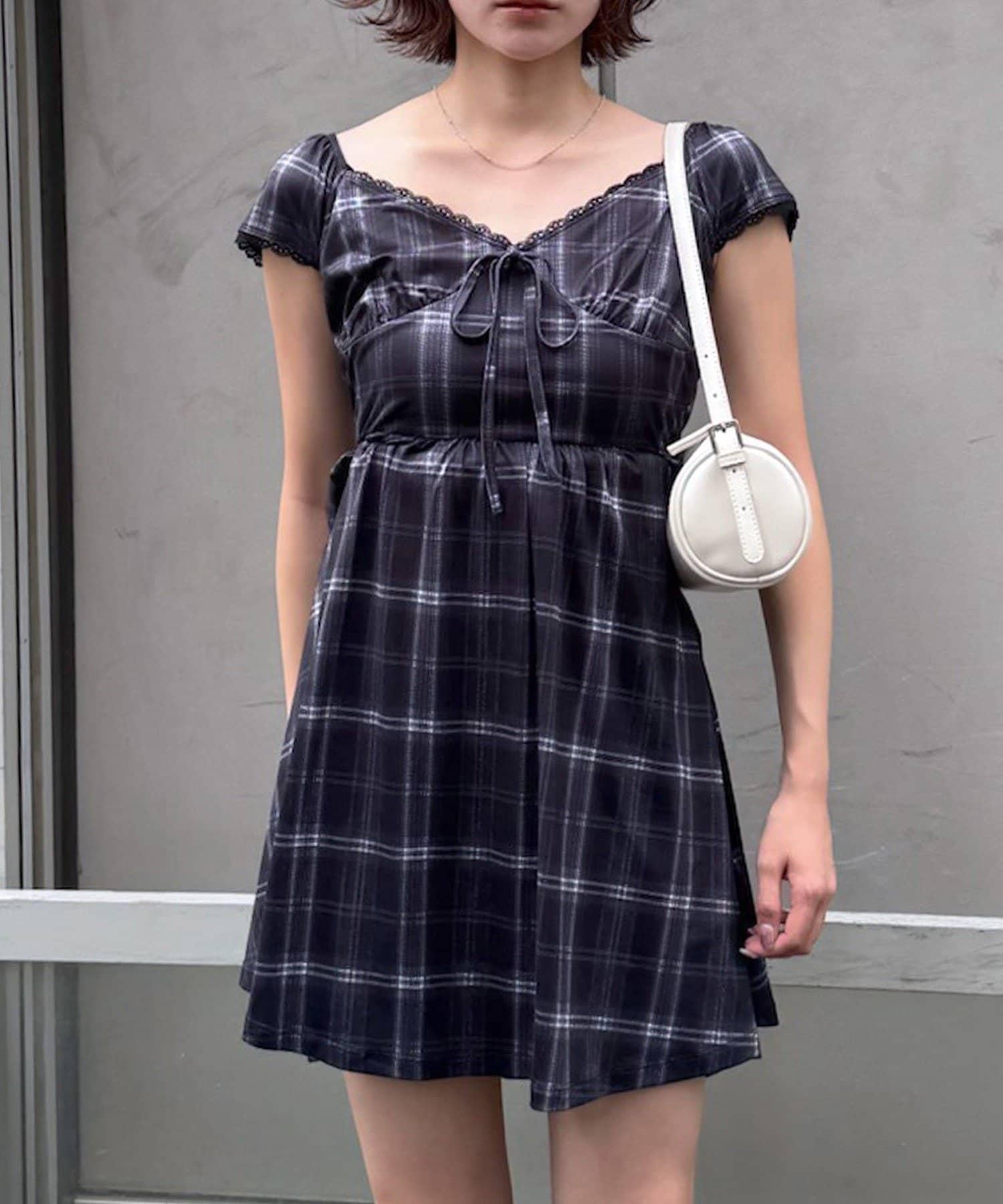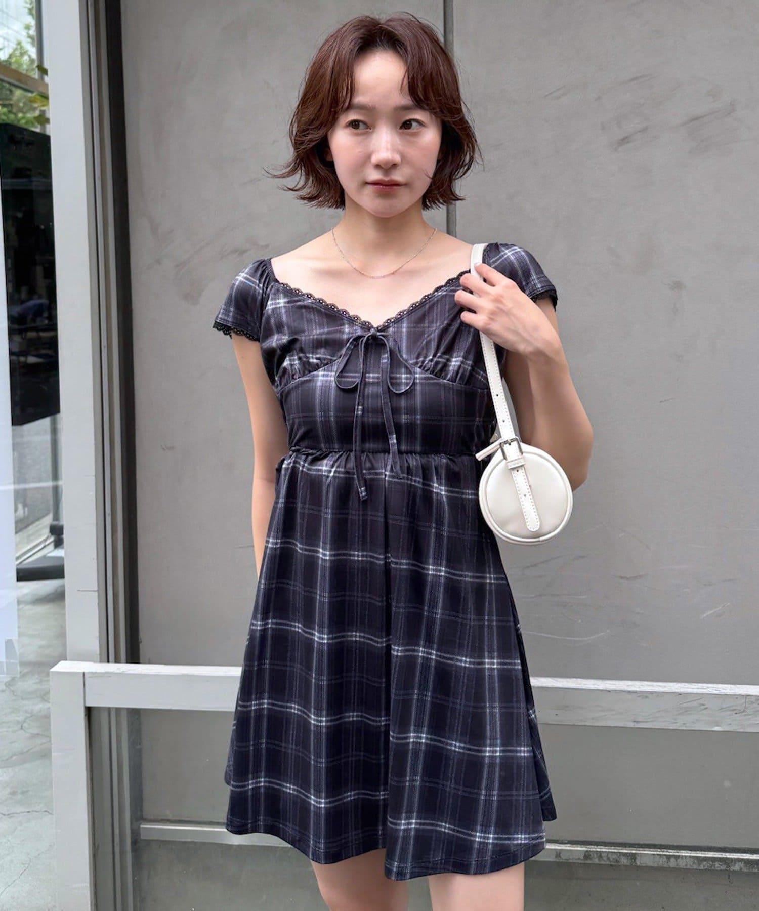 【mystic】[mline]透視格紋剪裁迷你連衣裙