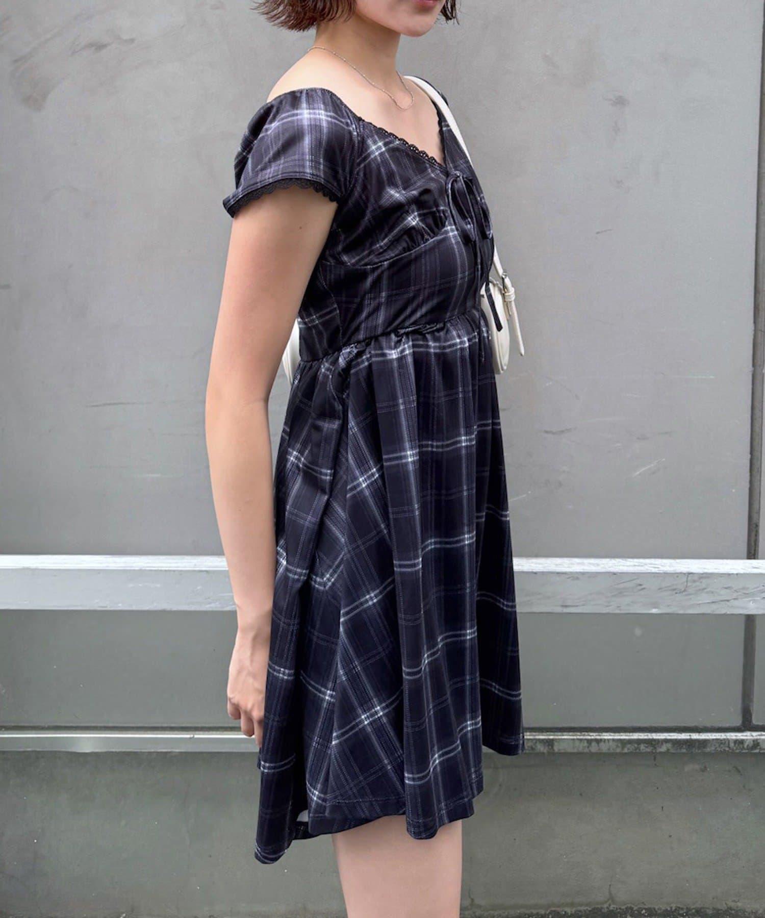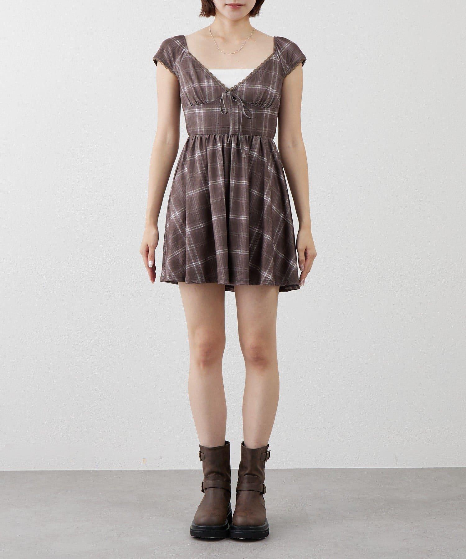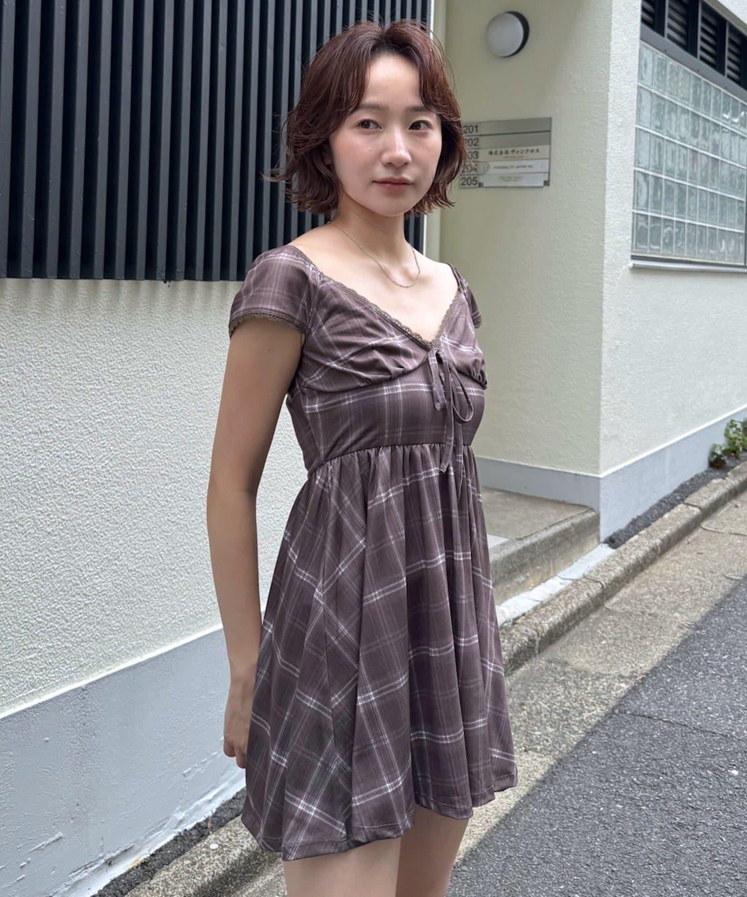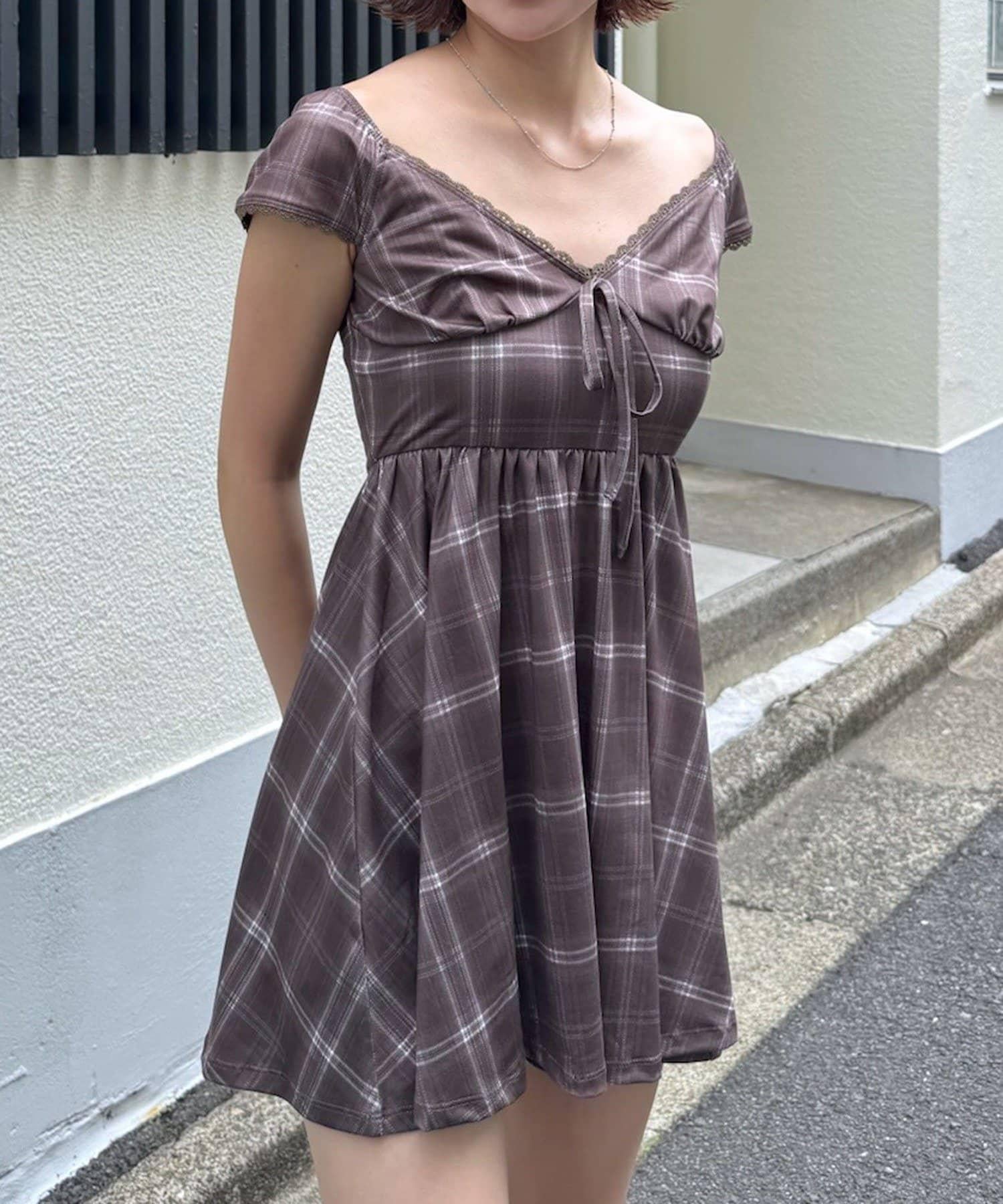 【mystic】[mline]透視格紋剪裁迷你連衣裙