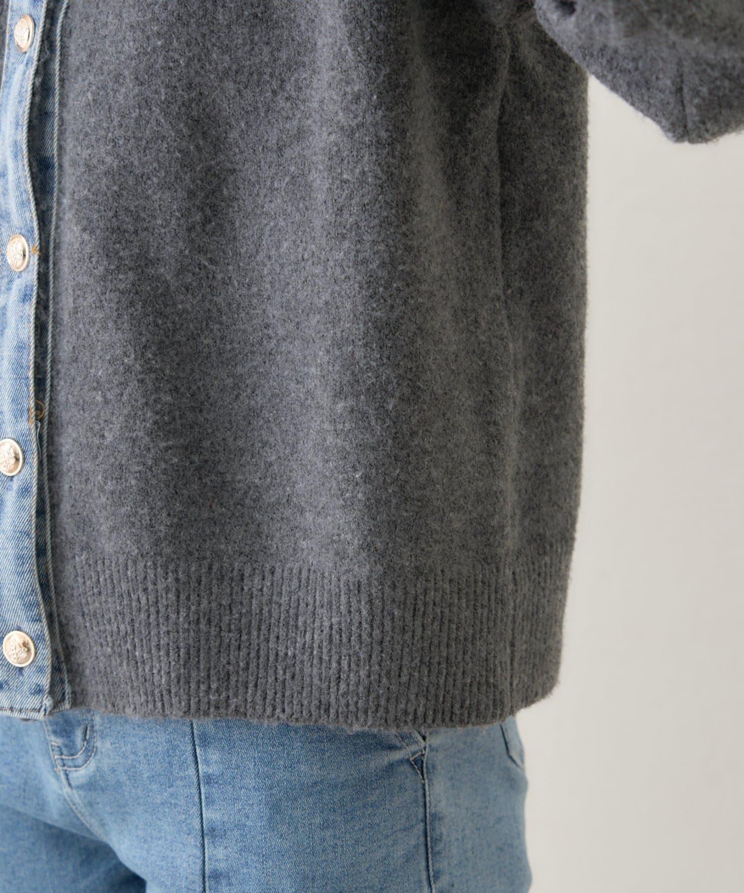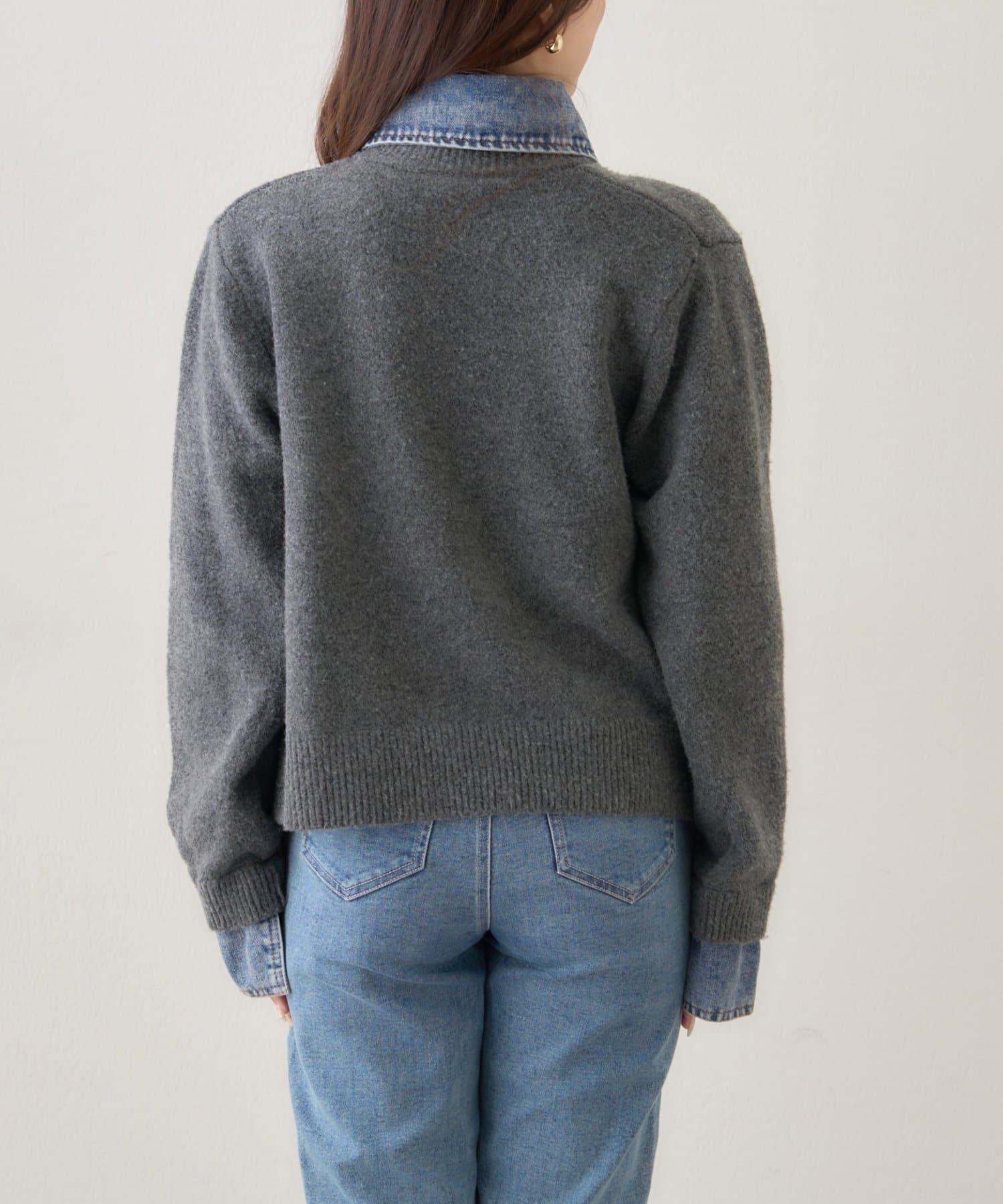 開襟羊毛衫與牛仔褲的對接設計。