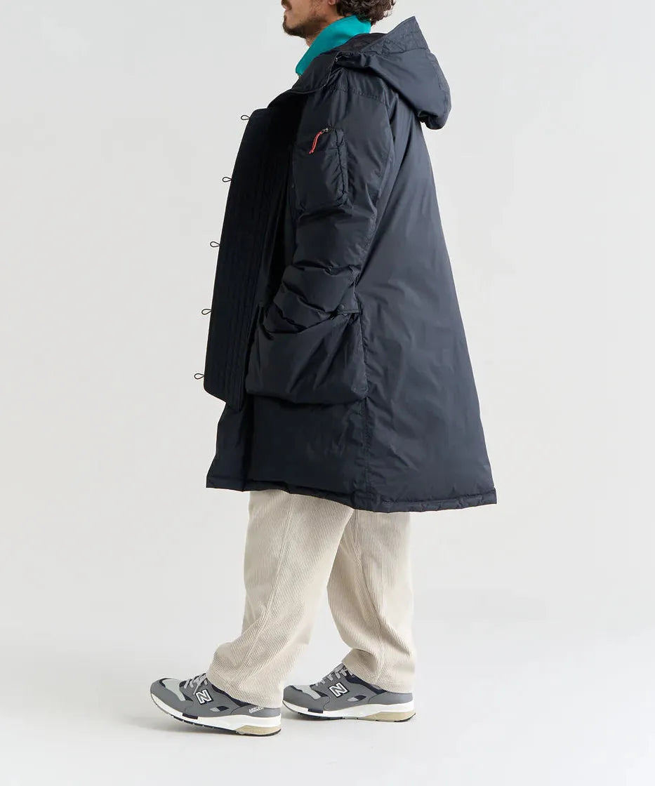 及膝野戰羽絨服,採用軍裝設計。它以美國空軍的 N-3B 型飛行夾克為藍本,使用了 NANGA 自產的 Auroratex® 防水透氣面料。它將堅固耐用的設計與真實的規格相結合,適用於從城鎮到戶外活動的各種用途。