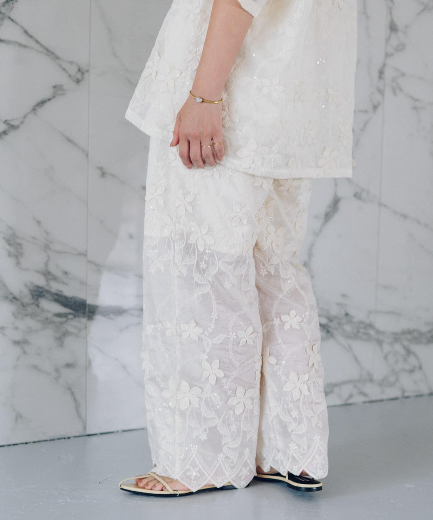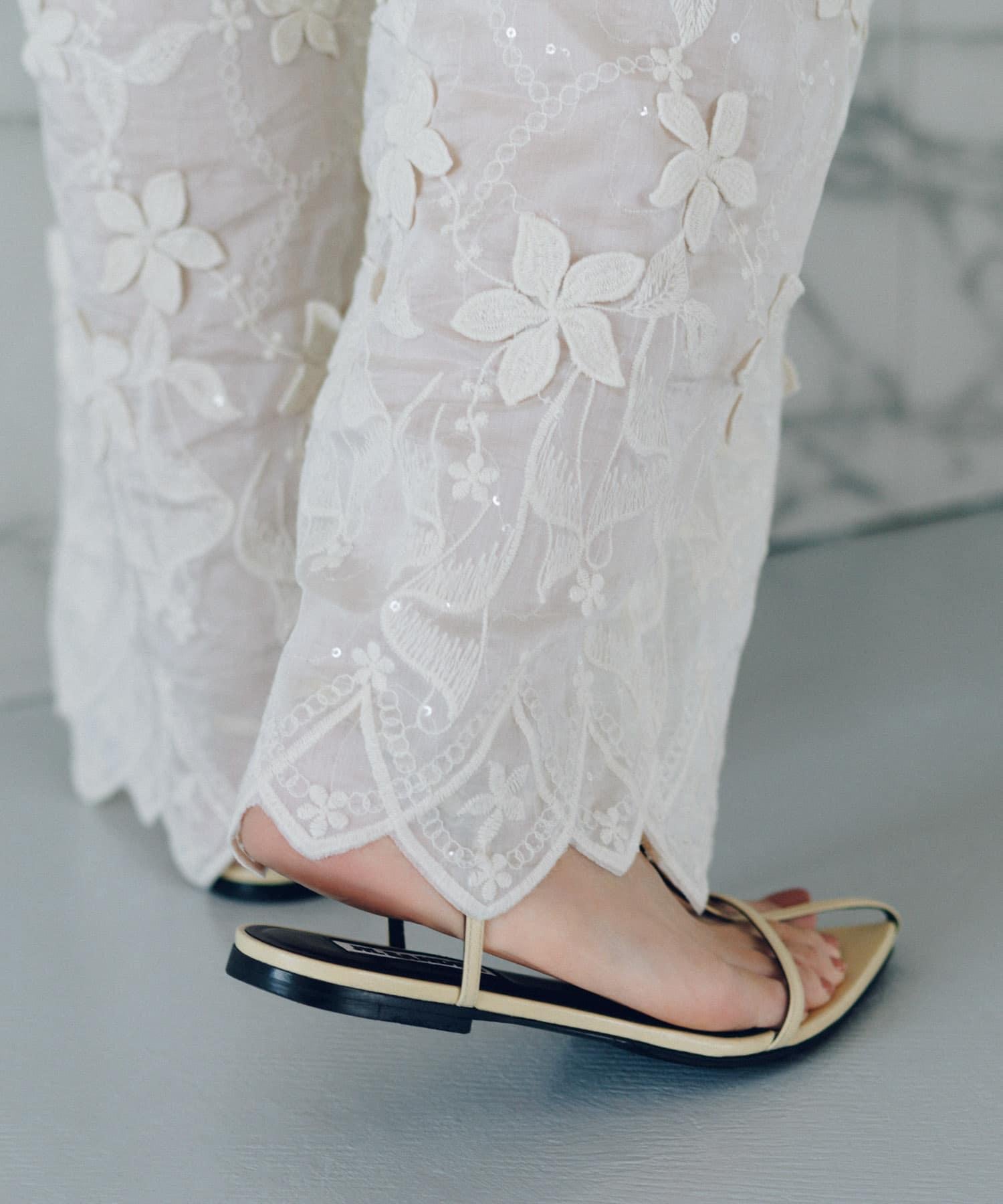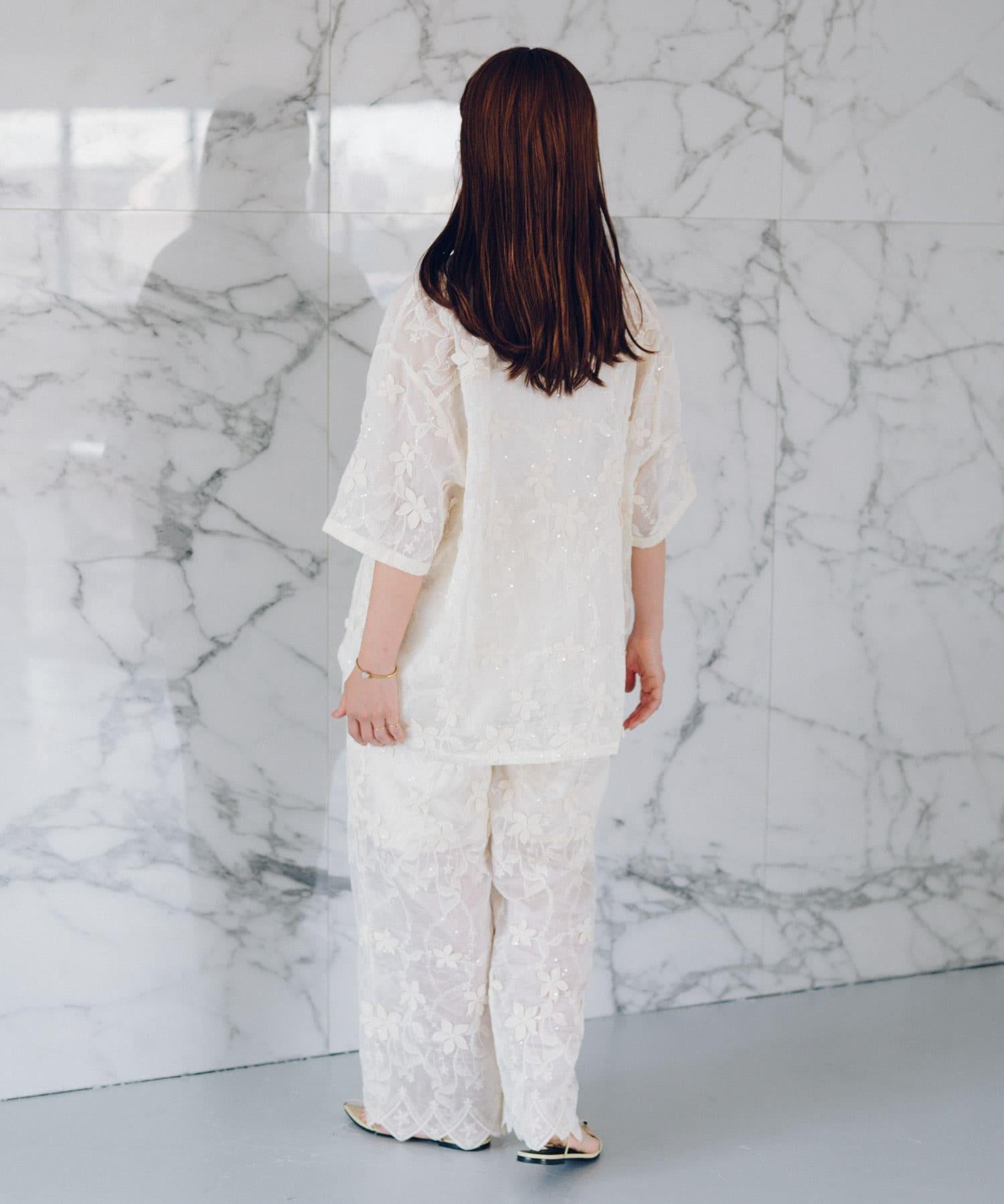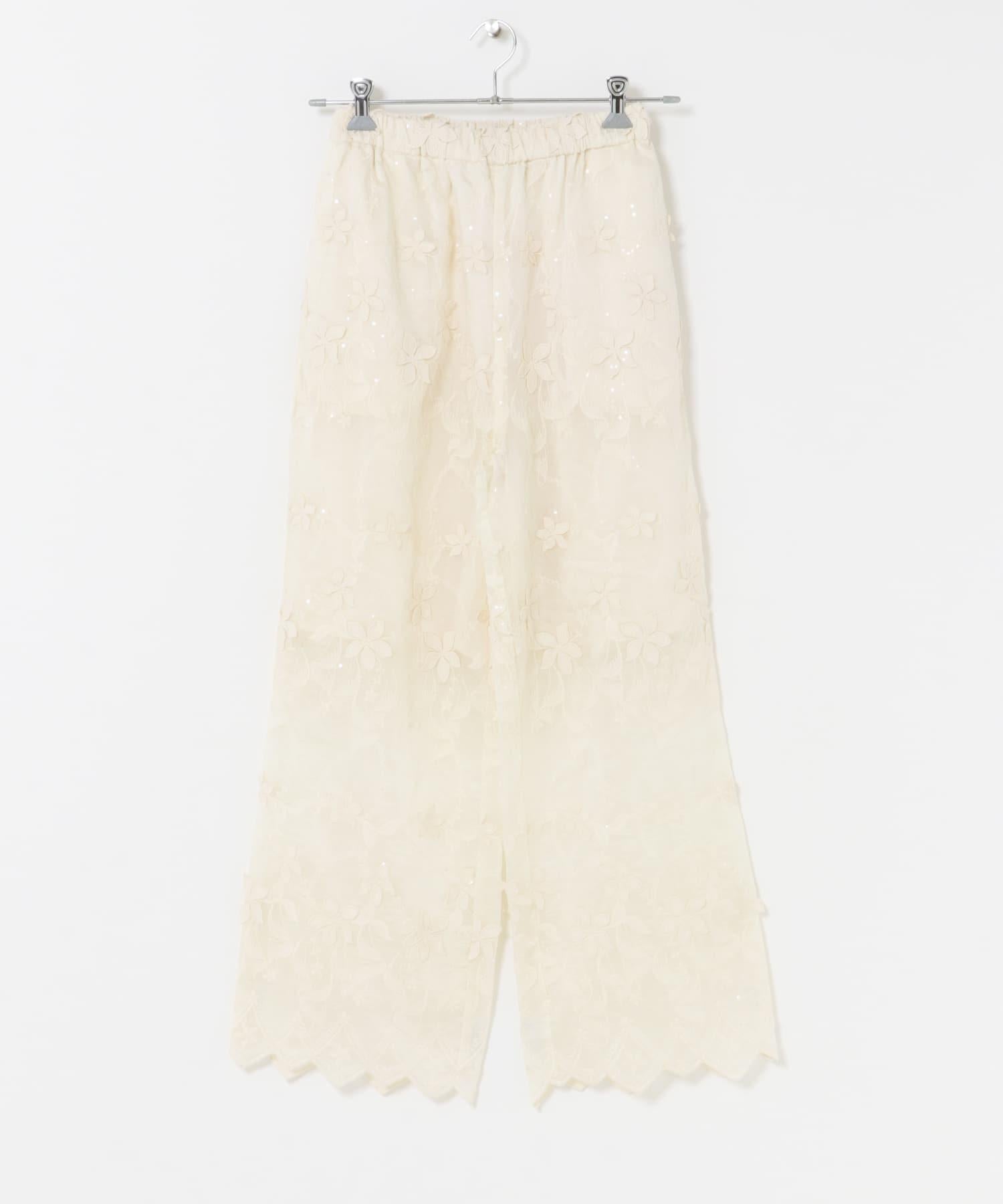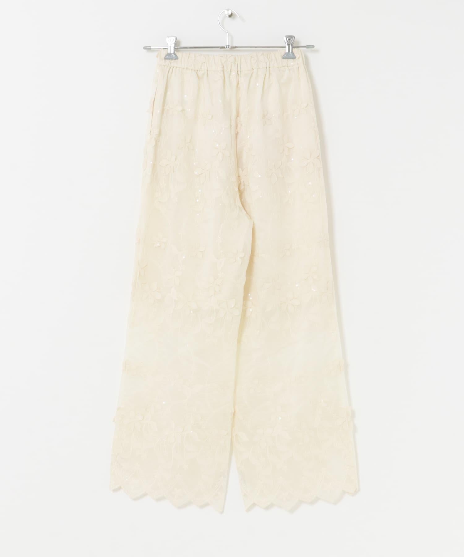 蕾絲面料的簡易長褲,配以精緻的亮片刺繡,復古感十足。