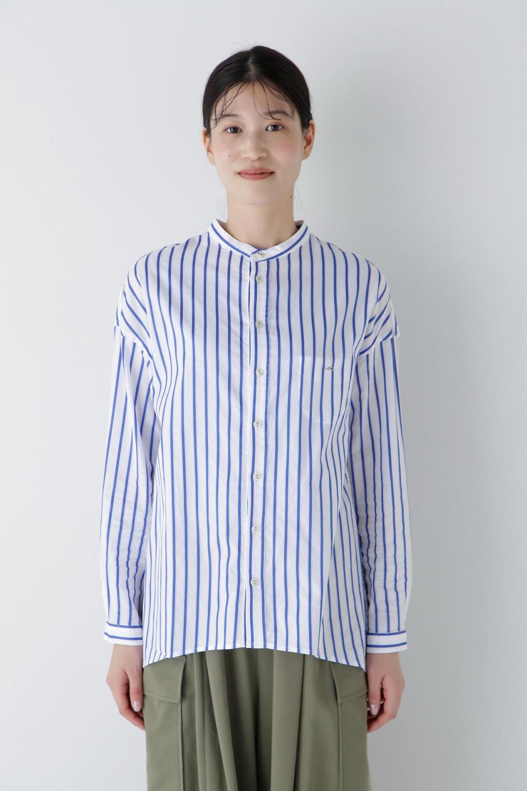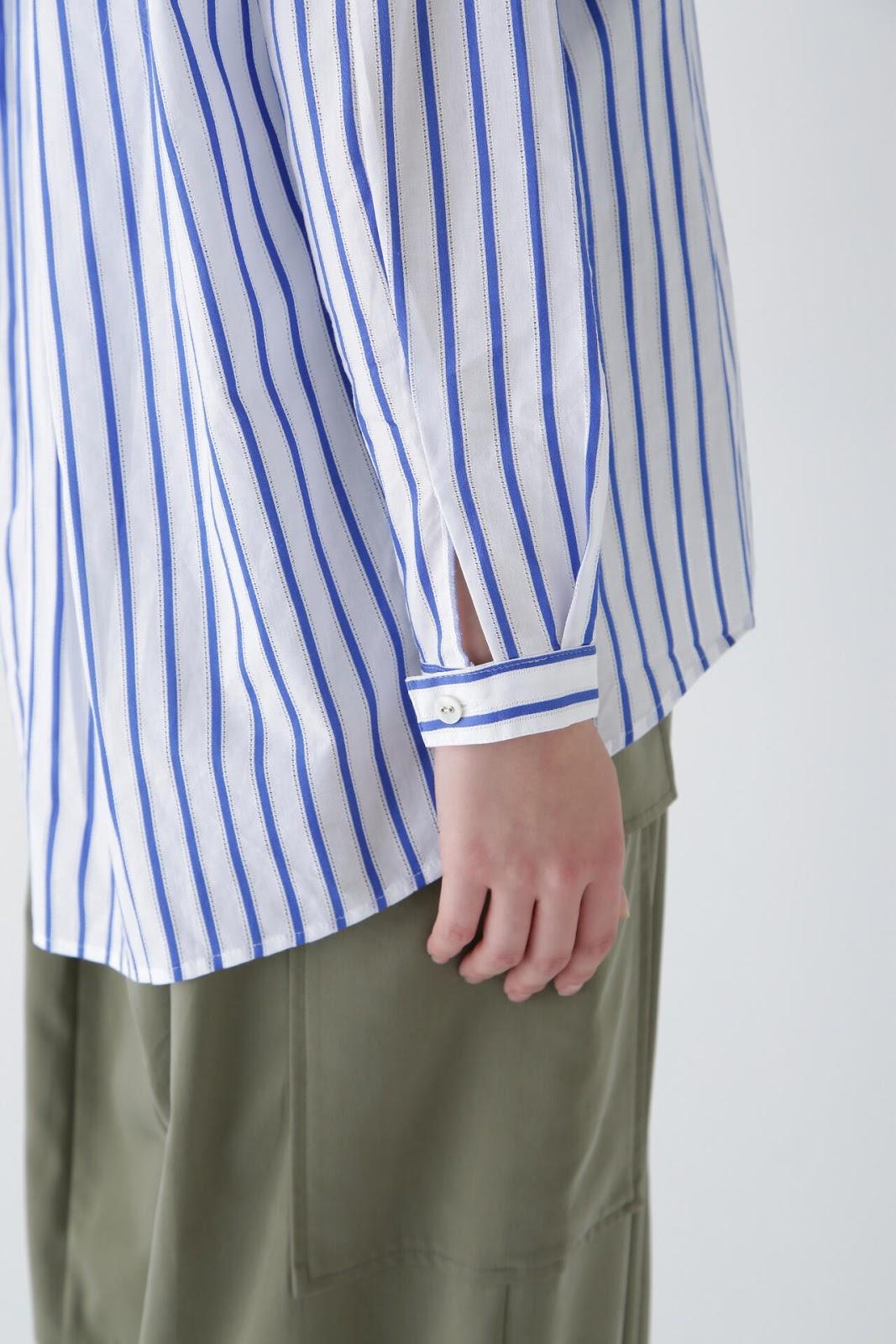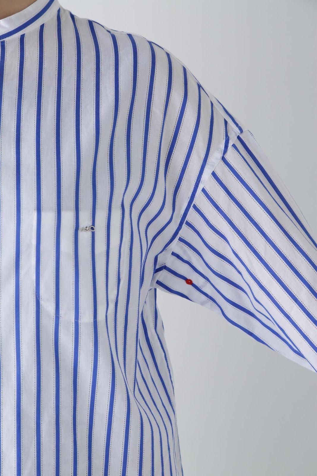 該設計採用罩衫(A 字形)廓形,除了刻意下垂的肩部外,後背還採用了雙襉設計,具有體積感。前短後長的功能性設計適用於運動裝,胸前的口袋為內袋規格,紐扣是可以用別針拆卸的👍紐扣。帶有度假風情的條紋襯衫非常適合在海邊穿著。條紋圖案採用 100%純棉面料,兩側有細孔。適合春夏穿著的面料,透氣性好,穿著涼爽。natic] na = 海軍,t = 技術,i = 創新,c = 合作。