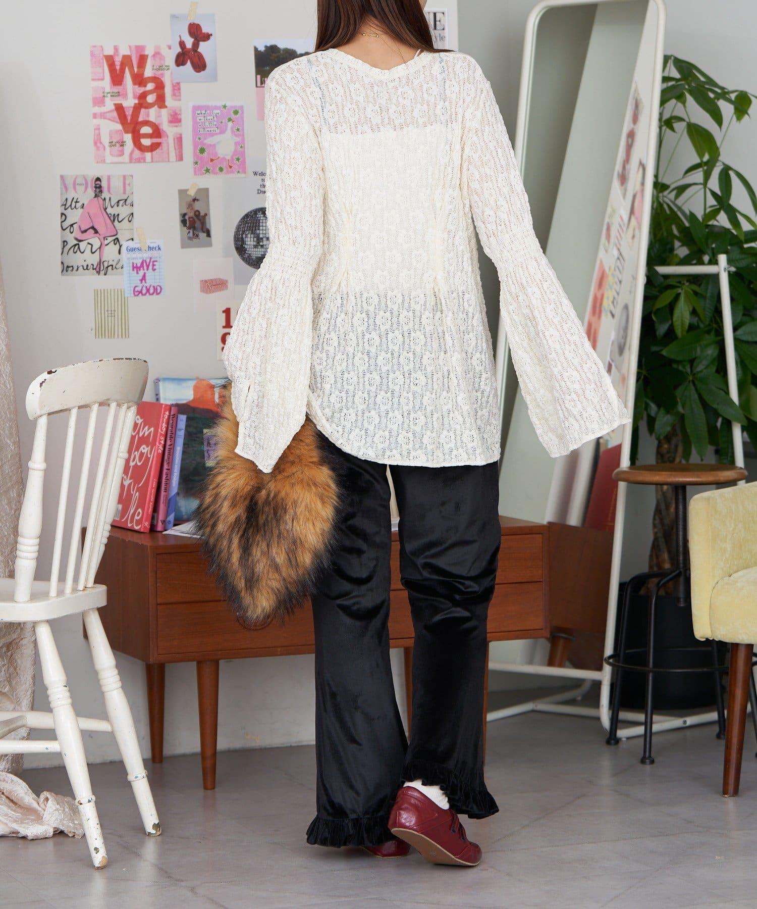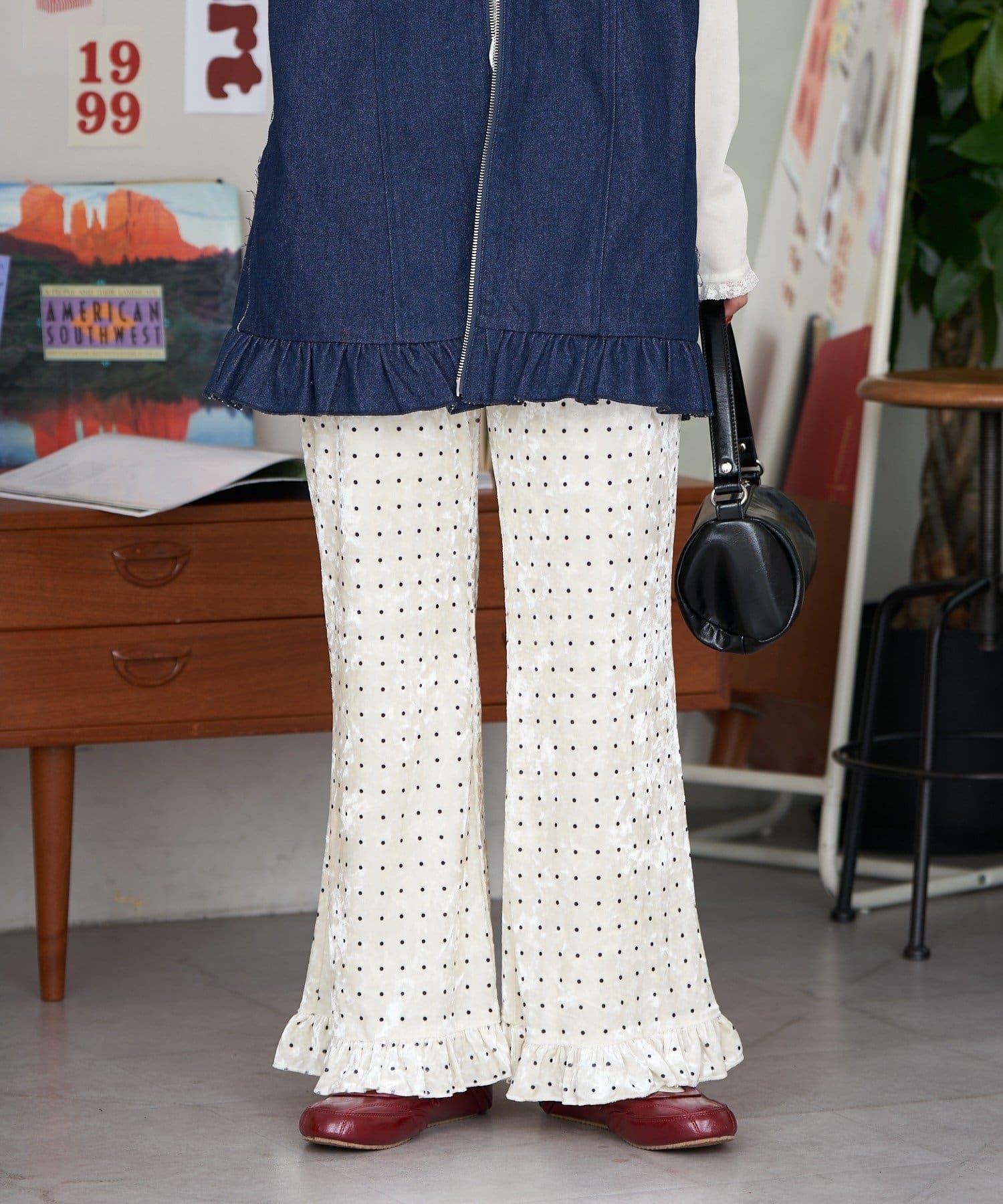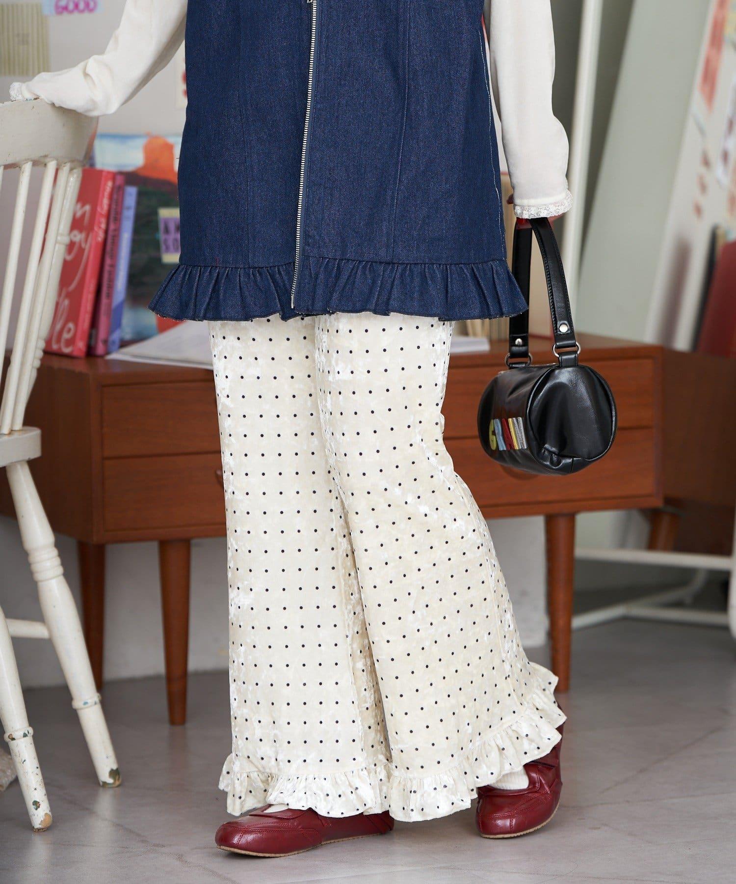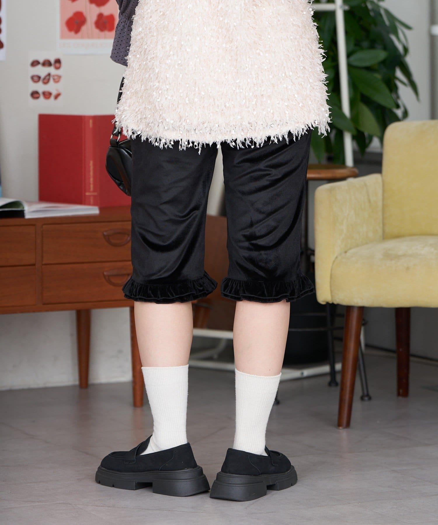 天鵝絨長褲下襬的褶邊設計為您的搭配增添了當季的少女情懷。