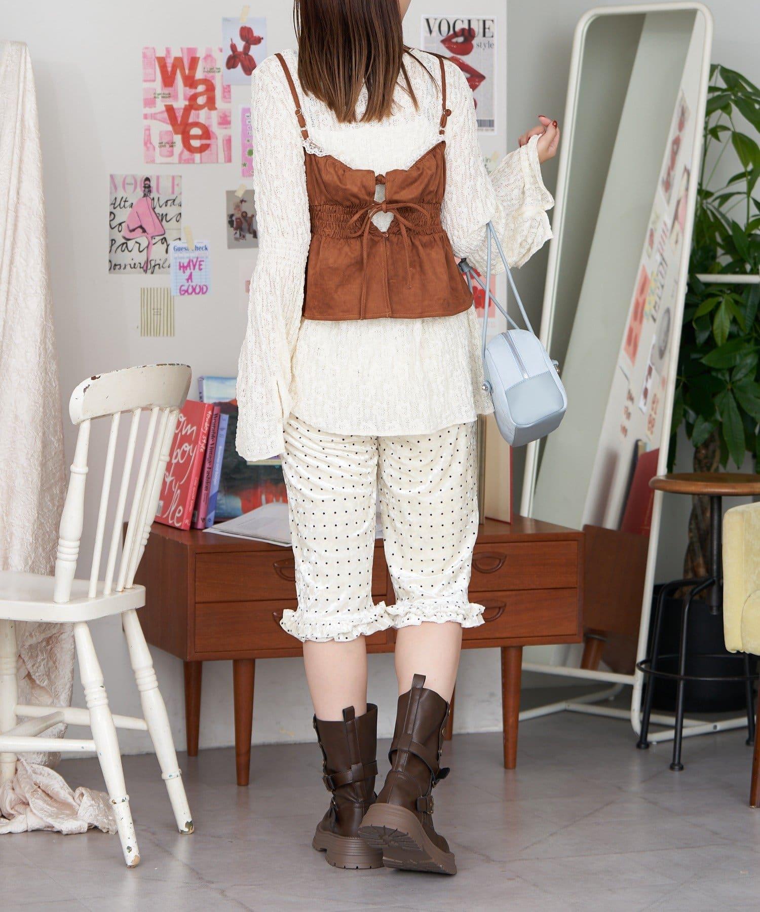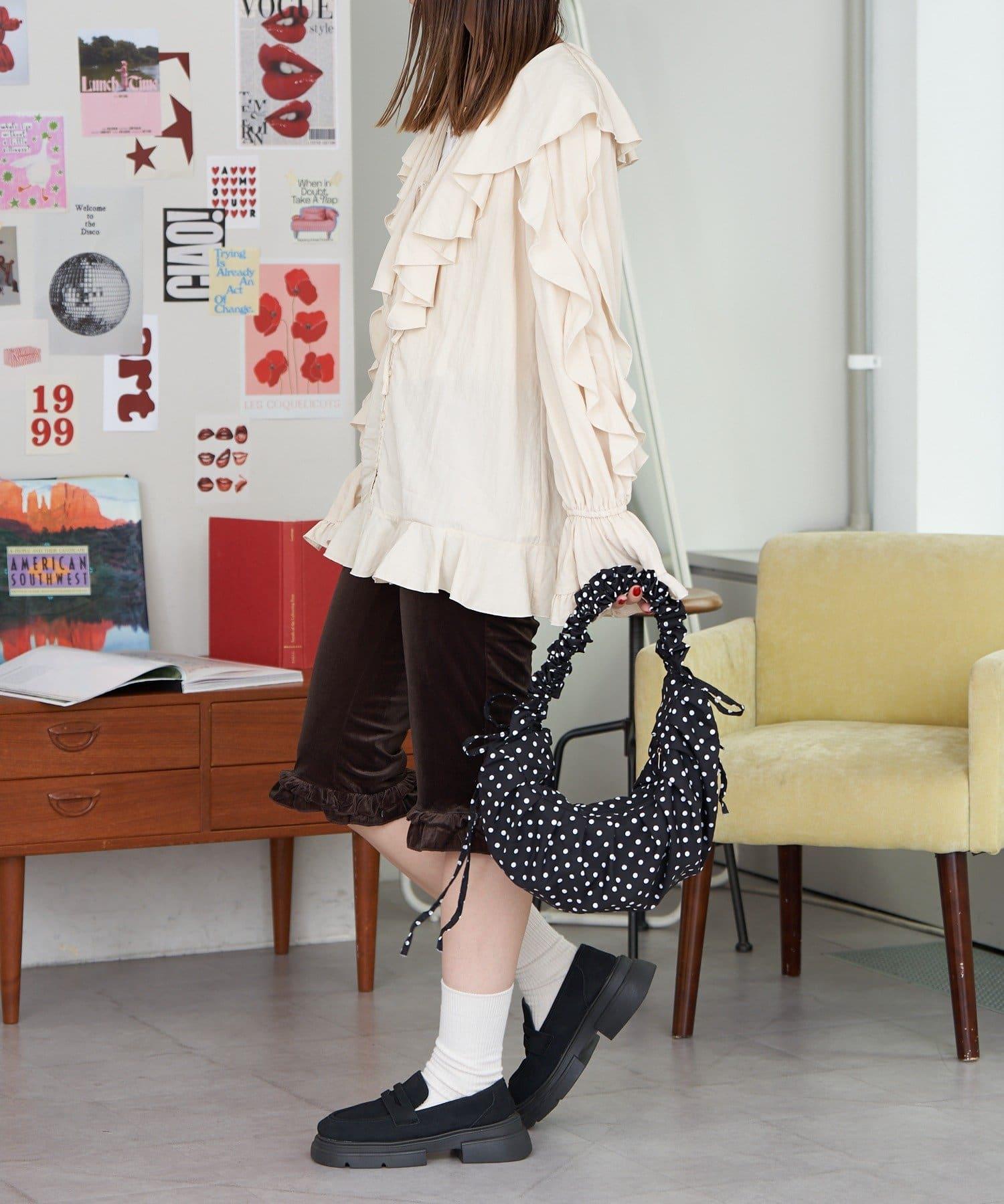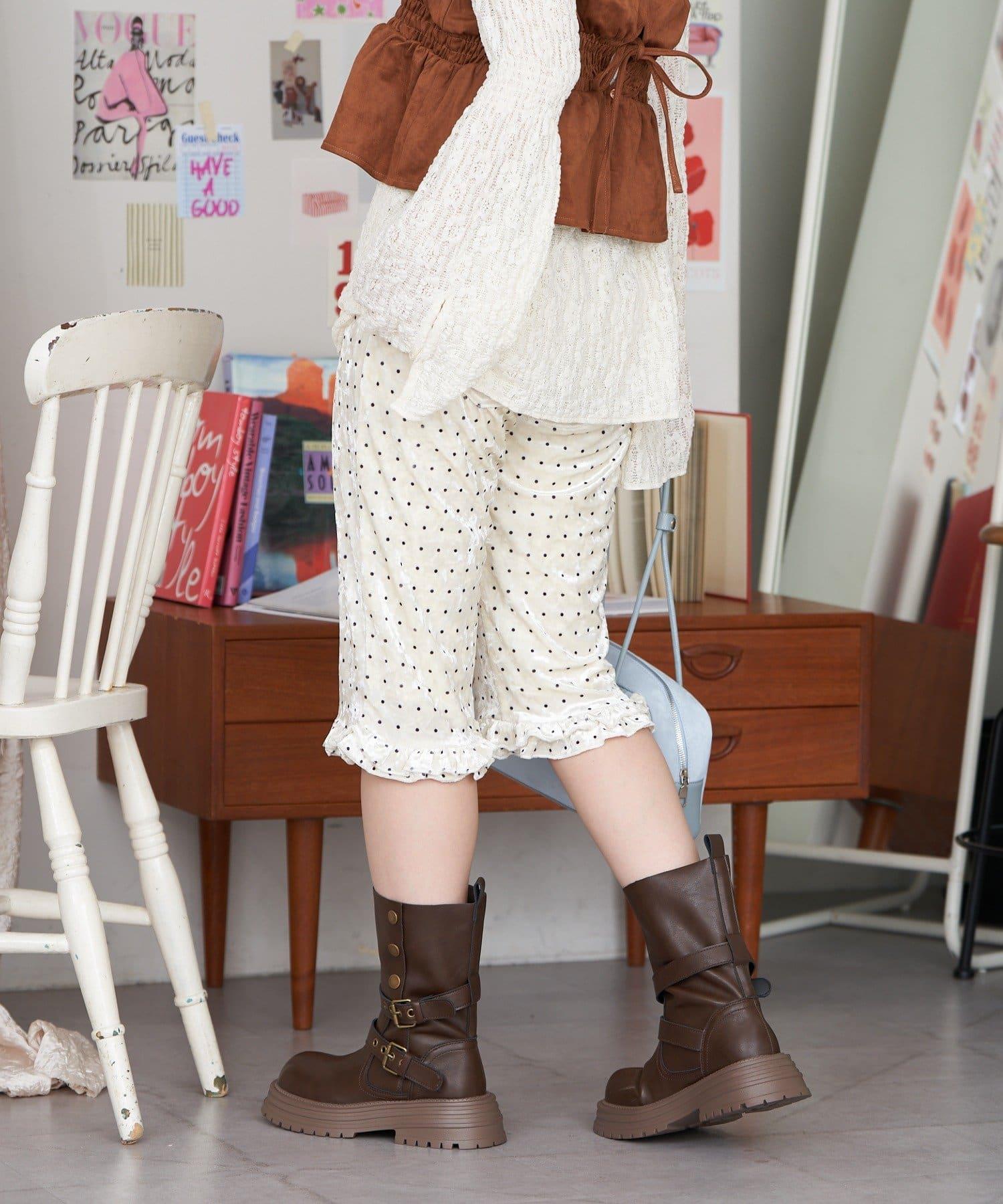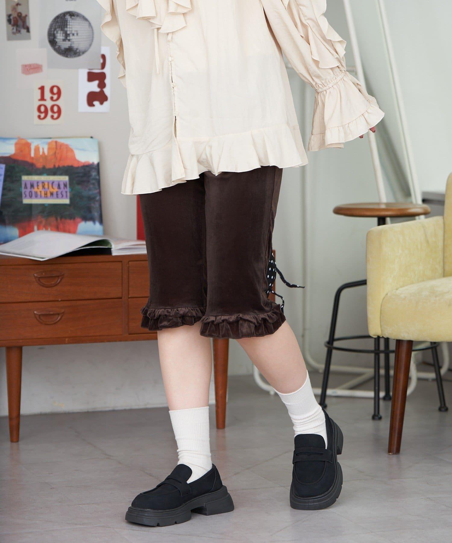 天鵝絨長褲下襬的褶邊設計為您的搭配增添了當季的少女情懷。