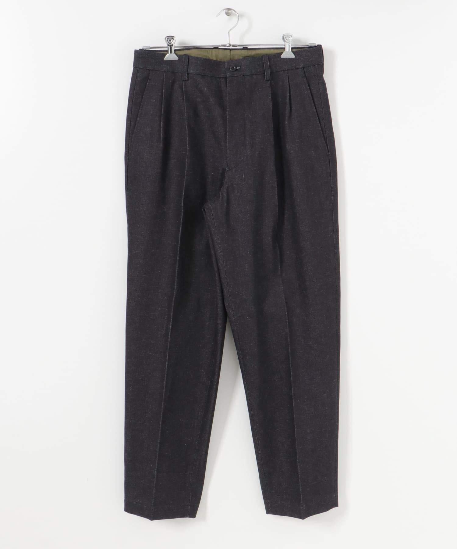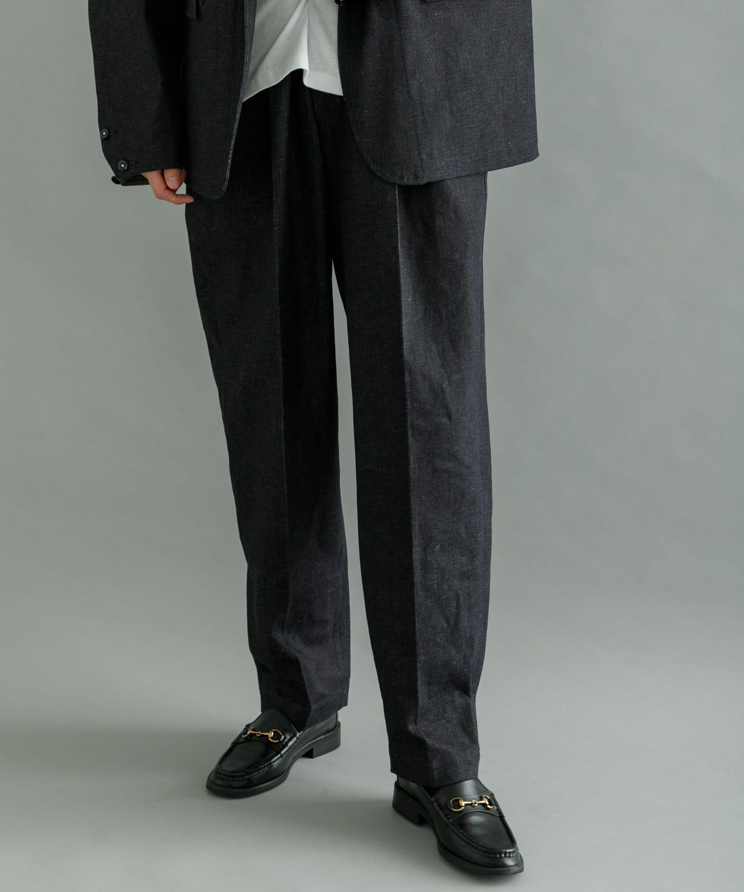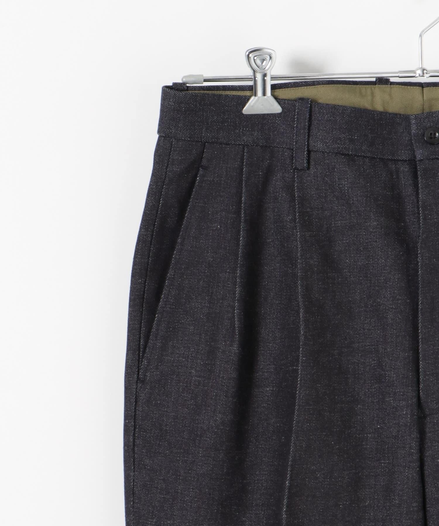 長褲以 SCYE 的標準雙襉長褲為基礎,採用中褶設計,更顯時尚,而腰部襯裡和口袋袋則採用了已成為 NEXUSVII 標誌的 O.D 色人字紋面料。腰部背面和口袋袋等採用標誌性的 NEXUSVII.