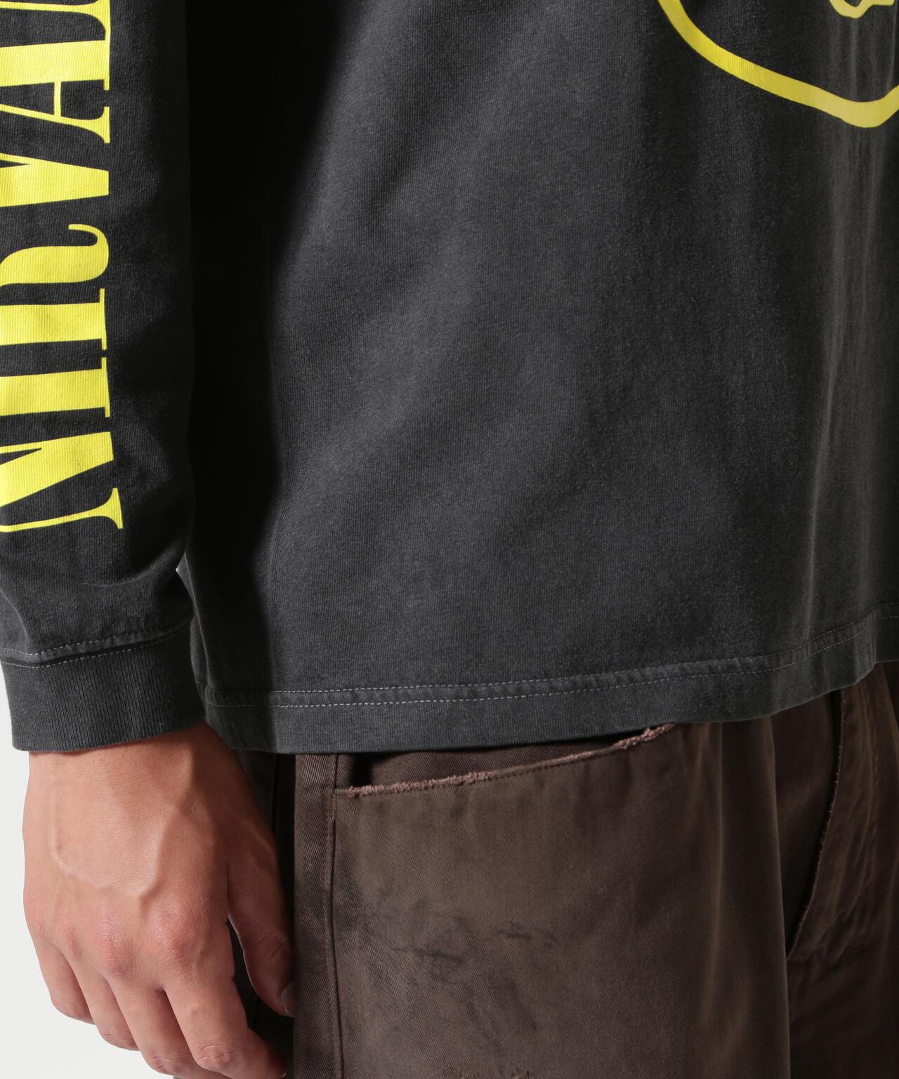 NIRVANA / NIRVANA / SMILE L/S TEE / Collaboration Long T《男/女/中性》備受歡迎的 NIRVANA T 恤合作款👍上市!NIRVANA長袖T恤。此款T恤正面印有笑臉和樂隊徽標,袖子上印有 "NIRVANA "圖案。該商品在加工後進行了 "顏料染色"(色素染色),使其看起來像舊貨。這是 MANASTASH 獨有的特別設計。