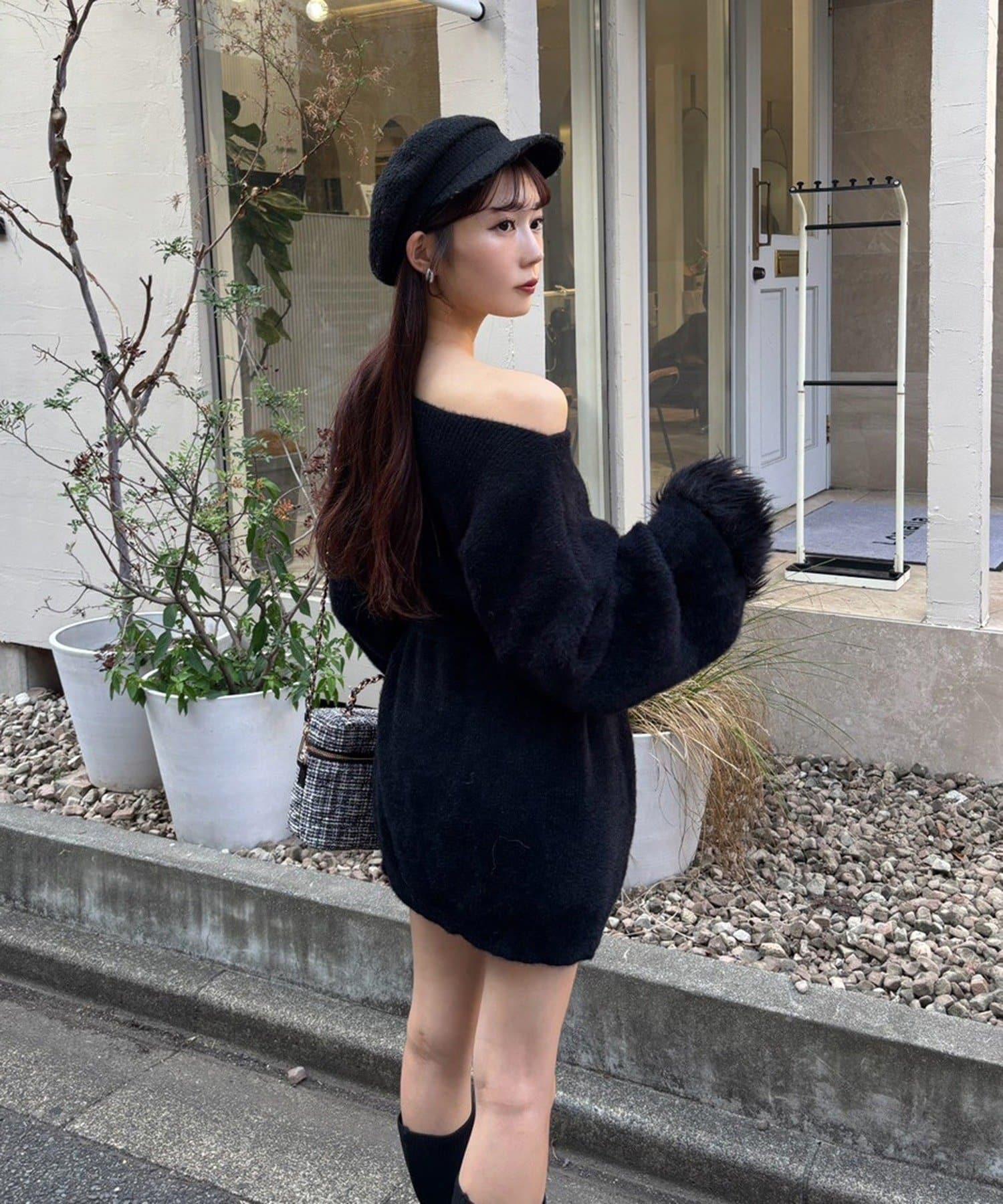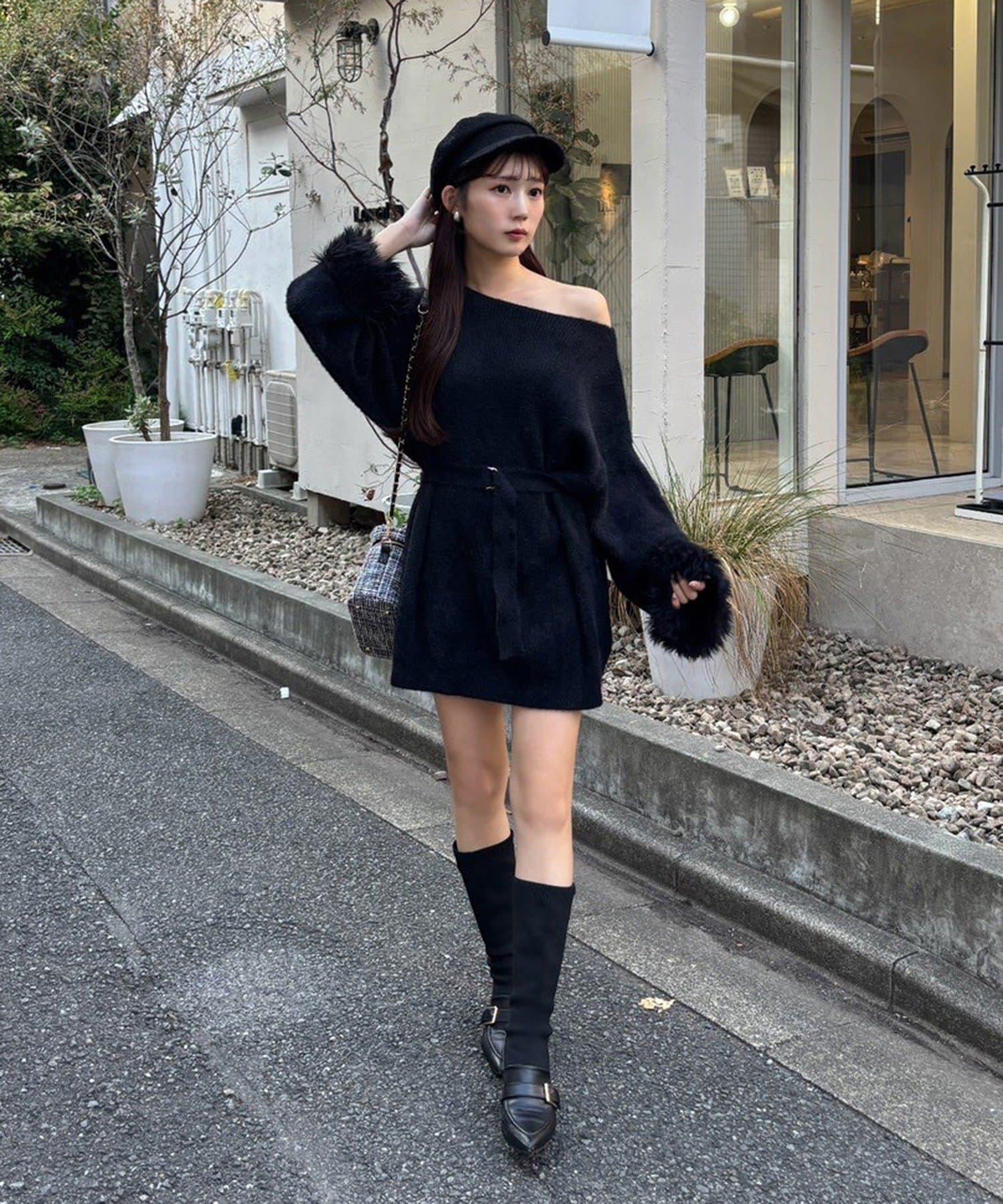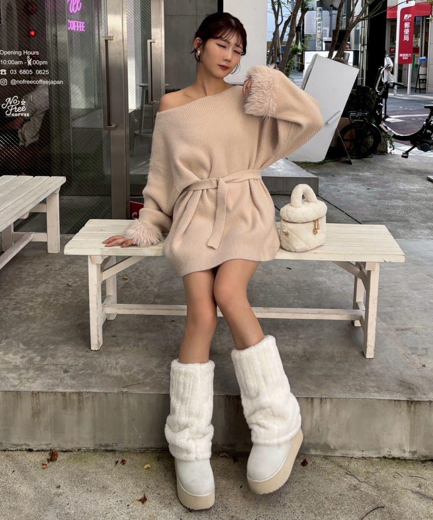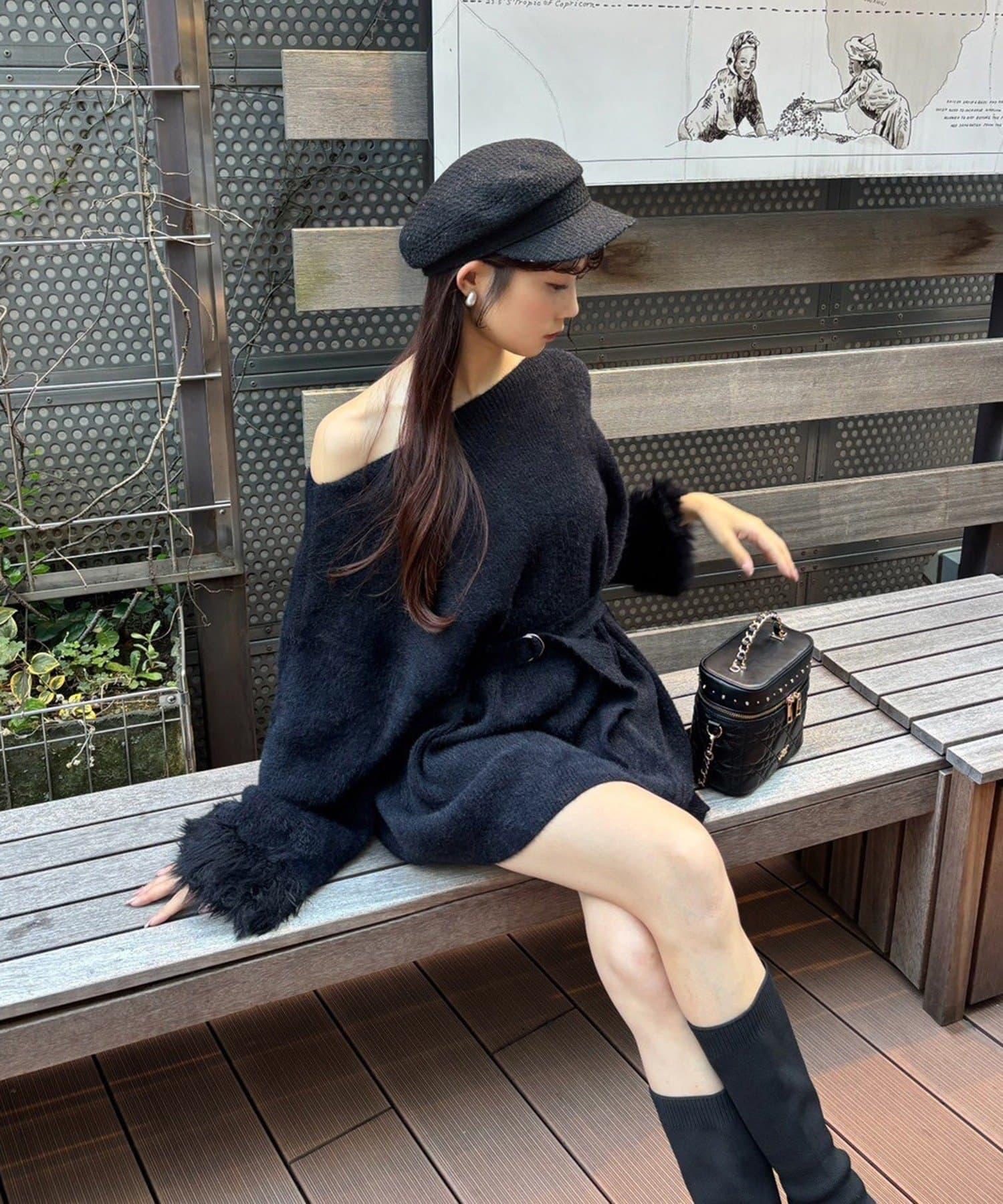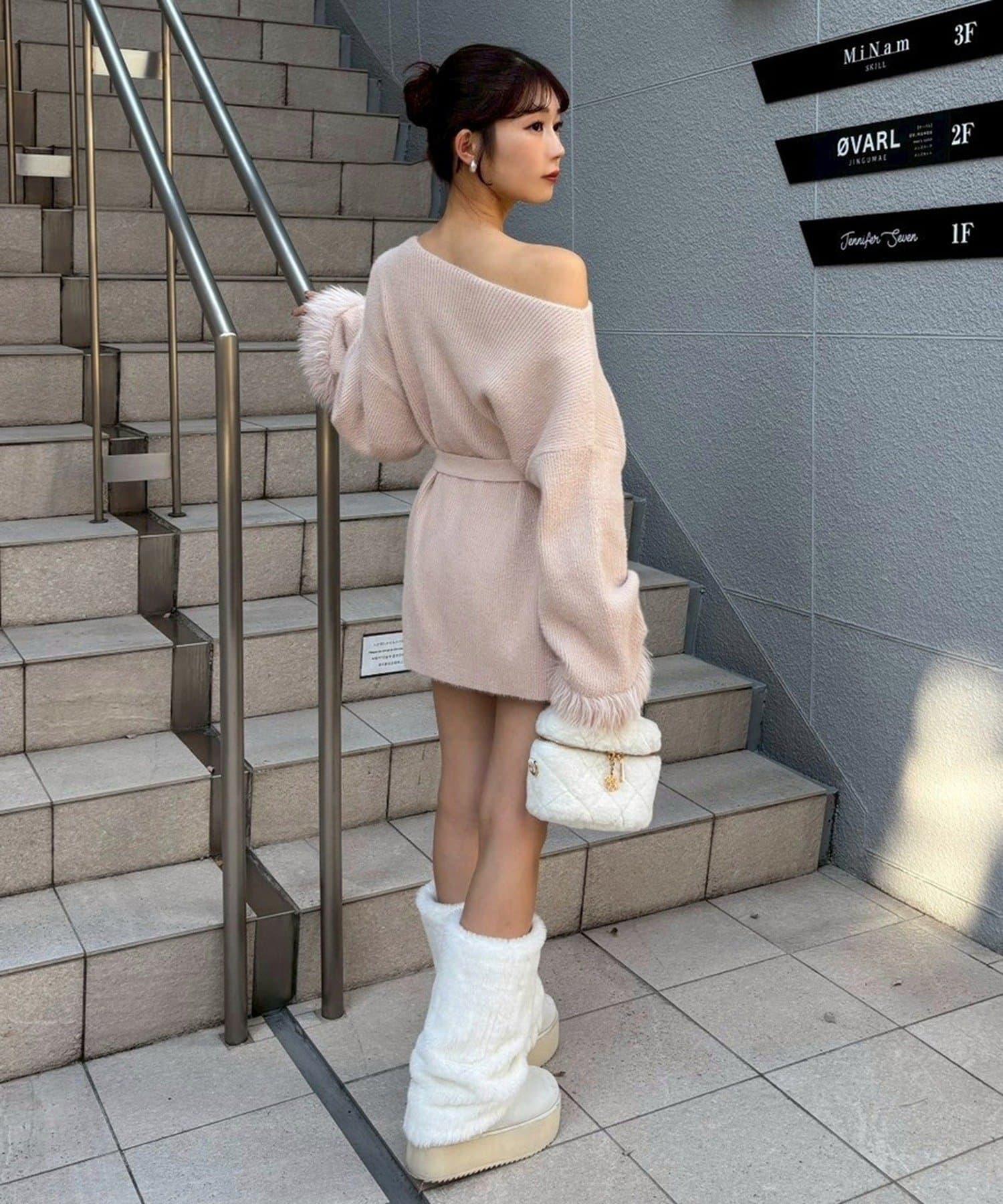 蓬鬆的皮草增強了這款針織連身裙的季節感。
