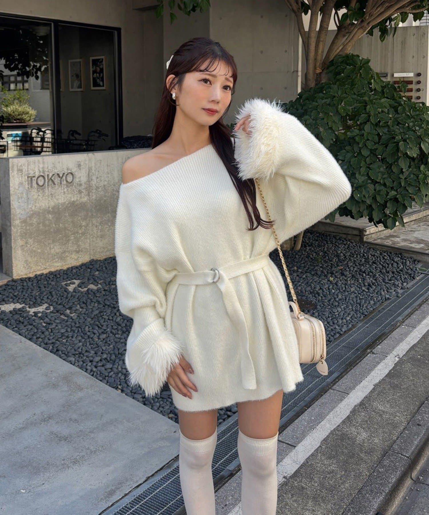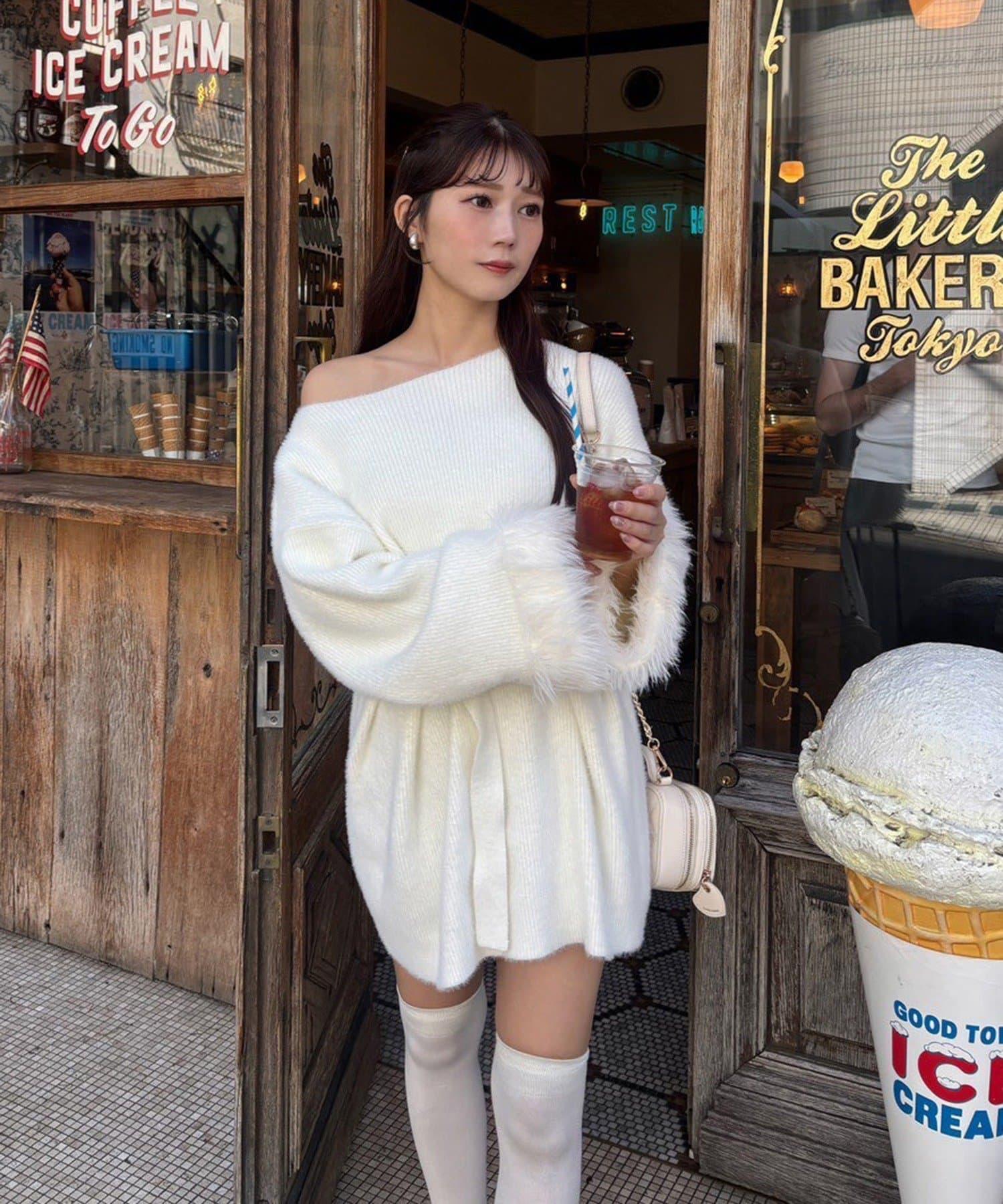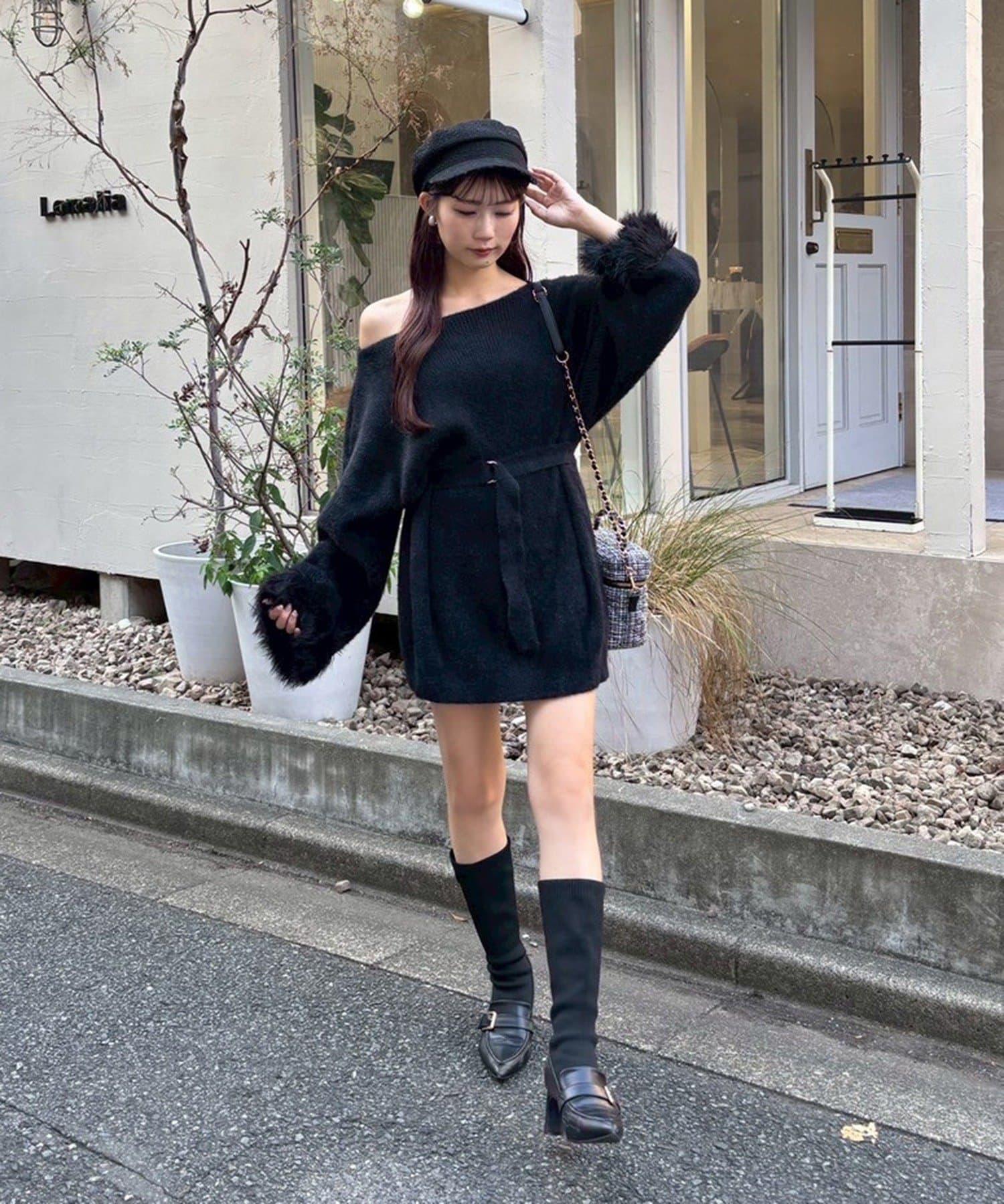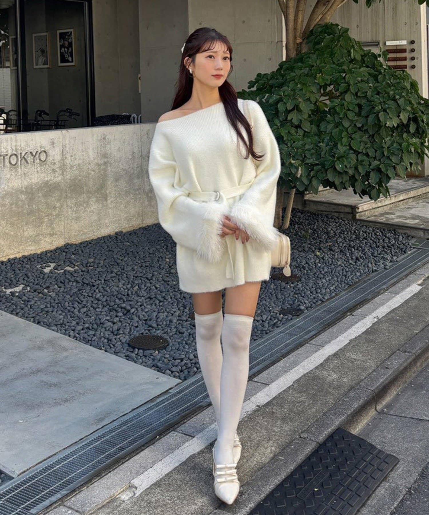 蓬鬆的皮草增強了這款針織連身裙的季節感。