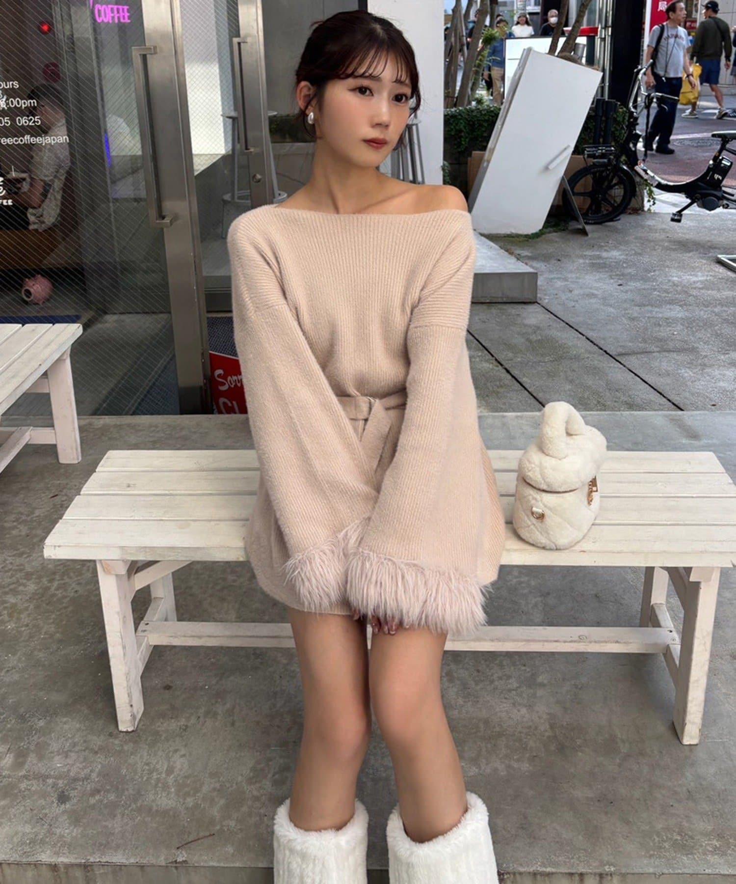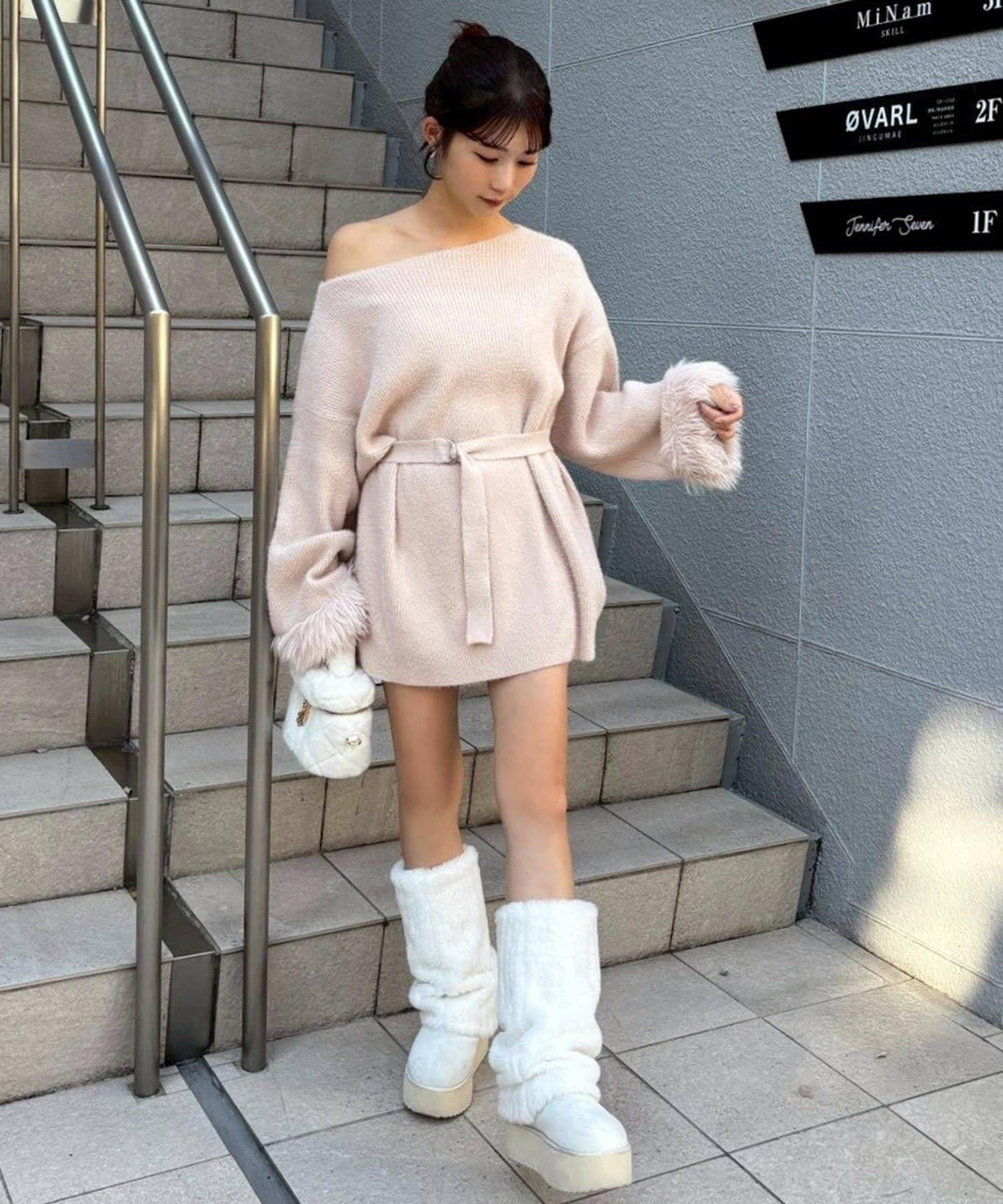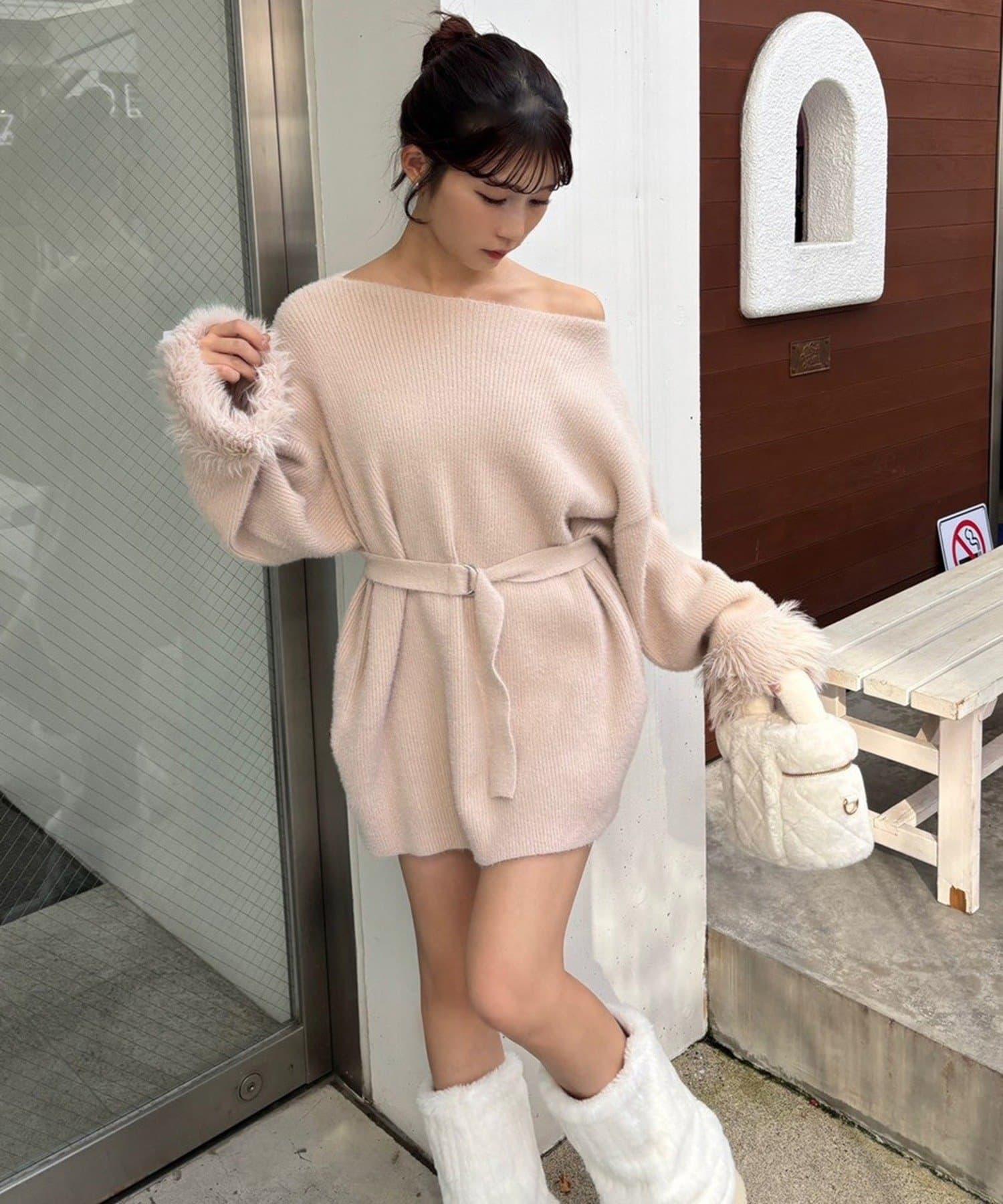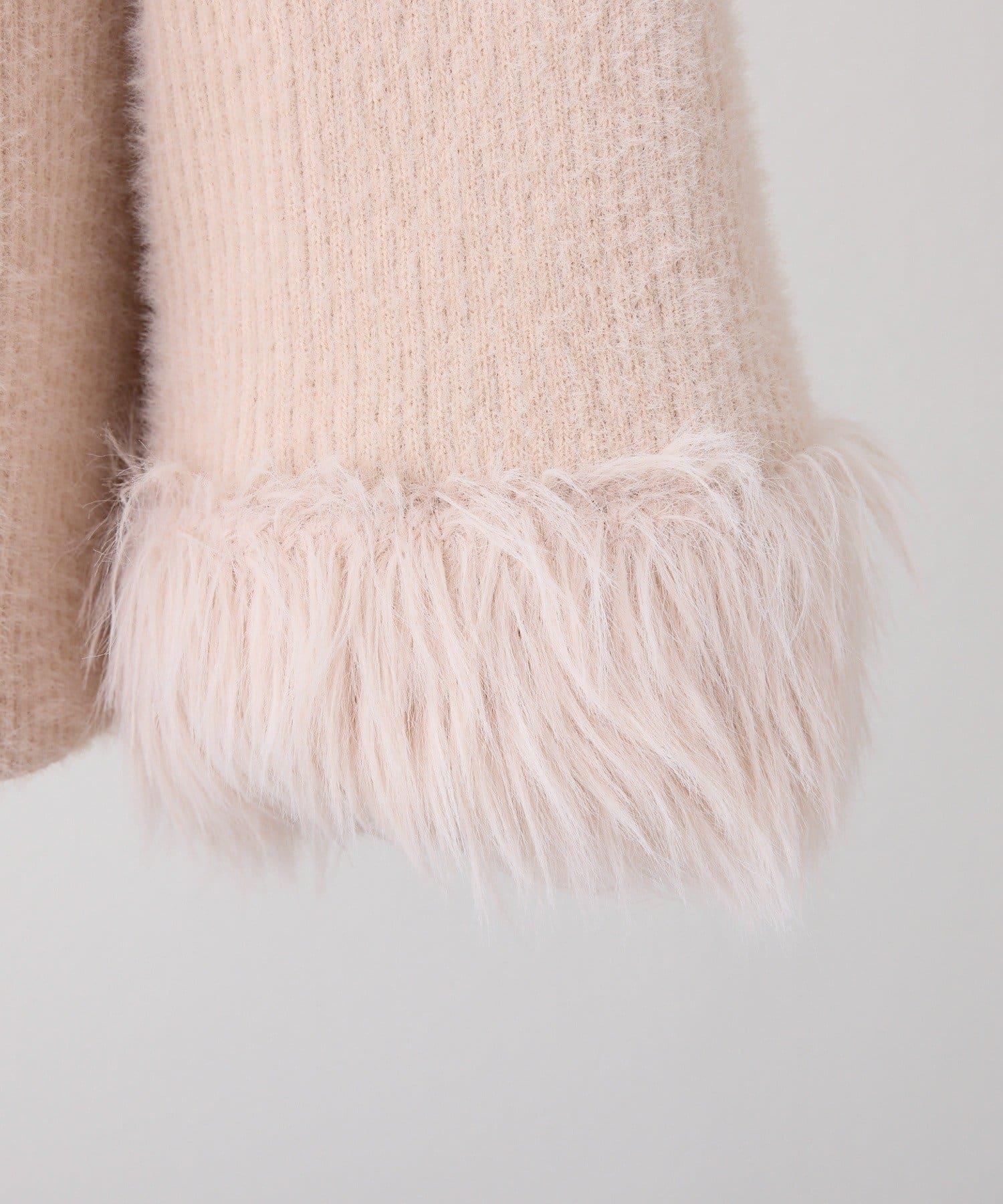 迷你針織連衣裙,袖口有蓬鬆的毛皮。