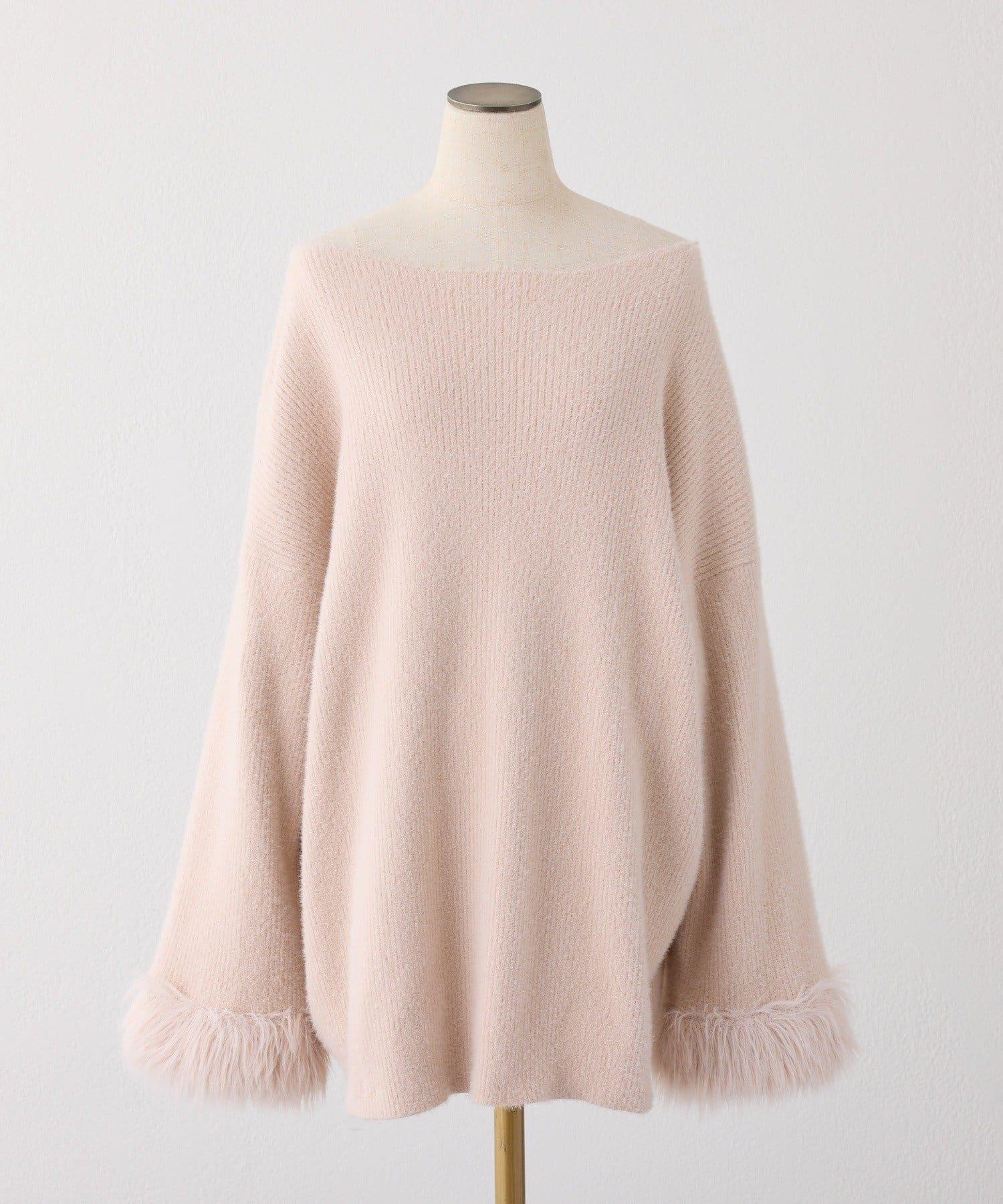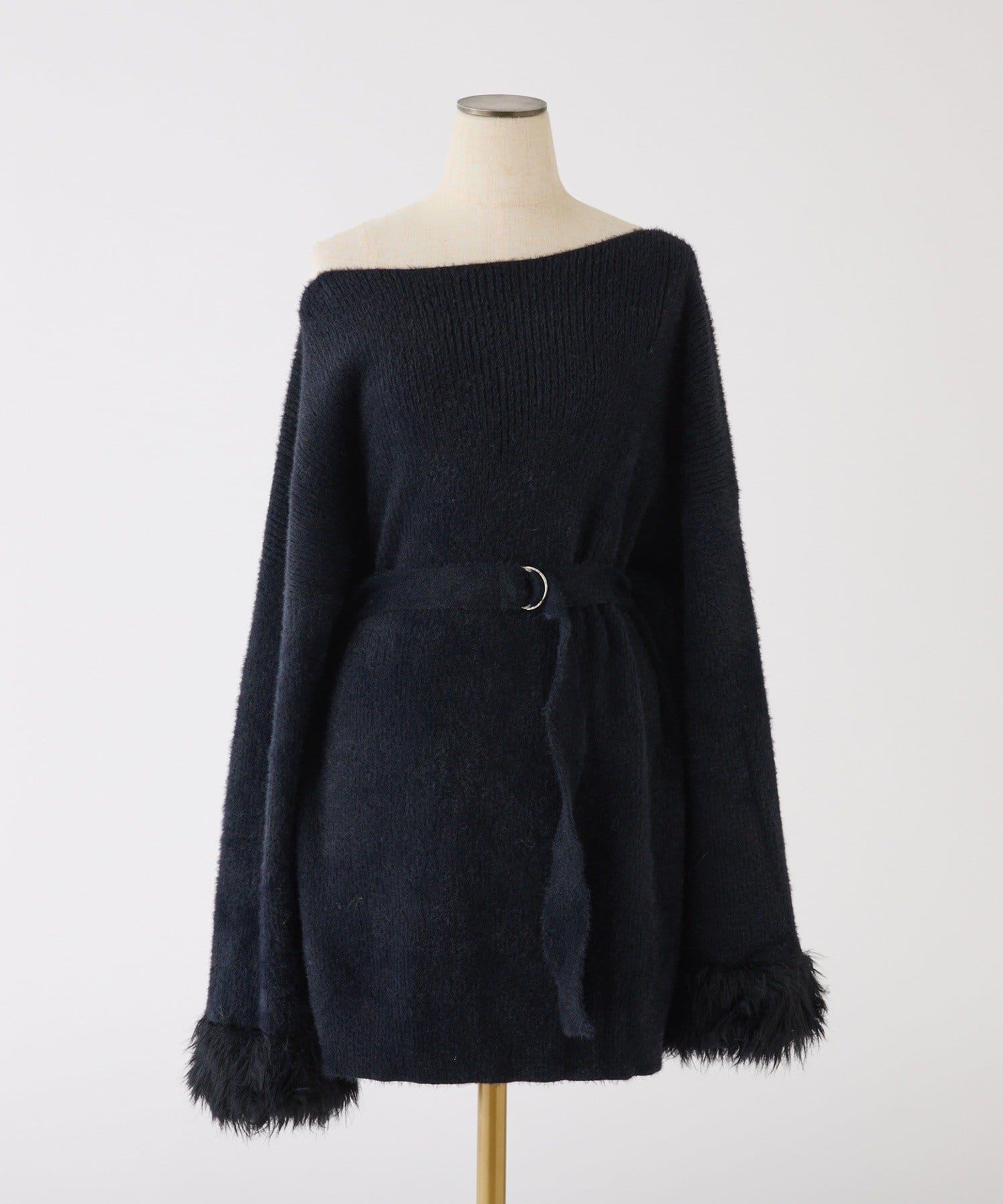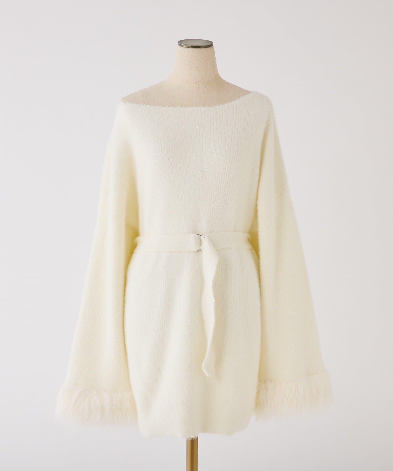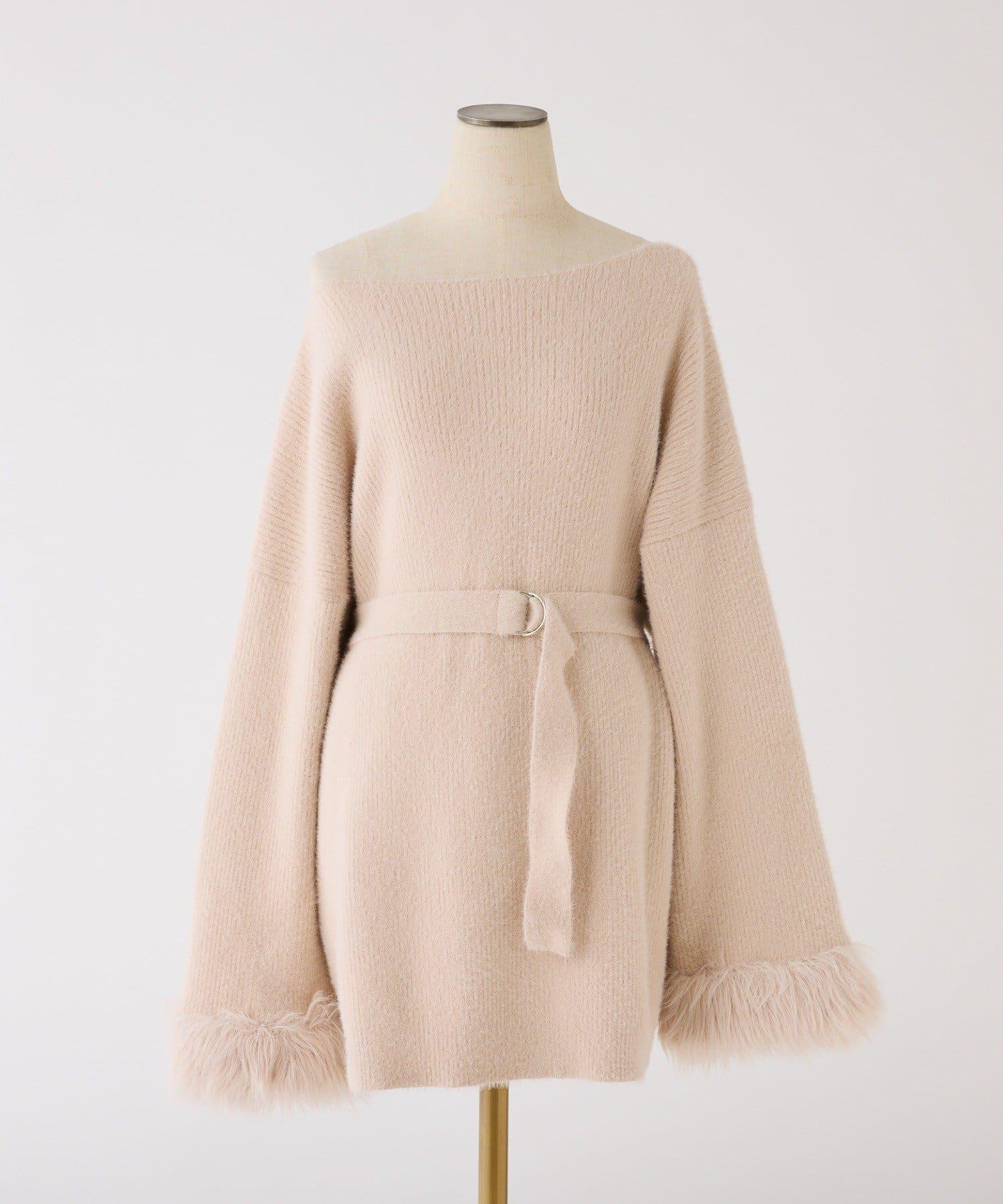 迷你針織連衣裙,袖口有蓬鬆的毛皮。