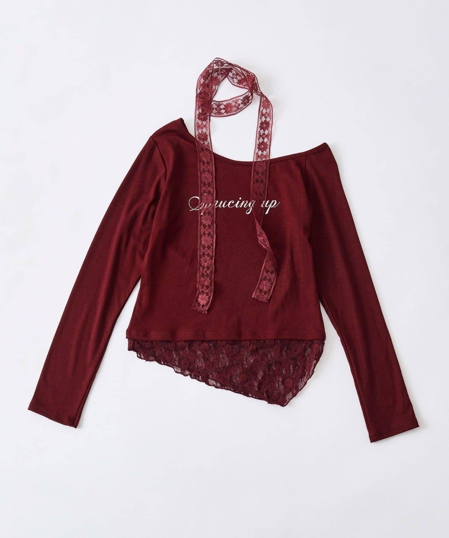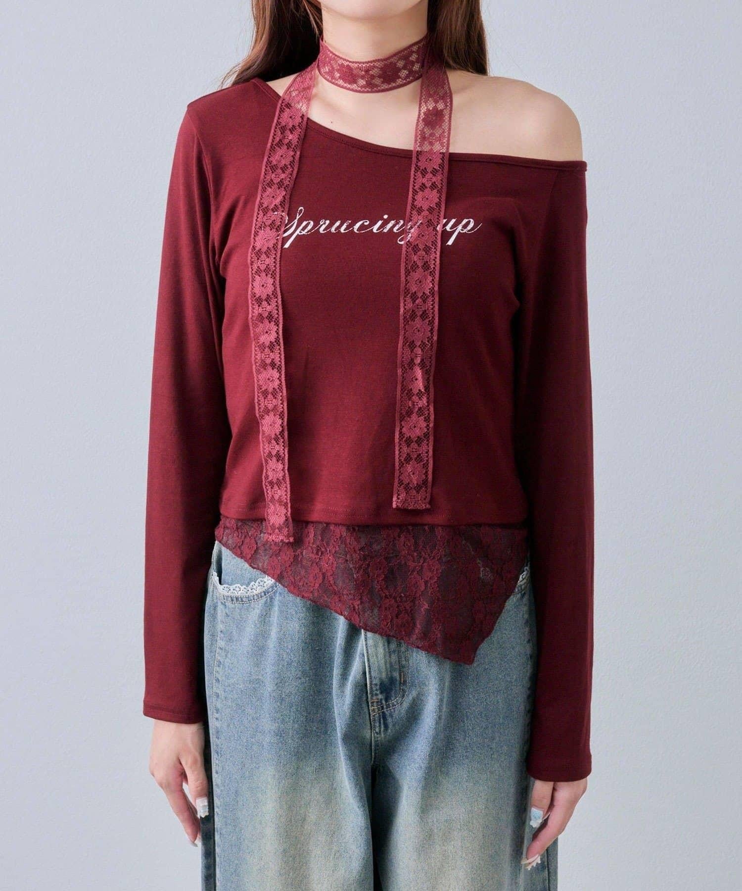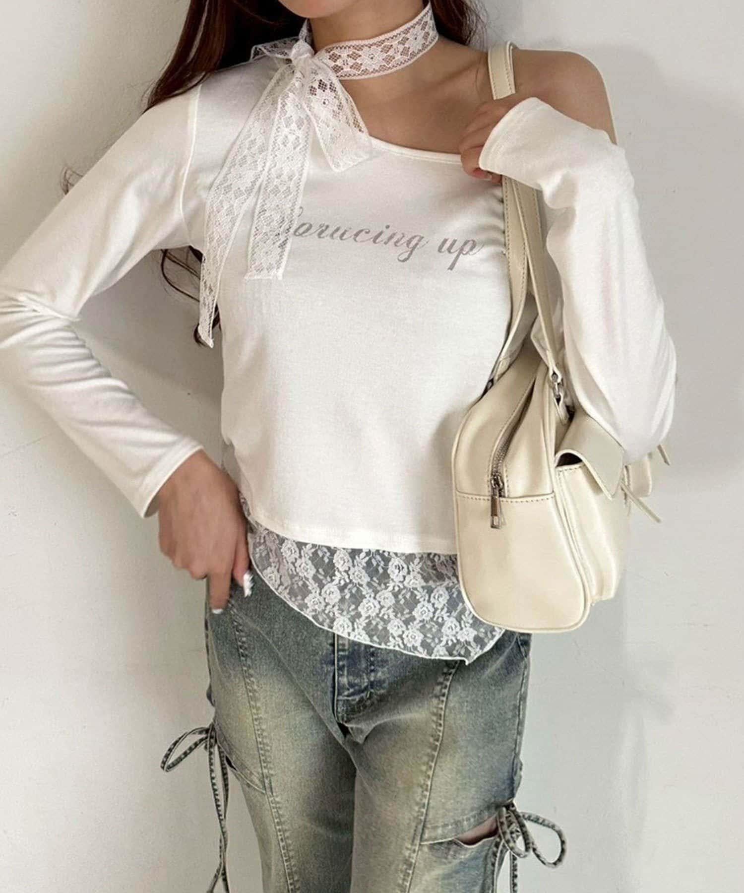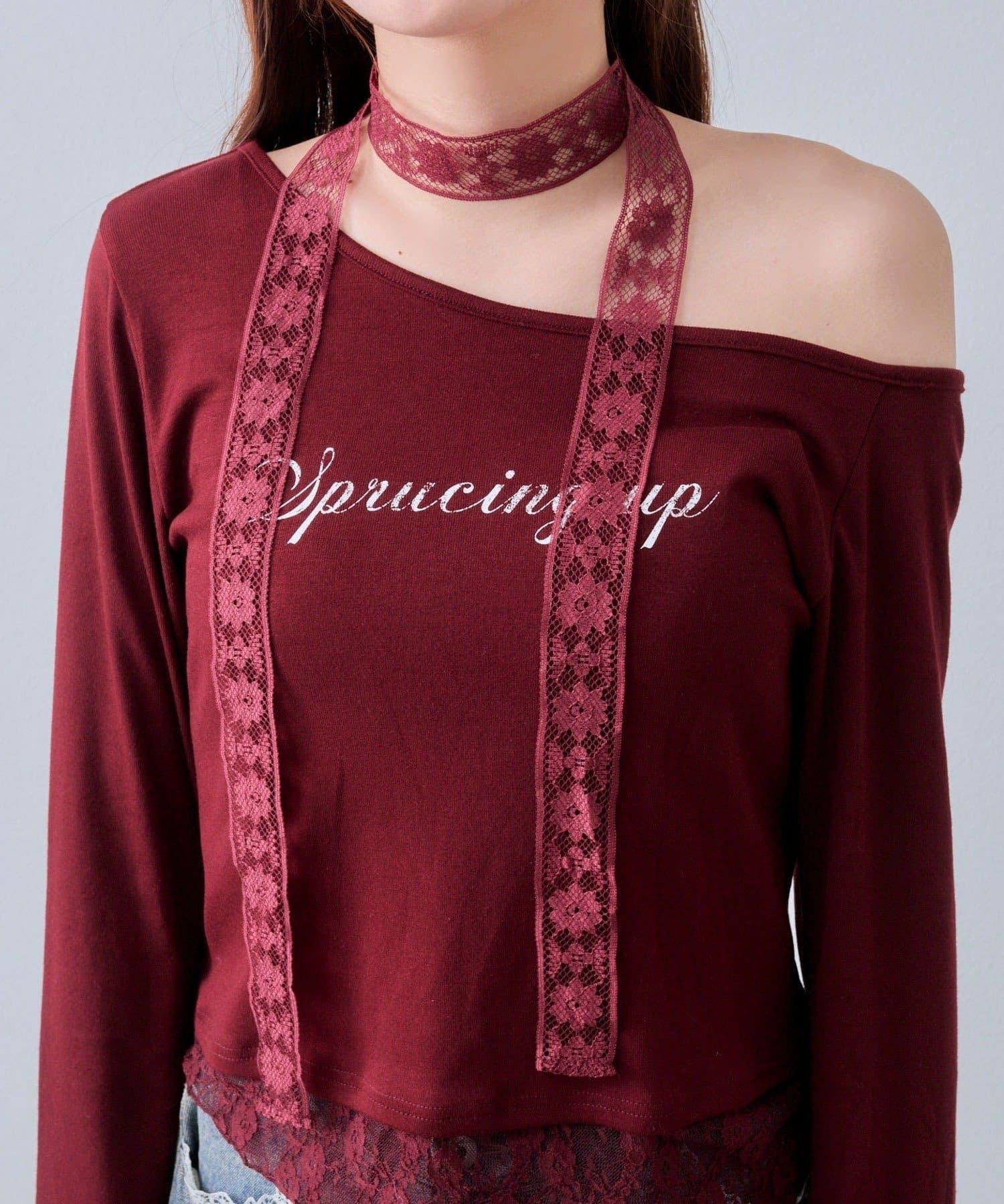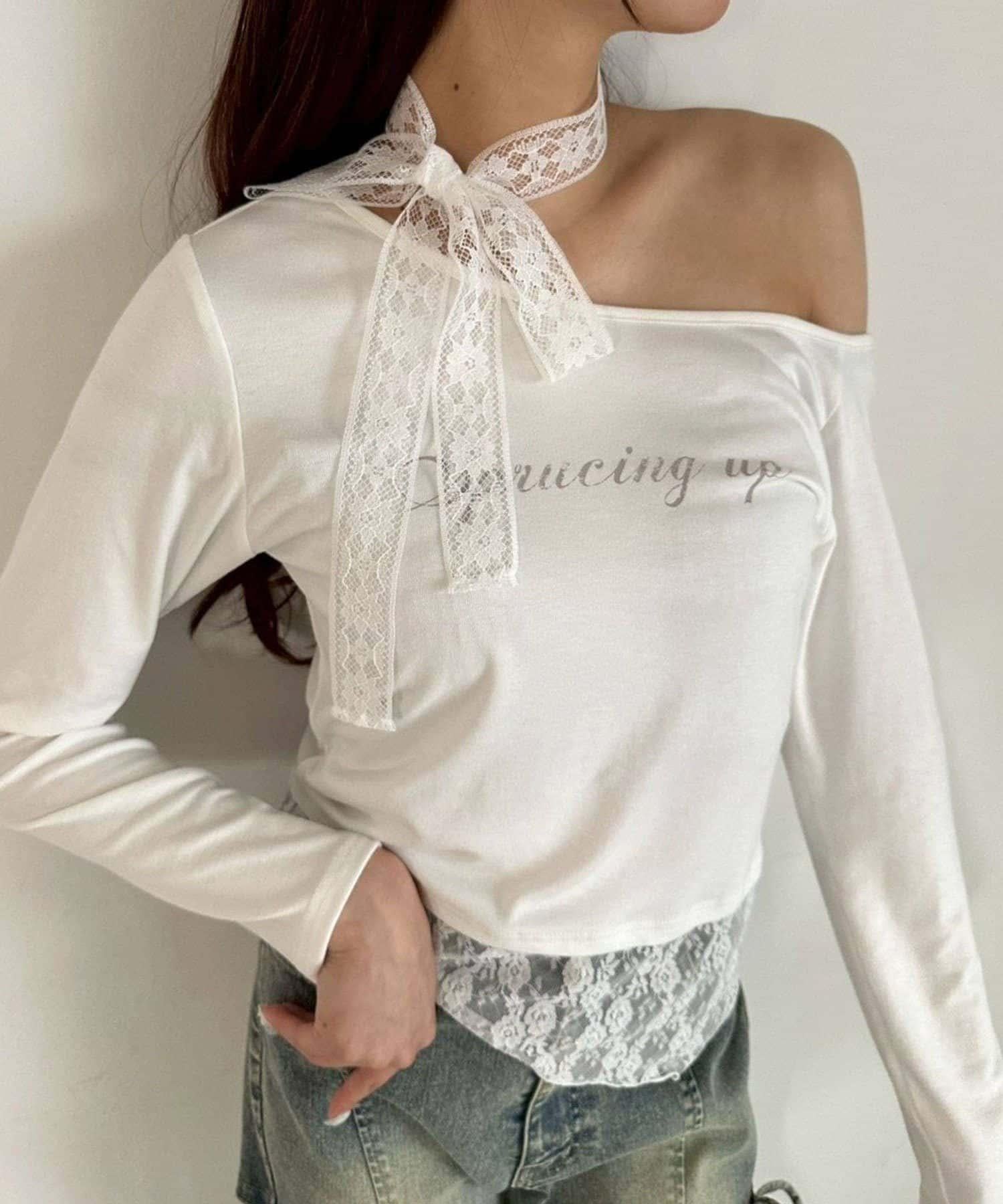 蕾絲繫帶可自由擺放!單肩上衣,露出肌膚,打造氣質!