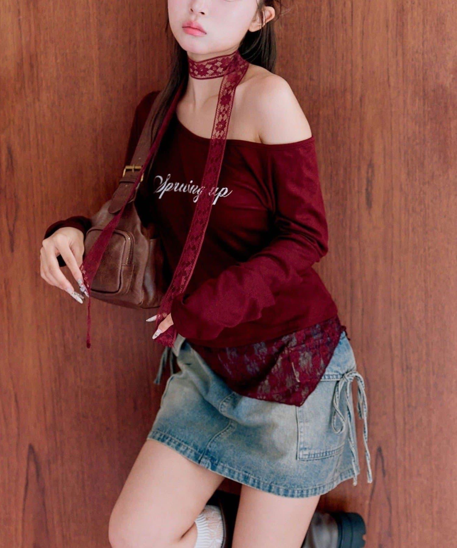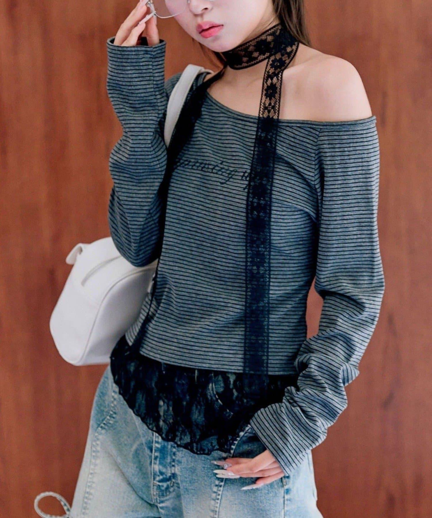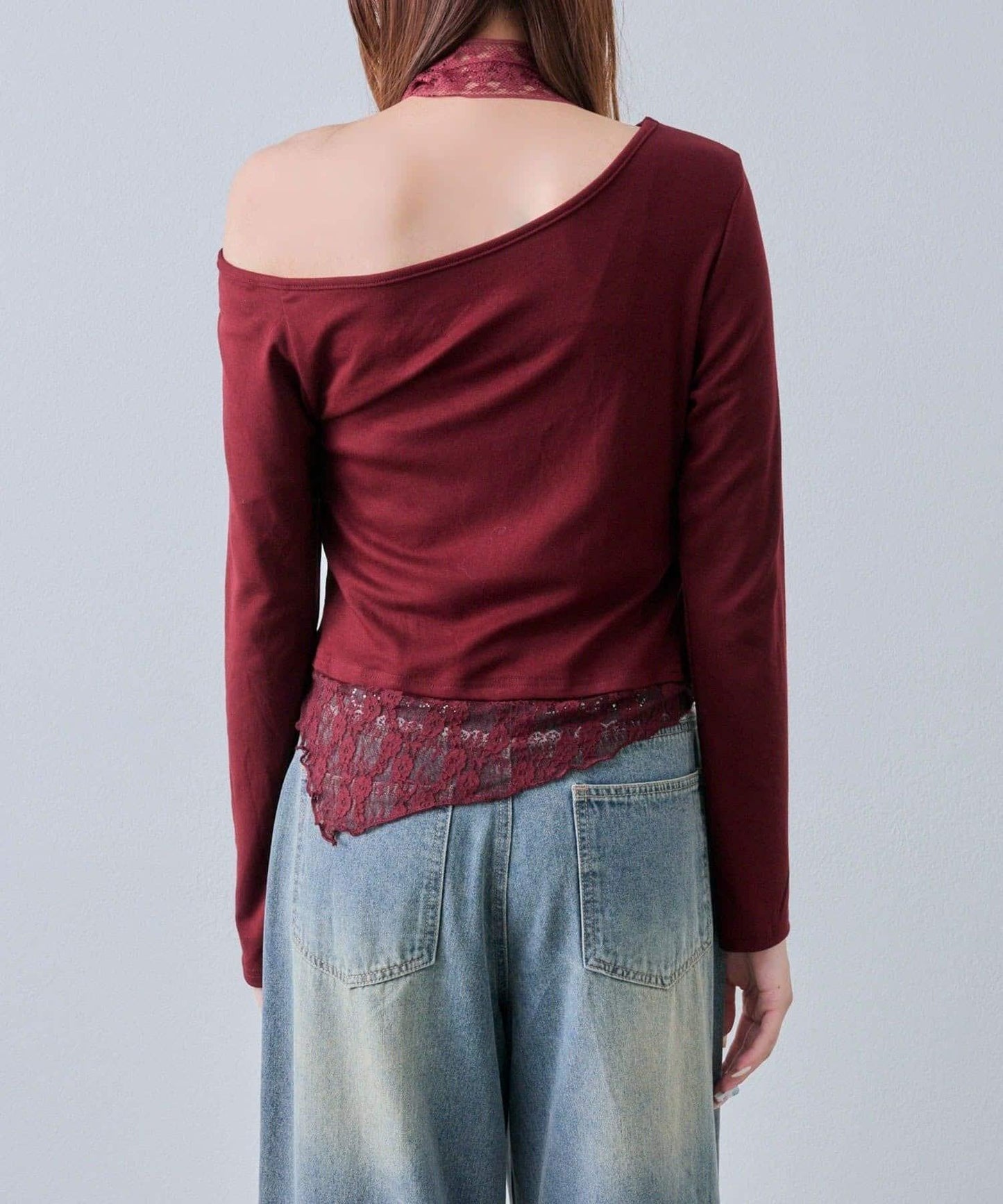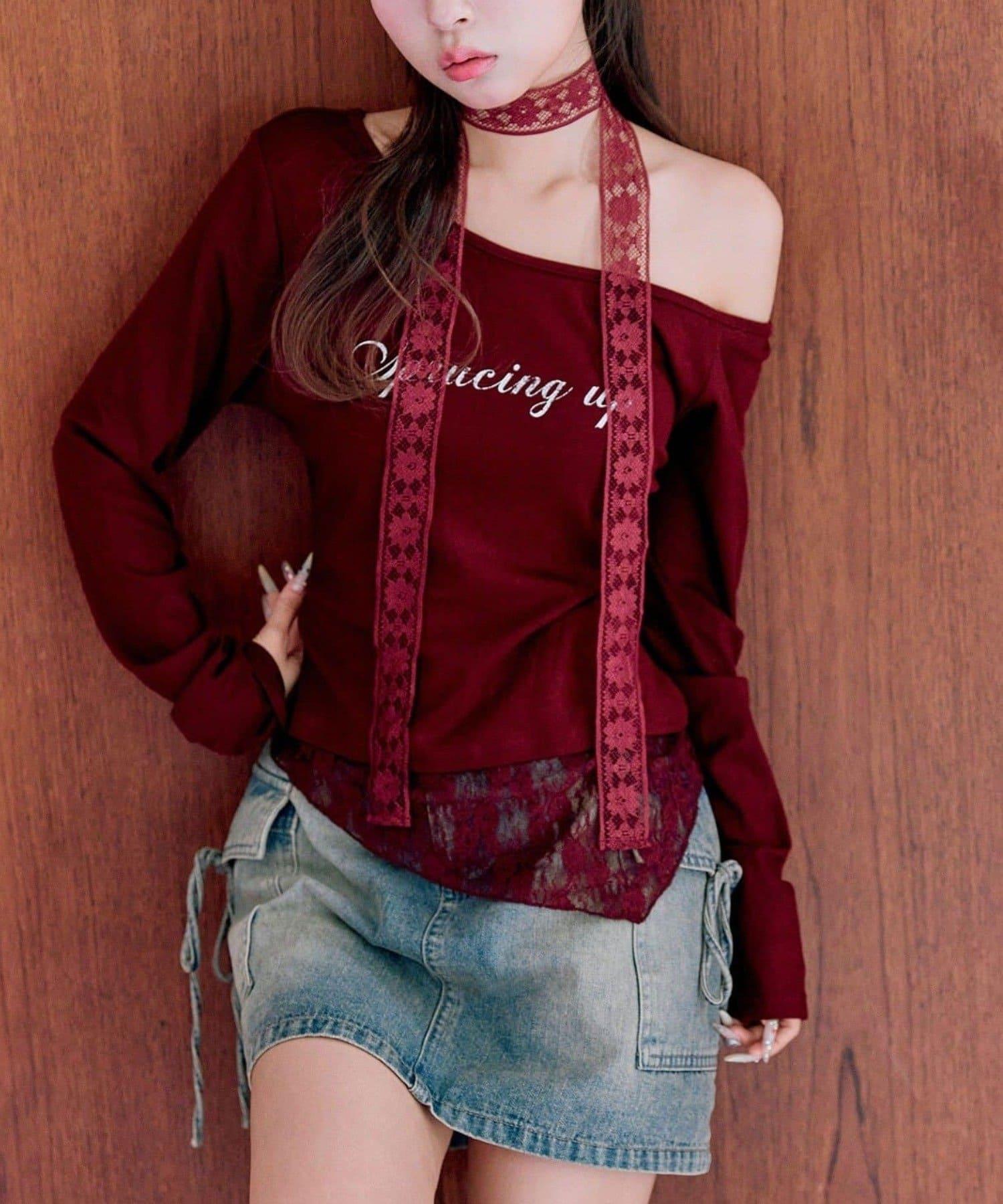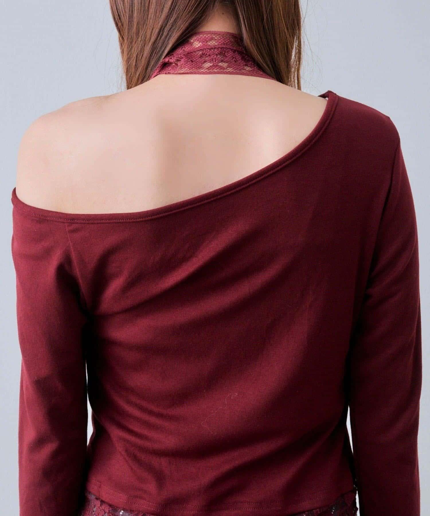 蕾絲繫帶可自由擺放!單肩上衣,露出肌膚,打造氣質!